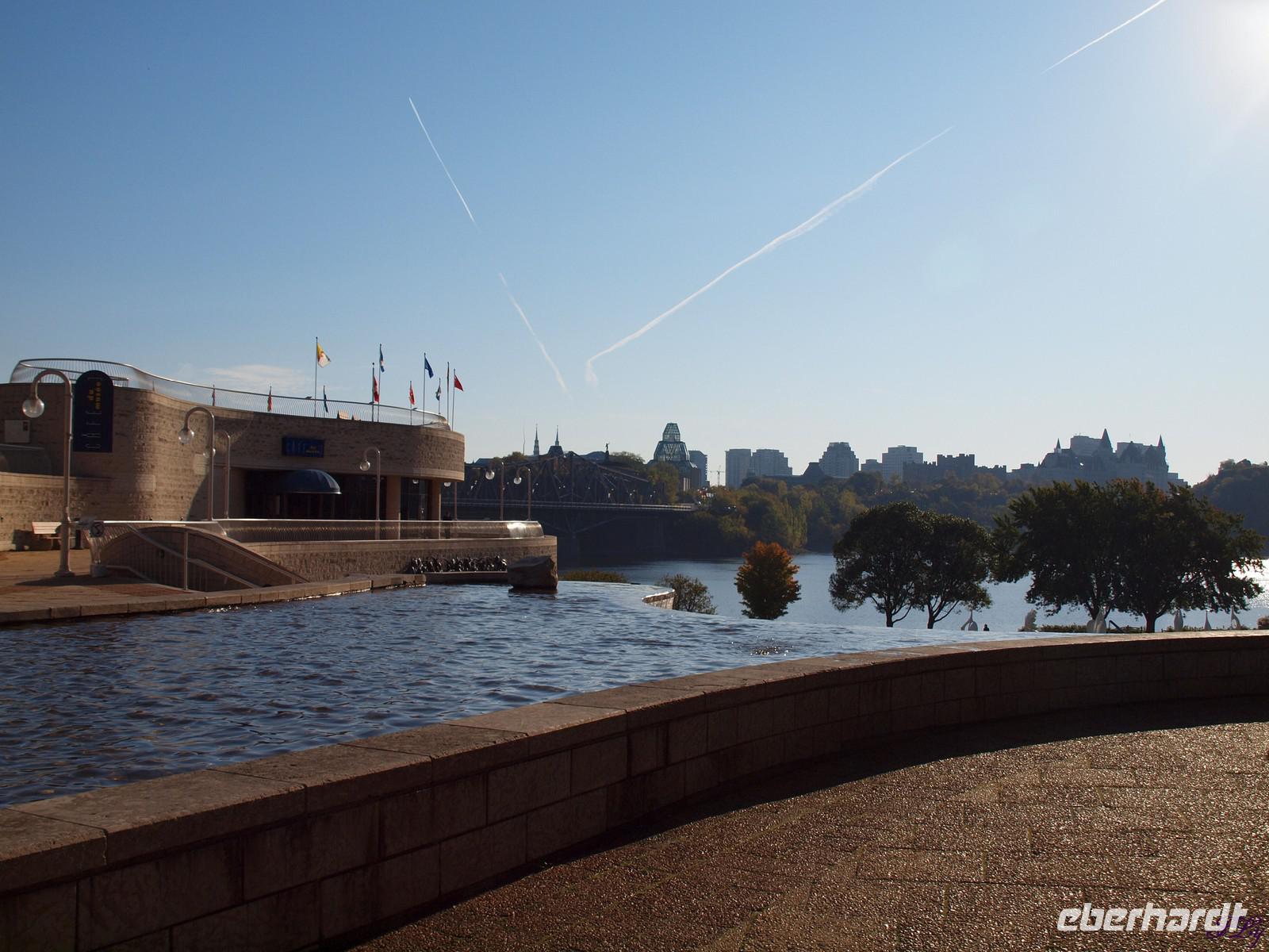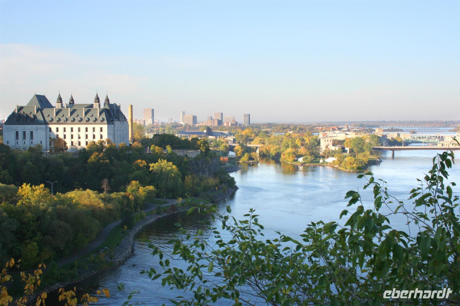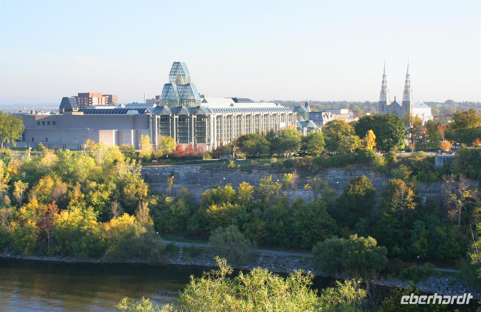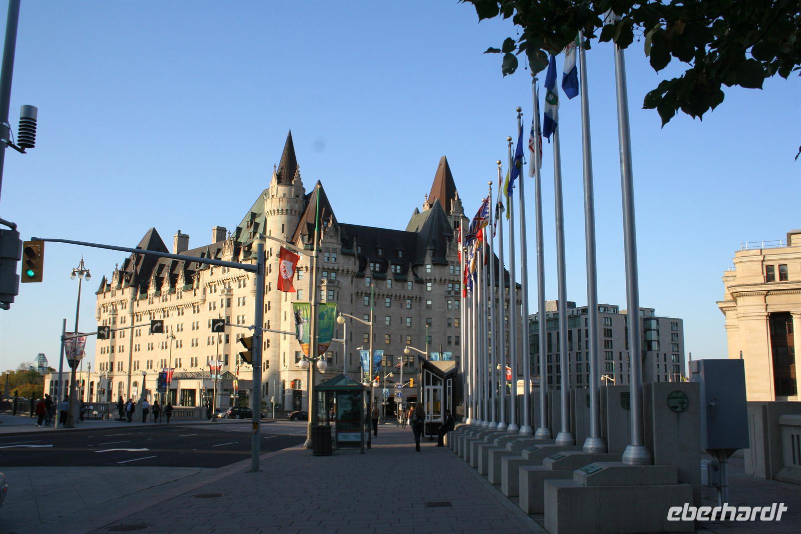 Freitag, 07.10.2011 Algonquin-Nationalpark - Logging Trail - Ottawa Am Freitag müssen wir etwas eher los, denn wir haben eine lange Fahrtstrecke von 420 Kilometern vor uns. Weckruf ist daher um 6.00 Uhr, Frühstück und 7.00 und Abfahrt um 8.00 Uhr. Heute erkunden wir den östlichen Teil des Algonquin-Parks. Wir fahren zunächst etwa eine Stunde zum Algonquin-Besucherzentrum. Hier gibt es eine kleine Aussichtsplattform, einen Souvenirshop und ein Museum zur Geschichte und zur Tierwelt im Algonquin-Park. Man sieht, wie der der Biber seinen Bau baut, wie es in den Seen unter Wasser aussieht und verschiedene ausgestopfte Tiere wie den Schwarzbär, den Wolf und den Elch. Hier gibt es auch Toilettenmöglichkeit) Nach einer halben Stunde geht es ca. 20 Minuten weiter zum Holzfäller-Museum mit Rundwanderweg „Logging Trail“. Hier sehen wir uns einen kurzen Film über die Geschichte der Holzfäller an (nur in Englisch) und spazieren eine knappe Stunde den Logging Trail entlang. Brigitta erklärt uns Wissenswertes zu den einzelnen Stationen. Wir sehen die Unterkünfte der Holzfäller, die Pferdeställe, die Gerätschaften und Maschinen bis hin zu einem kleinen Dampfschiff (Alligator genannt), einer Dampflokomotive und moderneren Autos. Für einen CAD bekommt man auch eine kleine Broschüre, in der in Englisch alles mit Illustrationen und Text erläutert ist. 11.30 Uhr Weierfahrt in Richtung Ottawa. Unterwegs legen wir eine Kaffeepause bei Tim Hortons ein (Muffins, Sandwich und Burger). Gegen 15.00 Uhr kommen wir in Ottawa an und beginnen unsere Stadtrundfahrt. An der Mündung des Rideau-Flusses in den Ottawa-Fluss legen wir einen Fotostopp an dem kleinen Wasserfall ein (Rideau = Vorhang/Gardine). Vorbei am Kunstmuseum, dem Rathaus und dem By Ward Markt erreichen wir um 16.30 Uhr unser Hotel „Cartier Place“ in der Stadt. Wir verabreden uns für 17.00 Uhr in der Lobby zu einem Bummel in die Stadt. Die meisten Gäste gehen in kleinen Grüppchen allein los, ich gehe mit 6 Gästen los. Da der ATM Automat im Hotel nicht funktioniert, suchen wir uns in der Innenstadt eine Bank und ich helfe allen dort beim Geld abheben per Kreditkarte. Wir bummeln über den By Ward Markt, der 18.00 Uhr allerdings schließt. Rundherum gibt es eine Unmenge an Geschäften, Bars und Restaurants. An den Marktständen kann man frisches Obst und Gemüse kaufen, es gibt wohl auch 2 Stände mit Ahornprodukten. Nebenan ist ein großes Kaufhaus der Hudson Bay Company, das bis 20 oder 21 Uhr geöffnet ist. Wir kehren zum Abendessen (7 Personen) in das Fischrestaurant „The Fishmarket“ ein. Wir bekommen einen Tisch im Obergeschoss. Es gibt beispielsweise Pasta mit Lachs, Paella, Hähnchen mit Kartoffelecken oder auch Steak. Die Preise variieren zwischen 15 und 25 CAD pro Gericht. Alles ist sehr lecker und es klappt auch, dass wir letztlich alle getrennt bezahlen. Nach dem Abendessen spazieren wir zurück zum Hotel (ca. 15 Minuten), wo wir gegen 21.00 Uhr ankommen. Die Zimmer sind eher Appartements mit Schlafzimmer, Wohnzimmer, Bad und Küche. Die Küche ist voll ausgestattet mit Kühlschrank, Geschirr, Geschirrspüler, Mikrowelle, Herd und Wasserkocher. Das Bad verfügt über Wanne, Dusche, WC, Duschgel und Föhn. Es gibt auch wieder TV, Telefon, Radiowecker und Bügeleisen. Im Erdgeschoss rechts neben der Rezeption ist das Hotelrestaurant, hier gibt es auch das Frühstück am nächsten Morgen. Stadtpläne kann man an der Rezeption bekommen.