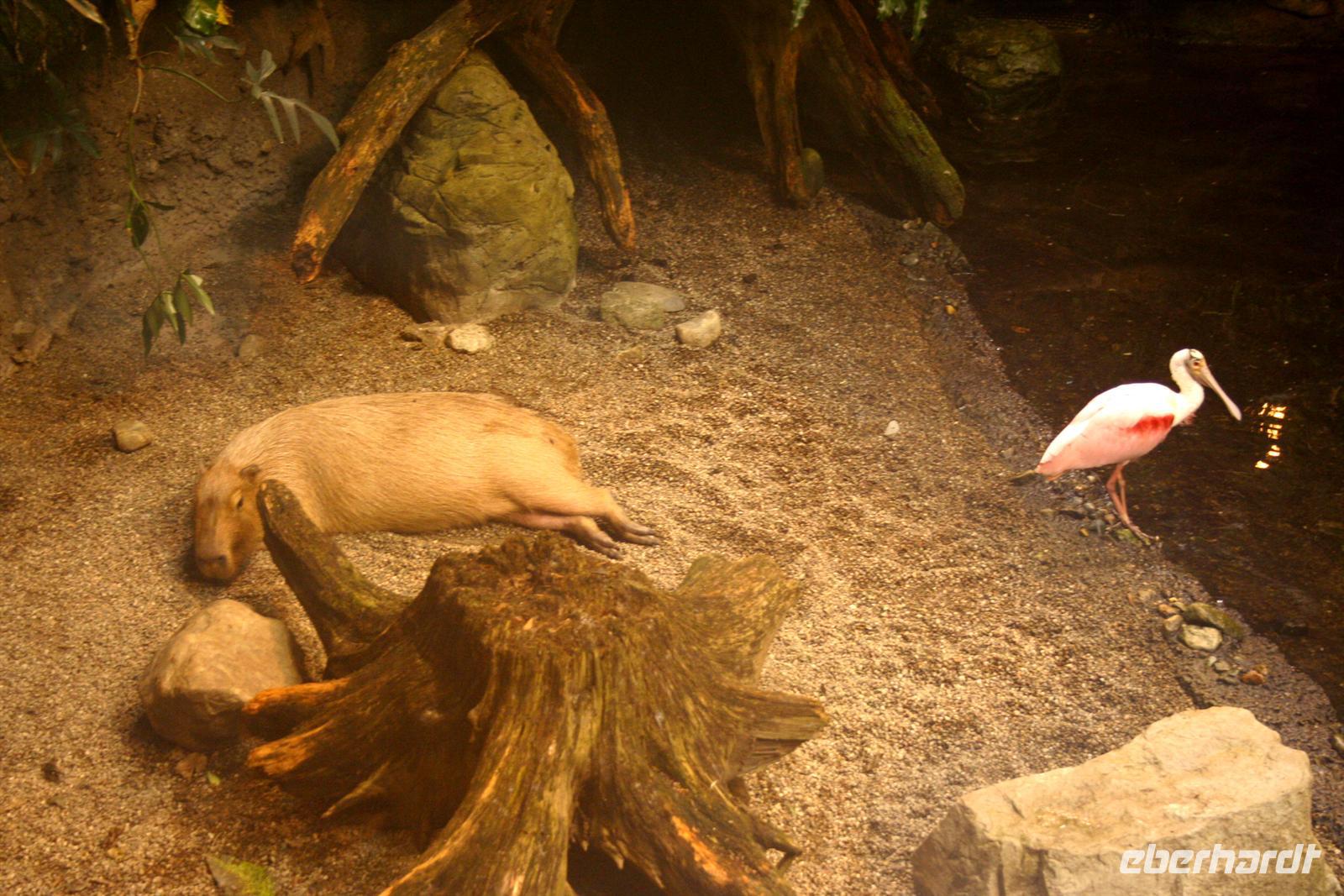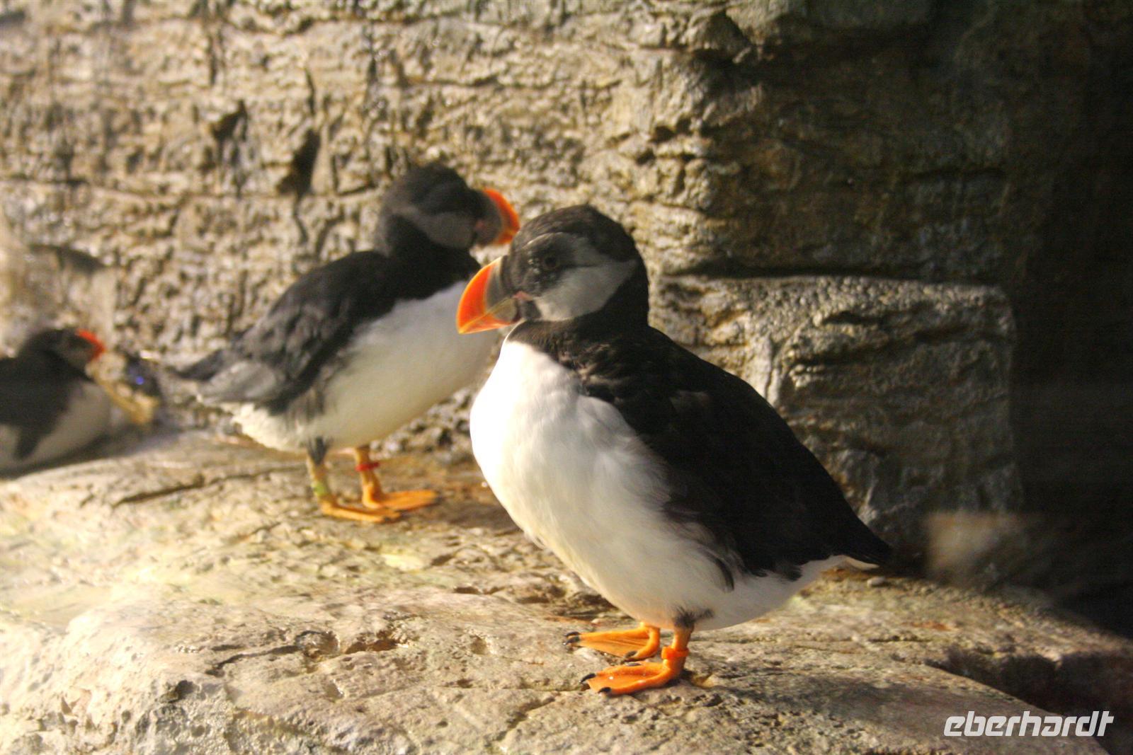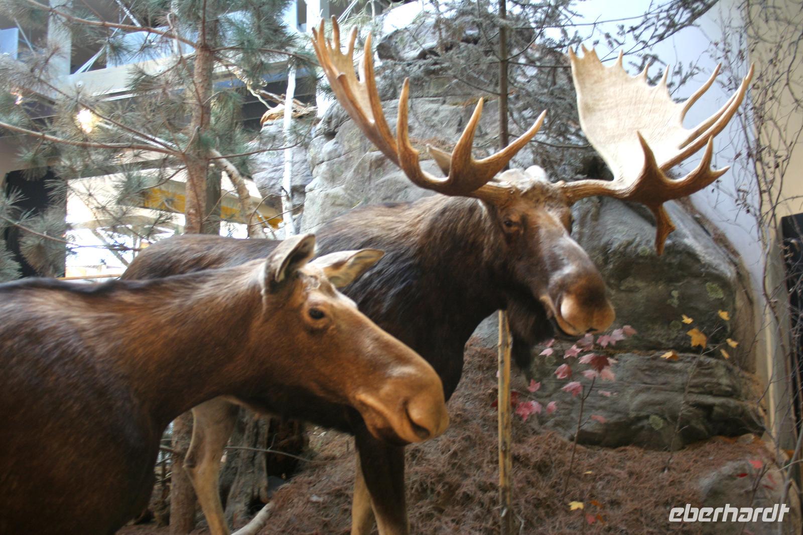 Weckruf 7.00 Uhr, Frühstück 8.00 Uhr im Hotel „Le Nouvel“. Unser Rückflug startet heute erst am späten Nachmittag, so dass wir noch fast den ganzen Tag Freizeit in Montreal verbringen können. Die große Einkaufsstraße St. Catherine und die unterirdische Stadt bieten sich für ausgedehnte Einkaufsbummel an. Natürlich kann man sich auch noch einmal die besuchten Sehenswürdigkeiten individuell ansehen. Montreal bietet ein einfaches U-Bahn-Netz, mit dem man in alle Stadtteile kommt. Fast die Hälfte unserer Gruppe entscheidet sich dafür, mit mir in den Biodome Montreal zu fahren. Vom Hotel „Le Nouvel“ gehen wir zu Fuß zwei Straßen weiter nördlich zur U-Bahn-Station Guy-Concordia. Hier holen wir uns am Schalter 2 U-Bahn-Tickets für die Hin- und Rückfahrt für 5,50 CAD pro Person. Die Bahn-Mitarbeiter sind sehr freundlich und hilfsbereit. Mit dem Ticket gehen wir durch das Drehkreuz (hier wird es entwertet) und nach unten zu den Bahnsteigen. Man muss einfach nur den Namen der Endstation wissen, um die richtige Linie zu finden. Es ist alles gut ausgeschildert. Wir fahren etwa 40 Minuten (12 Haltestellen) bis zur Station Viau, die sich direkt am Olympiazentrum und dem Biodome befindet. Der Biodome öffnet um 9.00 Uhr und hat je nach Saison bis 17.00 oder 18.00 geöffnet. Wir kaufen in der Eingangshalle die Eintrittskarten. Für Erwachsene kostet eine Karte 16,50 CAD, für Senioren ab 65 Jahren 12,50 CAD. Audioguides gibt es leider nicht in Deutsch, nur Englisch und Französisch. Man erhält eine schöne Broschüre, die man am Ende des Rundgangs für 2 CAD kaufen oder wieder abgeben kann. Wir nehmen uns 2,5 Stunden Zeit, um durch die Ausstellung zu bummeln. Man geht durch vier verschiedene Welten und Klimazonen: Tropischer Regenwald, Waldlandschaft Ostkanadas, Unterwasserwelt des St. Lorenz Stromes und Subpolarwelt. Überall kann man dort jeweils heimische Tiere beobachten und die typische Vegetation sehen. Infotafeln bieten Informationen, allerdings nur in Englisch und Französisch. Es sind auch einige Schulklassen hier unterwegs. Wir sehen Papageien, Krokodile, einen Biberbau, Otter und einen Luchs sowie Fische, Pinguine und Papageientaucher. Es ist alles sehr schön gestaltet. Am Ende gibt es natürlich auch einen Souvenirshop und eine Cafeteria.
