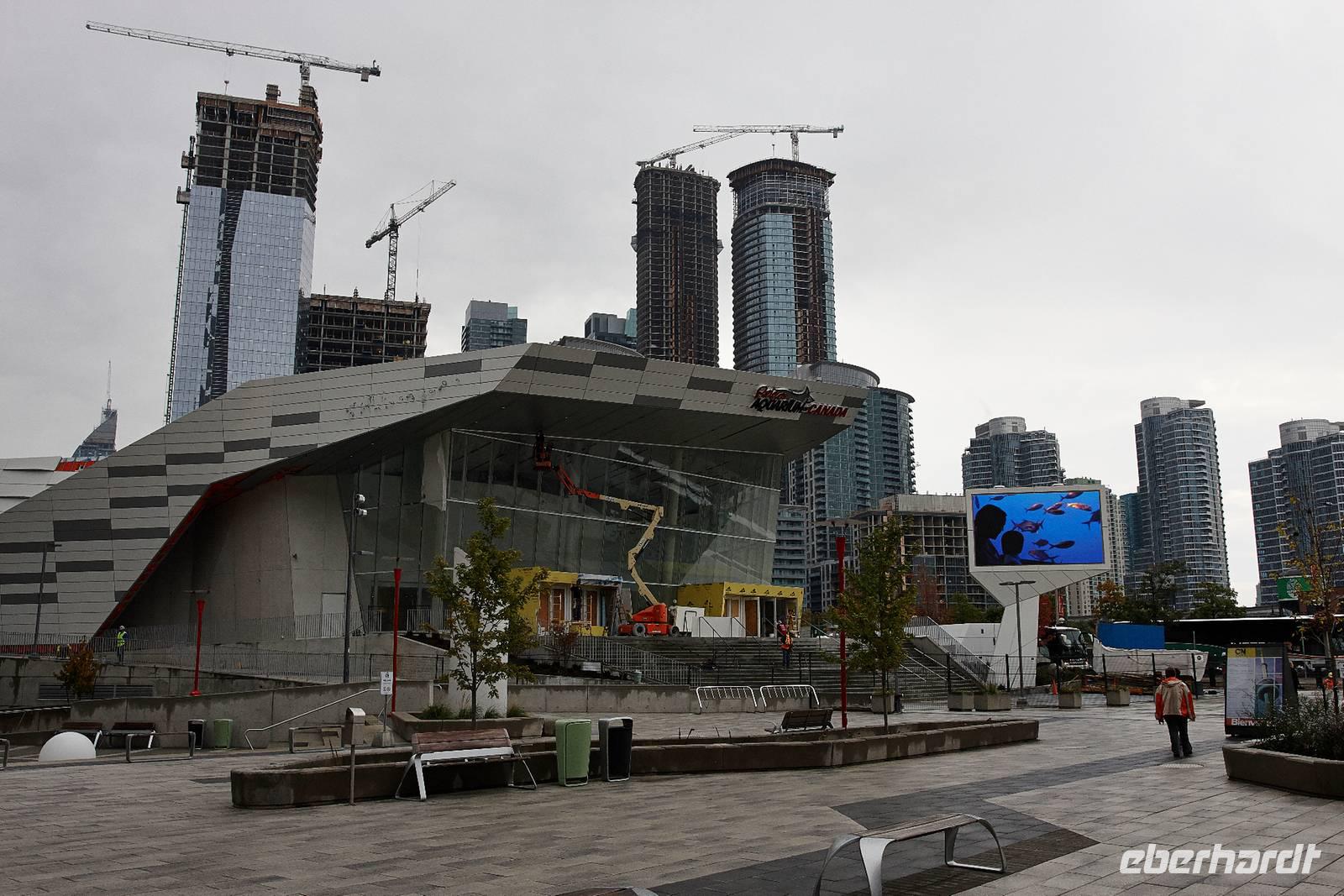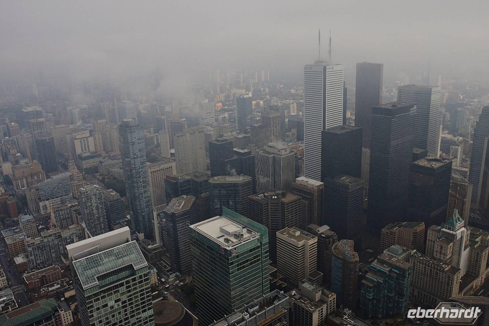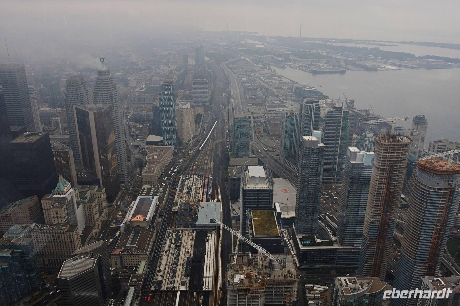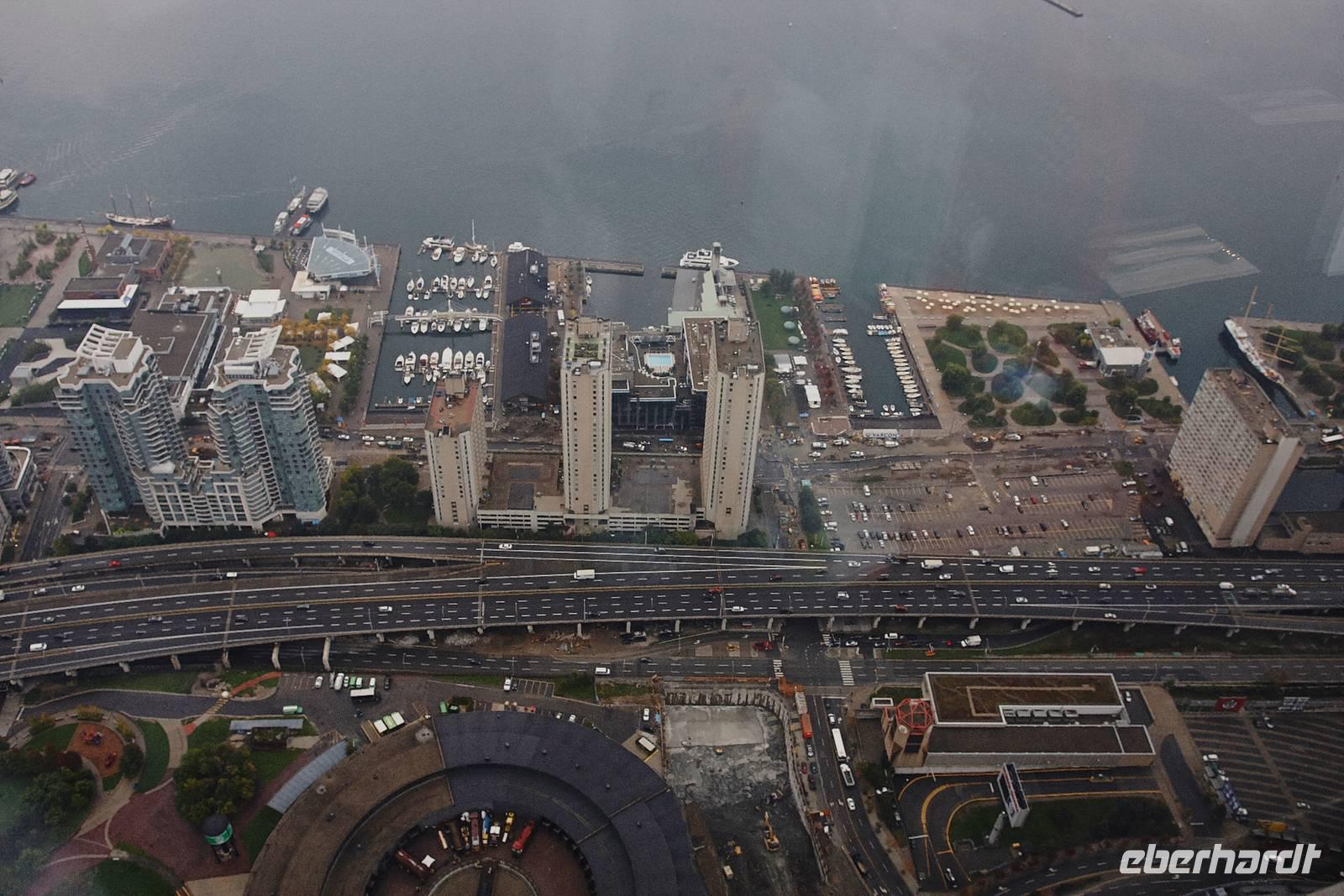 Wir stoppen am berühmten CN-Tower, dessen Spitze wir im morgendlichen Nebel nur erahnen können. Nach der Auffahrt auf den 580m hohen Fernsehturm haben wir einen tollen Blick über die Stadt. Auch der Himmel klart langsam auf. Für mutige Besucher gab es auch einen Glasfußboden. Wir setzen unsere Rundfahrt fort und machen noch einen Mittagsstopp an der Harbor Front.