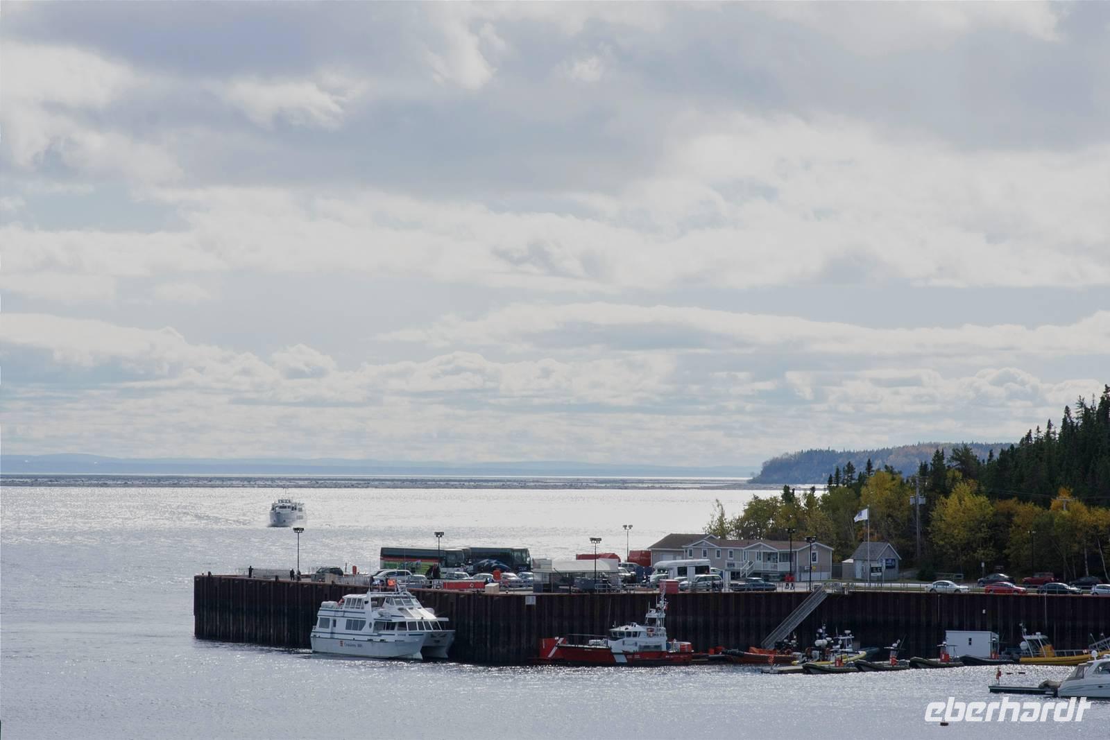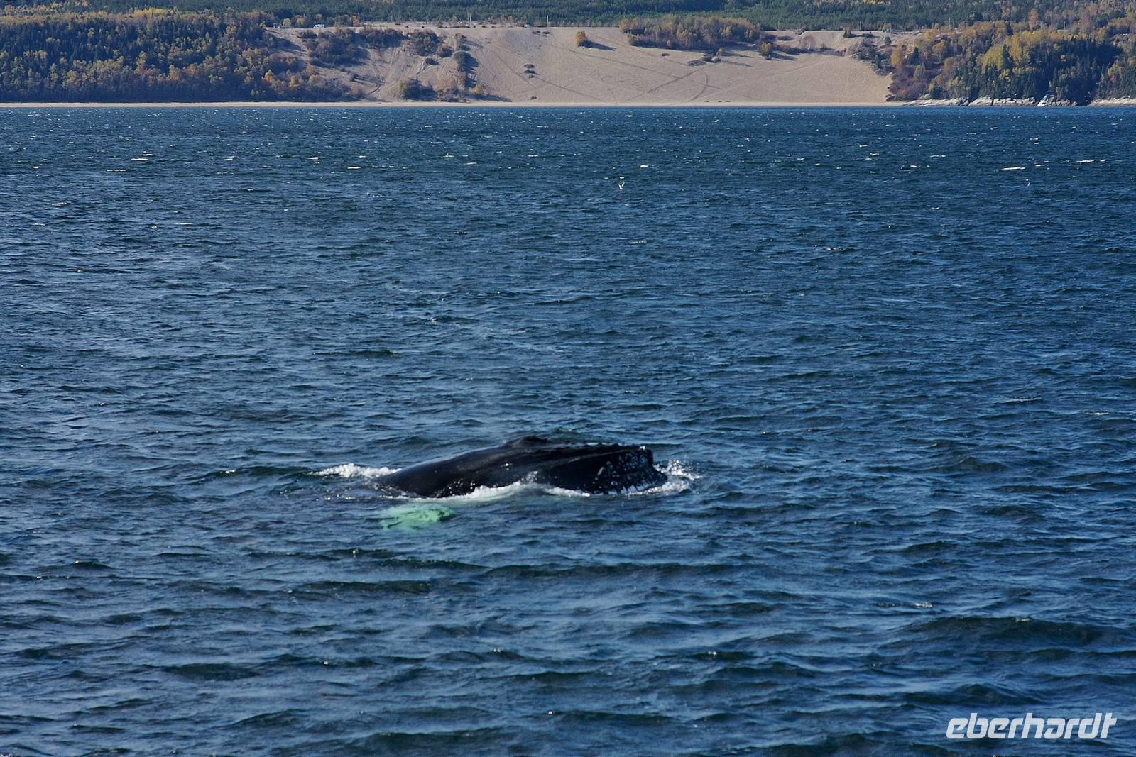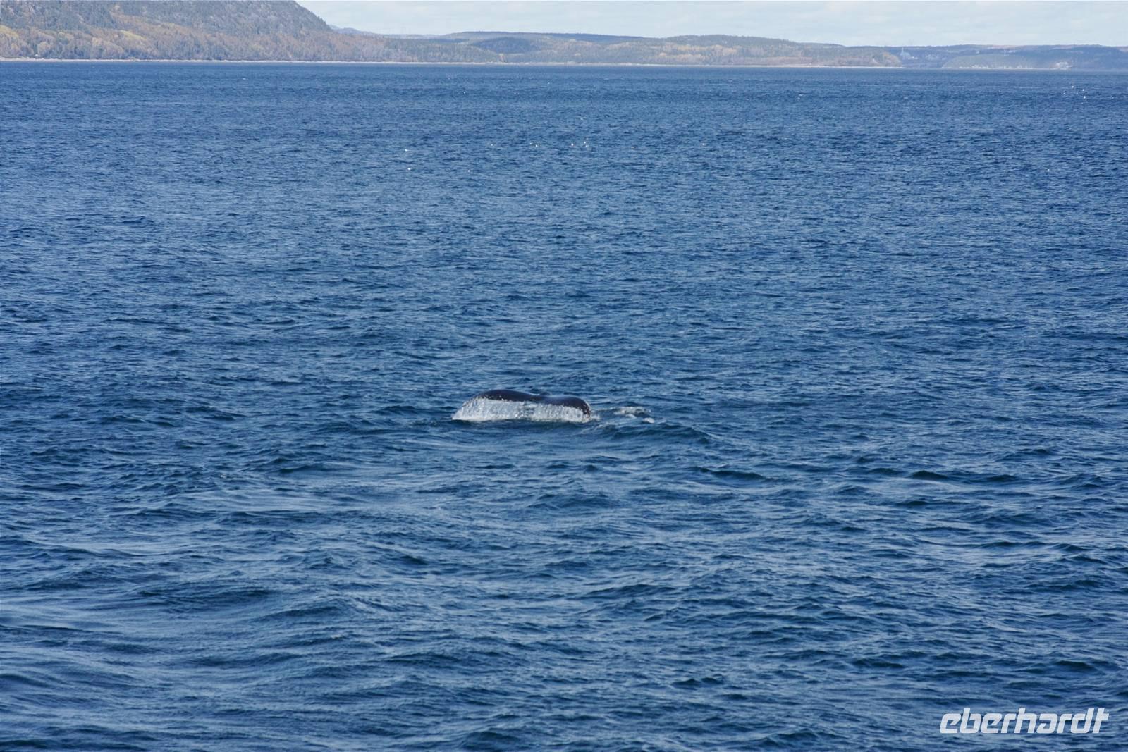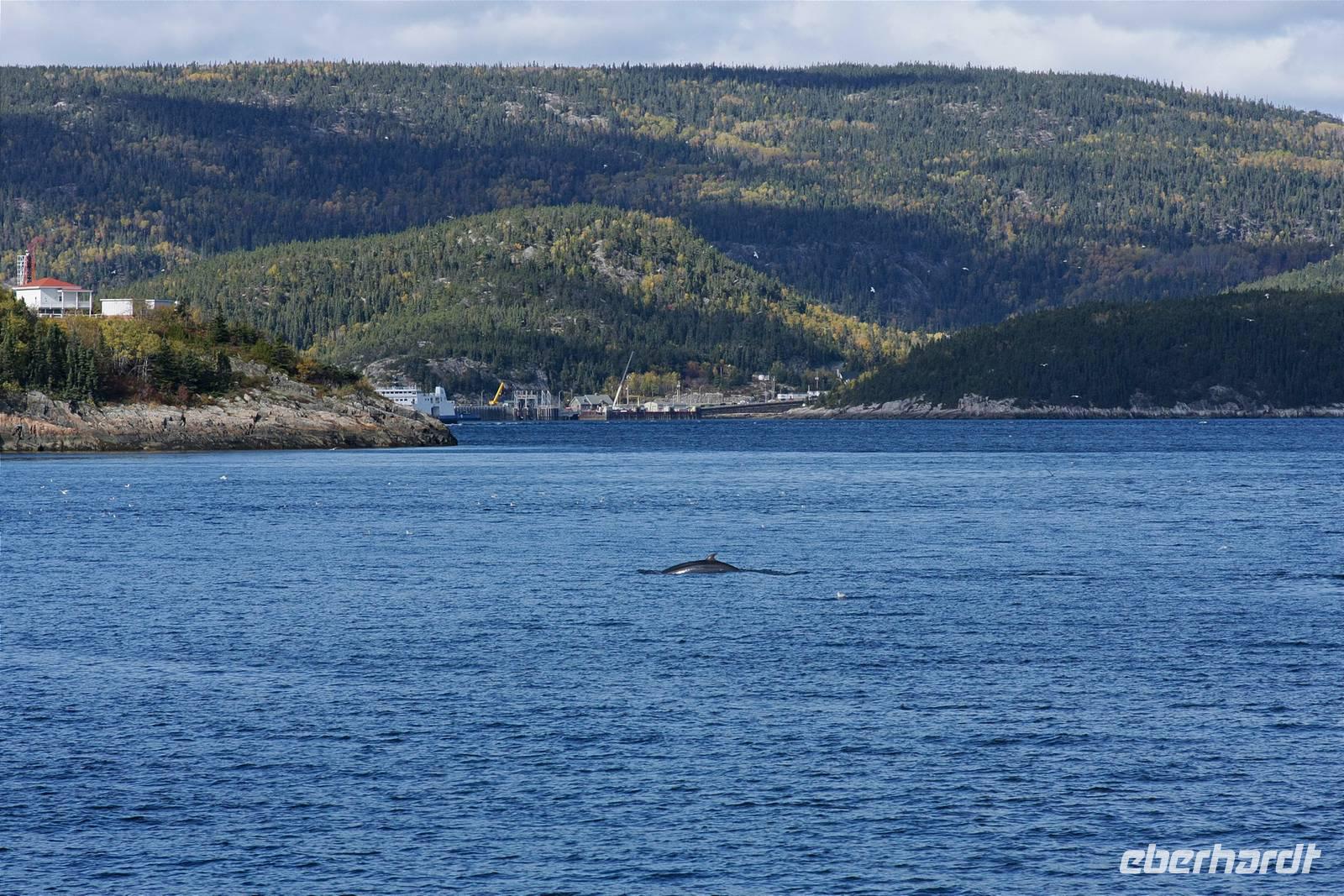 Ein Highlight unserer Reise stand für heut auf dem Programm: die Walbeobachtung in der Bucht vor Percé. Dafür mussten wir erst einmal mit der Fähre in das Städtchen Tadoussac übersetzen. Bis unser Ausflugsschiff anlegte war noch etwas Zeit um den nördlichsten Ort auf unserer Tour zu erkunden und sich etwas aufzuwärmen, denn hier war es schon wesentlich kälter als wir es in den letzten Tagen gewohnt waren. Dann ging es auch bald los und unser Schiff legte ab - zu unserem Glück waren heut nur wenig andere Gäste dabei und wir konnten uns frei auf den Decks bewegen und Ausschau halten. Es dauerte nicht lang und wir sahen auch schon den ersten Kandidaten - Minkwal, oder Zwergwal umkreise unser Schiff. Alle lauerten hinter der Kamera auf den bewussten Moment in dem er auftaucht um Luft zu holen. Einige gute Fotos haben wir auch dabei auch bekommen. Auch die typische Bewegung der Schwanzflosse beim Abtauchen konnten wir festhalten. Kurze Zeit später konnten wir in der Ferne eine große Fontäne sehen. Die Schiffsbesatzung war sich auch gleich sicher: das muss ein großer sein! Als wir näher kamen sahen wir das es ein Finnwal war...mit bis zu 25 Metern länge das zweitgrößte lebende Tier der Erde. Leider war dieser nicht ganz so aktiv wie die Kleineren. Immer wieder konnten wir das Auf- und Abtauchen der Minkys beobachten. Auf dem Rückweg umlagerte eine große Robbenfamilie unser Schiff. Diese waren sehr aktiv und boten noch tolle Motive.