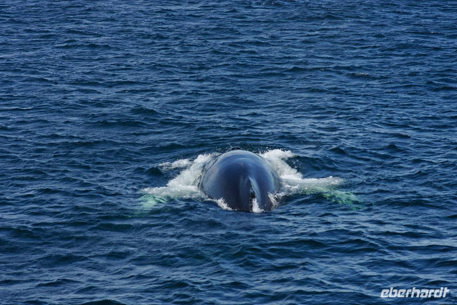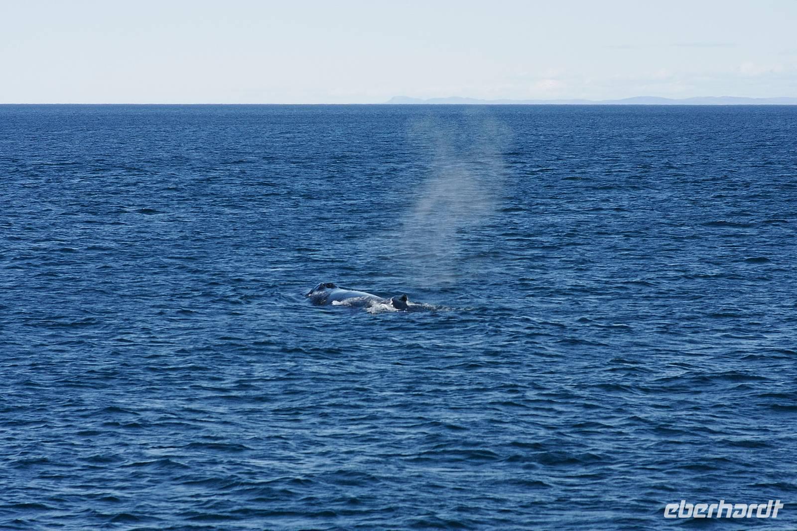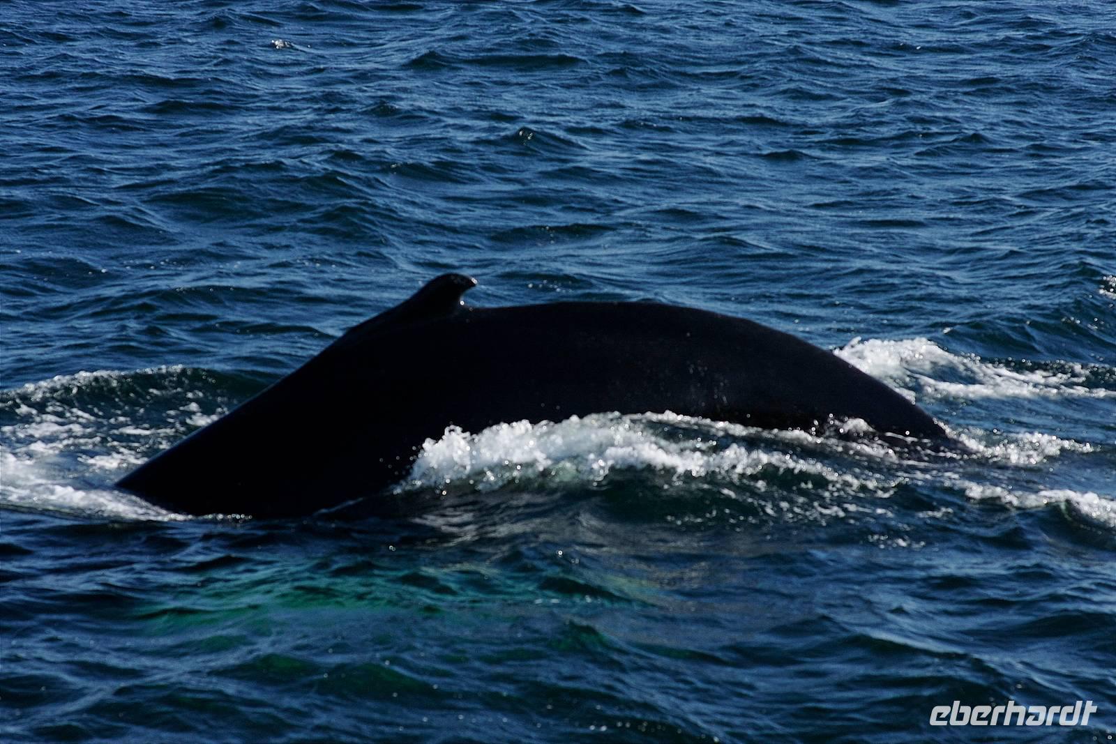 Ein Highlight unserer Reise stand für heut auf dem Programm: die Walbeobachtung in der Bucht vor Percé. Dafür mussten wir erst einmal mit der Fähre in das Städtchen Tadoussac übersetzen. Bis unser Ausflugsschiff anlegte war noch etwas Zeit um den nördlichsten Ort auf unserer Tour zu erkunden und sich etwas aufzuwärmen, denn hier war es schon wesentlich kälter als wir es in den letzten Tagen gewohnt waren. Dann ging es auch bald los und unser Schiff legte ab - zu unserem Glück waren heut nur wenig andere Gäste dabei und wir konnten uns frei auf den Decks bewegen und Ausschau halten. Es dauerte nicht lang und wir sahen auch schon den ersten Kandidaten - Minkwal, oder Zwergwal umkreise unser Schiff. Alle lauerten hinter der Kamera auf den bewussten Moment in dem er auftaucht um Luft zu holen. Einige gute Fotos haben wir auch dabei auch bekommen. Auch die typische Bewegung der Schwanzflosse beim Abtauchen konnten wir festhalten. Kurze Zeit später konnten wir in der Ferne eine große Fontäne sehen. Die Schiffsbesatzung war sich auch gleich sicher: das muss ein großer sein! Als wir näher kamen sahen wir das es ein Finnwal war...mit bis zu 25 Metern länge das zweitgrößte lebende Tier der Erde. Leider war dieser nicht ganz so aktiv wie die Kleineren. Immer wieder konnten wir das Auf- und Abtauchen der Minkys beobachten. Auf dem Rückweg umlagerte eine große Robbenfamilie unser Schiff. Diese waren sehr aktiv und boten noch tolle Motive.
