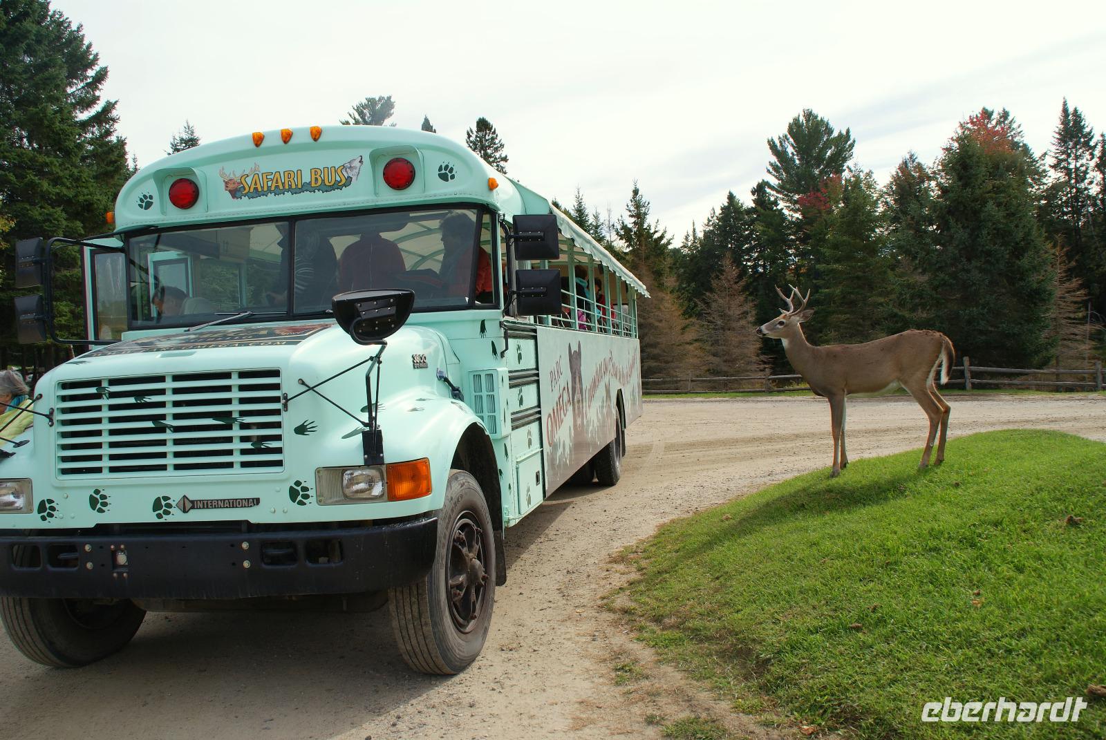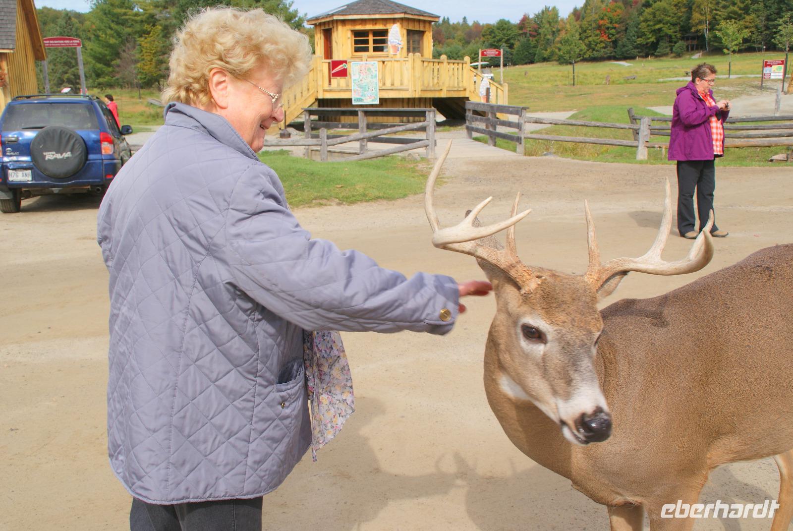 Heute verlassen wir die Stadt Ottawa und wechseln nochmals die Seite zur gegenüberliegenden Stadt Gatineau und amüsieren uns über Dorles Erzählung zu den niedlichen „Streichholzschachteln", Häuser, die Arbeitern aus der Streichholzschachtelindustrie zum Wohnen zur Verfügung gestellt wurden. So ein Häuschen könnte uns schon gefallen.... Gatineau liegt nun bereits in der Provinz Quebec, die 4x so groß wie Deutschland ist und wir erhalten erneut eine Vorstellung darüber, wie groß Kanada eigentlich ist. Auf den Kennzeichen der Autos aus Quebec steht nun als Slogan „Je me souviens"-ich erinnere mich. Vorab in Ontario lasen wir auf den Nummernschildern „Yours to discover"-Für dich- um entdeckt zu werden. Unser nächstes Ziel ist nun der Omega Wildpark Nähe Montebello. Wir wechseln das Fahrzeug und fahren in einem umgebauten Schulbus mit offenen Fenstern und mit reichlich Möhren bepackt in der Park. Da wir Leckereien bereithalten werden wir schon von den ersten Hirschen, Rehen, Wildschweinen und Wapitis erwartet, die sich auf ein gesundes Frühstück freuen. Gerne tun wir den Gefällen und so haben alle viel Spaß daran und jeder kommt auf seine Kosten! Wir ziehen an verschiedenen Arealen vorbei und sehen Bisons, Polarwölfe, Kojoten, Elche, Rentiere, Schwarzbären und sind begeistert, die Tiere so nah erleben zu dürfen. Schnell sind wir uns einig, der Besuch im Omega Park war wirklich ein Erlebnis. Doch unsere Reise sollte weitergehen, denn wir werden bereits in Montréal von unserer hiesigen Stadtführerin Celine erwartet. Diese zeigt uns nun in den nächsten 3 Stunden, was ihre wunderschöne Stadt alles zu bieten hat. So starten wir mit einem Highlight der besonderen Art, was nicht nur die Herzen der Männer höher schlagen ließ. WIR fahren auf die Formel Eins Rennstrecke, wie toll ist das denn. So eine Chance bekommt nicht jeder und man sah die Augen unseres Busfahrers Wayne förmlich leuchten. Wir feuern ihn an und so gelingt an der Startlinie mit laut aufheulendem Motor ein Blitzstart vom Feinsten und wir amüsieren uns köstlich! Weiter geht's. Wir halten am Park Jean Drapeau und haben von hier aus einen wunderbaren Blick auf die Skyline von Montréal. Dort befindet sich auch das Gelände der ehemaligen Weltausstellung. Zurück in der Innenstadt besichtigen wir die beeindruckende Basilika de Notre Dame, in der auch Celine Dion geheiratet hat. Wir sind fasziniert von der Schönheit des Interieurs und lassen alles auf uns wirken. Im Anschluss fahren wir durch Chinatown und dem Place de Spectacle, auf welchem im Sommer allerlei Events stattfinden. Celine verlässt uns und wir checken in unser heutiges Übernachtungshotel ein- denken wir jedenfalls. Denn überraschend für uns kommt ein Streik der Hotelmitarbeiter und so dauert es eine Weile, bis all unsere Zimmer geputzt und bezugsfertig sind. Netterweise versüßt man uns die Wartezeit mit Freibier, was unsere Laune wieder steigen lässt. Zum Glück haben wir eh das Abendessen im Haus und als wir mit diesem fertig sind, hat auch der letzte unserer Gruppe sein Zimmer verfügbar und somit Ende gut-alles gut...aber was es nicht alles so gibt auf einer Reise und wir haben wieder eine Menge zu erzählen!