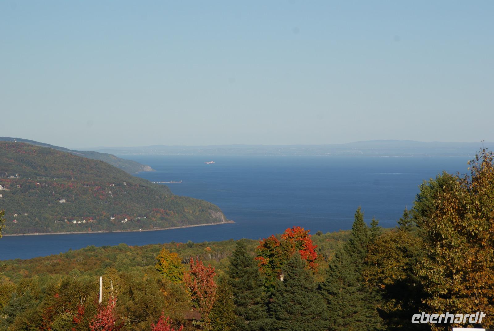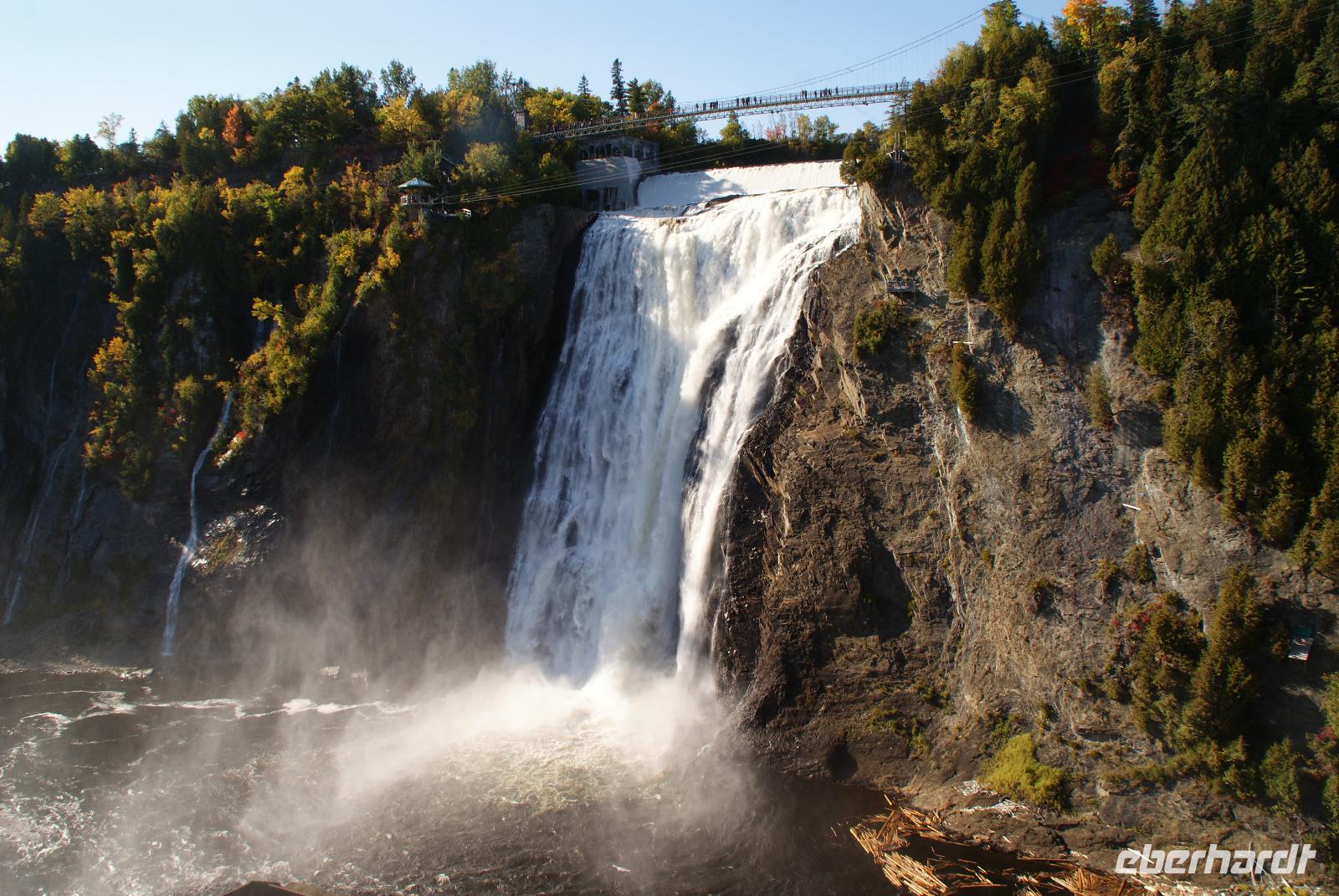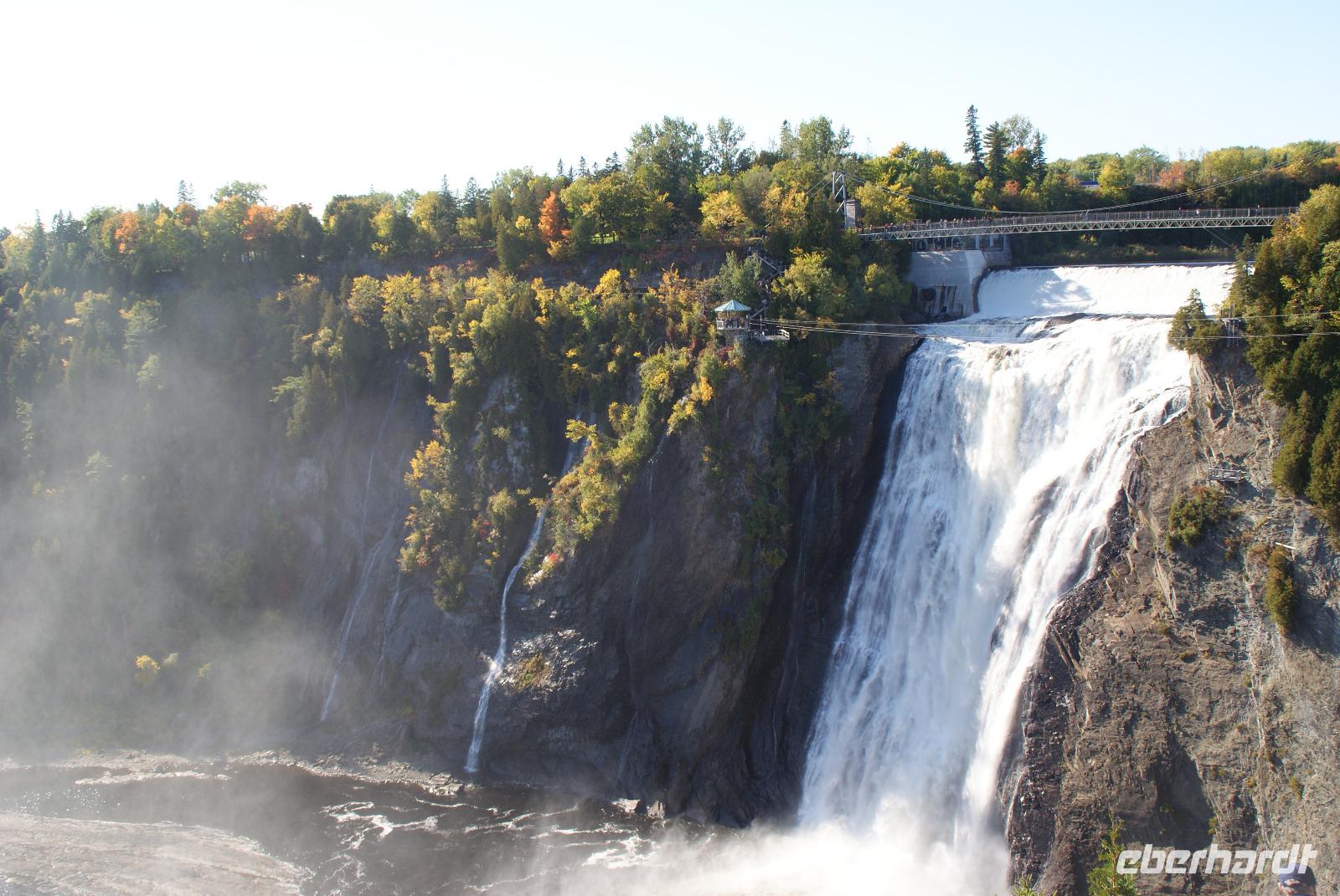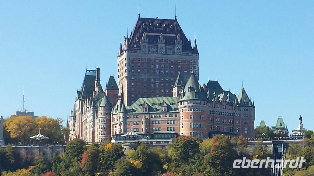 Endlich lacht die Sonne wieder! Nach einem herrlichen Frühstück mit Blick auf den See packen wir unsere Koffer und ziehen weiter. Auf zu neuen Abenteuern. Heute geht es Richtung St. Lorenz Strom und wir halten zunächst am bekannten Wallfahrtsort mit der Basilika Notre Dame du Cape und sind beeindruckt vom schönen Interieur. Bei Bilderbuchwetter fahren wir weiter durch die Provinz Quebec. Unvorstellbar, dass es in diesem riesigen Abschnitt Kanadas nur 8 Millionen Einwohner gibt. Damit für unser leibliches Wohl gesorgt ist, steuern wir bei Durchfahrt durch Quebec City eine schöne Feinkost-Markthalle an und jeder kauft, was er für das heutige geplante Picknick haben möchte. Dorle erklärt uns übrigens, dass Quebec in der Indianersprache „wo der Fluss enger wird" bedeutet... Etwas außerhalb der Stadt liegt unser nächstes Ziel „Chute Montemorency". Der beeindruckende Wasserfall ist noch um einiges höher als die berühmten Niagara Fälle. Wir bekommen viel Zeit um in Ruhe zu picknicken und jeder nach Lust und Laune den Wasserfall entweder von oben anschaut oder mit einem Großteil der Gruppe über eine Treppe nach unten wandert. Was für ein Erlebnis, zunächst über die Hängebrücke, unter uns die Wassermassen und das alles bei einem Wetter, welches schöner nicht sein kann. Was für ein Erlebnis! Voller schöner Eindrücke fahren wir weiter zu unserem heutigen Endziel, La Malbaie und checken in unser neu renoviertes Hotel ein. Wieder ist ein Tag vollbracht und wir träumen von den schönen Erlebnissen.