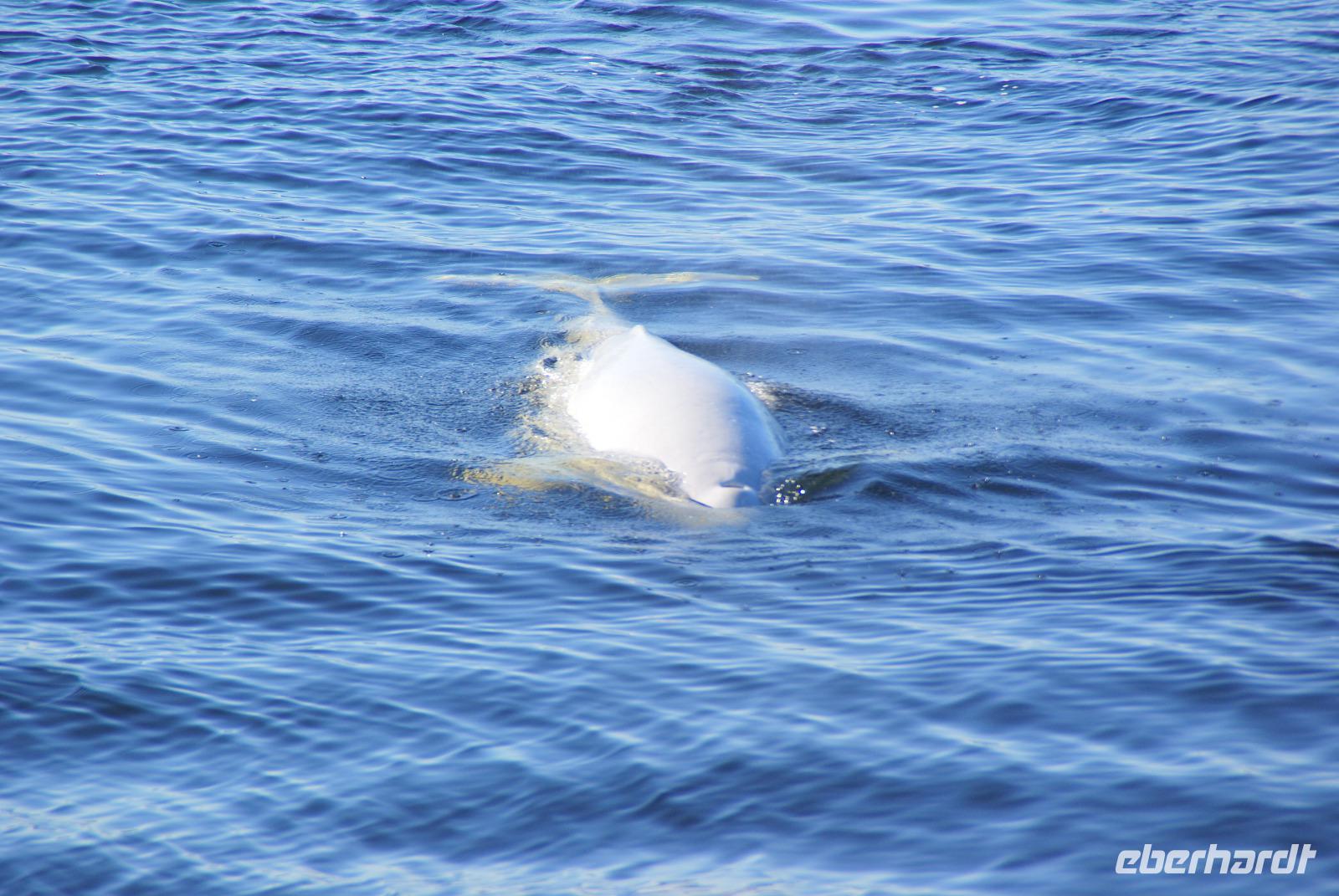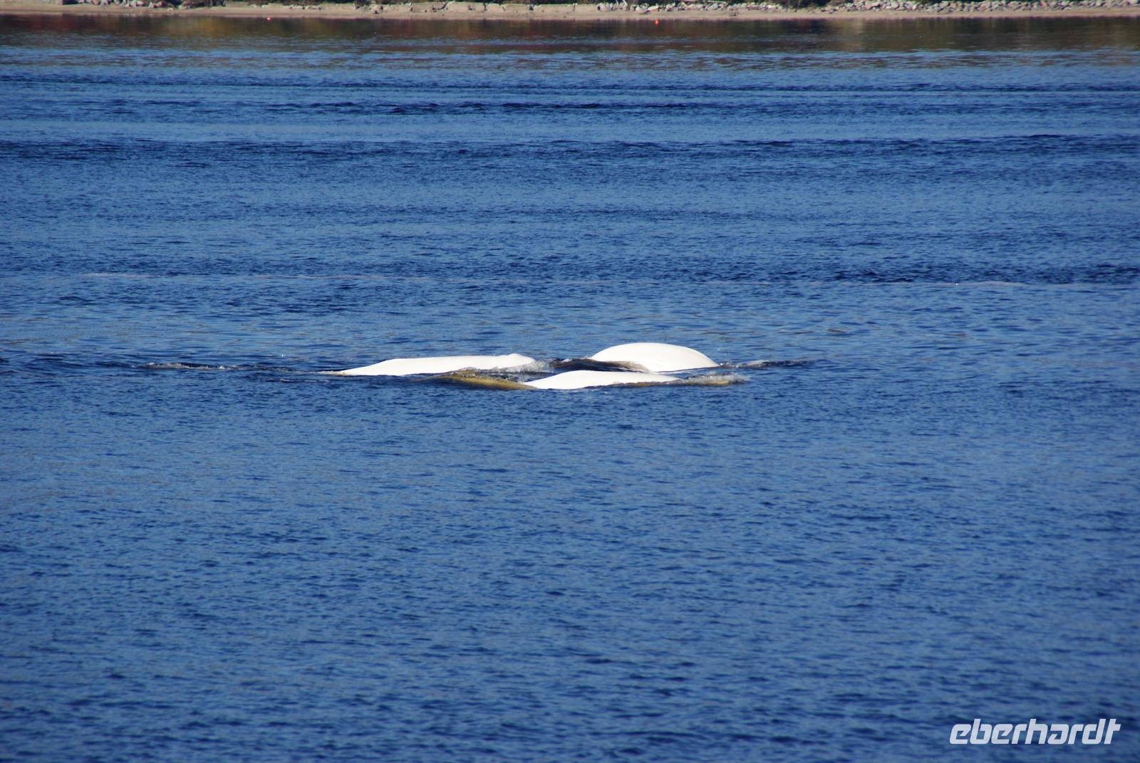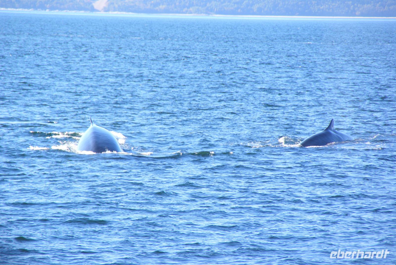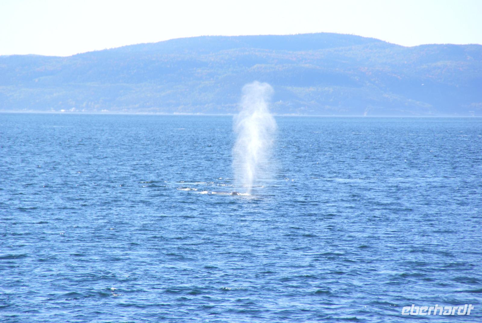 Am Morgen starten wir gemütlich in Richtung Tadoussac. Es geht über eine Fähre, die uns in 15 Minuten zum anderen Ufer bringt, von wo die Walbeobachtungen starten werden. Zunächst informieren wir uns im Besucherzentrum und erhalten interessante Einblicke in die Forschungsarbeiten der Walbeobachter und staunen über die riesigen Skelette, die an der Decke hängen. Bald sollte es an Bord gehen und bei erneutem Traumwetter fahren wir auf dem St. Lorenz Strom hinaus. Bereits nach kurzer Zeit sehen wir die ersten schneeweißen Belugas, bald sollten Finn-und Minke Wale folgen. Was für ein beeindruckendes Erlebnis. Später schmunzeln wir über unsere Fotos, denn Wale fotografieren ist gar nicht so einfach! Viele haben nun etliche Bilder vom blauen Meer, in welches der Wal wieder abgetaucht ist! Zurück im Bus sind wir uns alle einig-es hätte besser nicht sein können. Ein Traumtag-wir an Bord, die Wale in Sichtweite-haben wir es gut! Eine malerische Rückfahrt durch die bunte Natur bringt uns zurück nach La Malbaie und wir freuen uns auf das bevorstehende Abendessen im „Allegro", welches uns wortwörtlich froh stimmt. In unseren heutigen Träumen schwimmt bestimmt der ein oder andere Wal vorbei.