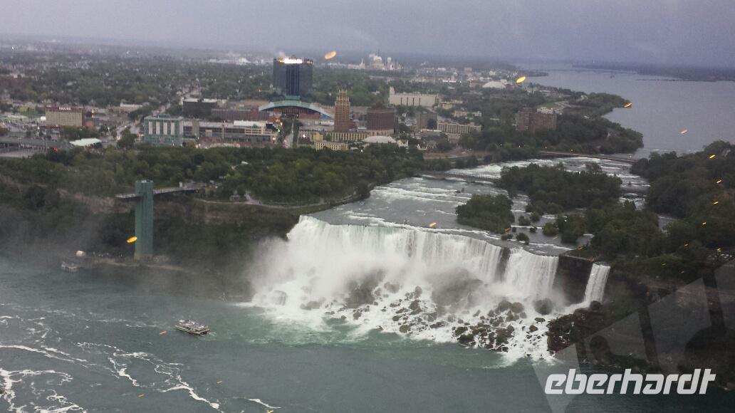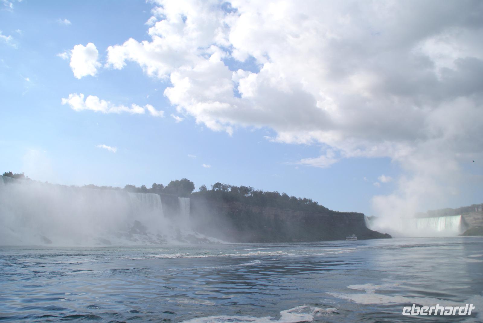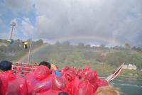 Heute fahren wir mit dem „Hornblower", einer der beiden Bootsgesellschaften, direkt an die Niagara Fälle ran, wohl verpackt in einheitliche rote Regencapes stehen wir gespannt an Deck. Es bietet sich uns ein unvergessliches Panorama, welches noch von einem wunderbaren Regenbogen getoppt wird, der sich vor uns auftut. Was für ein Erlebnis. Wir sind sehr froh, diese Gelegenheit wahrnehmen zu können bei Sonnenschein und Wolken, haben wir ein Glück!