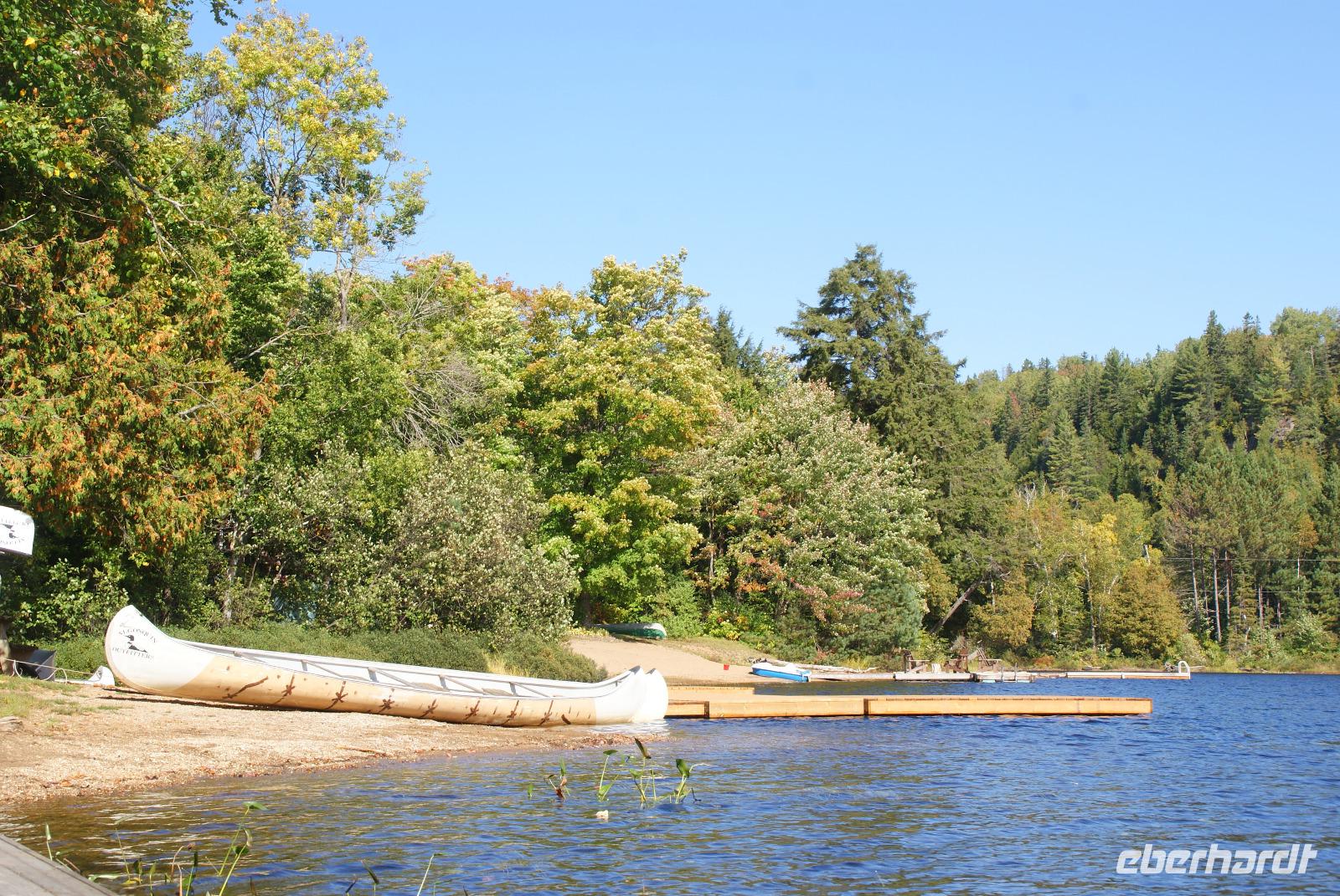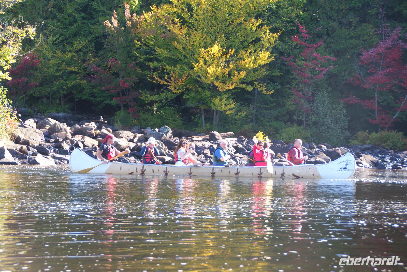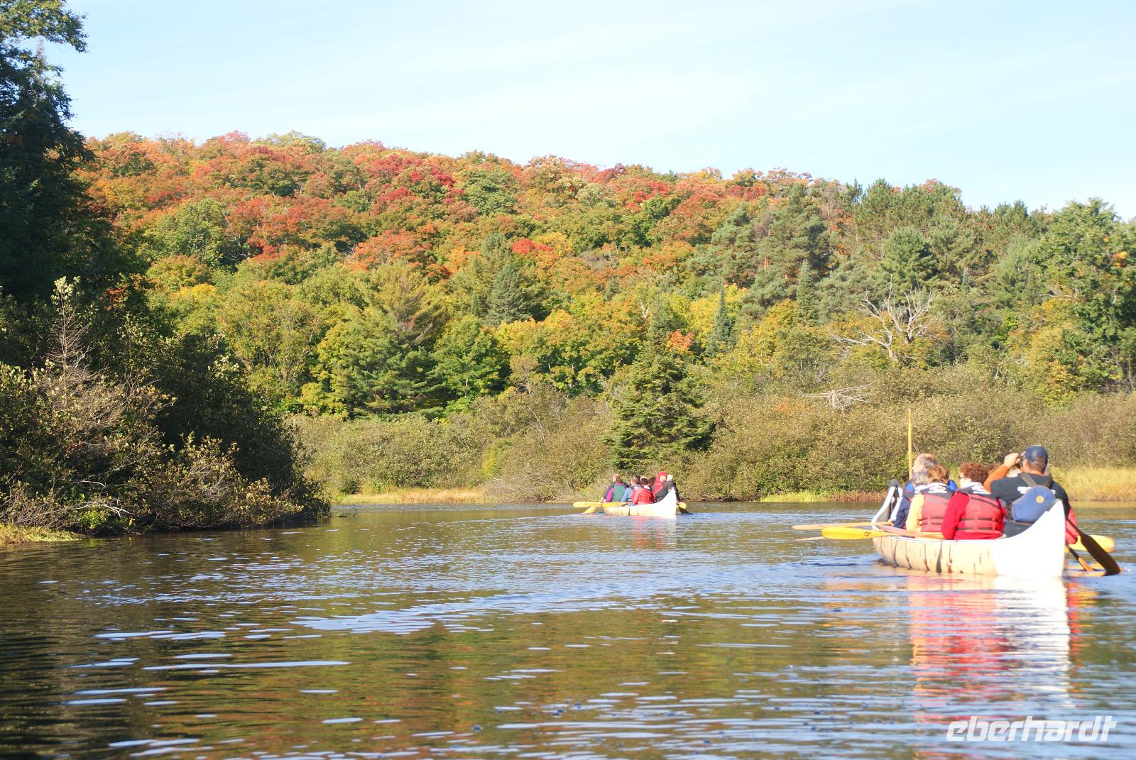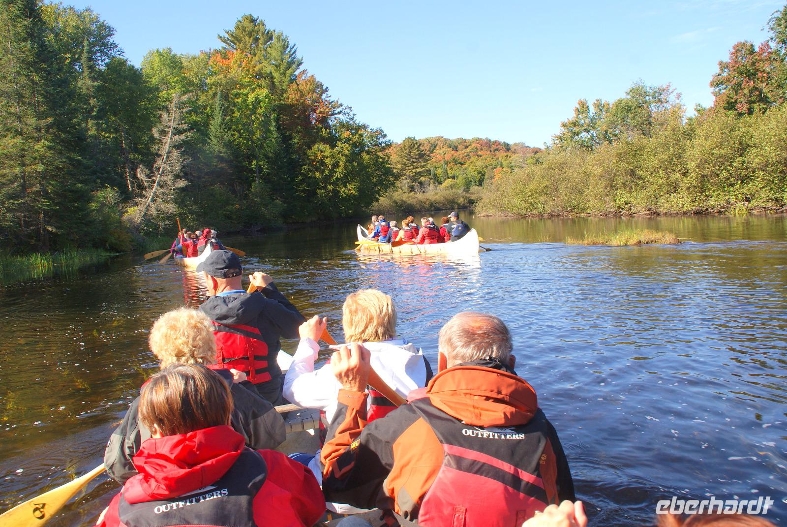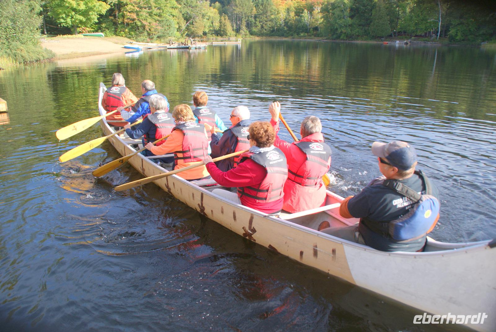 Natur-wir kommen! Heute starten wir nach einem wunderbaren Frühstück mit Ausblick auf Natur und See zu einer 2-stündigen Kanutour. Gut gelaunt verteilen wir uns auf 3 Kanus und paddeln um die Wette. Es ist Kaiserwetter-die Natur zückt all ihre Joker und der Indian Summer erweist sich die Ehre. Bunte Bäume und der berühmte Zucker-Ahorn mit seinen knallroten Blättern lässt uns entzücken! Welche eine Kulisse und wir dürfen alles hautnah bei Sonnenschein und milden 22 Grad erleben. Besser geht es einfach nicht.