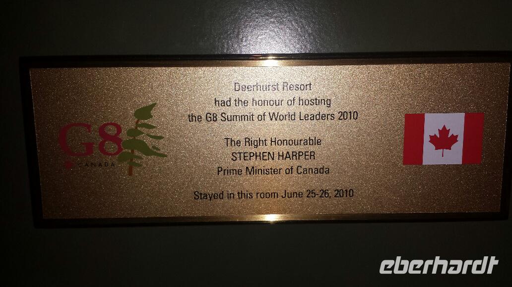 Am Vormittag verlassen wir die Fälle und fahren weiter nach St. Marie among the Hurons einer Mission, die 1639 von französischen Jesuiten gegründet wurde. Am originalen Schauplatz erkunden wir die liebevoll nachgestellten Bauten und erfahren viel Wissenswertes über das damalige Leben der Missionare. Am frühen Abend erreichen wir unser „Zuhause" für die nächsten beiden Tage und sind sehr beeindruckt vom Deerhurst Resort, Nähe des Algonquin Parks, welches im Jahr 2010 für den G8 Gipfel als Herberge für diverse Staatsoberhäupter diente. So nächtigen einst in „unserem" Hotel u.a. Angela Merkel, der damalige Kanadische Premierminister Stephen Harper sowie der einstiege italienische Ministerpräsident Berlusconi. WOW-und wir Eberhardt Gäste mittendrin...das bekommt auch nicht jeder!!!