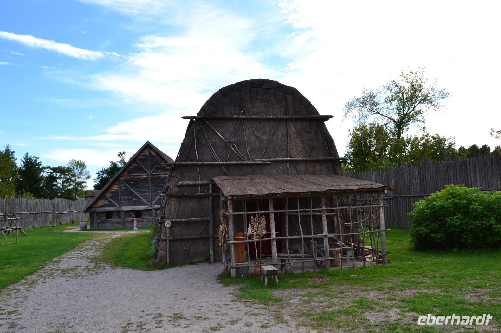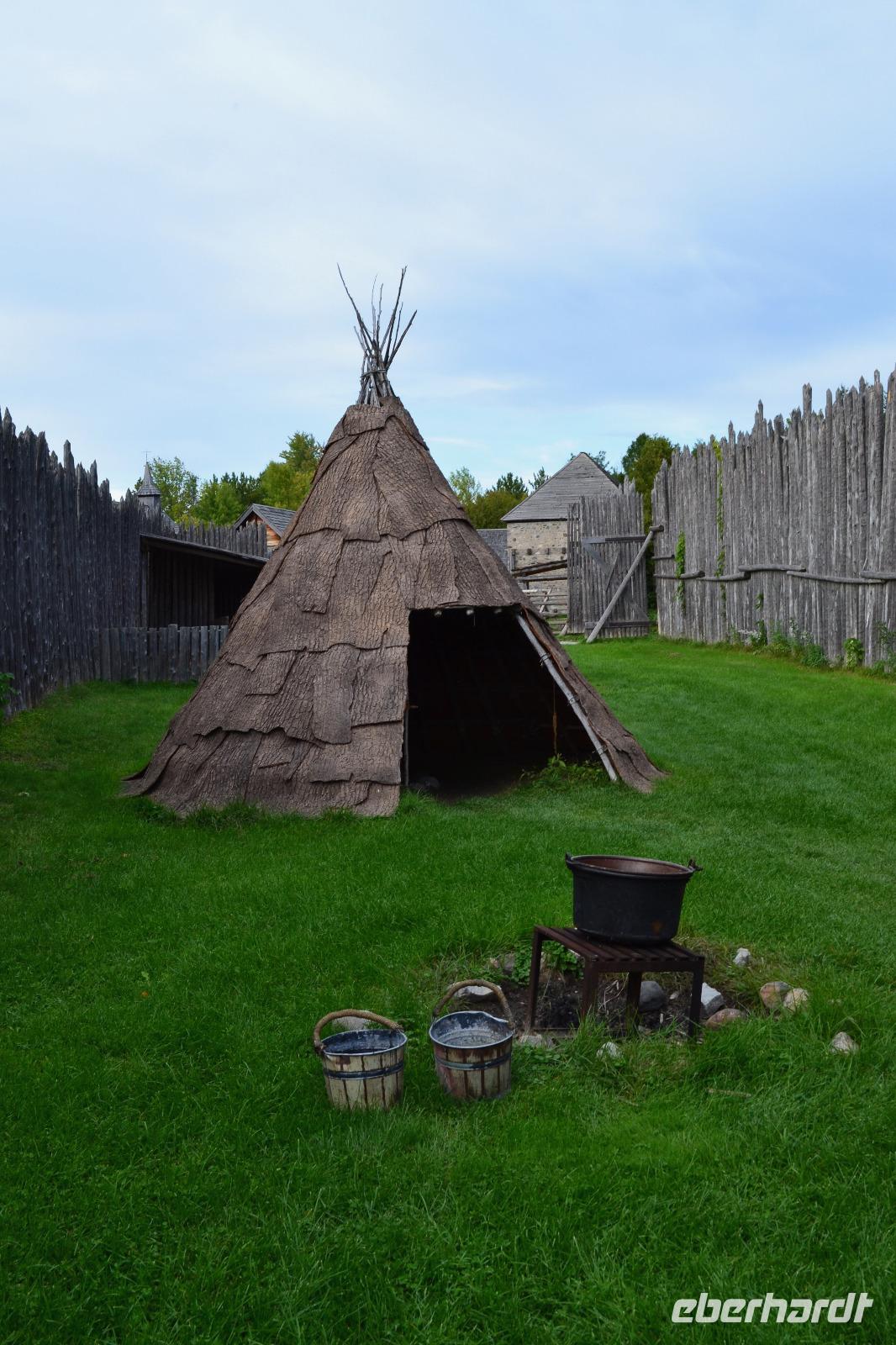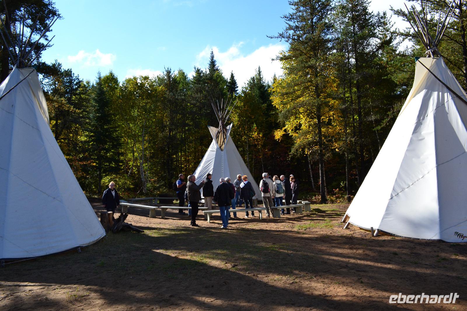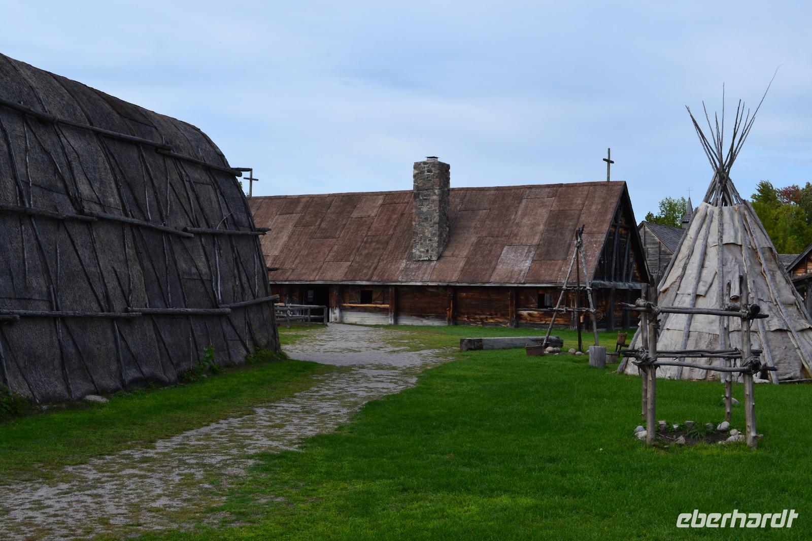 Da meine Gäste unbedingt mal so richtig nassgespritzt werden wollen, fahren wir am heutigen Morgen mit dem Boot direkt an die Niagarafälle heran. In rote Regencapes eingewickelt sehen wir aus wie die sieben Zwerge. Mir reicht allerdings eine Dusche am Tag und so verstecke ich mich hinter der Glasscheibe auf dem unteren Deck. So ist wenigstens die Kamera geschützt. Als erstes fahren wir an die amerikanischen Wasserfälle heran um eine kleine Kostprobe zu erhalten. Dann geht es in Richtung Horseshoe Falls. Das Tosen der Wassermassen wird so laut, dass ich kein Wort mehr verstehen kann. Man sieht nur noch eine weiße Wand aus Gischt. Als wir zur Anlegestelle zurückfahren, sehen wir einen wunderschönen Regenbogen. Für einen kurzen Photostopp fahren wir noch einmal mit dem Bus zu den kanadischen Fällen hinauf, und kurz nach 11 Uhr verlassen wir Niagara Falls und fahren wieder am Ufer des Lake Ontario entlang Richtung Toronto. Gern würde ich noch ein paar Tage hier verbringen und mit meinen Gästen in das bunte multikulturelle Leben dieser pulsierenden Stadt eintauchen. Jedoch sieht das Programm vor, dass wir stattdessen nach Norden abbiegen. Im Museumsdorf Sainte-Marie among the Hurons erhalten wir zunächst ein reichhaltiges Mittagessen, bevor wir eine Videopräsentation anschauen und dann durch die Anlage geführt werden. 1639 wurde von französischen Jesuiten an dieser Stelle eine Mission gegründet um das Hinterland zu erschließen und die Seelen der ortsansässigen Wendat-Indianer zu retten. Doch harte Winter und Konflikte mit den Irokesen setzten den Bewohnern schwer zu. Als der Konflikt mit den Irokesen eskalierte, musste die Mission schließlich nur zehn Jahre später wieder aufgegeben werden. Nachdem wir einen sehr anschaulichen Eindruck in das beschwerliche Leben der ersten Europäer in Kanada erhalten haben, setzen wir unsere Fahrt fort. Gegen 18 Uhr erreichen wir das Hidden Valley Resort kurz hinter Huntsville, unweit des Algonquin Provincial Parks. Das gemütliche Hotel verfügt über einen Swimmingpool, eine Sauna und ein sehr gutes Restaurant. Wir sind uns alle einig, dass wir es hier die nächsten beiden Nächte aushalten werden.