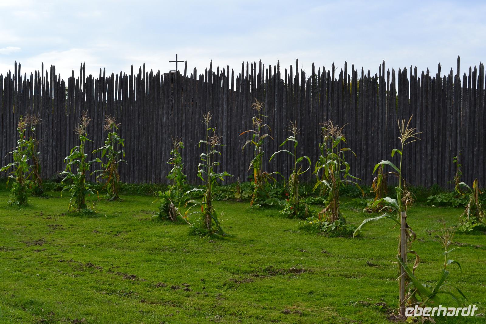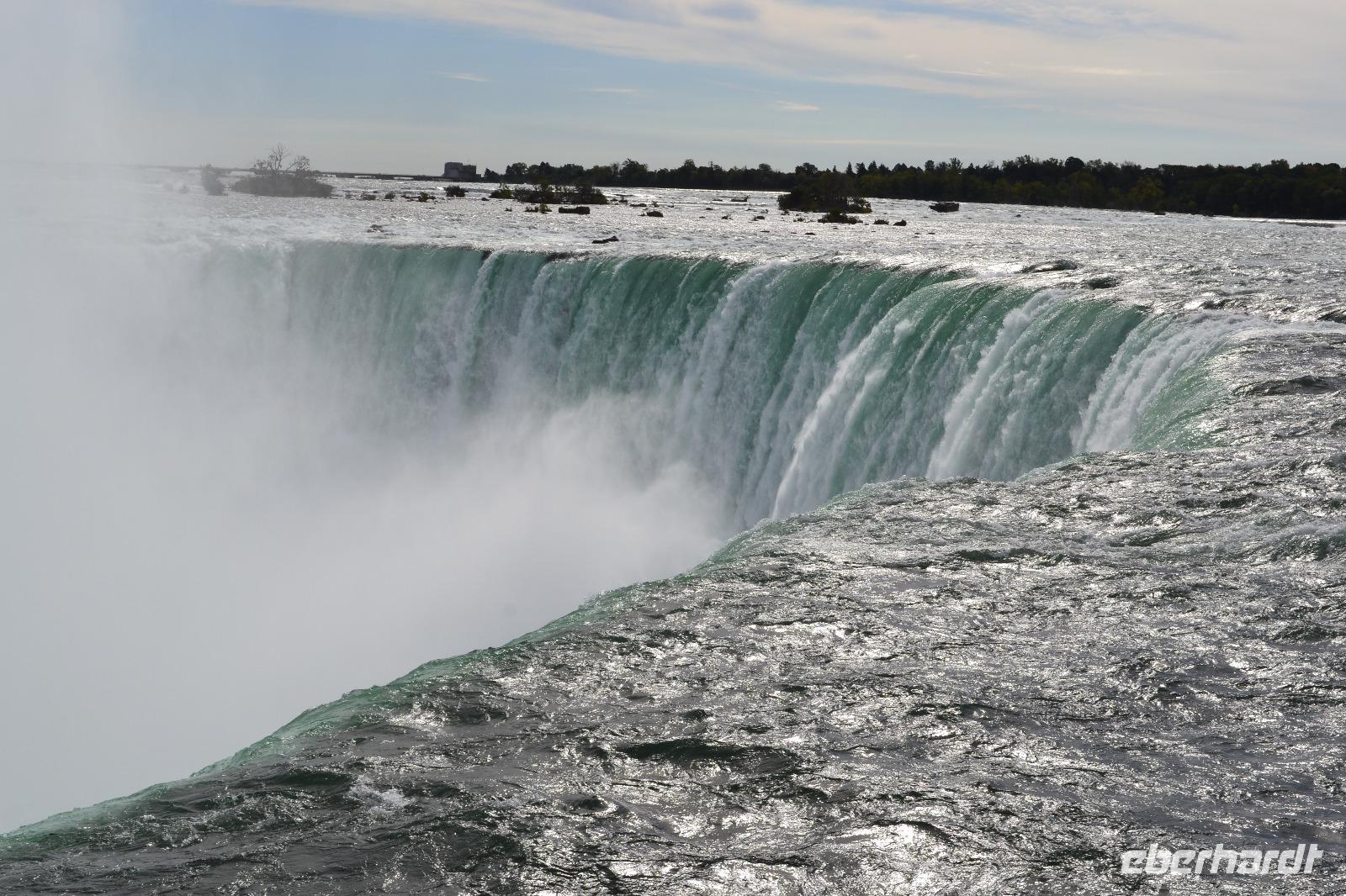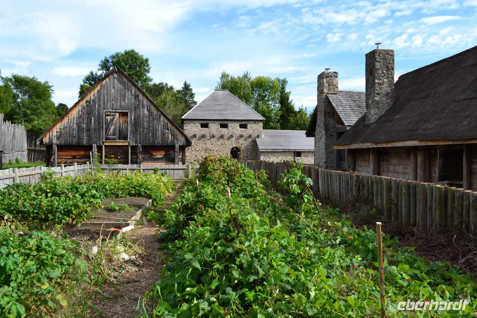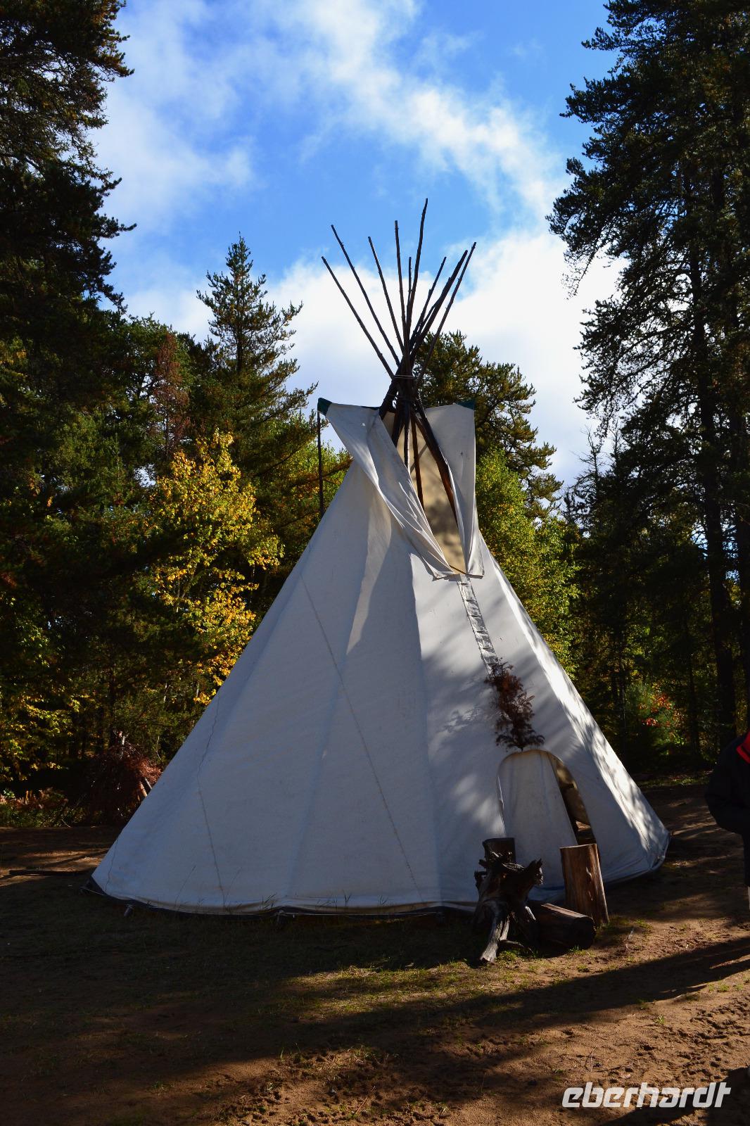 Da meine Gäste unbedingt mal so richtig nassgespritzt werden wollen, fahren wir am heutigen Morgen mit dem Boot direkt an die Niagarafälle heran. In rote Regencapes eingewickelt sehen wir aus wie die sieben Zwerge. Mir reicht allerdings eine Dusche am Tag und so verstecke ich mich hinter der Glasscheibe auf dem unteren Deck. So ist wenigstens die Kamera geschützt. Als erstes fahren wir an die amerikanischen Wasserfälle heran um eine kleine Kostprobe zu erhalten. Dann geht es in Richtung Horseshoe Falls. Das Tosen der Wassermassen wird so laut, dass ich kein Wort mehr verstehen kann. Man sieht nur noch eine weiße Wand aus Gischt. Als wir zur Anlegestelle zurückfahren, sehen wir einen wunderschönen Regenbogen. Für einen kurzen Photostopp fahren wir noch einmal mit dem Bus zu den kanadischen Fällen hinauf, und kurz nach 11 Uhr verlassen wir Niagara Falls und fahren wieder am Ufer des Lake Ontario entlang Richtung Toronto. Gern würde ich noch ein paar Tage hier verbringen und mit meinen Gästen in das bunte multikulturelle Leben dieser pulsierenden Stadt eintauchen. Jedoch sieht das Programm vor, dass wir stattdessen nach Norden abbiegen. Im Museumsdorf Sainte-Marie among the Hurons erhalten wir zunächst ein reichhaltiges Mittagessen, bevor wir eine Videopräsentation anschauen und dann durch die Anlage geführt werden. 1639 wurde von französischen Jesuiten an dieser Stelle eine Mission gegründet um das Hinterland zu erschließen und die Seelen der ortsansässigen Wendat-Indianer zu retten. Doch harte Winter und Konflikte mit den Irokesen setzten den Bewohnern schwer zu. Als der Konflikt mit den Irokesen eskalierte, musste die Mission schließlich nur zehn Jahre später wieder aufgegeben werden. Nachdem wir einen sehr anschaulichen Eindruck in das beschwerliche Leben der ersten Europäer in Kanada erhalten haben, setzen wir unsere Fahrt fort. Gegen 18 Uhr erreichen wir das Hidden Valley Resort kurz hinter Huntsville, unweit des Algonquin Provincial Parks. Das gemütliche Hotel verfügt über einen Swimmingpool, eine Sauna und ein sehr gutes Restaurant. Wir sind uns alle einig, dass wir es hier die nächsten beiden Nächte aushalten werden.