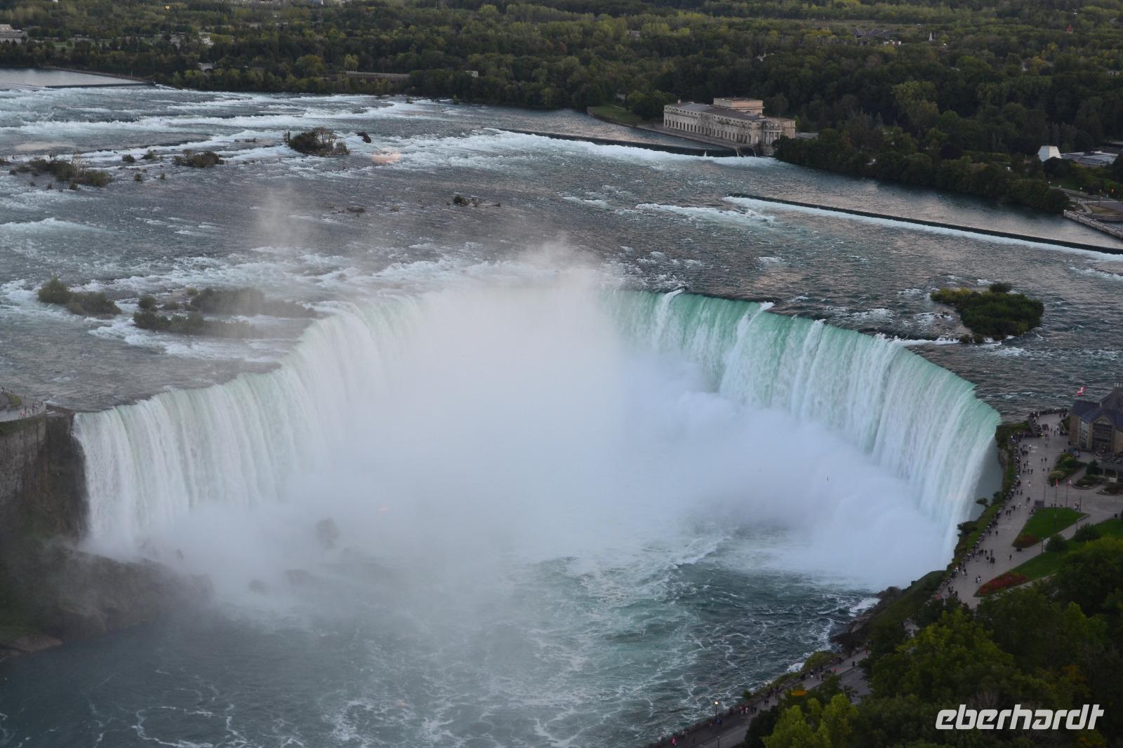 Kaum haben wir uns am reichhaltigen Frühstücksbuffet gesättigt, steht schon das nächste Highlight an: die Fahrt hinauf auf den CN-Tower. In weniger als einer Minute bringt uns der Fahrstuhl in eine Höhe von 346 m. Insgesamt ist der Turm mit der Antenne 553,33 m hoch und war bis zur Fertigstellung des Burj Khalifa das höchste freistehende Gebäude der Welt. Bei strahlendem Sonnenschein genießen wir die Aussicht auf den Financial District, die Union Station, den Lake Ontario und die Toronto Islands mit dem City Airport. Kaum zu glauben, dass der Turm, der als eines der sieben Weltwunder der Moderne gilt, in ersten Entwürfen ursprünglich ausschließlich als Sendeturm dienen sollte und Besucher nicht vorgesehen waren! Ganz mutig stelle ich mich sogar auf den Glasboden und blicke hinab in die Tiefe. Im Anschluss an unseren Besuch des CN-Towers lasse ich es mir nicht nehmen, meinen Gästen persönlich die Stadt vorzustellen, die einmal meine Heimat gewesen ist. Wir beginnen die Stadtrundfahrt an der Harbourfront, wo wir noch einmal aus dem Bus aussteigen und zum Ufer des Lake Ontario schlendern. Wir fahren durch Chinatown und das Stadtviertel „Kensington Market" mit seinen vielen kleinen viktorianischen Häusern, an der Universität, am Royal Ontario Museum (ROM) und am Queen's Park mit dem Parlamentsgebäude der Provinz Ontario vorbei. Ein weiterer Pflichtstopp ist der Nathan-Philipps-Square mit dem alten und neuen Rathaus. Schließlich fahren wir noch durch die King Street mit der Roy Thomson Hall, dem Sitz des Toronto Symphony Orchestra, und am alten Fort York vorbei, bevor wir auf den Queen Elisabeth Way abbiegen, der bis nach Niagara Falls führt. Am Nachmittag machen wir jedoch als Überraschung erst noch einen Stopp im kleinen Städtchen Niagara-on-the-Lake. Der Ort hat Museumscharakter und war einmal die Hauptstadt der britischen Kolonie Oberkanada. Wir gönnen uns ein Eis und bummeln bei strahlendem Sonnenschein gemütlich die Hauptstraße entlang. Am frühen Abend erreichen wir schließlich das Ziel unserer heutigen Reise, den Ort Niagara Falls, natürlich benannt nach den berühmten Wasserfällen. Zum Einchecken in unserem schönen Hotel „Doubletree Fallsview Resort & Spa" bleibt nicht viel Zeit, denn unser Abendessen wartet! Im Skylon Tower in 160 m Höhe werden wir mit leckeren Köstlichkeiten verwöhnt und haben einen einmaligen Ausblick sowohl auf die amerikanischen als auch die kanadischen Fälle (Horseshoe Falls). Ab 21:00 Uhr werden die Fälle dann auch bunt beleuchtet - ein Schauspiel, dass wir uns trotz des einsetzenden leichten Regens nicht entgehen lassen wollen und daher nach dem Essen noch hinunter zum Ufer spazieren.