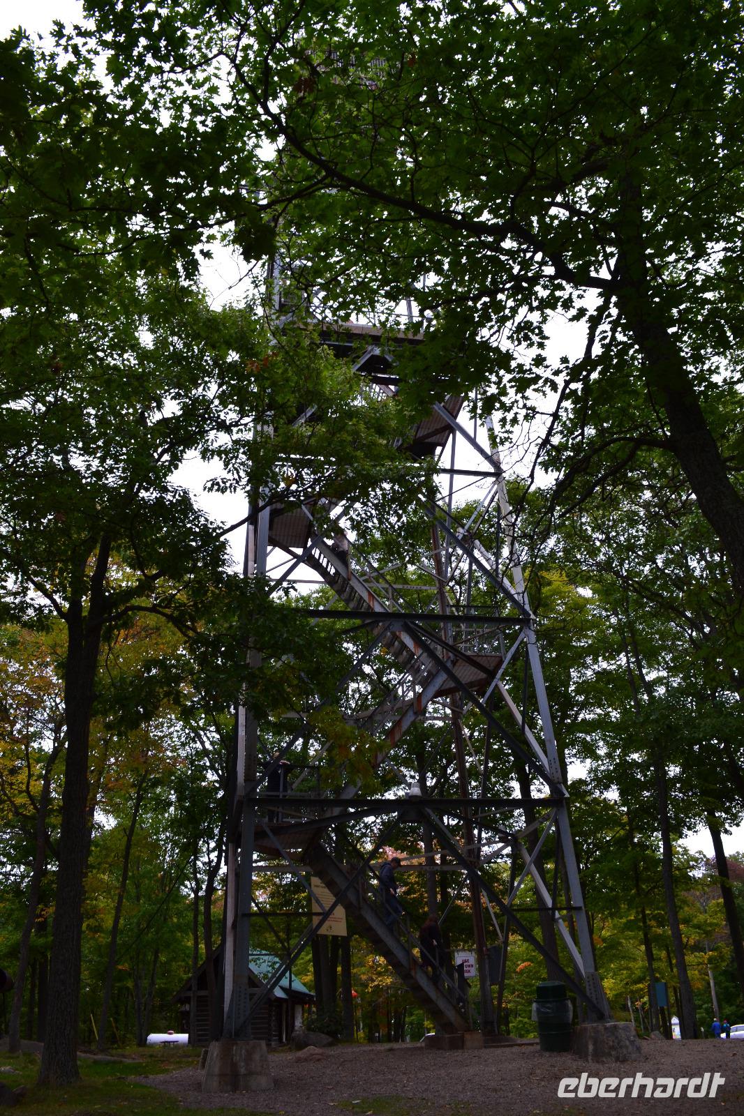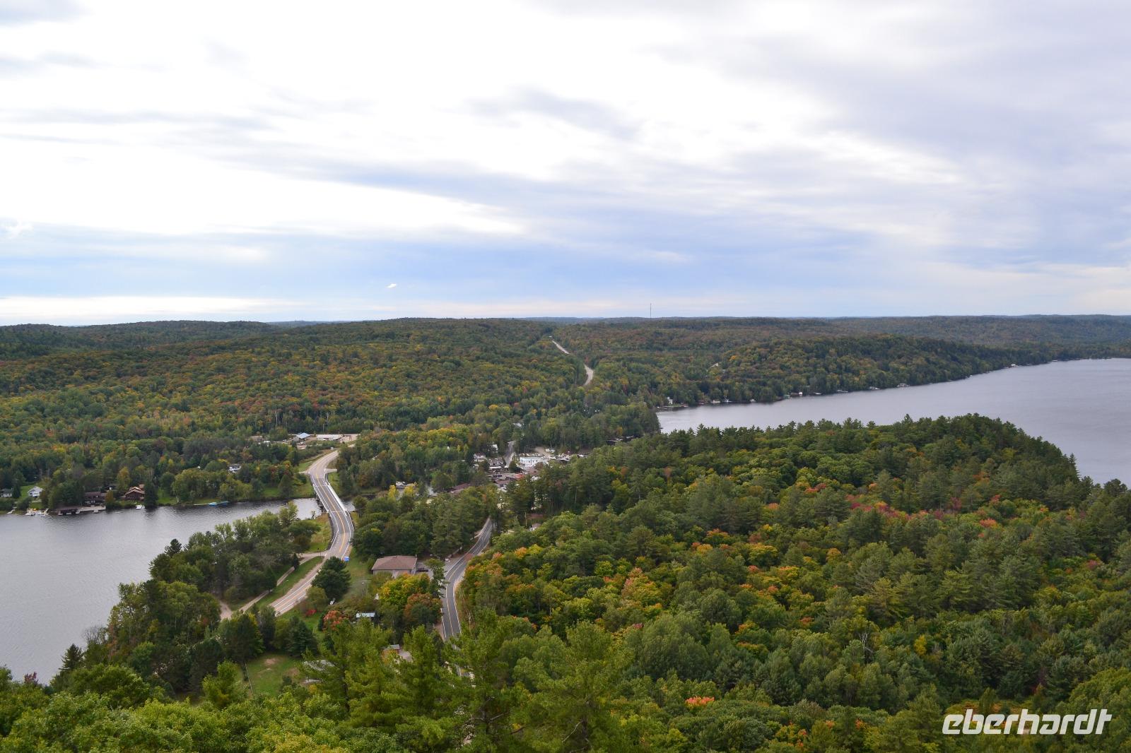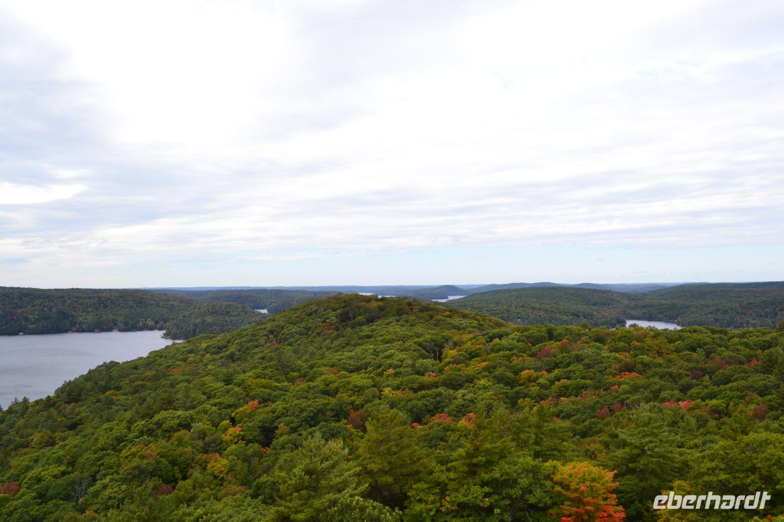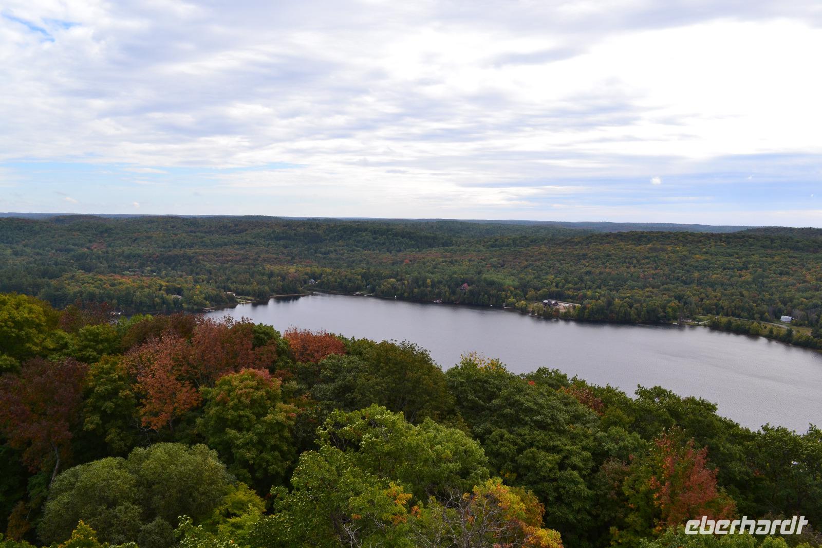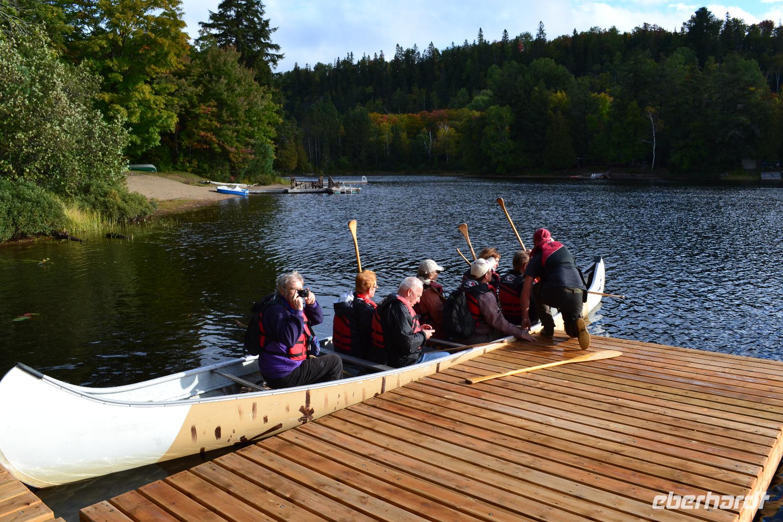 Am Oxtongue Lake warten schon unsere drei Kanus auf uns, als wir nach dem Frühstück hier ankommen. Jeder bekommt eine Schwimmweste und schnappt sich ein Paddel und schon geht es los. Auch heute scheint wieder die Sonne (haben wir ein Glück!) und badet die bunt gefärbten Wälder in ihrem warmen Licht. Mal von einem einzigen scherzhaften Kommentar, dass "man jetzt im Urlaub auch noch arbeiten muss", abgesehen, spucken alle in die Hände und legen los. Allein, während die Gäste in den anderen beiden Kanus schon fleißig um die Wette paddeln und in der Ferne davonziehen, kommen wir nicht vom Fleck - unser Guide hat vergessen uns loszubinden und wir paddeln auf der Stelle. Doch zum Glück werden wir schnell erlöst und beginnen unsere Aufholjagd. Am Ufer ziehen die verstreuten schönen Ferienhäuser mit ihren privaten Anlegestellen vorbei. Ein bisschen neidisch sind wir ja schon. Auf den herrlichen Wald, den wunderschönen See vor der Haustür und die rote Farbe des Zuckerahorns. Oh Kanada! Für gut 2,5 Stunden lassen wir die Kulisse auf uns einwirken bevor wir wieder an Land gehen. Ein bisschen hat sich der Himmel jetzt zugezogen und es wird frisch. Wir fahren zum Dorset Fire Watch Tower, den die Mutigen unter uns erklimmen, bevor wir uns zum Picknick versammeln und die uns vom Hotel mitgegebenen Lunchboxen öffnen. Peter und ich geben dazu eine Runde kanadischen Whiskey mit Ahornsirup aus - lecker! Wir fahren ins Hidden Valley zurück und verbringen den freien Nachmittag im Pool, in der Sauna oder bei einem Spaziergang am Seeufer. Nach dem Abendessen versammeln wir uns um ein Lagerfeuer und ich bringe meinen Gästen bei, wie man Marshmallows röstet und daraus S'mores macht. Das Spielen mit dem Feuer macht allen Spaß, doch den Bedarf an Marshmallows habe ich wohl etwas überschätzt. Oder anders ausgedrückt: das Abendessen war zu reichhaltig.
