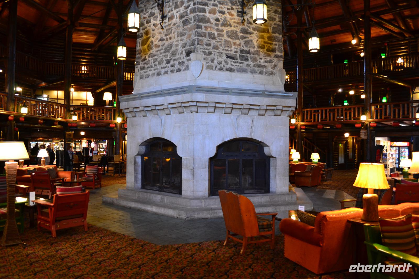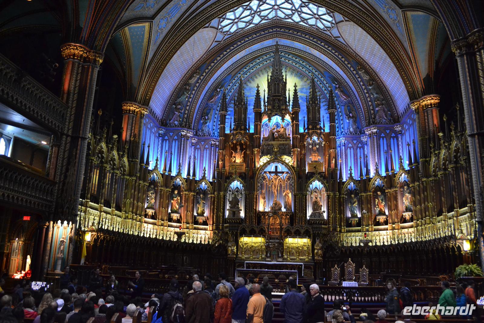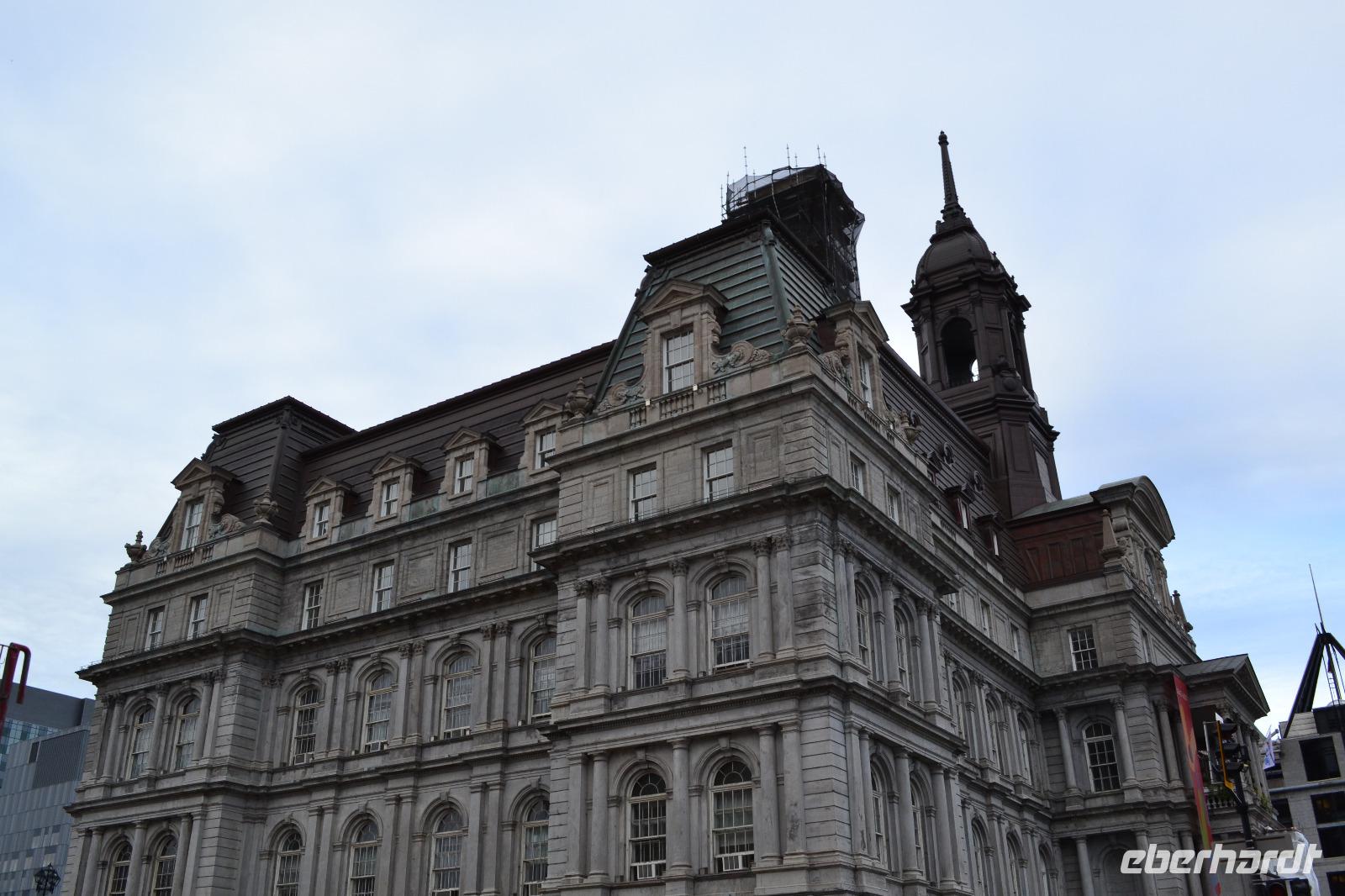 Auf dem Programm stehen heute der Parc Oméga bei Montebello und eine Stadtrundfahrt in Montréal. Da wir sehr gut durchkommen und der Wildpark noch geschlossen hat, fahren wir spontan ins kleine Zentrum des Örtchens Montebello und verfahren uns auf dem Golfplatz auf der Suche nach dem Fairmont-Hotel Château Montebello. Beim Wenden des Busses kann Paul sein Können eindrucksvoll unter Beweis stellen und erhält einen kräftigen Applaus. Das Château finden wir schließlich doch noch und der Umweg hat sich gelohnt! Nicht nur die Außenfassade des 1930 im kanadischen Blockhüttenstil erbauten Hotels ist sehr sehenswert, auch der riesige Empfangsraum mit seinem Kamin beeindruckt uns. Wir fahren wieder zum Wildpark zurück, der nun geöffnet hat, und steigen in einen umgebauten Schulbus um. Aus dem offenen Fahrzeug heraus können wir die Tiere mit Karotten füttern und ungehindert Fotos knipsen. Wir sehen Hirsche, Elche, Bisons, Wildschweine, Kojoten, Rentiere, Moschusochsen, Polarfüchse und Polarwölfe. Das Highlight kommt natürlich ganz zum Schluss: die Schwarzbären! Ja, der Besuch hat sich auf jeden Fall gelohnt! Nach einer kleinen Mittagspause müssen wir auch schon weiter, denn unsere Stadtführerin Ann-Marie erwartet uns in Montréal. Und sie hat natürlich viel mit uns vor, denn Montréal hat eine Menge zu bieten. Vom Mont Royal blicken wir nach Osten auf das Olympiastadion und das ehemalige olympische Dorf, bevor wir den Bus zurück in der Innenstadt am Place d'Armes für einen ausgedehnten Spaziergang durch die Altstadt verlassen. Leider müssen wir den Besuch der Basilika Notre-Dame auf den nächsten Tag verschieben, aber da wir am Sonntag viel Zeit haben, ist das nicht weiter schlimm. Dafür steigen wir noch hinab in die sogenannte „Unterstadt" von Montréal. Da es im Winter in Québec sehr kalt werden und entsprechend viel Schnee auf den Straßen liegen kann, sind die meisten Gebäude in der Innenstadt über ein Tunnelnetzwerk miteinander verbunden, so dass man hier unten von der Metrostation aus direkt zur Arbeit oder shoppen gehen kann. 33 km umfasst das System und man kann sich auf den verschiedenen Ebenen durchaus verlaufen. Also gehen wir lieber wieder hinauf an die Oberfläche und lassen uns von Paul zum Hotel „Le Nouvel" fahren, wo wir nach dem Check-In unser Abendessen einnehmen.