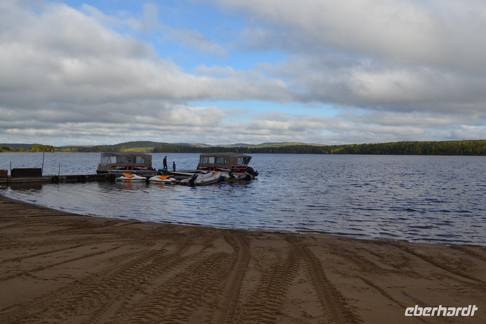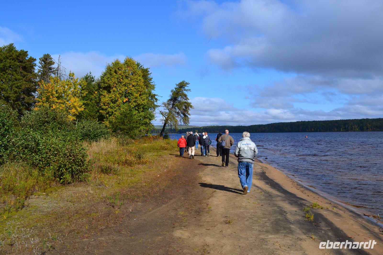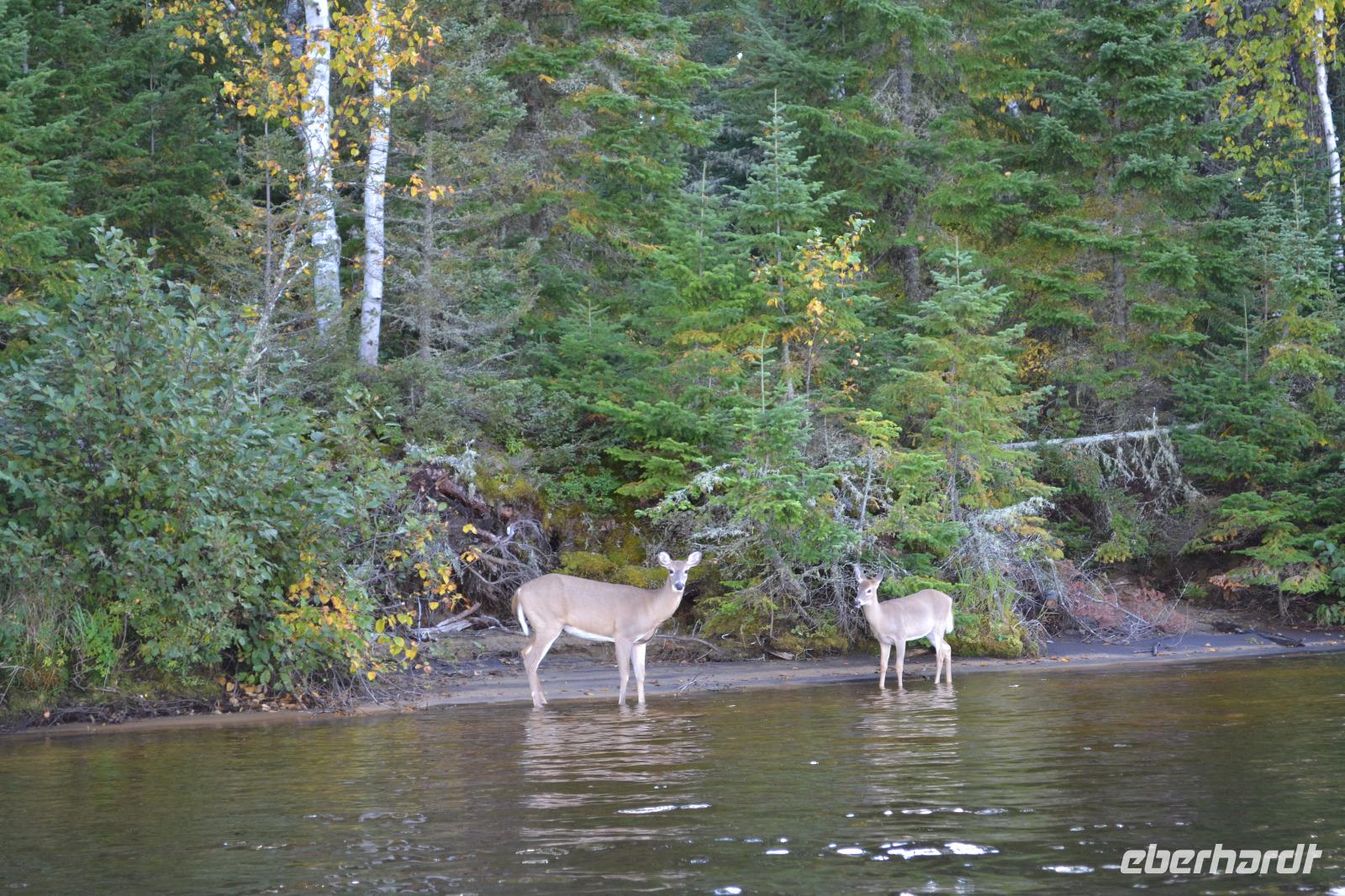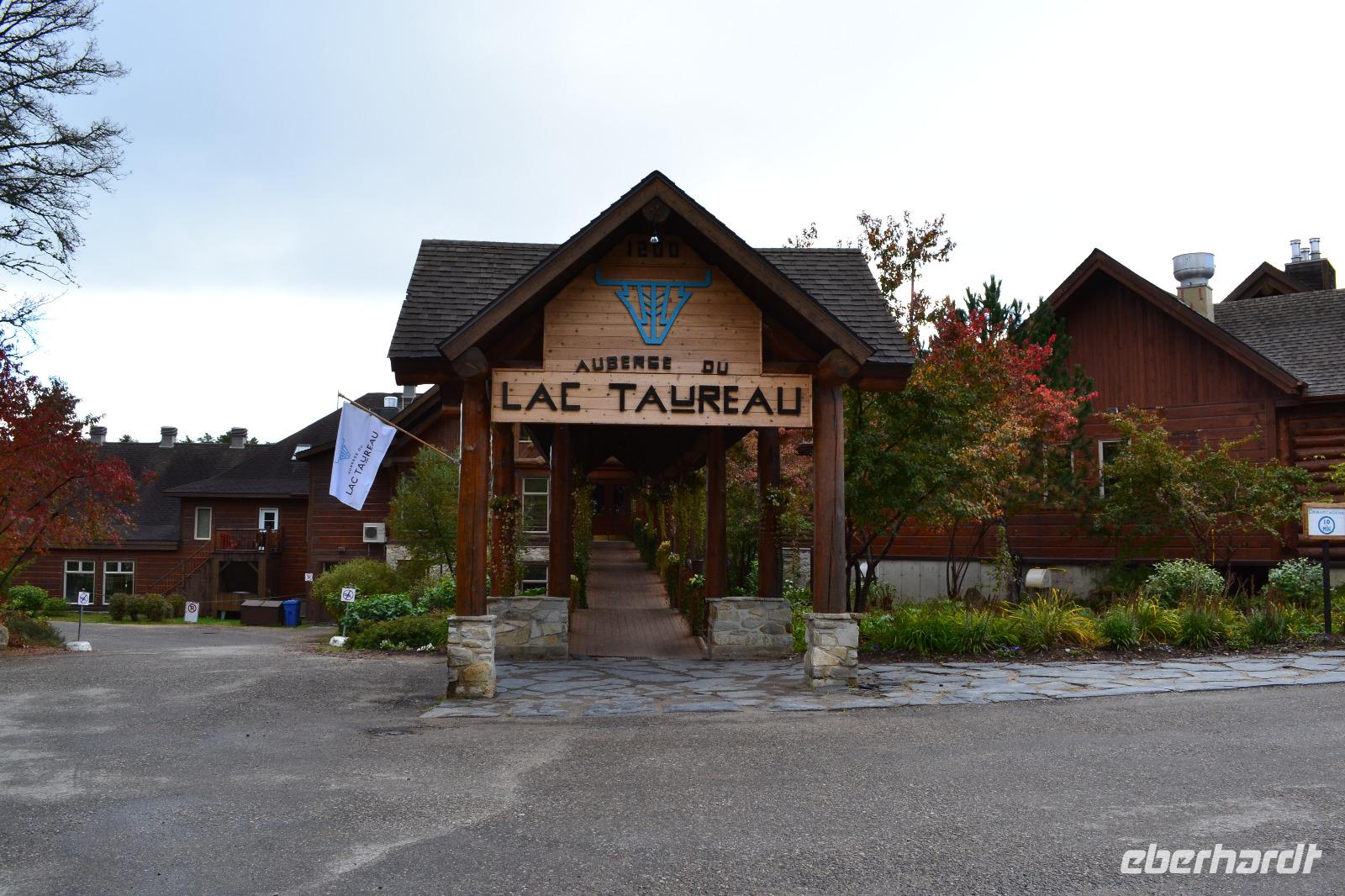 Kein Weckruf heute, jeder kann machen, was er will! Ob Angeln, im Whirlpool entspannen, im Schwimmbad seine Bahnen ziehen, mit dem Kayak oder Kanu über den See paddeln - das rustikale Ressort-Hotel „Auberge du Lac Taureau" bietet für jeden etwas. Als ich mich mit Peter um 10 Uhr zu einem Spaziergang treffe, sind trotzdem fast alle versammelt. Offenbar haben die Gäste Angst, dass wir beide uns allein im Wald verlaufen - ich bin gerührt. Also los! Gemütlich spazieren wir am Ufer des Stausees entlang, später dann durch den Wald. Etwas besser beschildert könnten die Wege tatsächlich sein, aber wir finden den richtigen Rückweg. Am Ende haben wir 9 km in den Beinen und uns eine Stärkung verdient! Um 14 Uhr steigen Peter und ich mit sieben Gästen dann sogar noch in Kayaks und machen den See unsicher. Ein schöner Tag, der durch zwei neugierige Rehe - einer Mutter mit ihrem Kind - noch zusätzlich versüßt wird. Wir folgen ihnen, während sie sich mit artistischen Sprüngen am Seeufer entlang bewegen. Große Angst scheinen sie vor uns nicht zu haben. Vor dem Abendessen noch kurz in den Whirlpool gehüpft, denn auch ein Reiseleiter muss sich mal erholen! Nach Einbruch der Dunkelheit versammeln wir uns dann erneut um ein Lagerfeuer und rösten die restlichen Marshmallows. Es lässt sich auf jeden Fall gut leben in Kanada!