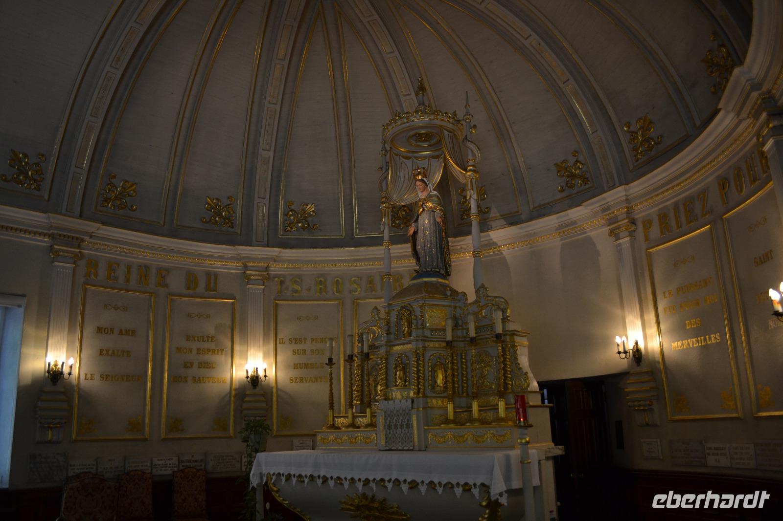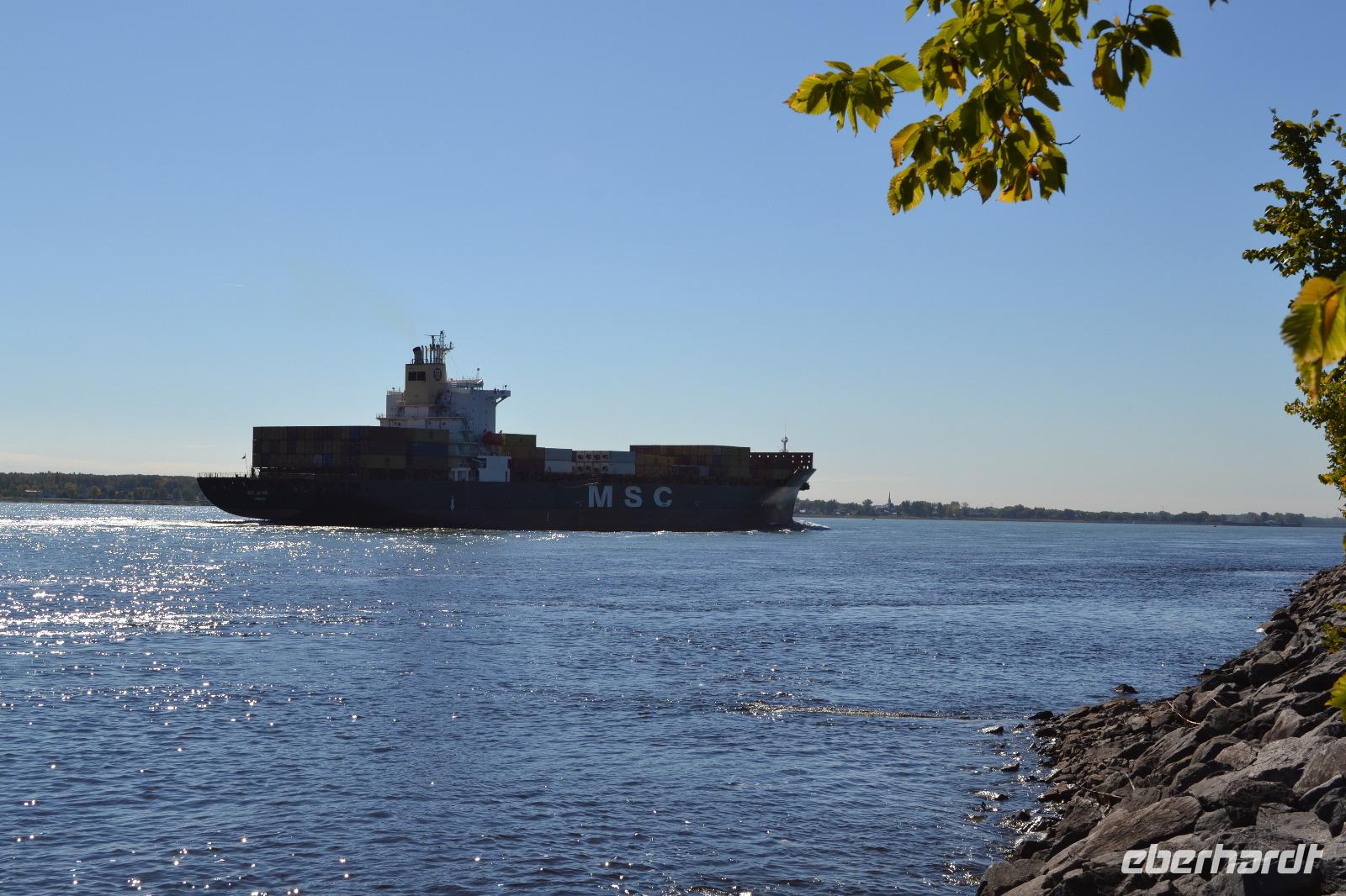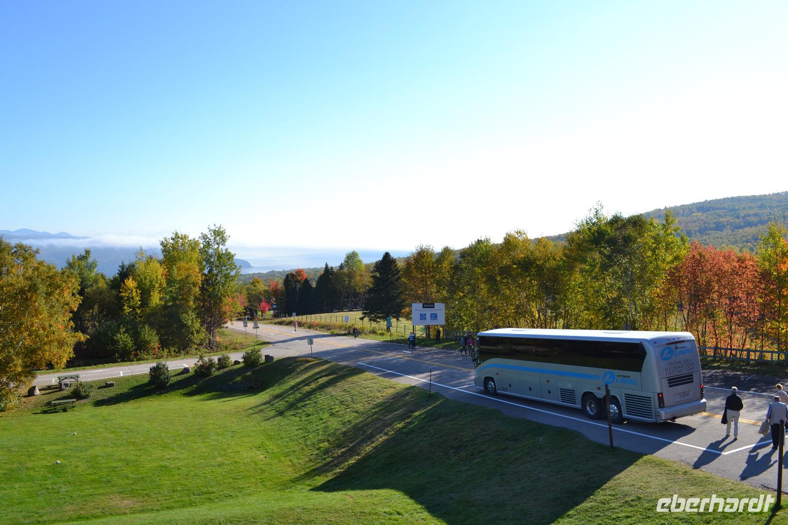 Nach dem reichhaltigen Frühstück verabschieden wir uns vom Lac Taureau, obwohl wir uns gern noch länger im Whirlpool entspannt hätten. Doch unser Programm führt uns wieder in Richtung Süden an das Ufer des Sankt-Lorenz-Stroms. An der Wallfahrtskirche Notre-Dame-du-Cap in Trois-Rivières legen wir heute unseren ersten Stopp ein. An diesem Ort sollen sich zwei mysteriöse Wunder ereignet haben - zuerst soll sich eine Brücke aus Eis über den Sankt-Lorenz-Strom geformt und später dann soll die Marienstatue in der alten Kirche (eine der ältesten Steinkirchen Nordamerikas) vor drei Zeugen ihre Augen geöffnet haben. Architektonisch interessant ist die moderne Basilika auf jeden Fall, doch bzgl. der Wunder bin ich sehr skeptisch. Fast interessanter sind die riesigen Containerschiffe, die den Strom hinauf in Richtung Montréal fahren. Nach einem Mittagsstopp geht es weiter zu den Montmorency-Wasserfällen östlich der Provinzhauptstadt Québec. Wieder einmal lacht die Sonne vom strahlend blauen Himmel. Über das Wetter können wir uns auf dieser Reise wahrlich nicht beklagen! Die Wassermassen stürzen sich insgesamt 84 m in die Tiefe. Damit sind die Fälle sogar 30 m höher als die Niagarafälle! Wir laufen vom Parkplatz aus bis auf die Hängebrücke und dann auf der anderen Seite die Treppe bis zum mittleren Pavillon hinunter, da man von hier aus einen sehr schönen Ausblick auf die Fälle hat. Anschließend fährt uns Paul durch herrlich bunt gefärbte Wälder bis nach La Malbaie zu unserem nächsten Hotel „Le Petit Manoir du Casino".