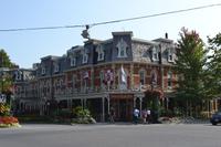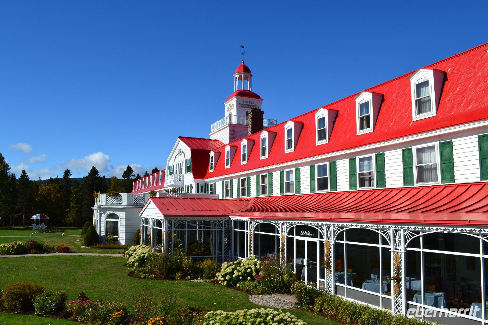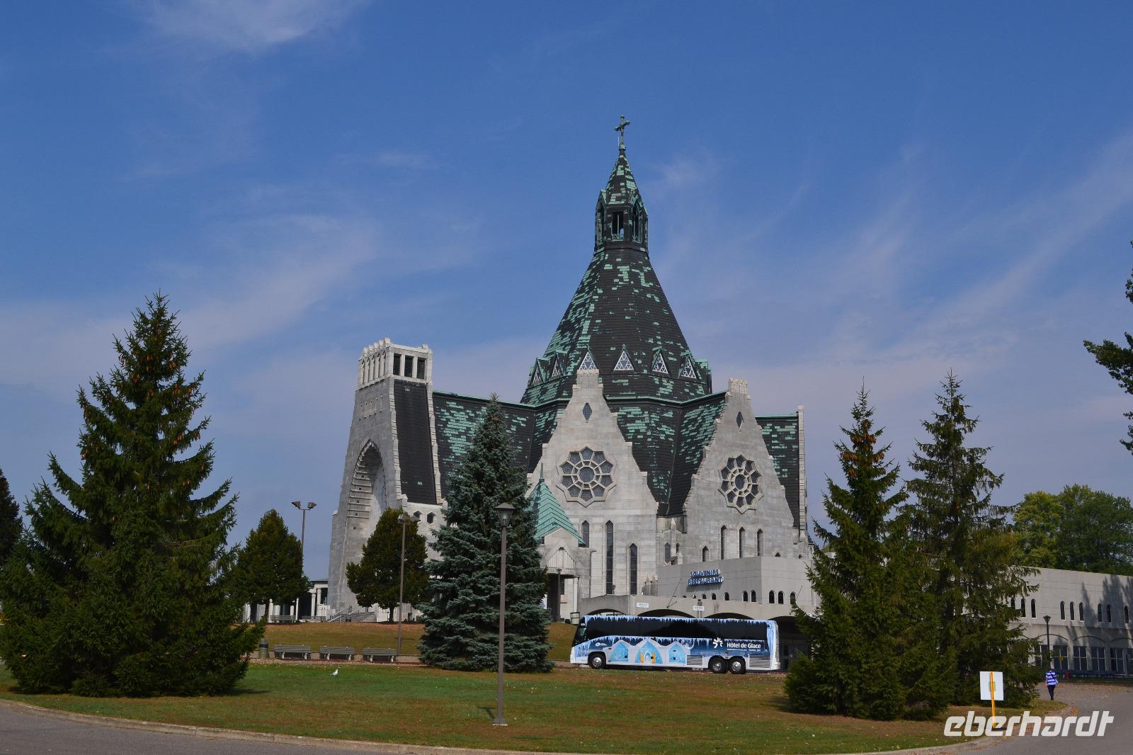 Heute müssen wir zurück in die Zivilisation, was in Ostkanada bedeutet: zurück an den St.-Lorenz-Strom. Über Nacht hat es das erste Mal auf unserer Reise geregnet und merklich abgekühlt. Wir fahren durch einsame Wälder und nebelverhangene Täler. Erster offizieller Stopp ist an der Wallfahrtskirche Notre-Dame-du-Cap in Trois-Rivières. An diesem Ort sollen sich zwei mysteriöse Wunder ereignet haben - zuerst soll sich eine Brücke aus Eis über den Sankt-Lorenz-Strom geformt und später dann soll die Marienstatue in der alten Kirche (eine der ältesten Steinkirchen Nordamerikas) vor drei Zeugen ihre Augen geöffnet haben. Später wurde dann die moderne und auch sehr beeindruckende Basilika gebaut. Doch meine Gäste interessieren sich komischerweise viel mehr für die riesigen kanadischen Campervans, die am Ufer des Sees geparkt sind. Da nutze ich doch das Glockengeläut der Basilika um 12 Uhr gleich als Signal zum Einsteigen in den Bus, bevor noch jemand fremdgeht. Über den Chemin du Roi fahren wir immer nach Nordosten entlang des Flusses durch kleine Ortschaften mit hübschen kleinen Häuschen. Nach der Mittagspause bei Tim Hortons fahren wir weiter an Quebec vorbei zu den Montmorency-Wasserfällen. Diese sind vielleicht nicht so breit, aber nochmal 30 m höher als die Niagarafälle, stürzen sich also 87 m in die Tiefe. Am besten geht man hier über die Hängebrücke auf die andere Seite und dann die Treppe hinunter zu den drei Aussichtspavillons. Doch wir halten auch noch einmal unten am Fuß der Fälle für einen weiteren Photostopp. Später auf der Fahrt nach La Malbaie halten wir an der Touristeninformation der Region Charlevoix, in der wir erfahren, dass die ganze Region ein riesiger Einschlagskrater ist. Vor 350 Millionen Jahren, zu einer Zeit, als die Kontinente noch miteinander verbunden waren, hinterließ ein Asteroid einen Krater mit einem Durchmesser von 54 km, den Charlesvoix-Krater. Fast die gesamte Bevölkerung der Region lebt heute im Inneren des Kraters, denn hier ist das Land am fruchtbarsten. Kurz bevor wir unser Hotel in La Malbaie erreichen, fängt es wieder an zu regnen, ziemlich heftig sogar, aber wir müssen ja nur noch zum Abendessen.