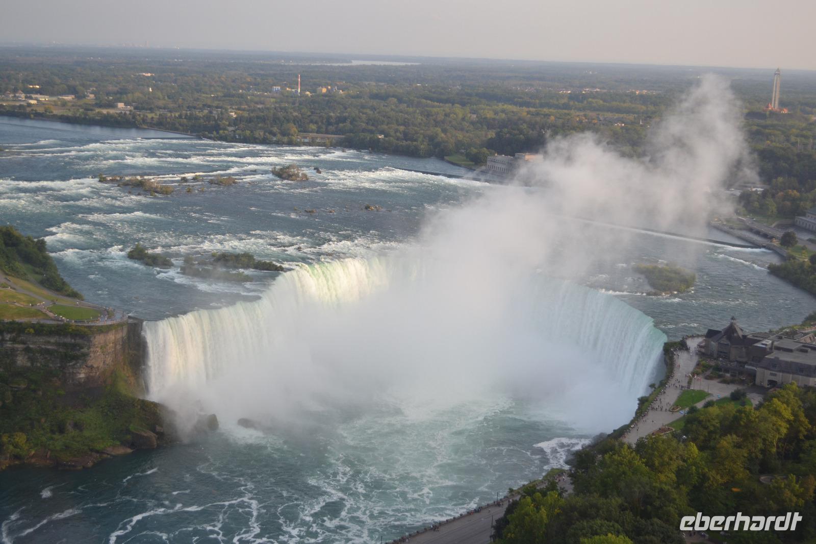 Um einen Überblick über so eine große Stadt zu erhalten, wählt man am besten die Vogelperspektive. Daher wollen wir gleich nach dem Frühstück hinauf auf den berühmten CN Tower. Ein banger Blick nach oben: Noch liegt eine Wolkendecke über der Stadt. Ob sie wohl noch aufreißen wird? Der CN Tower ist mit Antenne 533 m hoch und zählt zu den sieben neuen Weltwundern. Bis zur Fertigstellung des Burj Khalifa war er zudem das höchste freistehende Gebäude der Welt. Nachdem uns der Fahrstuhl in weniger als einer Minute auf eine Höhe von 346 m gebracht hat, können wir beruhigt aufatmen, denn wir haben einen herrlichen Blick über die Innenstadt und die drei vorgelagerten Toronto Islands. Wieder am Boden machen wir einen kleinen Spaziergang entlang der Harbourfront und tanken ein bisschen Sonne. Heute und auch die nächsten Tage sollen es über 30 Grad werden! Wir haben ja mit vielem gerechnet, aber nicht mit einem richtigen Sommerurlaub! Zum Glück ist der Bus angenehm kühl, als wir mit der kleinen Stadtrundfahrt beginnen. Sie führt uns durch Chinatown, das Stadtviertel „Kensington Market", an der Universität, am Royal Ontario Museum und am Parlament der Provinz Ontario vorbei. Gegen Mittag halten wir auch am Nathan-Philipps-Square, an dem sich sowohl das neue als auch das alte Rathausgebäude befinden. Von hier aus schlendern wir auch gleich hinüber ins Eaton Centre, das größte Shopping Centre von Kanada, zur Mittagspause. Hier haben meine Gäste die Auswahl zwischen griechischer, koreanischer, japanischer, vietnamesischer, italienischer und amerikanischer Küche und bekommen so zumindest einen kleinen Einblick in die kulinarische Vielfalt dieser tollen Stadt. Zurück am Rathaus steigen wir wieder in den Bus und müssen Toronto leider schon langsam verlassen. Wir fahren aber noch durch die King Street mit der Roy Thomson Hall, dem Sitz des Toronto Symphony Orchestra, und am alten Fort York vorbei, dem Ursprung der heutigen Stadt. Dann geht es auf die andere Seite des Ontariosees, in die größte Weinanbaugegend Kanadas. Oh, und es hängen soooo viele leckere Trauben an den Rebstöcken. Das kleine Örtchen Niagara-on-the-Lake war einmal die Hauptstadt der britischen Kolonie Upper Canada und lädt uns sorgfältig rekonstruiert zu einem kleinen Bummel ein. Bei diesen Temperaturen können wir uns auch ruhig mal ein Eis gönnen. Nach einem Photostopp am „Whirlpool", einer abrupten Biegung des Niagara River, erreichen wir dann schon bald unser nächstes Hotel in Niagara Falls, der selbsternannten Flitterwochen-Hauptstadt der Welt. Im Skylon Tower können wir uns am Abend mit einem herrlichen Blick auf die Wasserfälle am Buffet so richtig den Bauch vollschlagen. Damit wir nicht gleich am zweiten Tag schon an Gewicht zusetzen, machen wir zum Abschluss des Tages noch einen Spaziergang hinunter an die Wasserfälle und erleben nach Einbruch der Dunkelheit ein eindrucksvolles Farbenspiel.