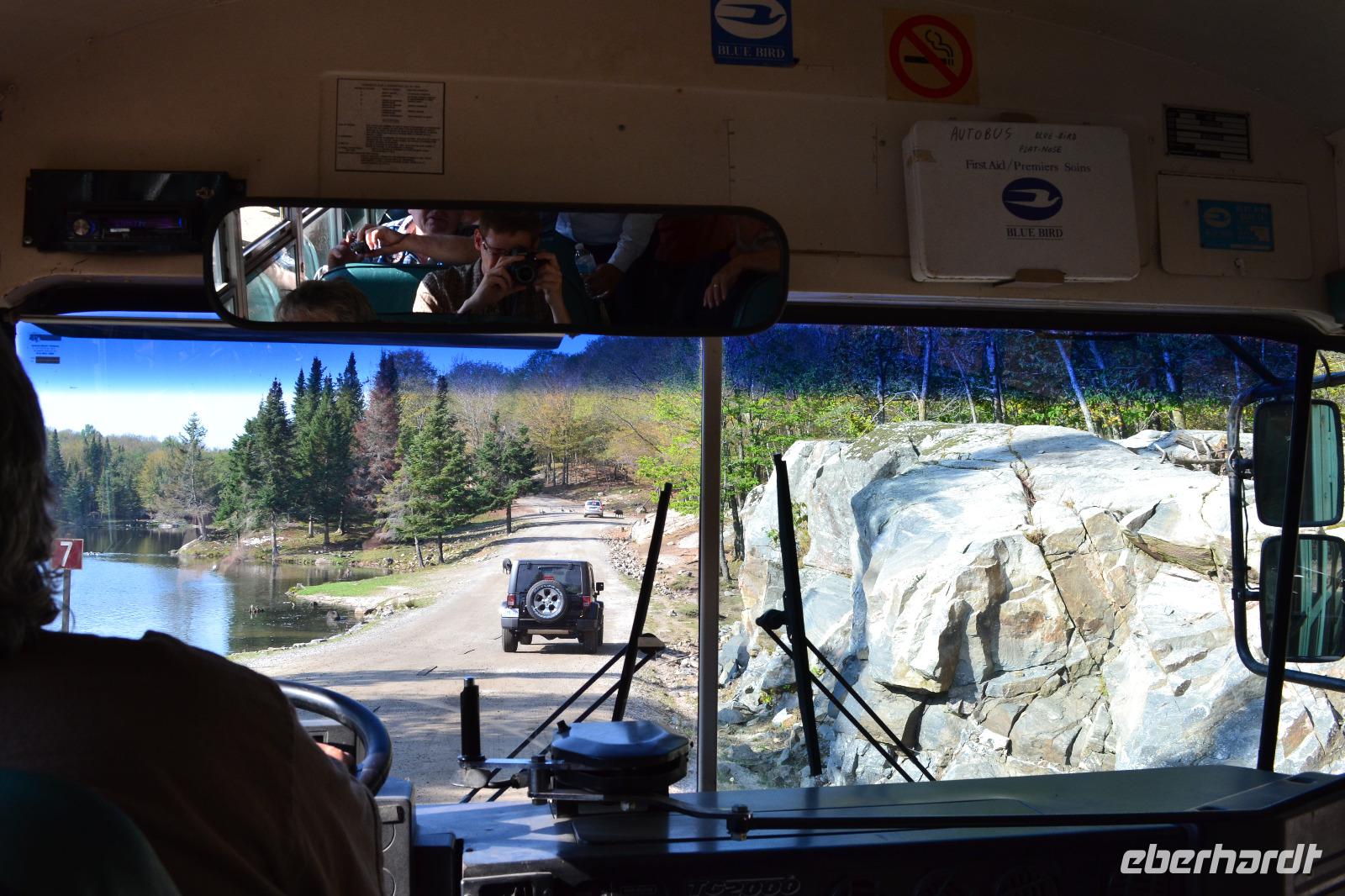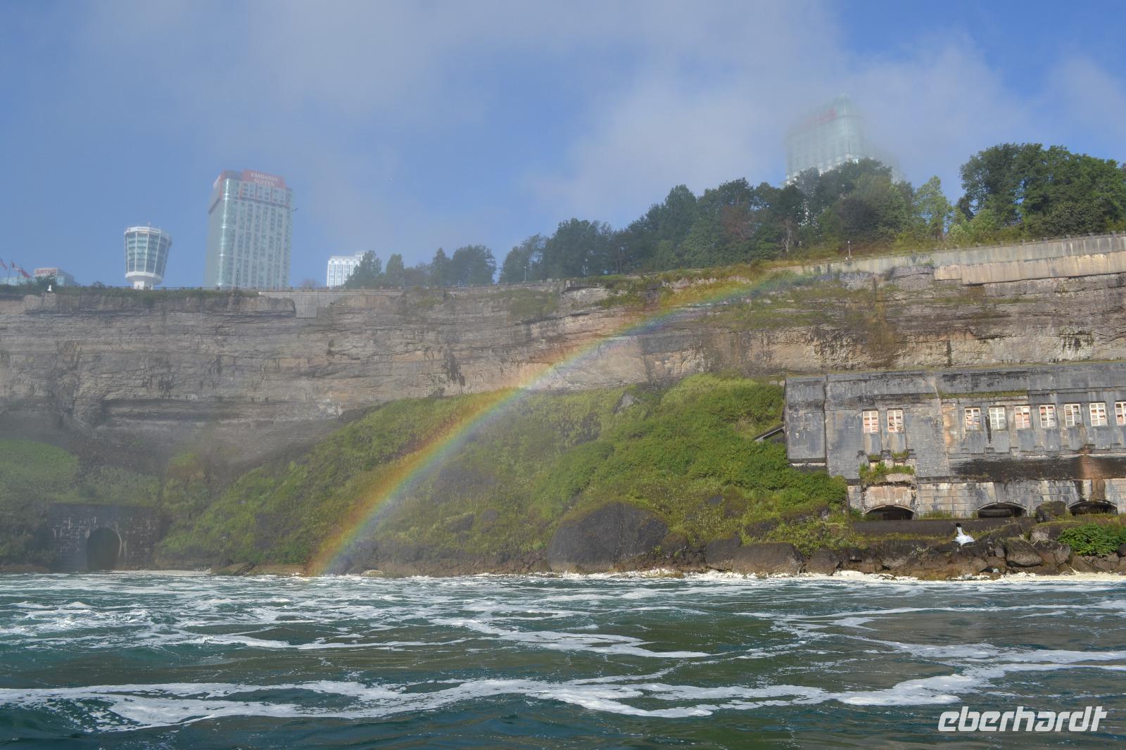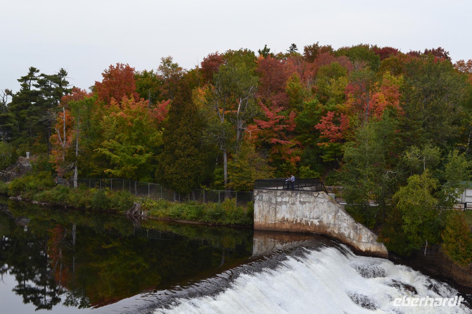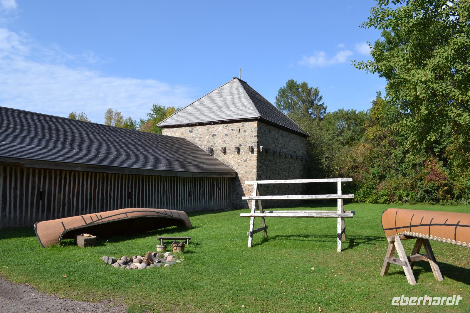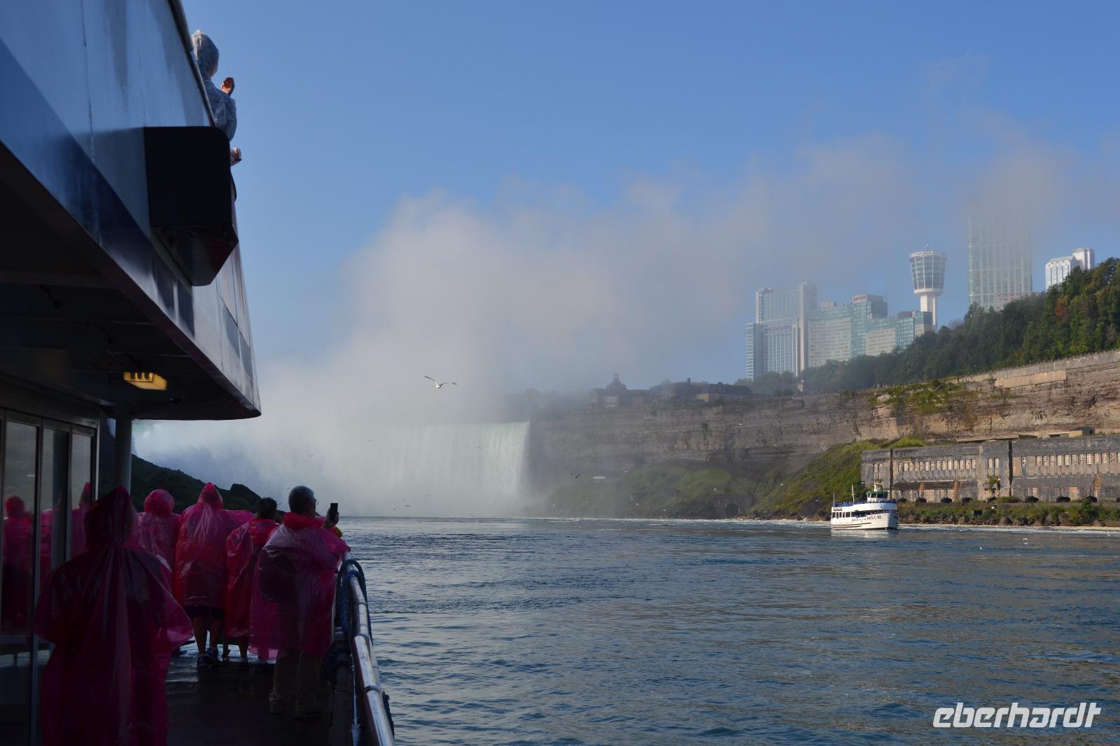 Wie die sieben Zwerge stehen wir in unsere roten Regenponchos eingehüllt kurz nach 9 Uhr morgens auf dem Boot auf dem Niagara River und ich frage mich für einen Moment, worauf ich mich hier bloß wieder eingelassen habe. Ich kann mich aber wieder hinter der Glasscheibe auf dem Unterdeck verstecken und das Schauspiel beobachten. Es dauert nicht lange, und alle, die draußen stehen, sind nassgespritzt vom Kopf bis zu den Zehenspitzen. Und da fahren wir gerade erst an den amerikanischen Wasserfällen vorbei. Das große Spektakel aber sind die Horseshoe Falls, an die wir so dicht heranfahren, dass man nur noch eine weiße Wand aus Gischt sehen kann. Und natürlich hinterher aussieht, wie ein begossener Pudel - es sei denn, man sitzt hinter der Glasscheibe auf dem Unterdeck. Für mich das schönste an dieser Bootsfahrt ist aber der Regenbogen, den wir auf der Rückfahrt zur Anlegestelle sehen. Der Fahrstuhl von der Bootsanlegestelle hinauf zum Parkplatz weist uns unmissverständlich darauf hin, dass wir als Gruppe gestern Abend im Skylon Tower insgesamt wohl zu viel gegessen haben, denn er weigert sich standhaft, uns alle zusammen hinaufzufahren, obwohl im Fahrstuhl eigentlich noch viel Platz ist. Uns bleibt nur, uns aufzuteilen, um erlöst zu werden. Es bleibt noch etwas Zeit, um ein Gruppenfoto in unseren tollen Regencapes zu machen und zum Besucherzentrum zu fahren, um uns die Fälle von oben anzuschauen, bevor wir Niagara Falls wieder verlassen müssen. Wir wollen ja den Indian Summer erleben, und dazu müssen wir erstmal ein ganzes Stück nach Norden fahren. Auf dem Weg nach Huntsville besichtigen wir das Museumsdorf Sainte-Marie among the Hurons. Nach einem reichhaltigen Mittagessen und einer Videoeinführung können wir erkunden, wie sich die ersten Europäer in diesem Teil Kanadas - Jesuiten aus Frankreich - in dieser Missionsstation inmitten der Nation der Wendat-Indianer eine Existenz aufbauten und für 10 Jahre überlebten, bevor sie in einen Konflikt mit den Irokesen gerieten und die Siedlung schließlich aufgeben mussten. Das angegliederte Museum entführt uns außerdem sehr anschaulich in das Zeitalter der vielen Entdeckungsreisen, die in der ersten Hälfte des 16. Jahrhunderts von Europa aus starteten. Es ist kurz nach 18 Uhr, als wir das Hidden Valley Resort kurz hinter Huntsville erreichen, an einem malerischen See gelegen, unweit des Algonquin Provincial Parks. Wir lassen den Tag dann noch gemütlich im Restaurant ausklingen, auch wenn wir nach dem ausgiebigen Mittagsmahl immer noch nicht wieder richtig Hunger haben.