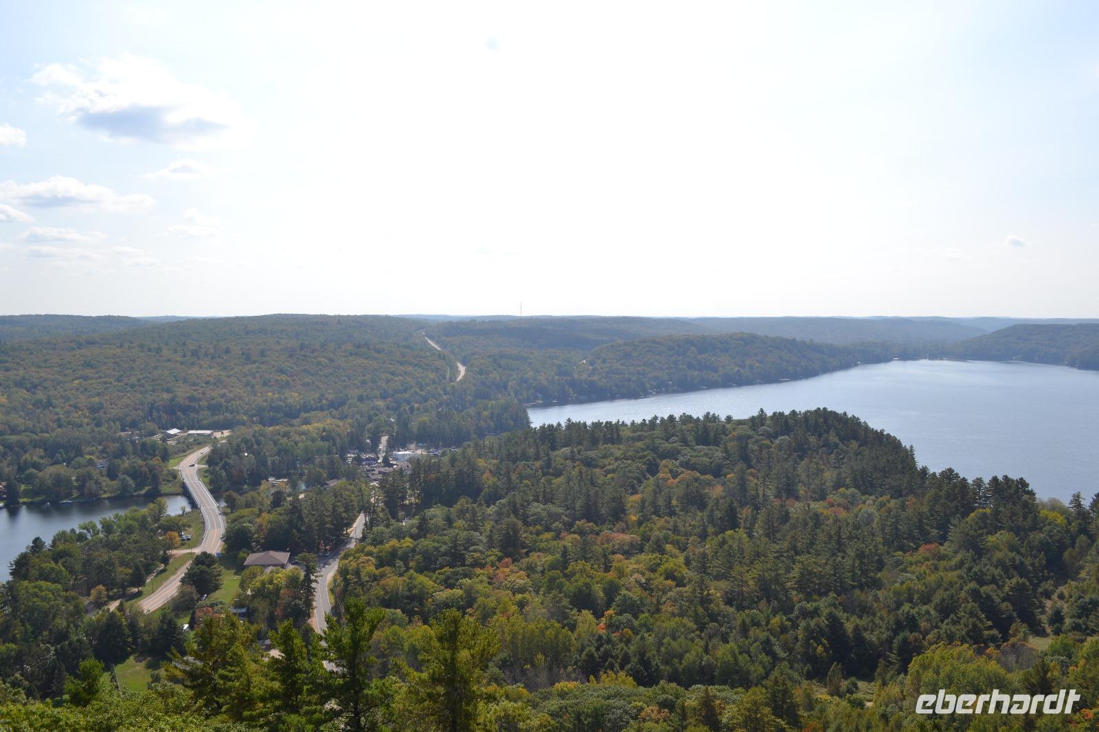 Am Oxtongue Lake werden wir heute morgen von unseren Guides Dave, David und Chris mit ihren drei Kanus erwartet. Noch schnell nachgefragt, ob sich alle mit Sonnencreme eingeschmiert haben, dann kann es losgehen. Gemütlich paddeln wir die nächsten drei Stunden über den See und machen zwischendurch eine kleine Wanderung zu einem Wasserfall. Unterwegs kommen wir an einigen hübschen kleinen Sommerhäuschen vorbei und wir könnten uns gut vorstellen, hier zu leben. Man wird ja wohl noch träumen dürfen. Vom Kanu aus ist die Laubfärbung schon ein bisschen zu sehen, auch wenn der Indian Summer hier aufgrund der heißen Temperaturen gerade erst begonnen hat. Zwei Damen springen sogar nach der Kanutour in den See und baden, während uns anderen unsere Kanu-Guides zum Abschied ein Ständchen singen. Nach so viel harter Arbeit haben wir uns etwas zu essen verdient. Daher fahren wir zum alten Feuerwachturm in Dorset und machen dort unser Picknick. Wer mutig ist, kann sogar hinaufklettern. Vor der Abfahrt spendiere ich jedem heimlich hinterm Bus ein Glas kanadischen Whiskey mit Ahornsirup - das Trinken von Alkohol in der Öffentlichkeit ist in Kanada eigentlich verboten! Und wir haben sogar großes Glück, denn als wir das Gelände im Bus verlassen, kommt gerade die Polizei! Jetzt aber schnell zurück ins Hotel und erstmal verstecken, bis die Luft wieder rein ist. Nach dem Abendessen versammeln wir uns hinter dem Hotel ums Lagerfeuer und ich bringe meinen Gästen bei, wie man Marshmallows röstet und daraus S'mores macht - ein süßes „Sandwich", dessen weitere Zutaten Kekse und Schokolade sind. Das ist genauso süß und lecker und kalorienhaltig wie es klingt, weshalb man selten mehr als eins davon schafft.