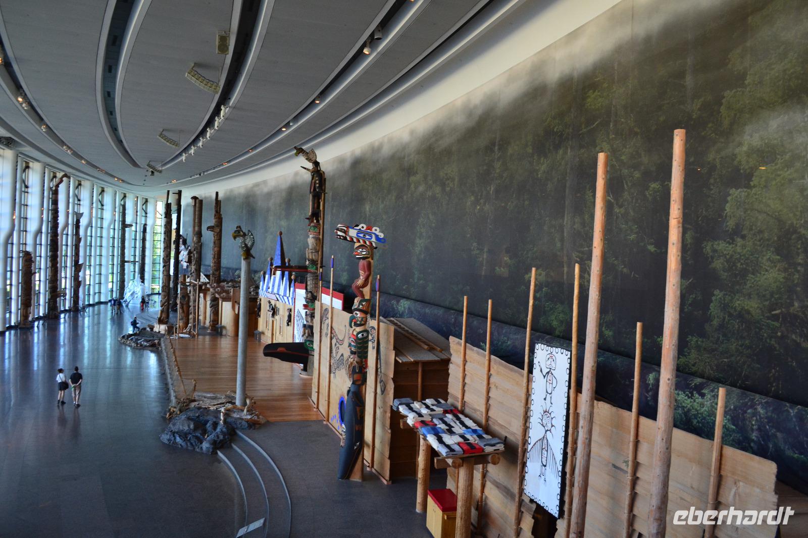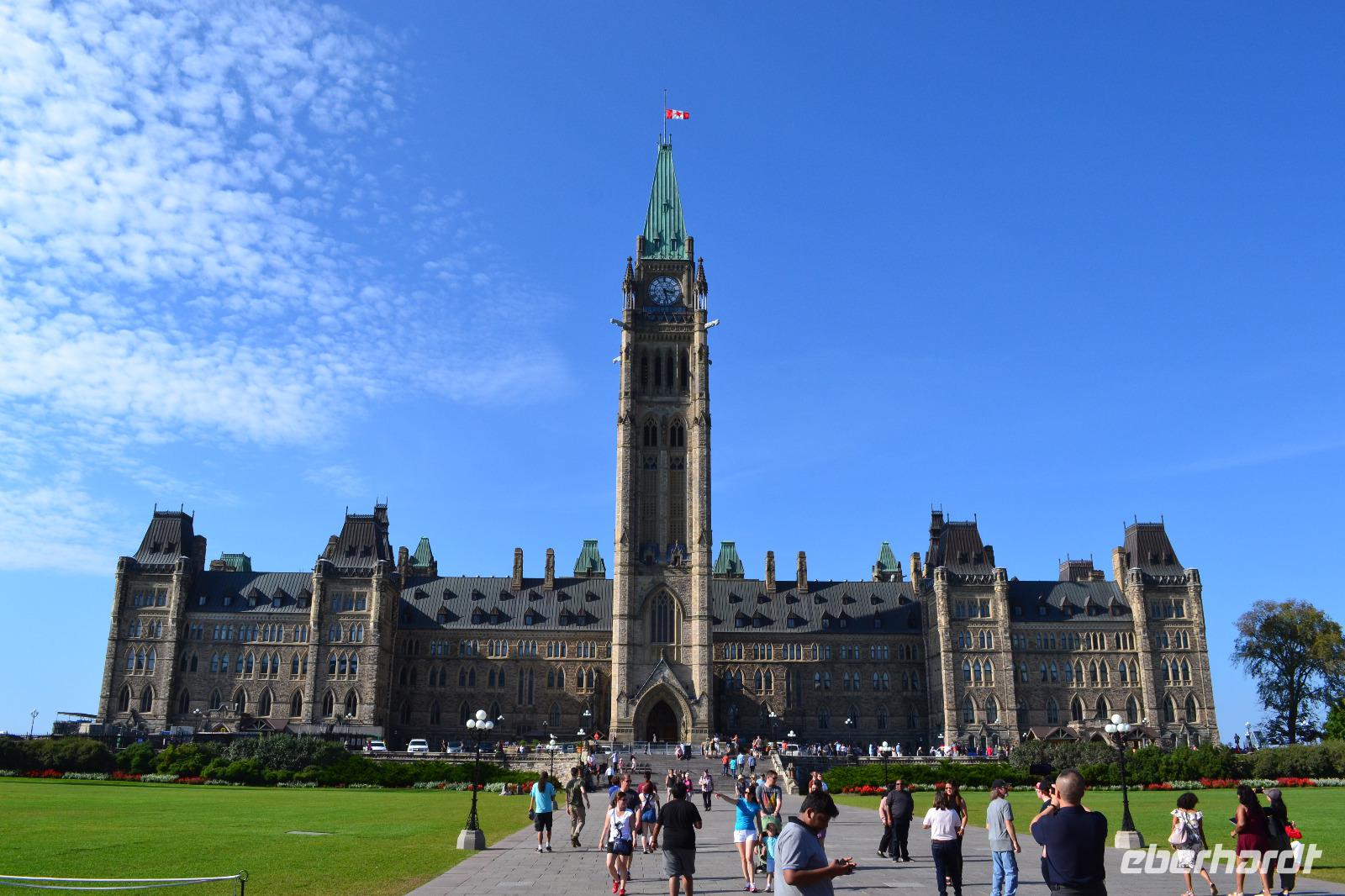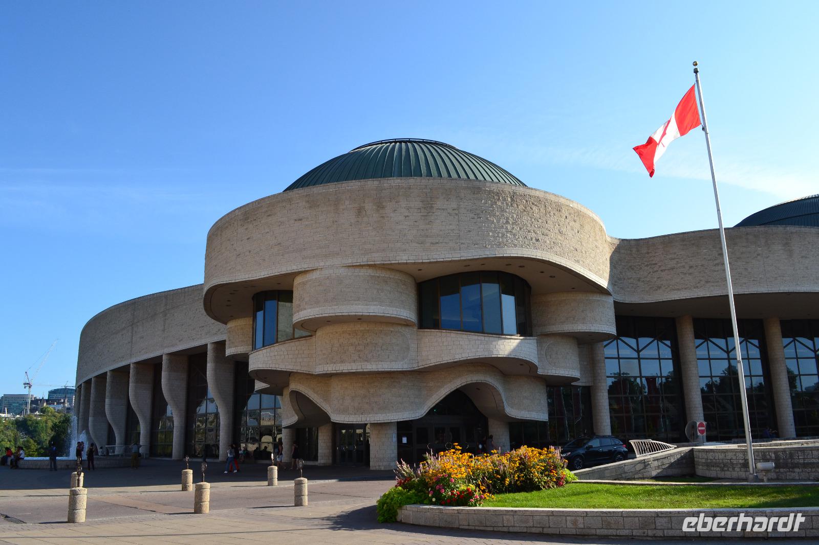 Wir müssen unser schönes Resort-Hotel am See heute leider verlassen. Daher verabschiede ich mich nach dem Frühstück noch von dem kleinen Streifenhörnchen, das unterhalb der Terrasse wohnt. Im Besucherzentrum des Algonquin Parks schauen wir ein Video mit wirklich tollen Bildern, das uns die Geschichte des Parks erläutert. Beim Spaziergang entlang des Logging Trails vertiefen wir unsere neu gewonnen Kenntnisse und lernen, unter welchen einfachen und gefährlichen Bedingungen die Holzfäller hier gearbeitet und gelebt haben. Mit einfachen Äxten und pferdebetriebenen Flößen wurde hier das Holz für den Schiffbau im Mutterland England geschlagen. Doch auch landschaftlich ist der Spaziergang sehr reizvoll und wir können einen Graureiher auf der Suche nach kleinen Fischen beobachten. Pünktlich 15 Uhr erreichen wir unser Hotel in Ottawa, vor dem schon unsere Stadtführerin Stephanie aus uns wartet. In den nächsten zwei Stunden fahren wir mit ihr durch die kanadische Hauptstadt und die benachbarte Stadt Gatineau auf der anderen Seite des Ottawa River, wo sich das imposante Museum of History befindet. Von hier aus haben wir einen tollen Blick auf das Parlamentsgebäude und das Château Laurier und machen auch gleich unser Gruppenfoto. Nach dem Abendessen im Hotel mache ich mit einigen Gästen noch einen schönen Spaziergang zum Château und Parlamentshügel, der bei Dunkelheit nicht minder beeindruckend ist.