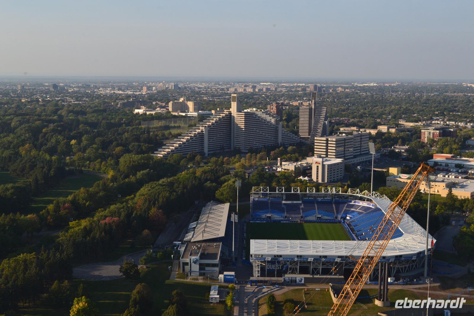 Heute wollen wir zunächst im Parc Oméga in die kanadische Tierwelt eintauchen und dann nach Montréal weiterfahren. Im privaten Wildpark sehen und füttern wir von einem umgebauten Schulbus aus Hirsche, Elche, Bisons, Wildschweine, Kojoten, Rentiere, Moschusochsen, Polarfüchse, Polarwölfe und natürlich - als Highlight ganz zum Schluss - Schwarzbären. Eigentlich hatte ich ja gehofft, dass die Karotten auch für meine Gäste zum Mittagessen reichen würden, aber leider ist am Ende der Tour alles alle. So muss ich das Buffet im prächtigen Château Montebello mit allen teilen. Es gibt sogar einen eigenen Raum nur für Desserts! Wir können bleiben und essen so viel und so lange wir wollen. Ein bisschen enttäuscht war ich dann allerdings schon von meinen Gäste, denn ich dachte wir schaffen mehr. Das 1930 im kanadischen Blockhüttenstil erbaute Château Montebello war lange Zeit das größte von Menschen erbaute Holzgebäude der Welt. Der riesige Empfangsraum des Hotels mit seinem hohen Kamin in der Mitte ist sehr beeindruckend. Auf der Fahrt nach Montréal ist Zeit für einen kleinen Verdauungsschlaf. Von der zweitgrößten kanadischen Stadt verschaffen wir uns erstmal einen Überblick vom Turm des Olympiastadions aus (der aus Kostengründen übrigens zur Olympiade 1976 nicht fertig wurde). Die Aussicht ist fantastisch. Vor und unter uns erstrecken sich von links nach rechts die beiden Inseln Hélène und Notre-Dame, die Altstadt, die moderne Innenstadt mit ihren Wolkenkratzern und schließlich die drei Gipfel des Mont Royal. Die beiden Inseln bilden zusammen den Parc Jean-Drapeau, durch den wir als nächstes fahren, denn hier stehen nicht noch einige Gebäude der Weltausstellung von 1967, darunter das Habitat 67, die Biosphere, der ehemalige amerikanische Pavillon, und das Casino, der ehemalige französische Pavillon, hier befindet sich auch die Formel 1-Rennstrecke, die wir mit dem Bus entlang fahren. José legt sogar einen echten Formel 1-Rennstart hin, aber besonders schnell kommen wir mit dem Bus natürlich nicht weg und werden sogar in der ersten Kurve von einem Radfahrer überholt. Wir tragen es mit Fassung und fahren erhobenen Hauptes zum Hotel. Nach Sonnenuntergang fahren wir schließlich noch hinauf auf den Mont Royal und sehen als letztes Highlight des ereignisreichen Tages die beleuchteten Türme der Innenstadt bei Nacht.