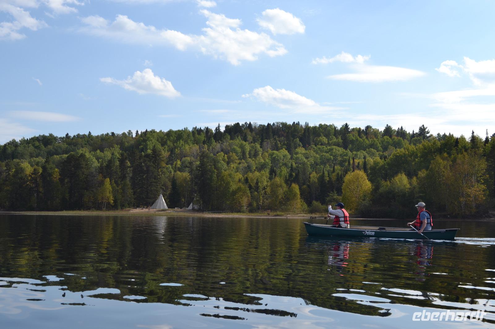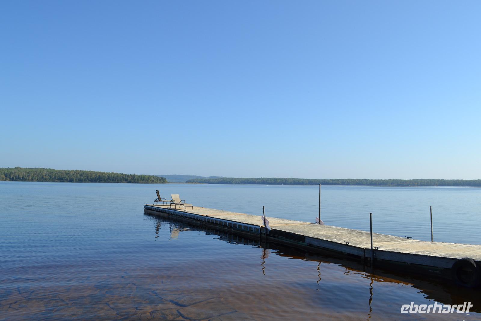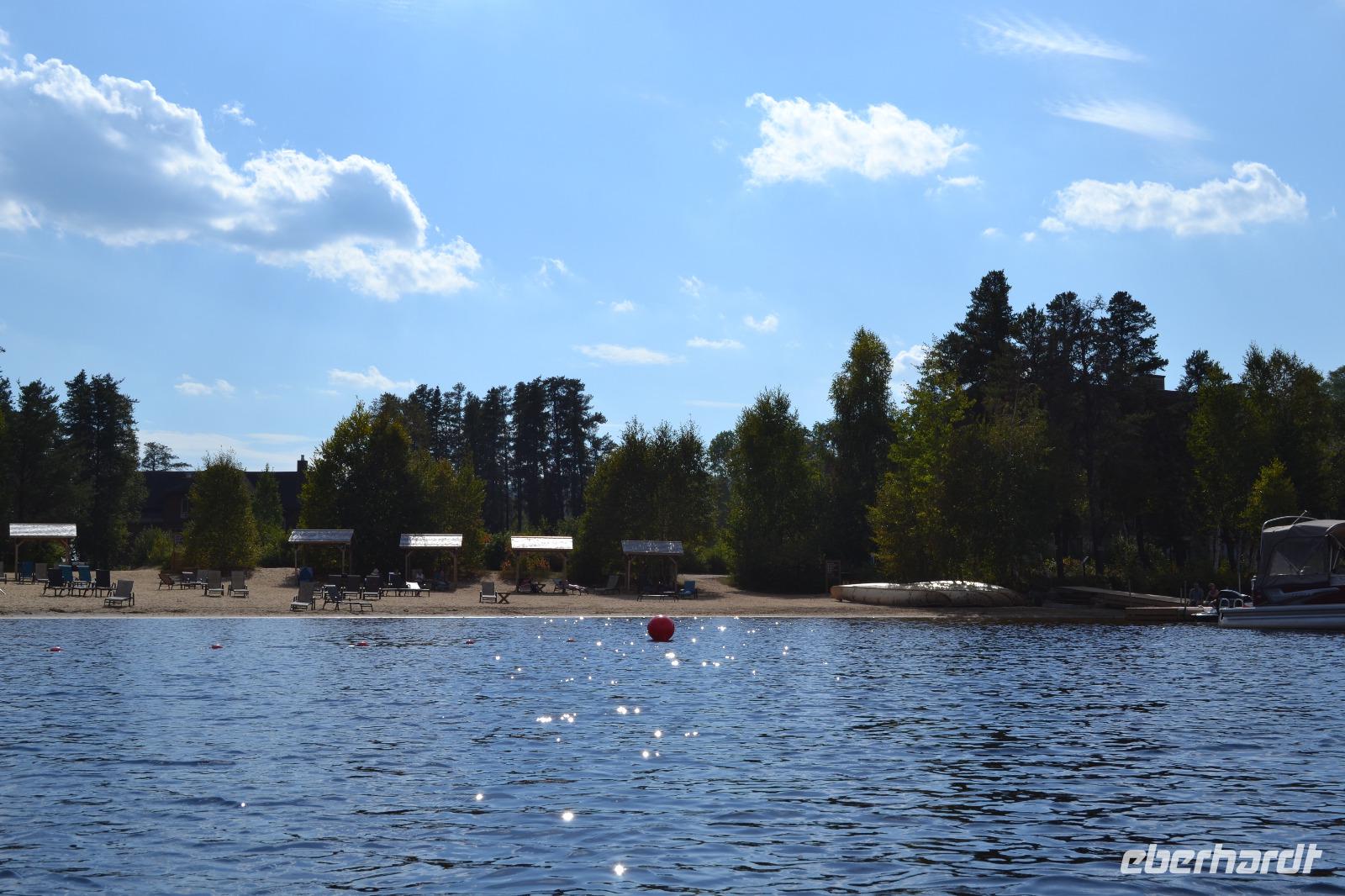 Unser Fahrer José entspannt sich heute beim Angeln auf dem See und tankt neue Kraft, und auch wir genießen unsere Freizeit in der schönen Natur - bei mal wieder strahlend blauem Himmel und heute bis zu 35 °C. Sommerurlaub am Badesee in Kanada, wer hätte das gedacht. Mit der Hälfte der Gruppe treffe ich mich um 10 Uhr zu einer kleinen Wanderung durch den Wald. Wir stellen allerdings bald fest, dass es aufgrund des warmen Wetters immer noch ganz viele Mücken gibt, so dass wir die insgesamt 9 km mit einem neuen Streckenrekord beenden. Am Nachmittag machen wir dann zu sechst noch mit zwei Kanus und einem Kajak den See unsicher, während die anderen Gäste am Strand liegen oder im Wasser planschen. Auch die vier Whirlpools im Freien laden vor dem Abendessen zur Entspannung ein.