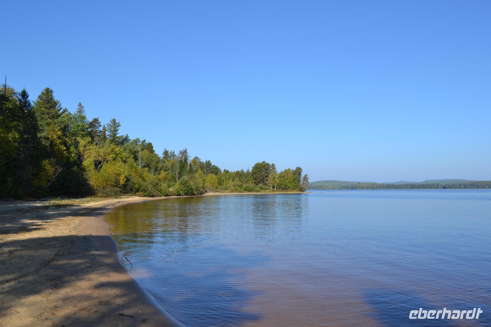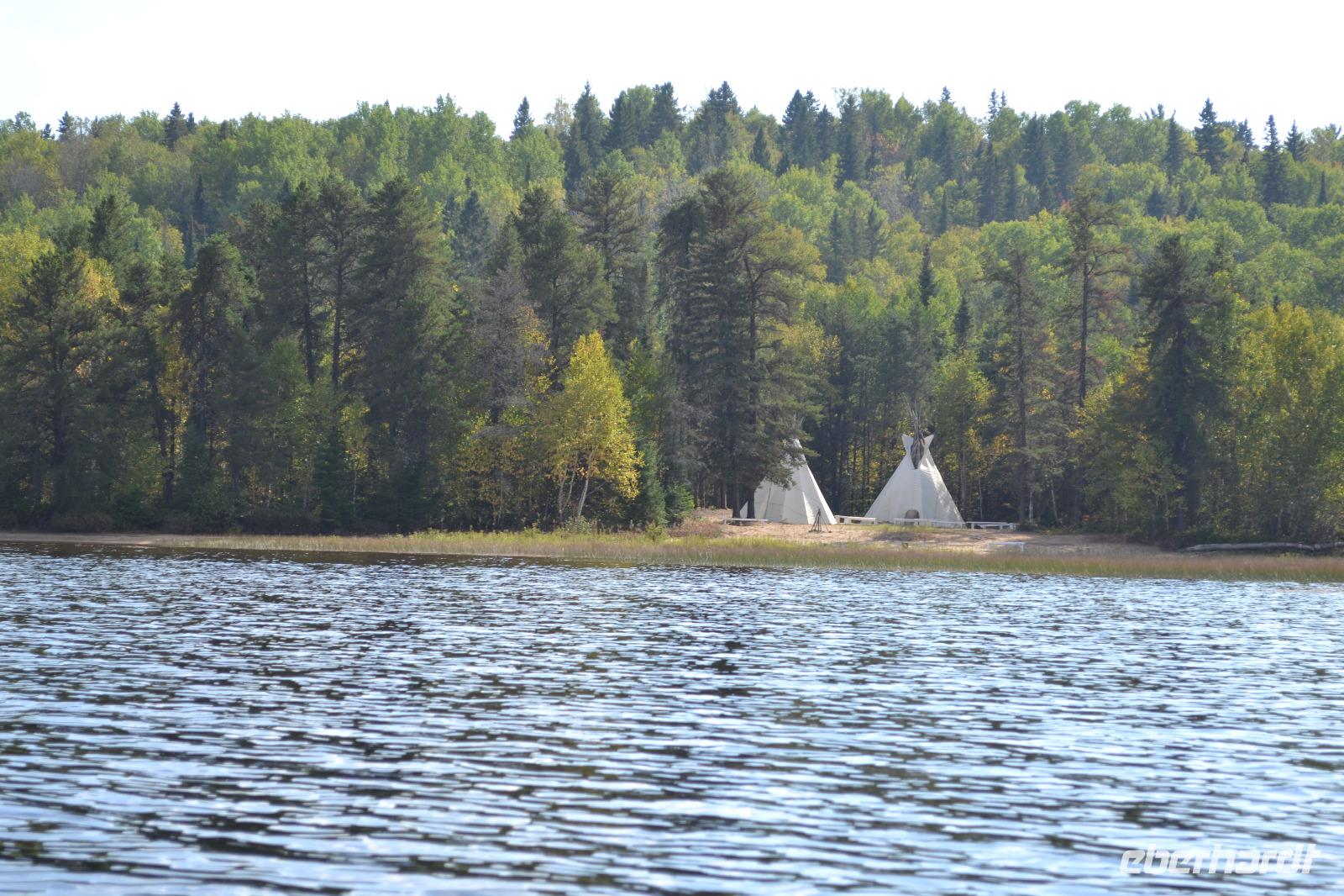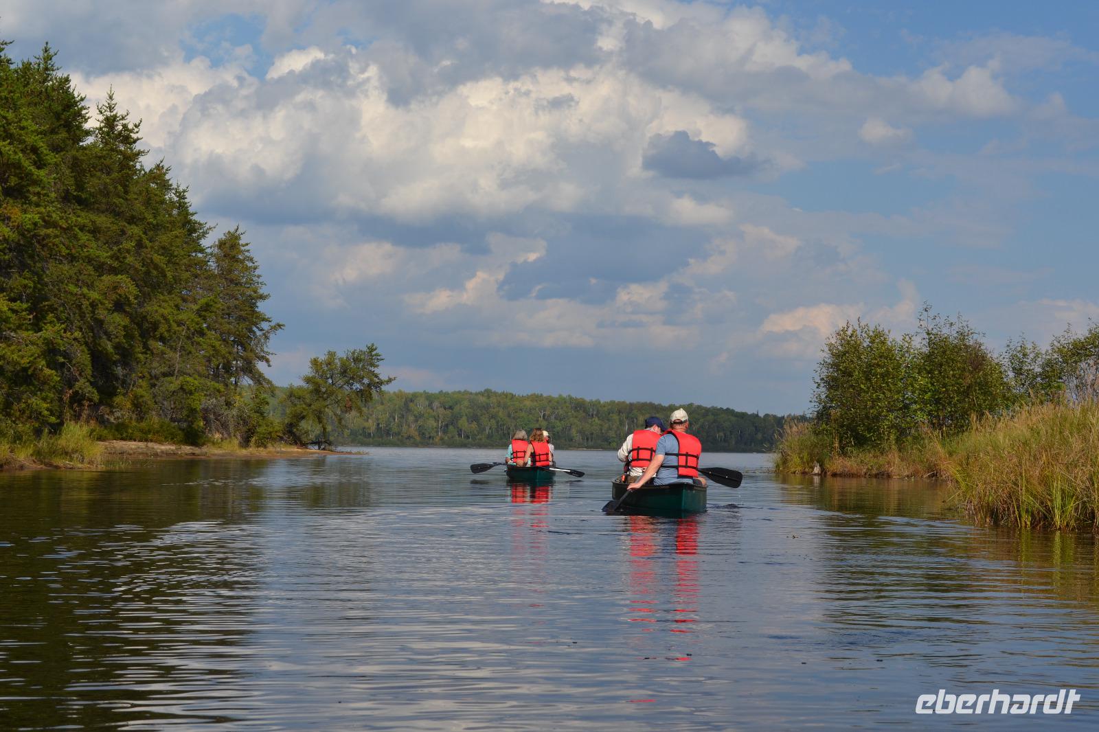 Unser Fahrer José entspannt sich heute beim Angeln auf dem See und tankt neue Kraft, und auch wir genießen unsere Freizeit in der schönen Natur - bei mal wieder strahlend blauem Himmel und heute bis zu 35 °C. Sommerurlaub am Badesee in Kanada, wer hätte das gedacht. Mit der Hälfte der Gruppe treffe ich mich um 10 Uhr zu einer kleinen Wanderung durch den Wald. Wir stellen allerdings bald fest, dass es aufgrund des warmen Wetters immer noch ganz viele Mücken gibt, so dass wir die insgesamt 9 km mit einem neuen Streckenrekord beenden. Am Nachmittag machen wir dann zu sechst noch mit zwei Kanus und einem Kajak den See unsicher, während die anderen Gäste am Strand liegen oder im Wasser planschen. Auch die vier Whirlpools im Freien laden vor dem Abendessen zur Entspannung ein.