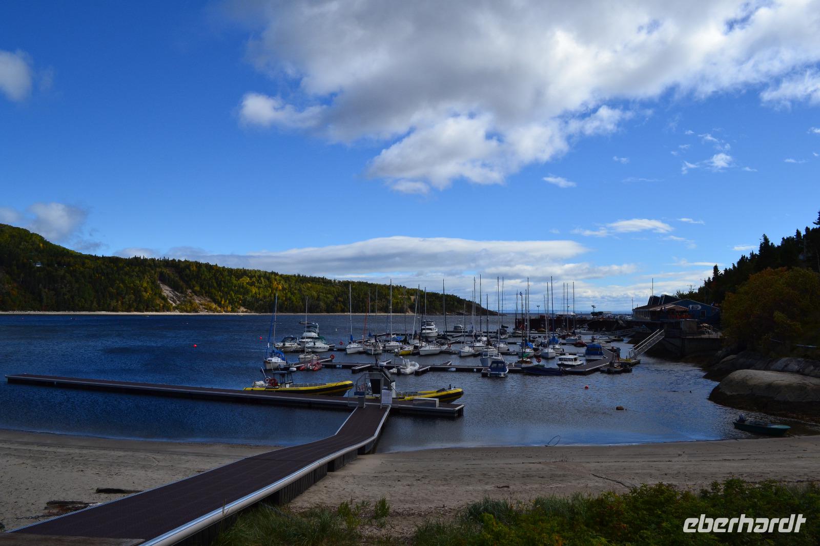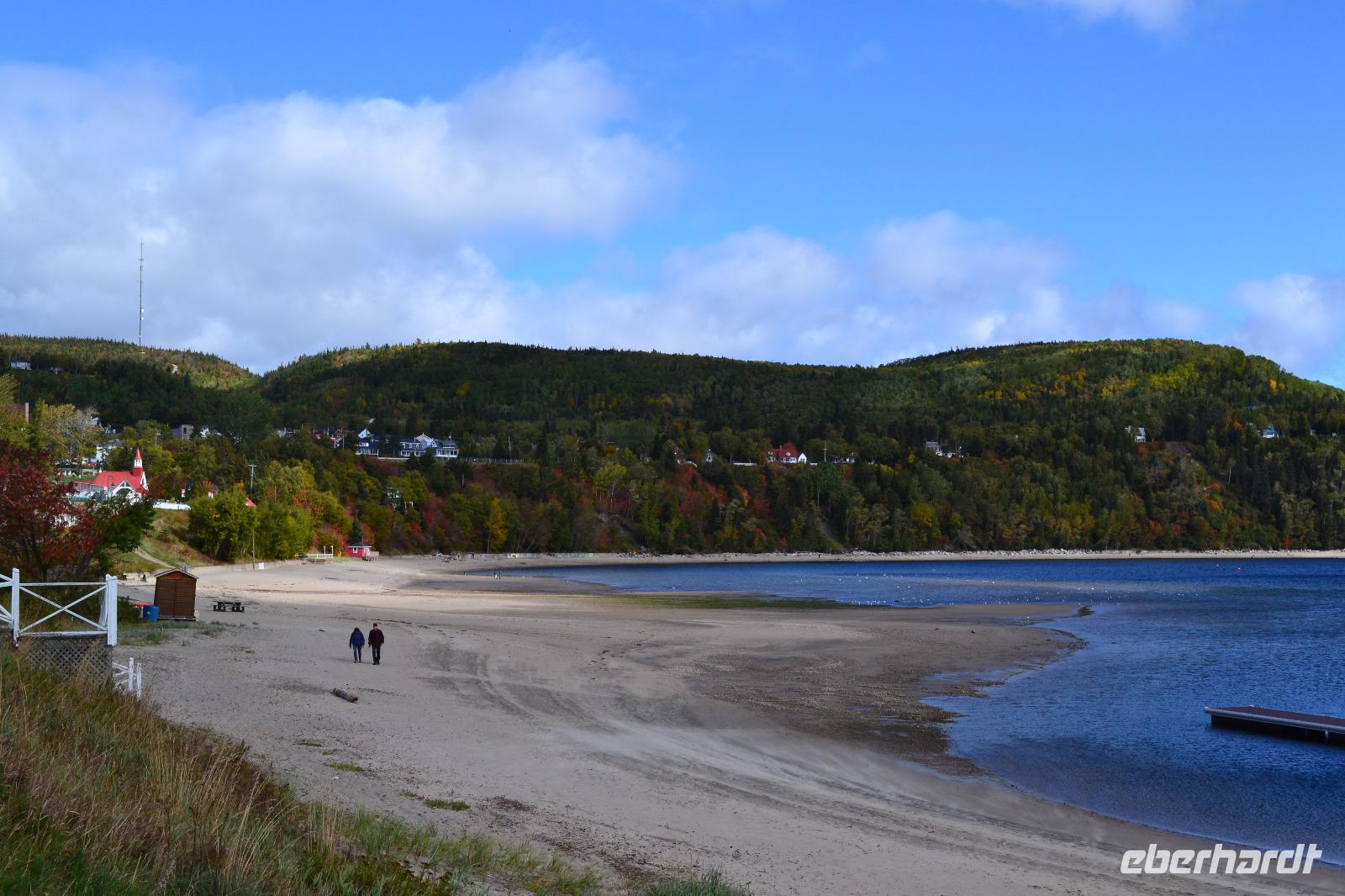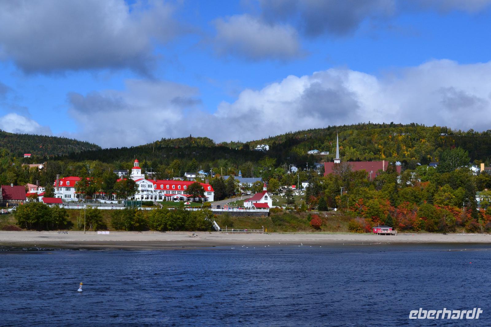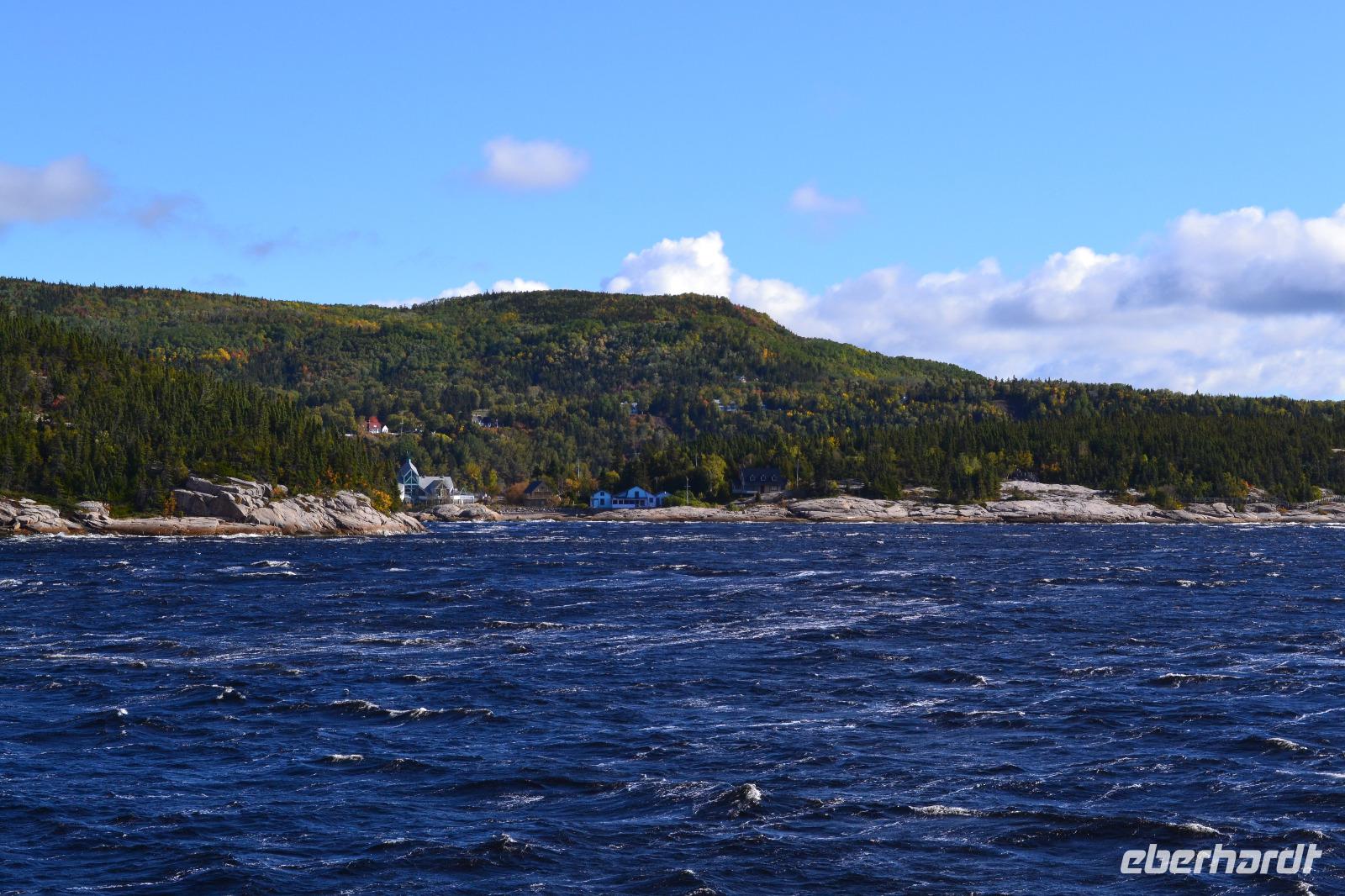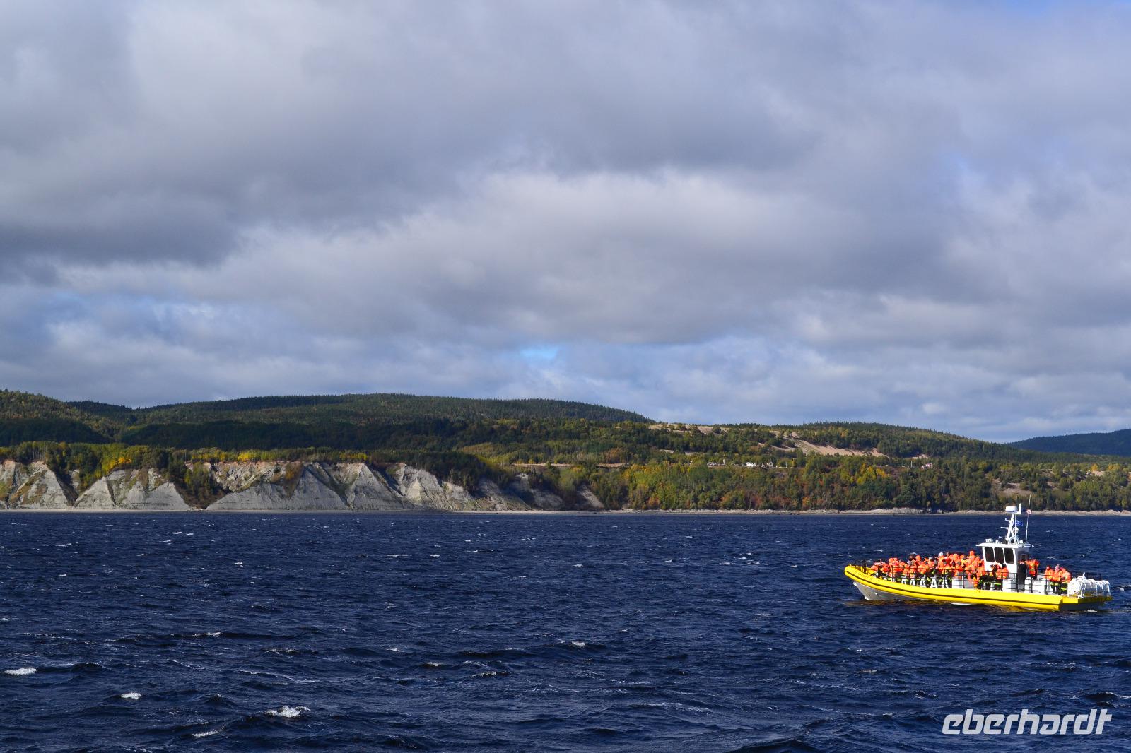 Auf der Fahrt zum Whale Watching und zurück sehen wir die wohl schönste Laubfärbung auf dieser Reise. Da wir es heute nicht eilig haben, können wir einen Photostopp an einem See machen, der von einem wunderschönen Wald umsäumt ist. Den kleinen entenartigen Vogel auf dem See nehmen die meisten gar nicht sofort wahr, aber es ist ein Loon, ein Seetaucher, der Vogel, der die Rückseite der 1-Dollar-Münze ziert. Es freut mich besonders, dass wir diesen Vogel somit auch einmal in freier Wildbahn gesehen haben. Und es kommt noch viel besser: Wir sehen sogar schon vom Bus aus die Zwergwale im St.-Lorenz-Strom! Mit der kostenlosen Autofähre müssen wir dann den Saguenay-Fjord überqueren, um nach Tadoussac zu gelangen. Es herrscht ein kräftiger Wind, der uns fast von Bord wedelt. Im Marine Mammal Interpretation Centre werden wir in Tadoussac mit einer Videopräsentation und einer Ausstellung auf unsere 3-stündige Whale-Watching-Tour eingestimmt. An Bord ist es dann auch gar nicht so kalt und windig, wie ich befürchtet habe. Wir sehen Zwergwale und Belugas. Letztere leben das ganze Jahr über im St.-Lorenz-Strom und jagen in großen Gruppen zusammen. Eine dieser Schulen schwimmt sogar eine Weile parallel zum Boot und wir sehen immer wieder die Köpfe auf- und abtauchen. In Baie Sainte-Catherine gehen wir dann nach fast 3,5 Stunden zurück an Land und José nimmt uns freudig in Empfang. Am Abend genießen wir ein sehr leckeres 3-Gänge-Menü im Restaurant „Allegro".