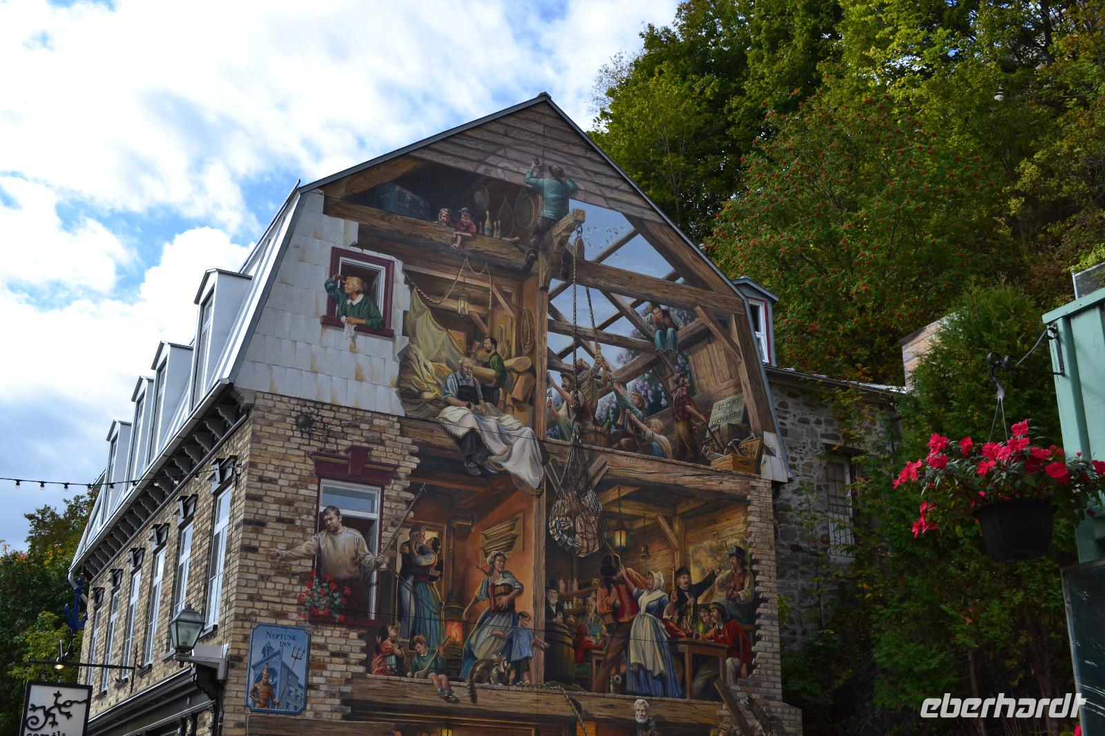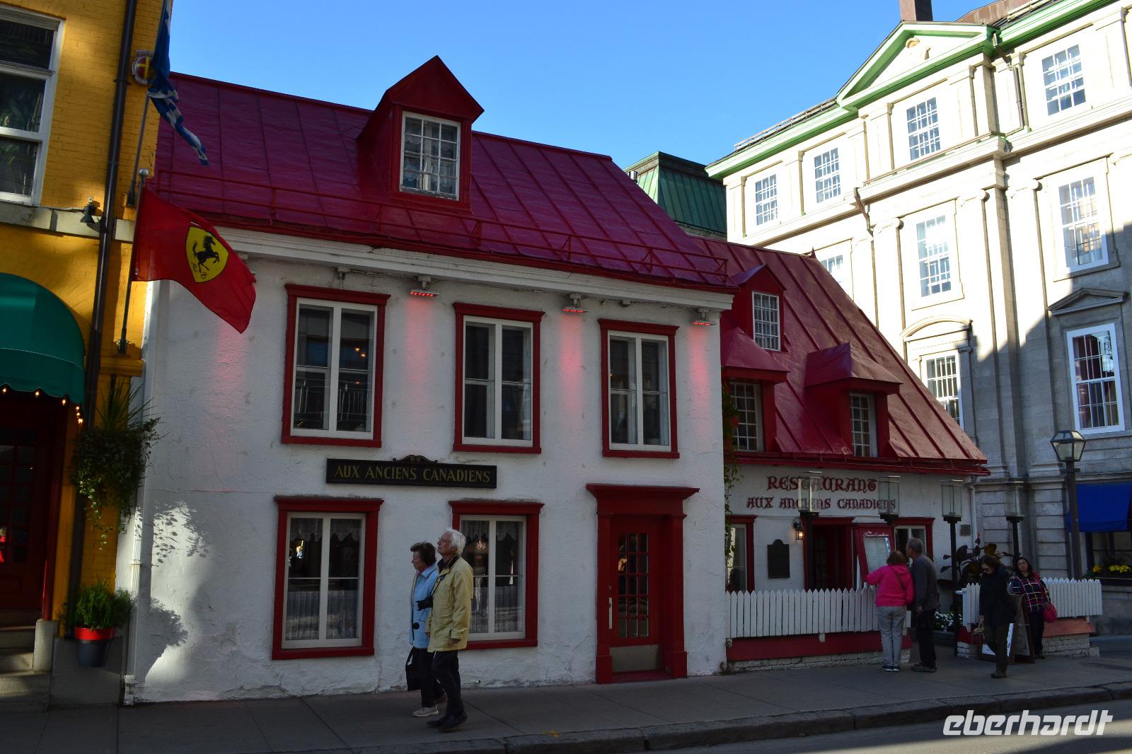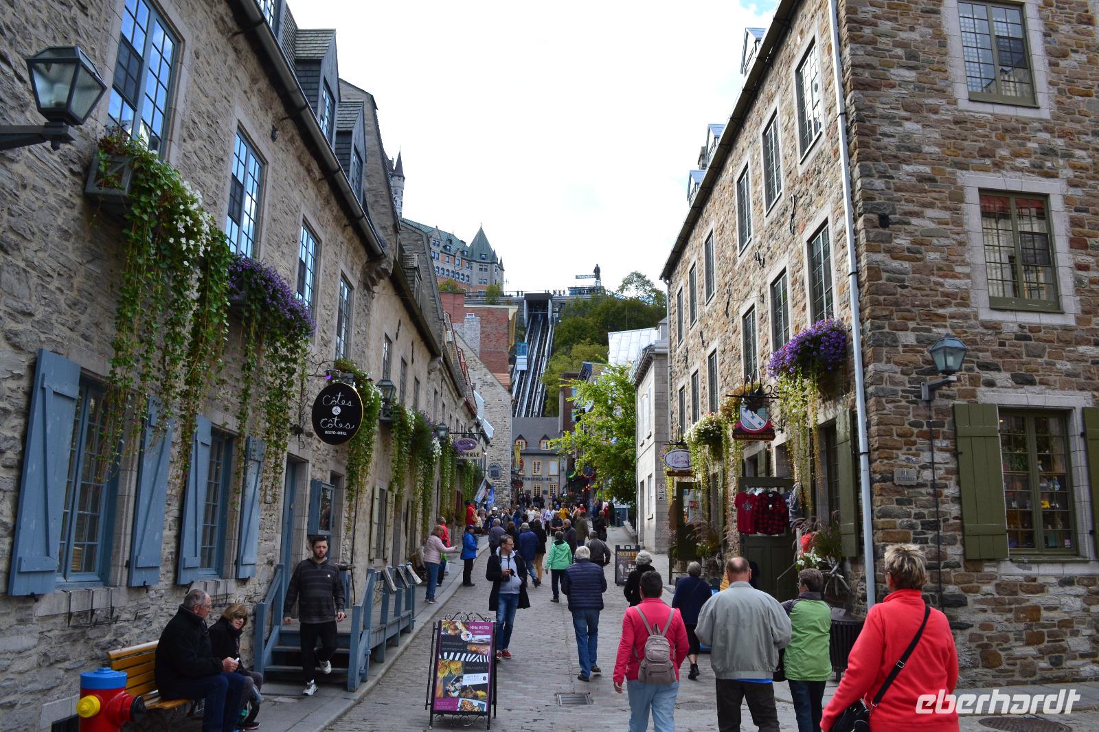 Auf dieser Reise haben wir uns die schönste Stadt Kanadas bis zum Schluss aufgehoben: das malerische Québec City! Es geht also wieder ein Stück stromaufwärts und nach Süden. Etwas außerhalb der Stadt befindet sind der Canyon Sainte-Anne. Durch diese versteckt liegende Schlucht rauscht ebenfalls ein Wasserfall über mehrere Stufen nach unten. Über drei Brücken, darunter eine Hängebrücke, deren Überquerung bei einigen etwas Mut erfordert, spazieren wir in gemütlichem Tempo die Schlucht hinunter und auf der anderen Seite wieder hinauf und können herrliche Photos machen. Nicht weit vom Canyon entfernt steht die gigantische Wallfahrtskirche Sanctuaire de Sainte-Anne-de-Beaupré. Die 91 m hohe und 105 m lange katholische Basilika im offenbar in Kanada äußerst beliebten neugotischen Stil wurde 1926 eingeweiht. Angesichts der vielen Wunderheilungen, die sich hier ereignet haben sollen, und von denen die unzähligen Geh- und Krückstöcke an den Säulen im Eingangsbereich künden, fragt man sich, wozu Kanadier eigentlich eine Krankenversicherung brauchen. Wir grübeln darüber nach, als wir zum letzten Mal einen Mittagsstopp bei Tim Hortons einlegen. Dann geht es endlich in die Stadt, deren Silhouette wir nun schon so lange von weitem vor uns gesehen haben. Unser Stadtführer Odo ist ein echtes Unikat und Urgestein und erklärt uns sehr anschaulich die Geschichte und Geologie der Stadt. Er geleitet uns zunächst durch die obere Altstadt, die natürlich vom berühmten Château Frontenac dominiert wird. Über die Halsbrechertreppe geht es dann schließlich auch in die pittoreske untere Altstadt, die eher an kleine mittelalterliche Städte in Europa erinnert, als an eine kanadische Großstadt. Für unsere Abschiedsabend fahren wir zur „Erabliere du Lac-Beauport". Vor dem Essen wird uns vorgeführt, wie der kanadische Ahorn-Sirup hergestellt wird; ein Verfahren, das die europäischen Siedler von den First Nations erlernt haben. Dann werden wir bei Live-Musik mit traditionellen Québecer Speisen verwöhnt. Essen und mitsingen tun wir zwar, vor dem Tanzen können wir uns jedoch erfolgreich drücken. Als zweiten Nachtisch können wir uns selbst Ahorn-Toffee zubereiten, bevor wir mit dem Bus zum Hotel zurückkehren.