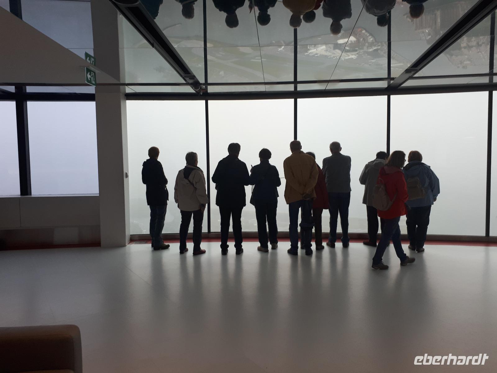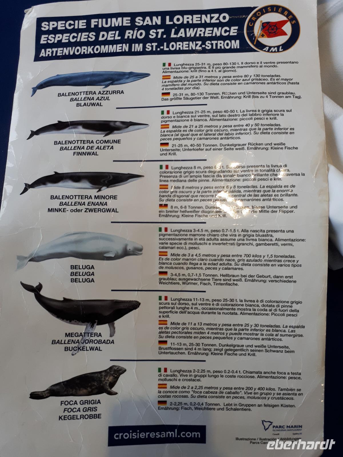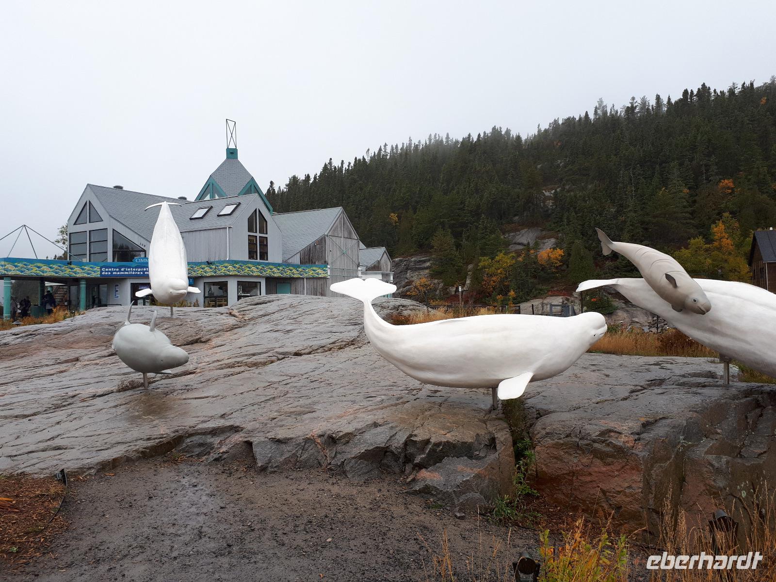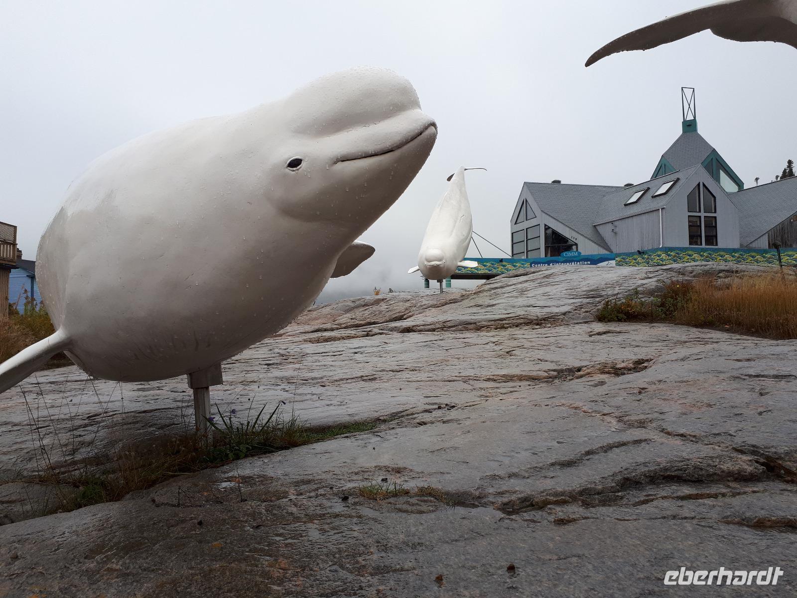 Voller Vorfreude starteten wir in den Tag. Selbst der Nebel und das regnerische Wetter konnten unserem Eifer auf die Walbeobachtung nichts anhaben. Entlang des Stroms fuhren wir vorbei an scheinbar tollen Waldlandschaften. Christine wies uns ab und zu darauf hin, wenn wir einen tollen See passierten, den wir vor lauter Nebel nicht sehen konnten. Mit einer Autofähre, die Teil des kanadischen Highway-Systems ist, setzten wir nach Tadoussac über und besuchten als erstes das Interpretations-Zentrum des Ortes, welches sich der Walbeobachtung und deren Forschung im St. Lorenz- Strom gewidmet hat. Ein kleiner Film mit deutschen Untertiteln über die Erforschung der dort heimischen und einzigartigen Beluga-Wale brachte uns viele interessante Fakten über die weißen Säugetiere. Der Nebel hatte sich verzogen, was gut für unser Vorhaben war, dafür regnete es jetzt in Strömen. Leider konnten wir dadurch nicht den hübschen Ort erkunden. In einem kleinen Café mit vielen Leckereien fanden wir Schutz vor dem Wetter. Als wir uns nun alle gestärkt hatten konnte es endlich aufs Wasser gehen. Wir schipperten hinaus auf den St. Lorenz- Strom und beobachteten gespannt die Weite. Wir entdeckten während unserer 3-stündigen Tour Zwergwale, Robben, Familien von Finnwalen und einige Gäste sogar die berühmten Belugas. Unser lieber José hatte geduldig auf uns gewartet und fuhr uns wieder nach La Malbaie zurück, wo wir am Abend im Restaurant Allegro speisten.
