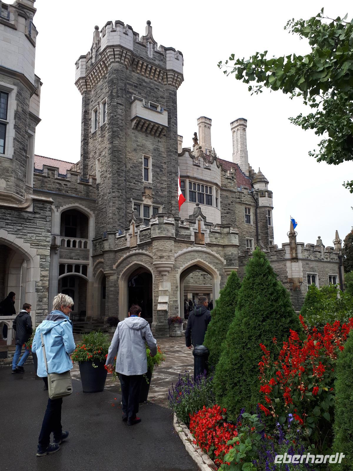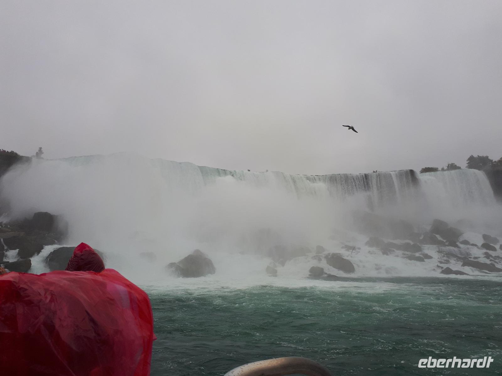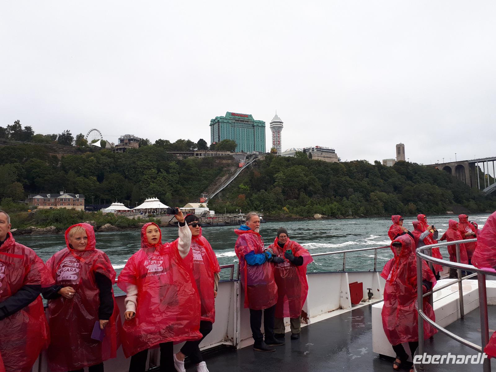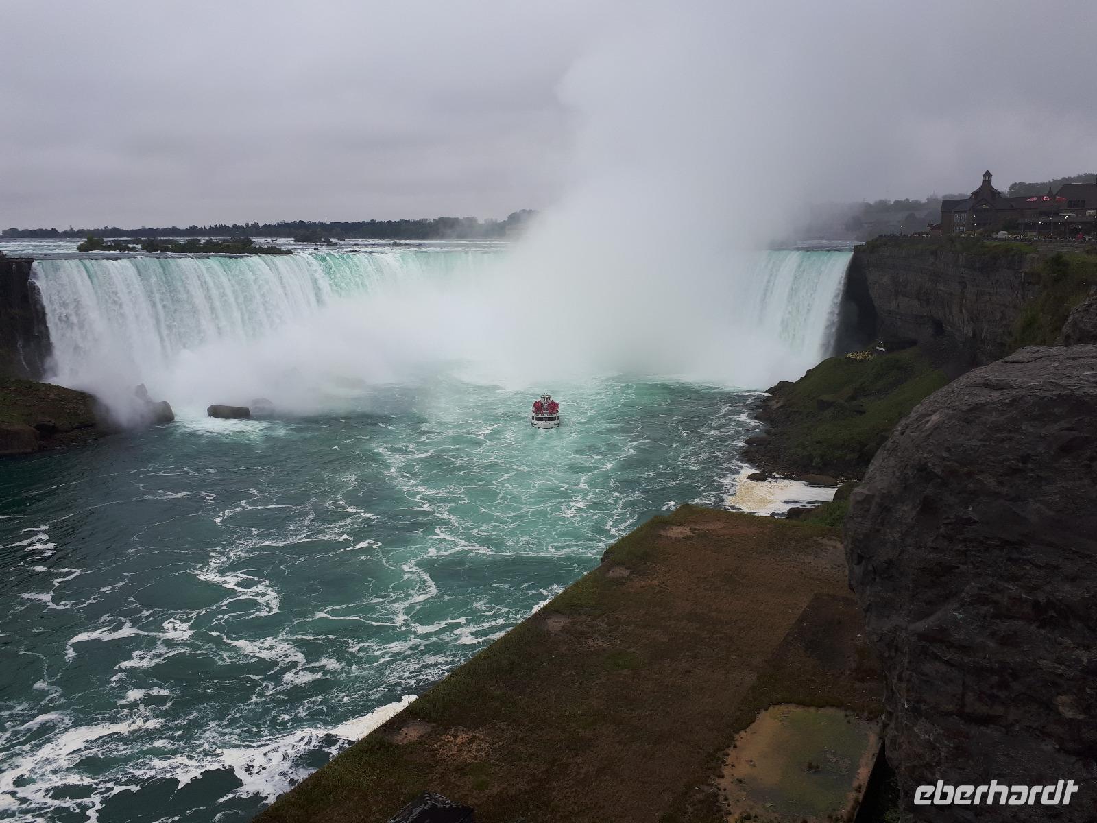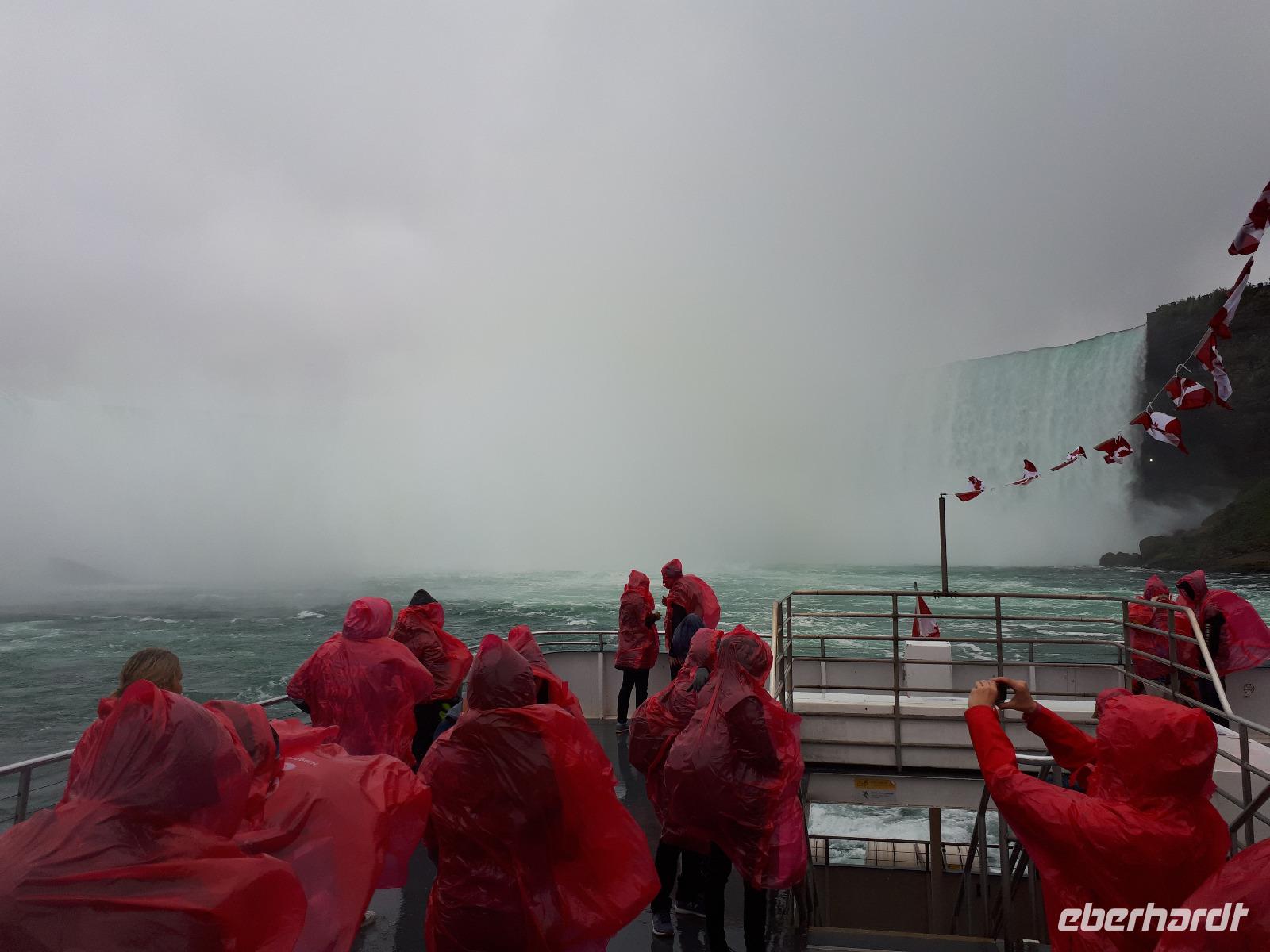 Nach unserem ersten kanadischen Frühstück hieß es Toronto entdecken. Christine begrüßte uns im Bus mit Datum, Wetter und Spruch des Tages. Während unserer Rundfahrt durch das Bankenviertel der Stadt am Ontario-See entdeckten wir auch das Bahnhofshotel, in welchem die Queen noch immer über einen ganzen Flur verfügt. Das Wahrzeichen Torontos, der CN-Tower, war unser erster Besichtigungspunkt des Tages. Der 550 Meter hohe Turm gehört zu den neuen Weltwundern und liegt nicht weit vom Hafen entfernt. Mit einem Lift fuhren wir in 58 Sekunden bis auf 346 Meter hinauf und erhielten trotz trüben Wetters eine beeindruckende Aussicht auf die 2.8 Millionen Einwohner große Stadt. Anschließend durchkreuzten wir Toronto bis zur Casa Loma, ein Herrenhaus welches von 1911 bis 1914 von Sir Henry Pellatt als Wohnhaus erbaut wurde und bestaunten die reichen Villenviertel, Kensington Market und Chinatown. Zurück in Downtown schauten wir zur Harbourfront, hielten an der Queensstreet um uns eines der zahlreichen Rathäuser genauer anzusehen und verschwanden kurz im Underground. Geschäftiges Treiben verriet uns, dass die Zeit der Mittagspause angebrochen war. Vorbei am alten Fort York, dem historischen Ursprung der heutigen Metropole, verließen wir die größte Stadt Kanadas um zu den ca. 1,5 Stunden von Toronto entfernten Niagara-Fällen zu fahren denn dort wartete bereits das nächste Highlight auf uns. Mit roten Regenponchos ausgestattet bestiegen wir unser Boot und fuhren so dicht an die Wasserfälle heran, dass außer einer Wand aus weißer Gischt nichts mehr zu sehen ist. Es war unwahrscheinlich beeindruckend, mit welcher Kraft und Gewalt sich die Wassermassen die 57 Meter Höhenunterschied hinunterstürzten. Trotz der Capes sind wir ziemlich nass geworden, bei dem anschließenden Spaziergang zum Besucherzentrum hatten wir aber genug Zeit wieder zu trocknen. Unser Abendessen nahmen wir mit Aussicht ein, im 230 Meter hohen Skylon Tower. Christine schlug vor, nach dem Abendessen in das benachbarte IMAX-Kino zu gehen und wir nahmen gerne an. Durch den kurzen Film erfuhren wir etwas mehr über die Geschichte und Legenden rund um die Niagara Fälle. Vor allem die Überflugaufnahmen haben uns gefallen. Anschließend unternahmen noch einige wenige Gäste erneut einen kleinen Spaziergang zu den Niagara-Fällen. Diese waren nun beleuchtet und schillerten in leuchtendem Grün, Rot und Blau.