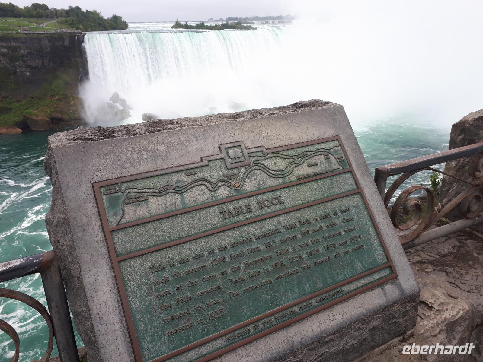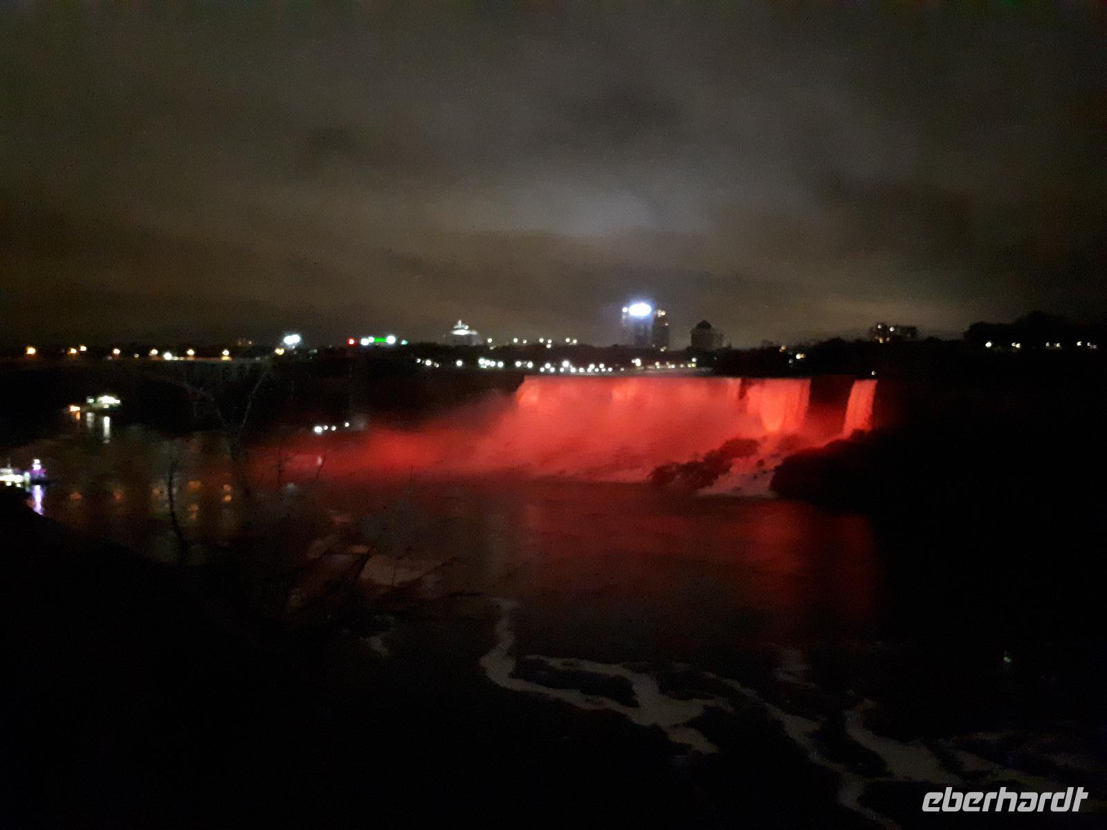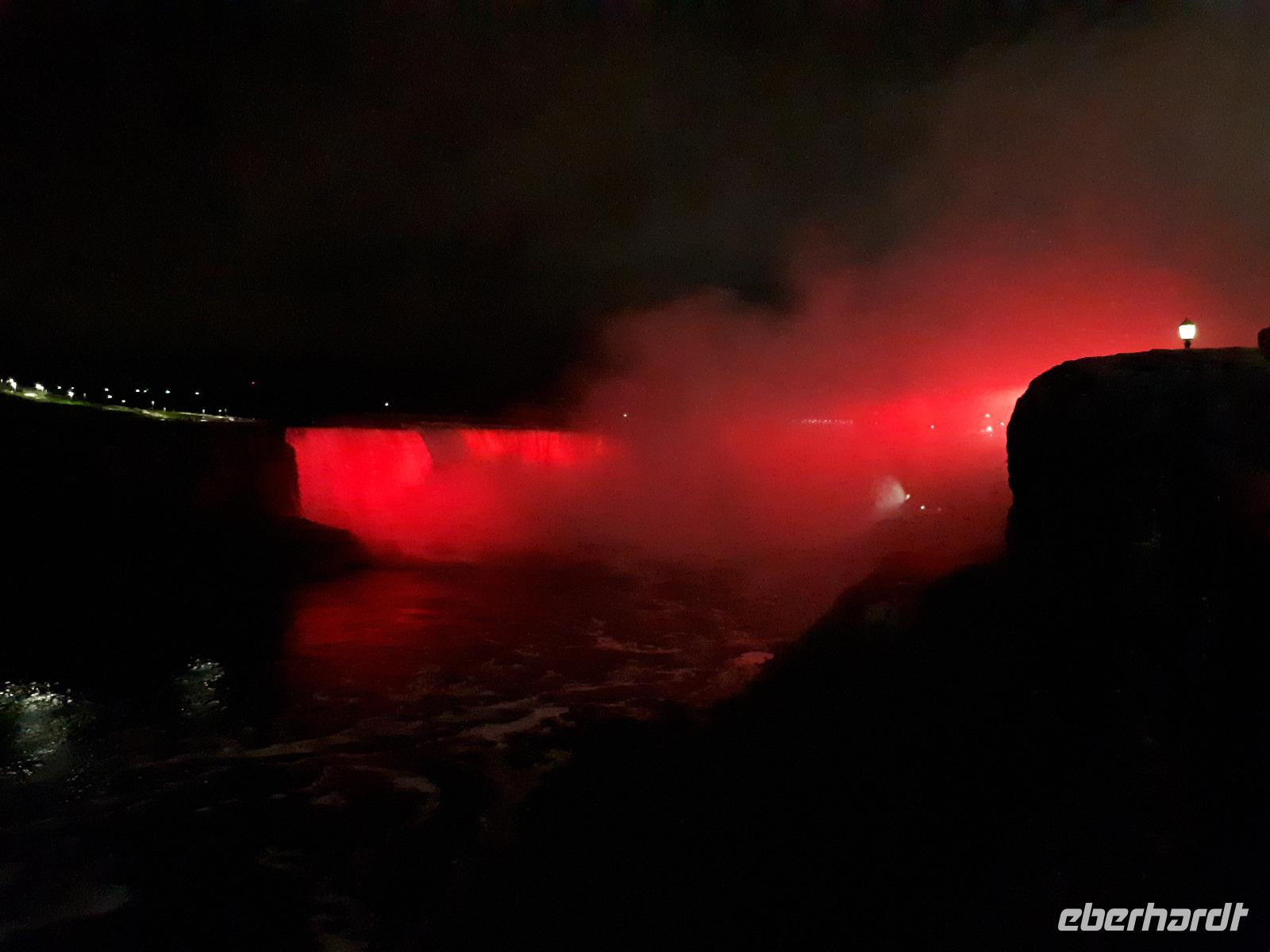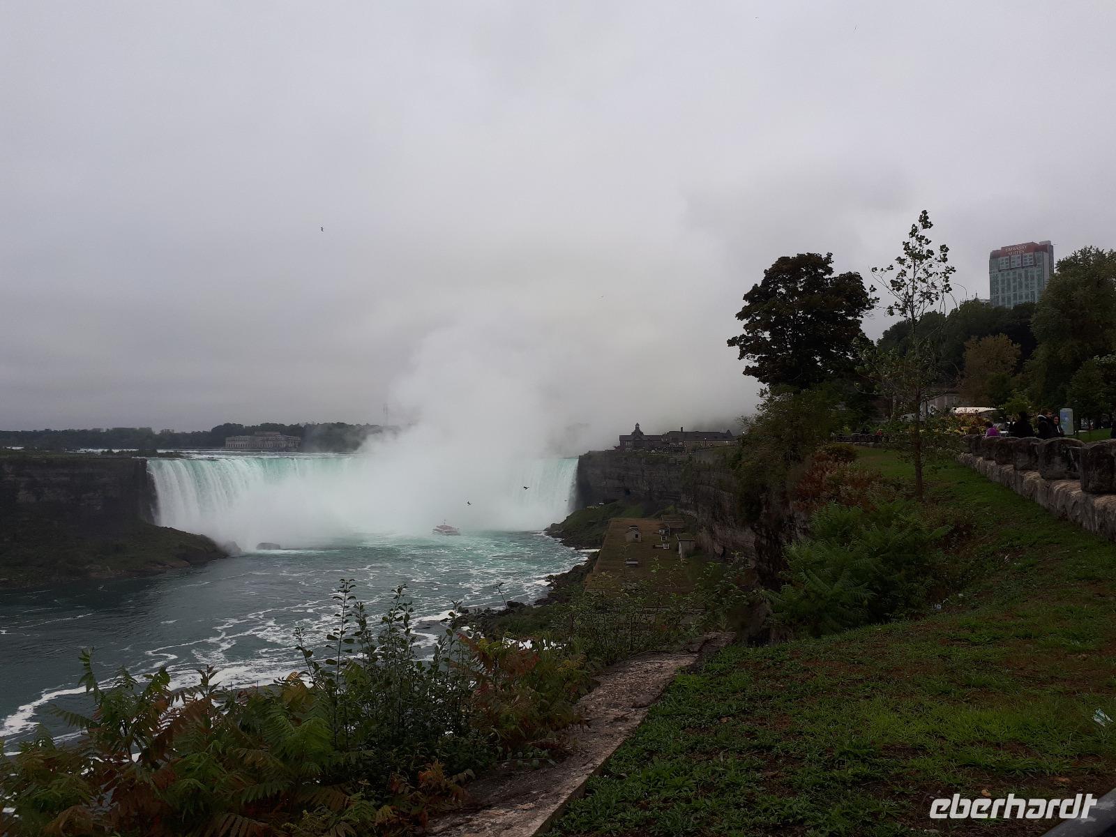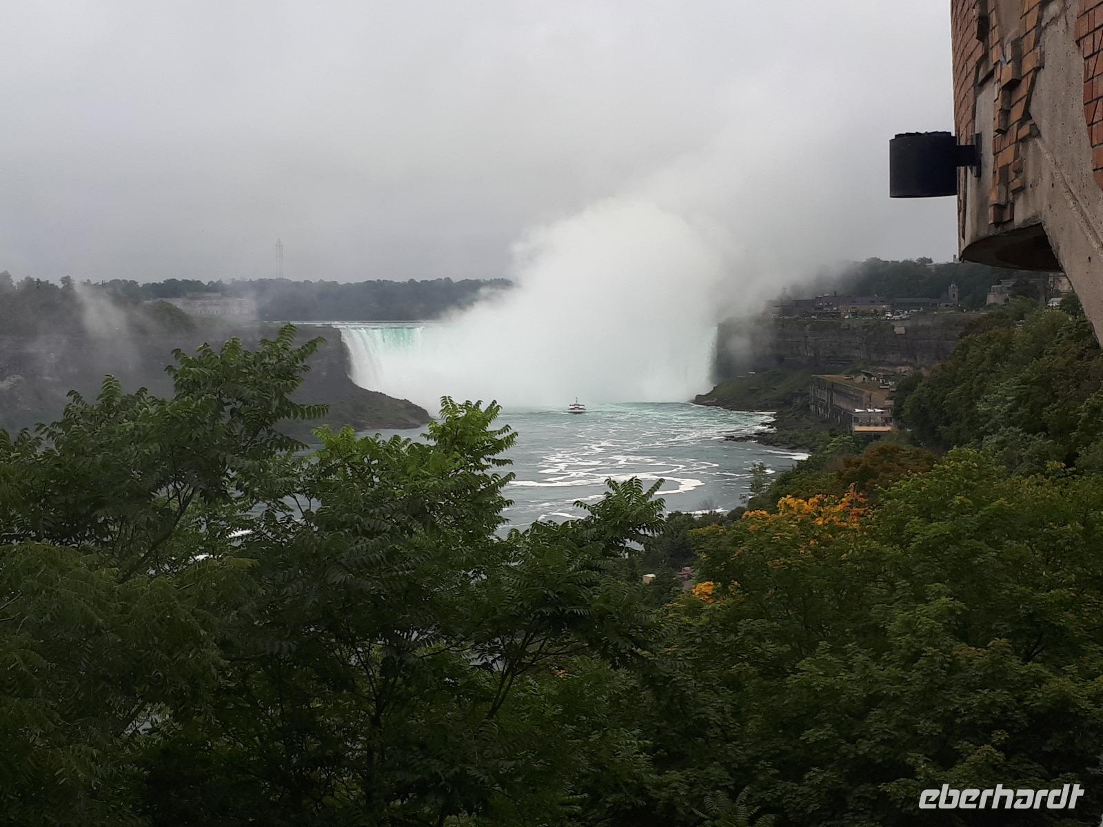 Nach unserem ersten kanadischen Frühstück hieß es Toronto entdecken. Christine begrüßte uns im Bus mit Datum, Wetter und Spruch des Tages. Während unserer Rundfahrt durch das Bankenviertel der Stadt am Ontario-See entdeckten wir auch das Bahnhofshotel, in welchem die Queen noch immer über einen ganzen Flur verfügt. Das Wahrzeichen Torontos, der CN-Tower, war unser erster Besichtigungspunkt des Tages. Der 550 Meter hohe Turm gehört zu den neuen Weltwundern und liegt nicht weit vom Hafen entfernt. Mit einem Lift fuhren wir in 58 Sekunden bis auf 346 Meter hinauf und erhielten trotz trüben Wetters eine beeindruckende Aussicht auf die 2.8 Millionen Einwohner große Stadt. Anschließend durchkreuzten wir Toronto bis zur Casa Loma, ein Herrenhaus welches von 1911 bis 1914 von Sir Henry Pellatt als Wohnhaus erbaut wurde und bestaunten die reichen Villenviertel, Kensington Market und Chinatown. Zurück in Downtown schauten wir zur Harbourfront, hielten an der Queensstreet um uns eines der zahlreichen Rathäuser genauer anzusehen und verschwanden kurz im Underground. Geschäftiges Treiben verriet uns, dass die Zeit der Mittagspause angebrochen war. Vorbei am alten Fort York, dem historischen Ursprung der heutigen Metropole, verließen wir die größte Stadt Kanadas um zu den ca. 1,5 Stunden von Toronto entfernten Niagara-Fällen zu fahren denn dort wartete bereits das nächste Highlight auf uns. Mit roten Regenponchos ausgestattet bestiegen wir unser Boot und fuhren so dicht an die Wasserfälle heran, dass außer einer Wand aus weißer Gischt nichts mehr zu sehen ist. Es war unwahrscheinlich beeindruckend, mit welcher Kraft und Gewalt sich die Wassermassen die 57 Meter Höhenunterschied hinunterstürzten. Trotz der Capes sind wir ziemlich nass geworden, bei dem anschließenden Spaziergang zum Besucherzentrum hatten wir aber genug Zeit wieder zu trocknen. Unser Abendessen nahmen wir mit Aussicht ein, im 230 Meter hohen Skylon Tower. Christine schlug vor, nach dem Abendessen in das benachbarte IMAX-Kino zu gehen und wir nahmen gerne an. Durch den kurzen Film erfuhren wir etwas mehr über die Geschichte und Legenden rund um die Niagara Fälle. Vor allem die Überflugaufnahmen haben uns gefallen. Anschließend unternahmen noch einige wenige Gäste erneut einen kleinen Spaziergang zu den Niagara-Fällen. Diese waren nun beleuchtet und schillerten in leuchtendem Grün, Rot und Blau.