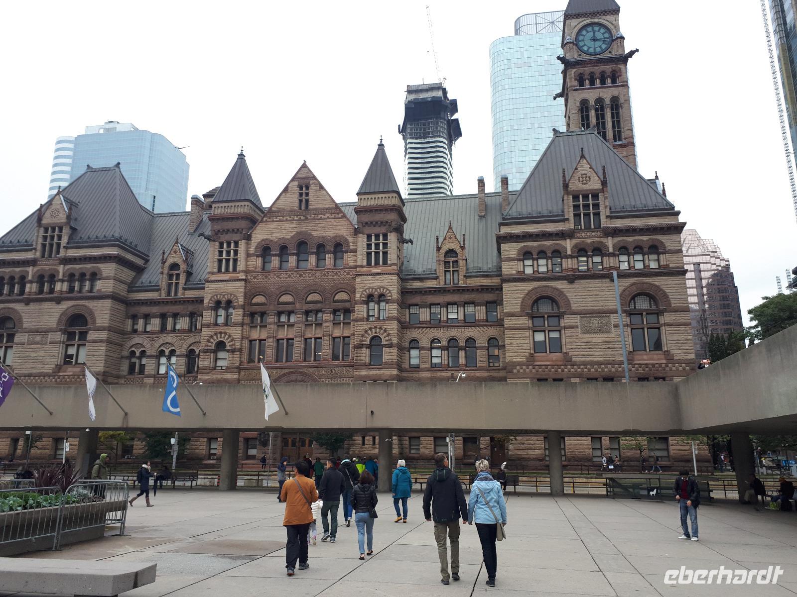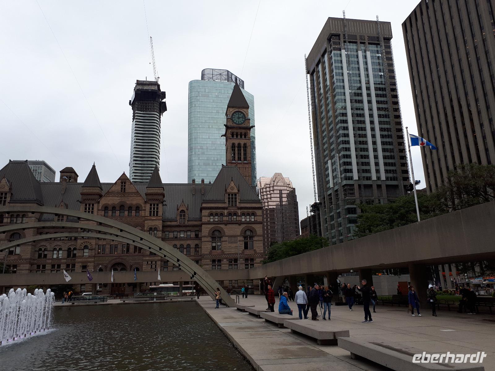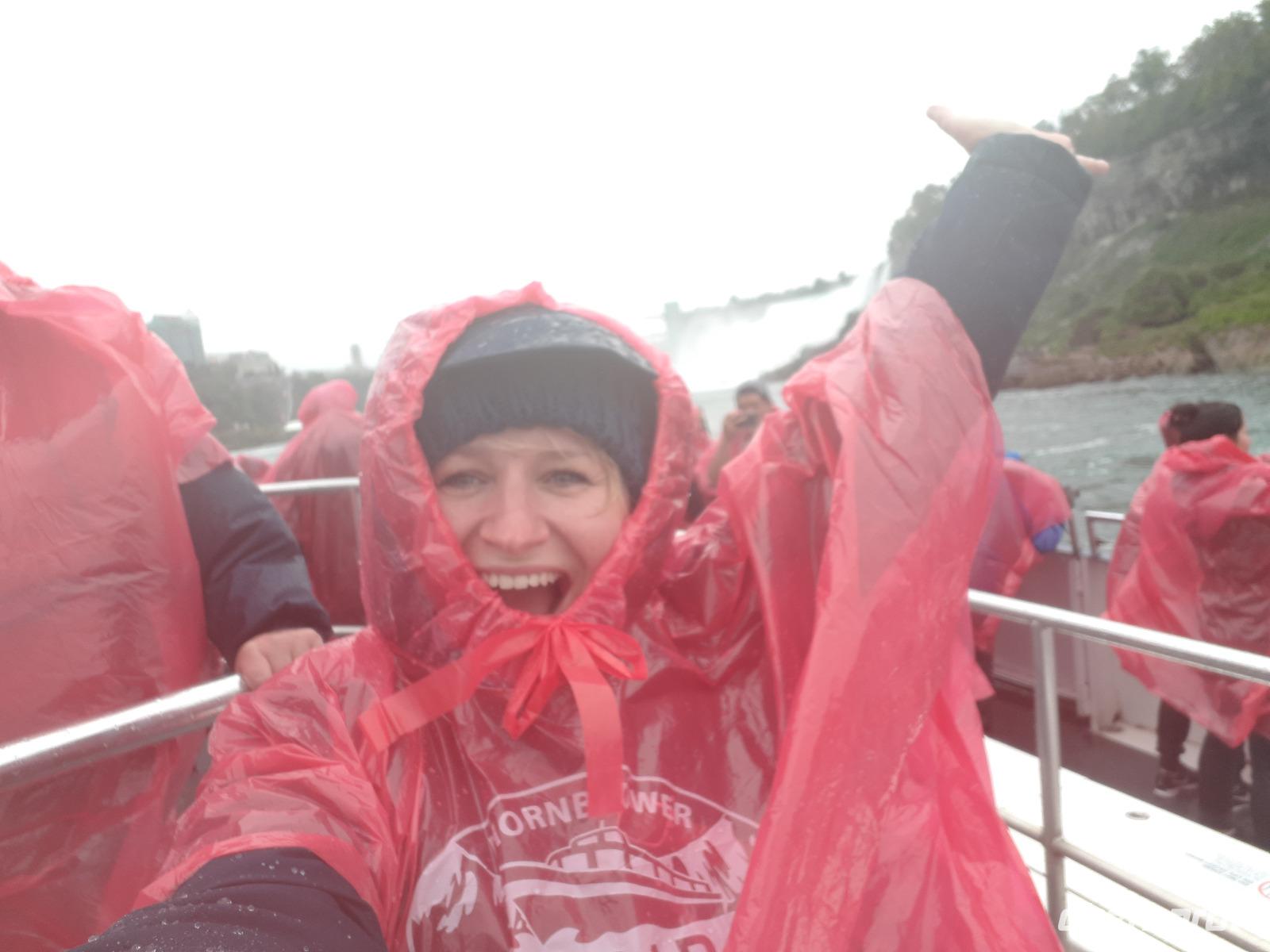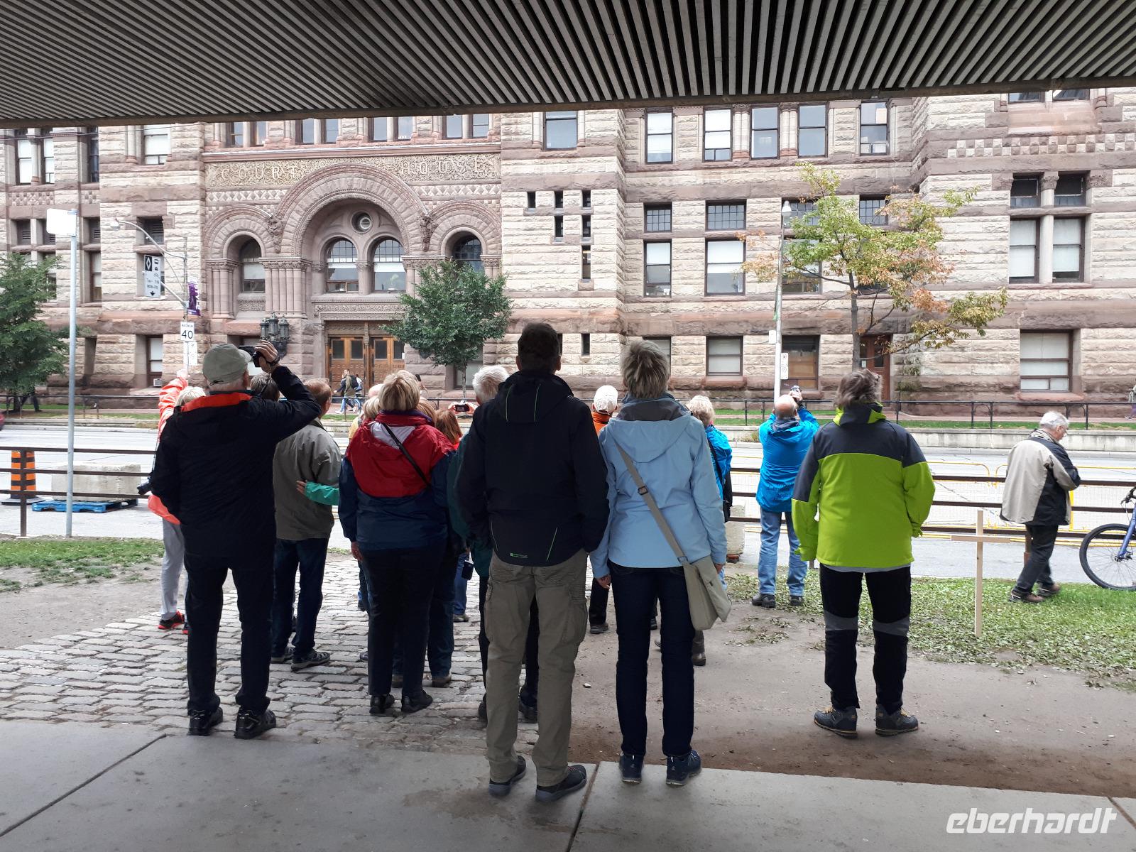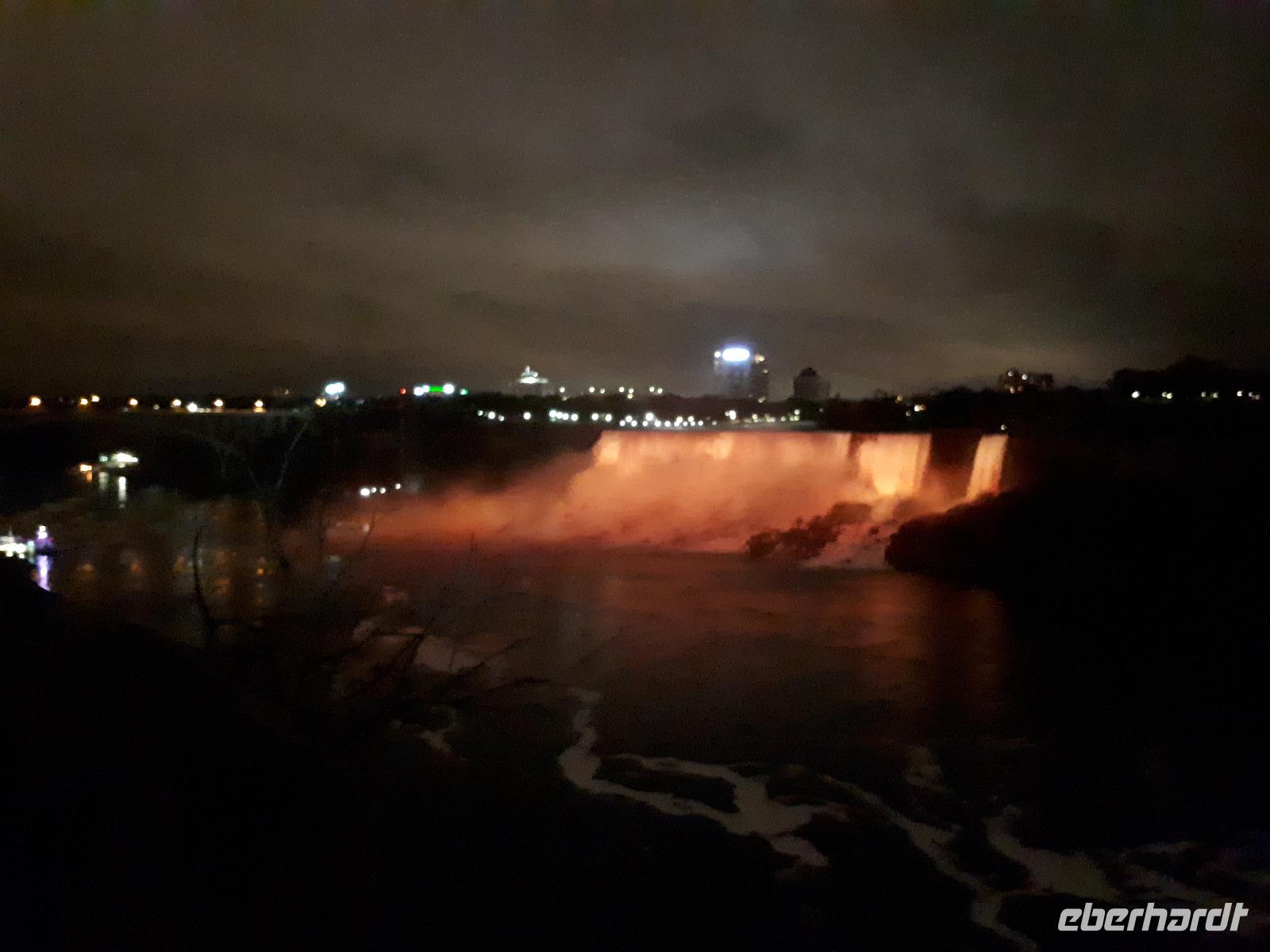 Nach unserem ersten kanadischen Frühstück hieß es Toronto entdecken. Christine begrüßte uns im Bus mit Datum, Wetter und Spruch des Tages. Während unserer Rundfahrt durch das Bankenviertel der Stadt am Ontario-See entdeckten wir auch das Bahnhofshotel, in welchem die Queen noch immer über einen ganzen Flur verfügt. Das Wahrzeichen Torontos, der CN-Tower, war unser erster Besichtigungspunkt des Tages. Der 550 Meter hohe Turm gehört zu den neuen Weltwundern und liegt nicht weit vom Hafen entfernt. Mit einem Lift fuhren wir in 58 Sekunden bis auf 346 Meter hinauf und erhielten trotz trüben Wetters eine beeindruckende Aussicht auf die 2.8 Millionen Einwohner große Stadt. Anschließend durchkreuzten wir Toronto bis zur Casa Loma, ein Herrenhaus welches von 1911 bis 1914 von Sir Henry Pellatt als Wohnhaus erbaut wurde und bestaunten die reichen Villenviertel, Kensington Market und Chinatown. Zurück in Downtown schauten wir zur Harbourfront, hielten an der Queensstreet um uns eines der zahlreichen Rathäuser genauer anzusehen und verschwanden kurz im Underground. Geschäftiges Treiben verriet uns, dass die Zeit der Mittagspause angebrochen war. Vorbei am alten Fort York, dem historischen Ursprung der heutigen Metropole, verließen wir die größte Stadt Kanadas um zu den ca. 1,5 Stunden von Toronto entfernten Niagara-Fällen zu fahren denn dort wartete bereits das nächste Highlight auf uns. Mit roten Regenponchos ausgestattet bestiegen wir unser Boot und fuhren so dicht an die Wasserfälle heran, dass außer einer Wand aus weißer Gischt nichts mehr zu sehen ist. Es war unwahrscheinlich beeindruckend, mit welcher Kraft und Gewalt sich die Wassermassen die 57 Meter Höhenunterschied hinunterstürzten. Trotz der Capes sind wir ziemlich nass geworden, bei dem anschließenden Spaziergang zum Besucherzentrum hatten wir aber genug Zeit wieder zu trocknen. Unser Abendessen nahmen wir mit Aussicht ein, im 230 Meter hohen Skylon Tower. Christine schlug vor, nach dem Abendessen in das benachbarte IMAX-Kino zu gehen und wir nahmen gerne an. Durch den kurzen Film erfuhren wir etwas mehr über die Geschichte und Legenden rund um die Niagara Fälle. Vor allem die Überflugaufnahmen haben uns gefallen. Anschließend unternahmen noch einige wenige Gäste erneut einen kleinen Spaziergang zu den Niagara-Fällen. Diese waren nun beleuchtet und schillerten in leuchtendem Grün, Rot und Blau.