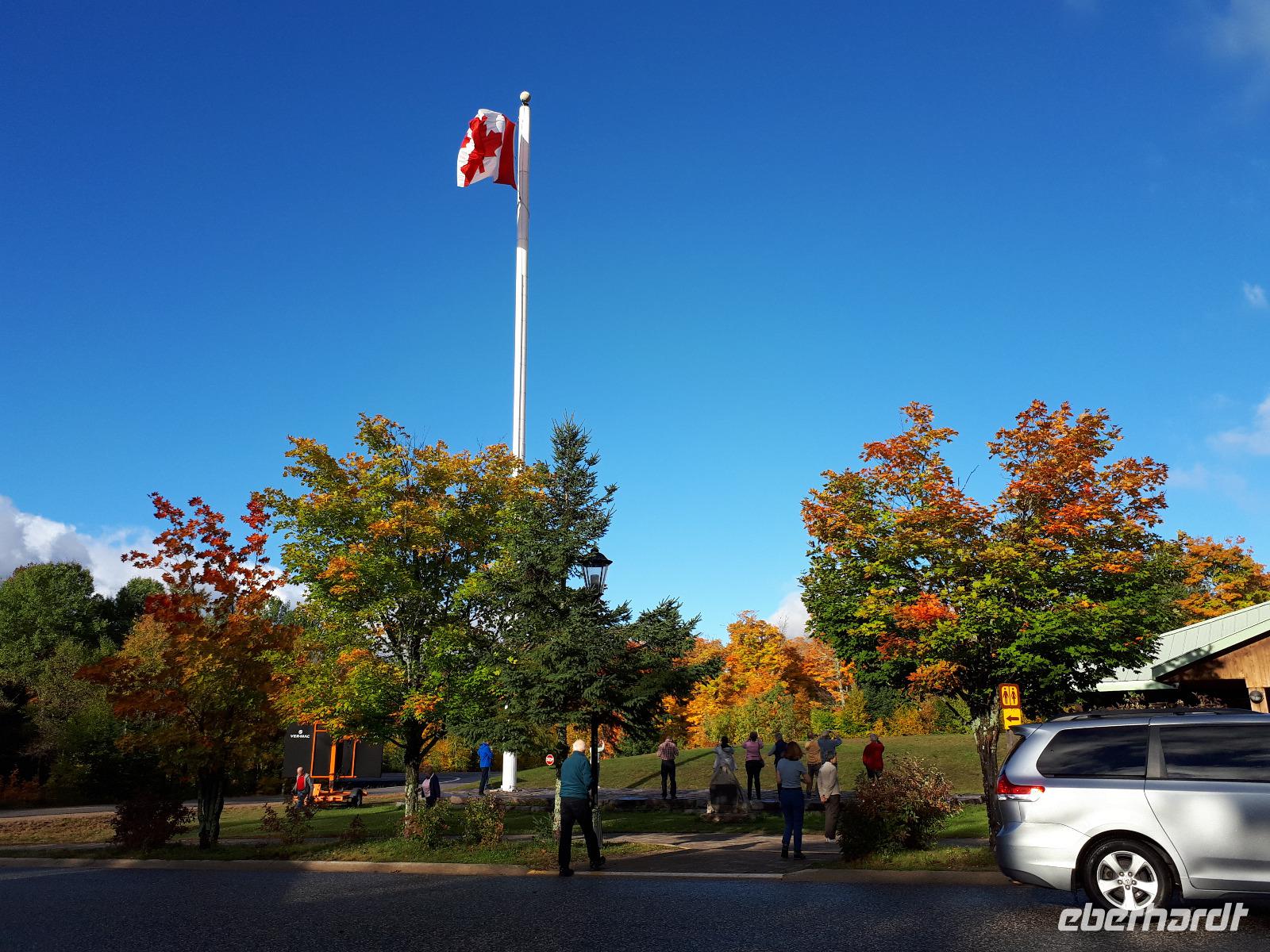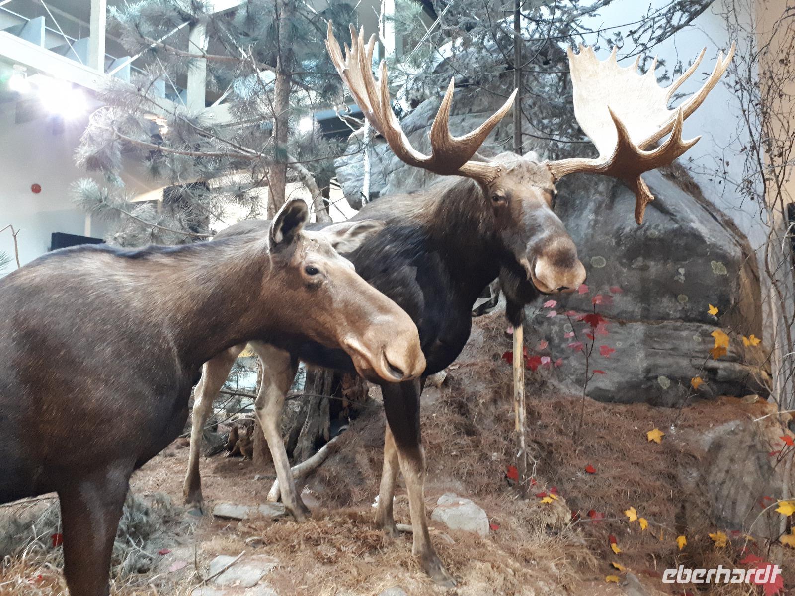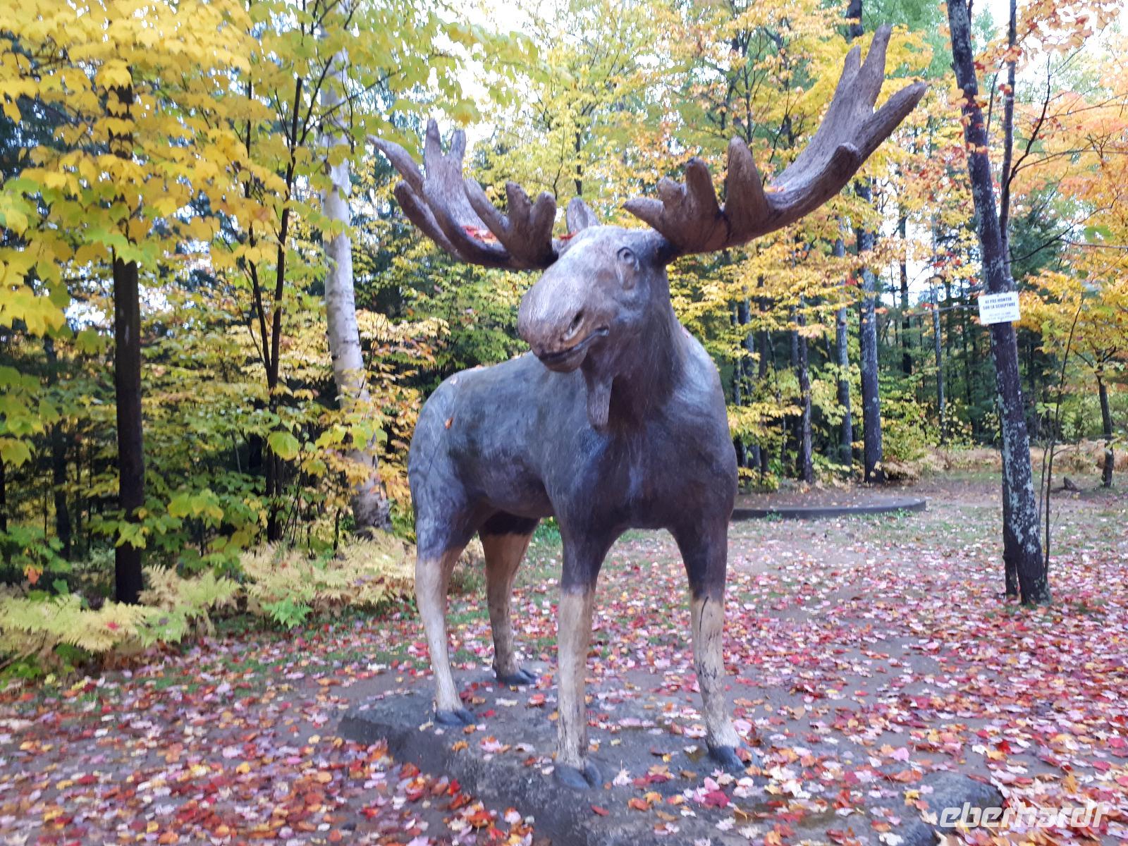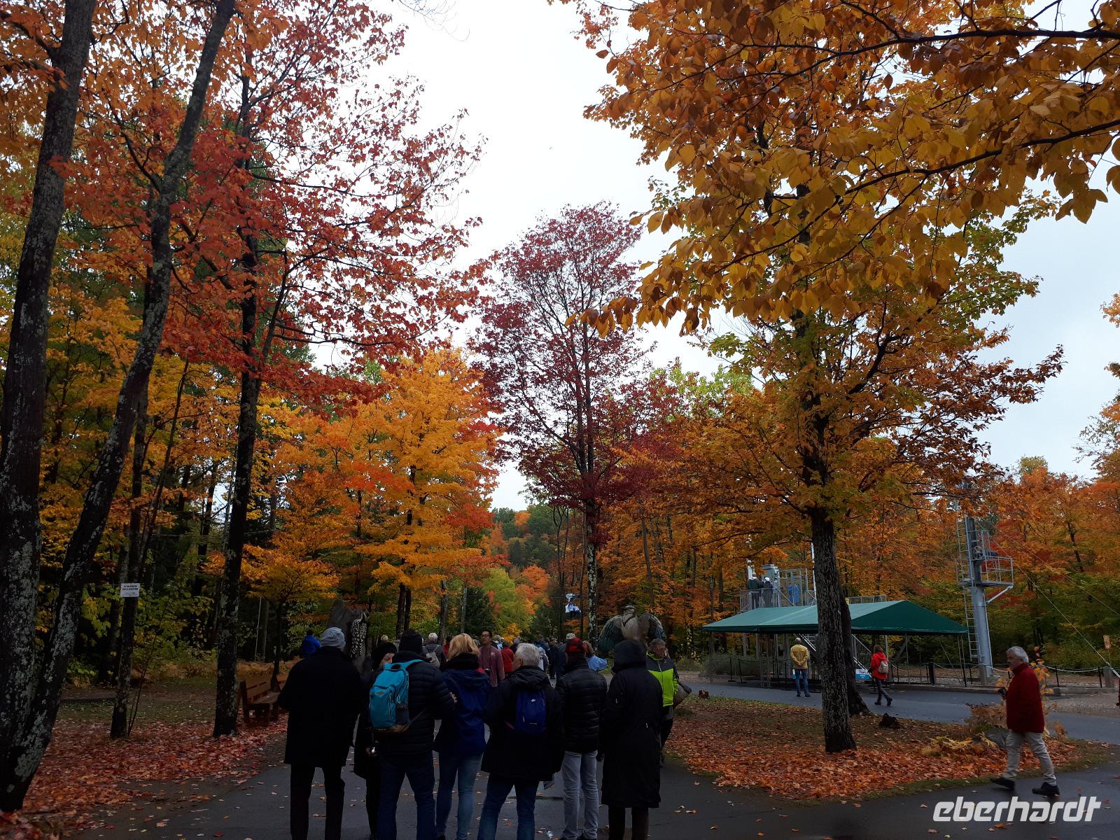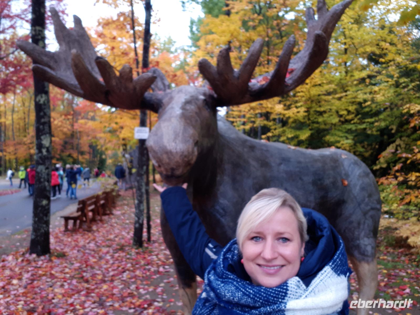 Der Tag überraschte uns mit blauem Himmel und ein paar leichten Wölkchen. Zum ersten Mal sahen wir auf Grund des sonnigen Wetters die unglaublichen Farben des Indian Summer in seiner voller Pracht. Wir fotografierten wie die Wilden, schließlich sollten die Lieben zu Hause auch dieses Wunderwerk der Natur sehen können. Bevor wir den Naturpark verließen, hielten wir noch am Besucherzentrum des Algonquin Parks. Hier konnten wir die heimische Tierwelt nicht nur sehen sondern auch hören und bei einem kurzen Film einen Eindruck über die wunderschönen Landschaften zu den unterschiedlichen Jahreszeiten bekommen.