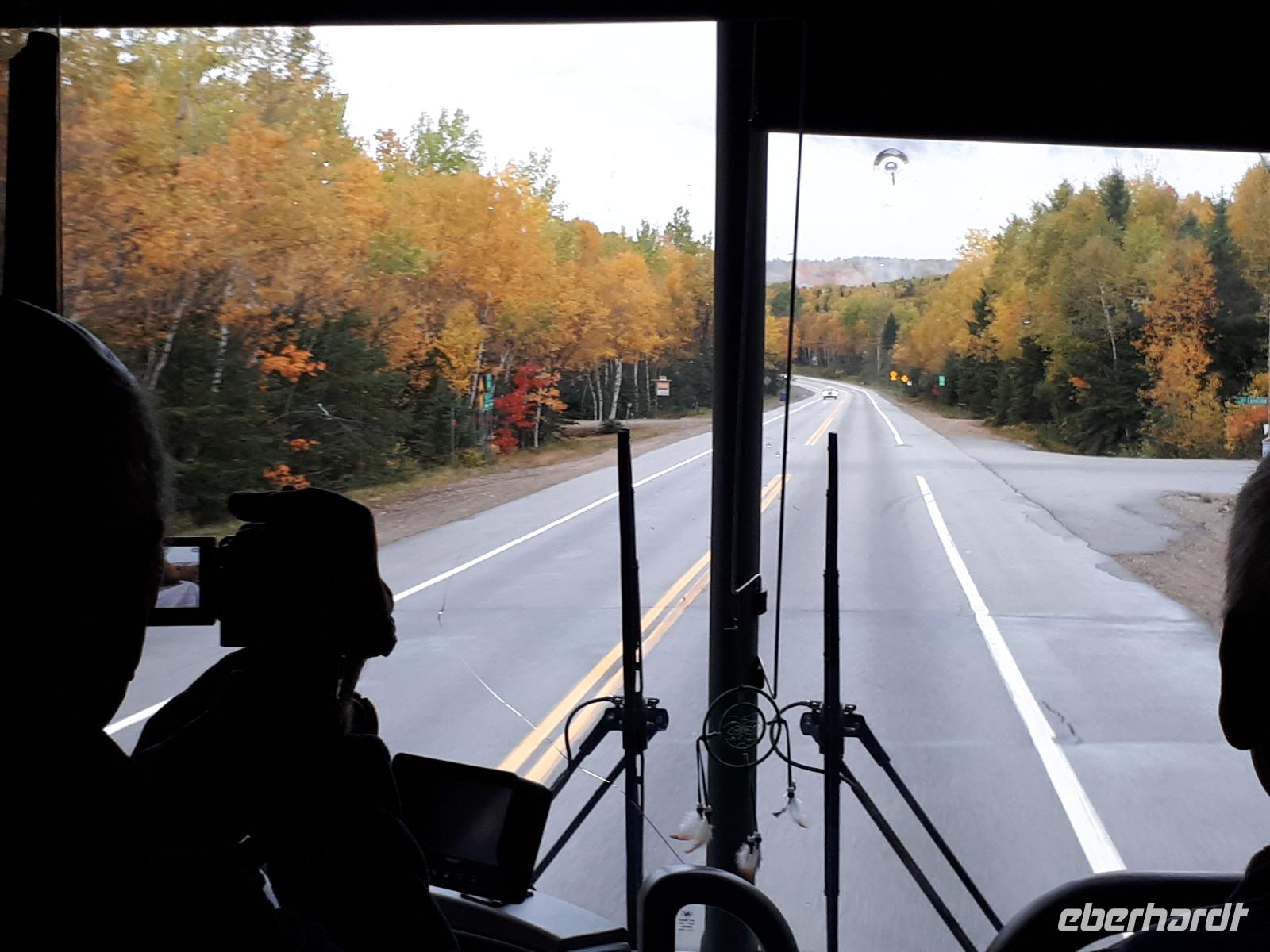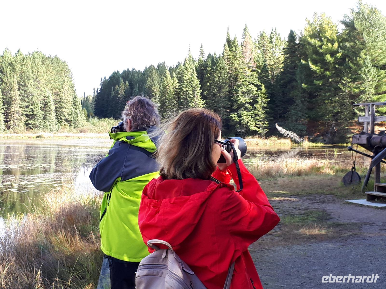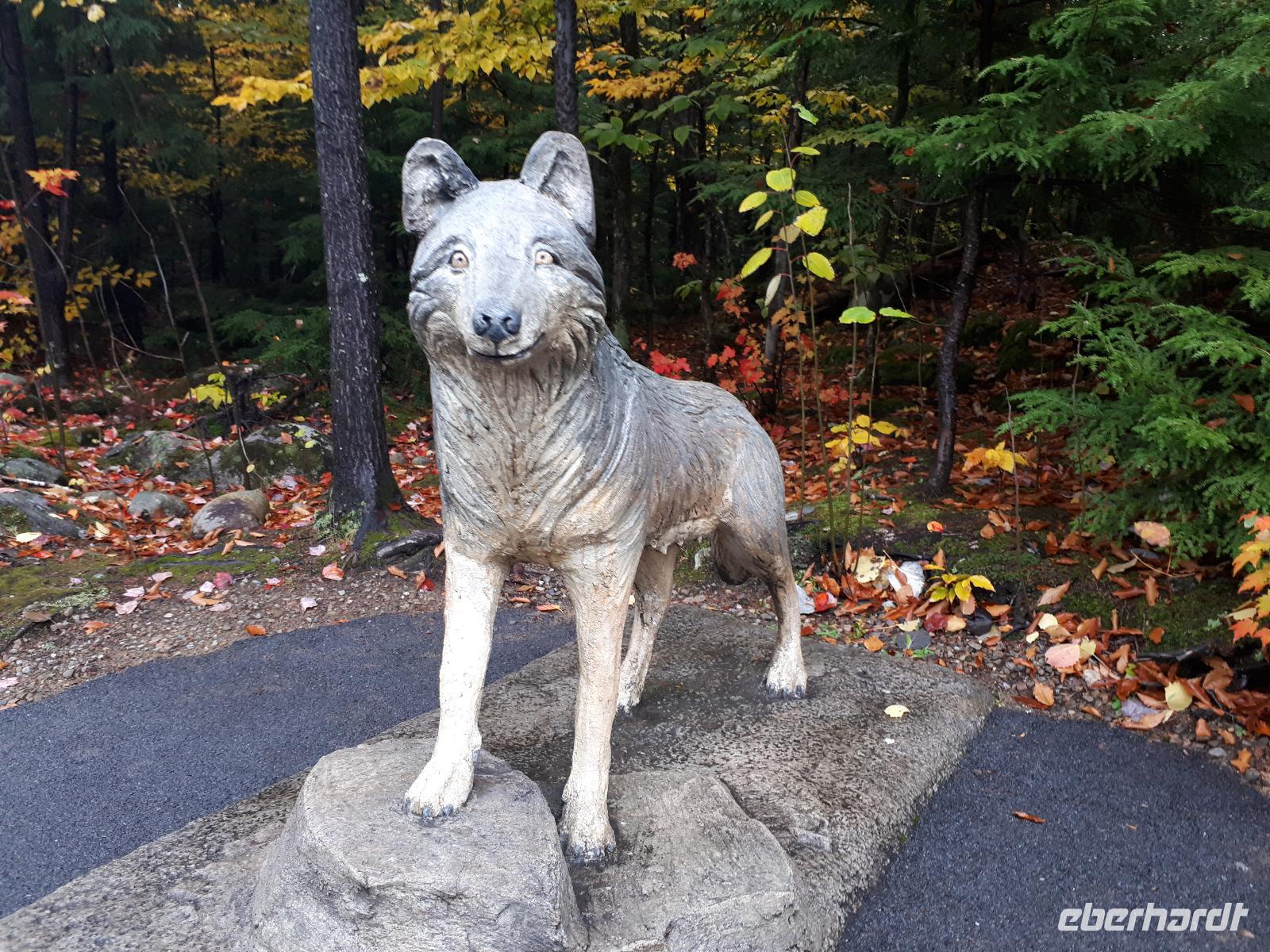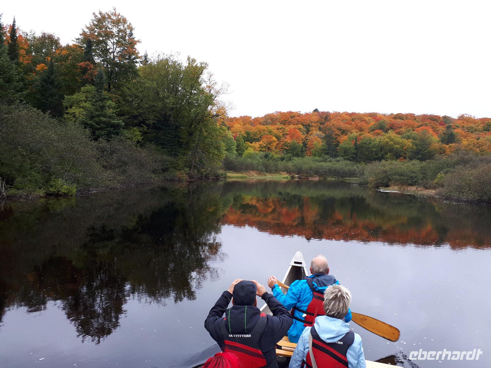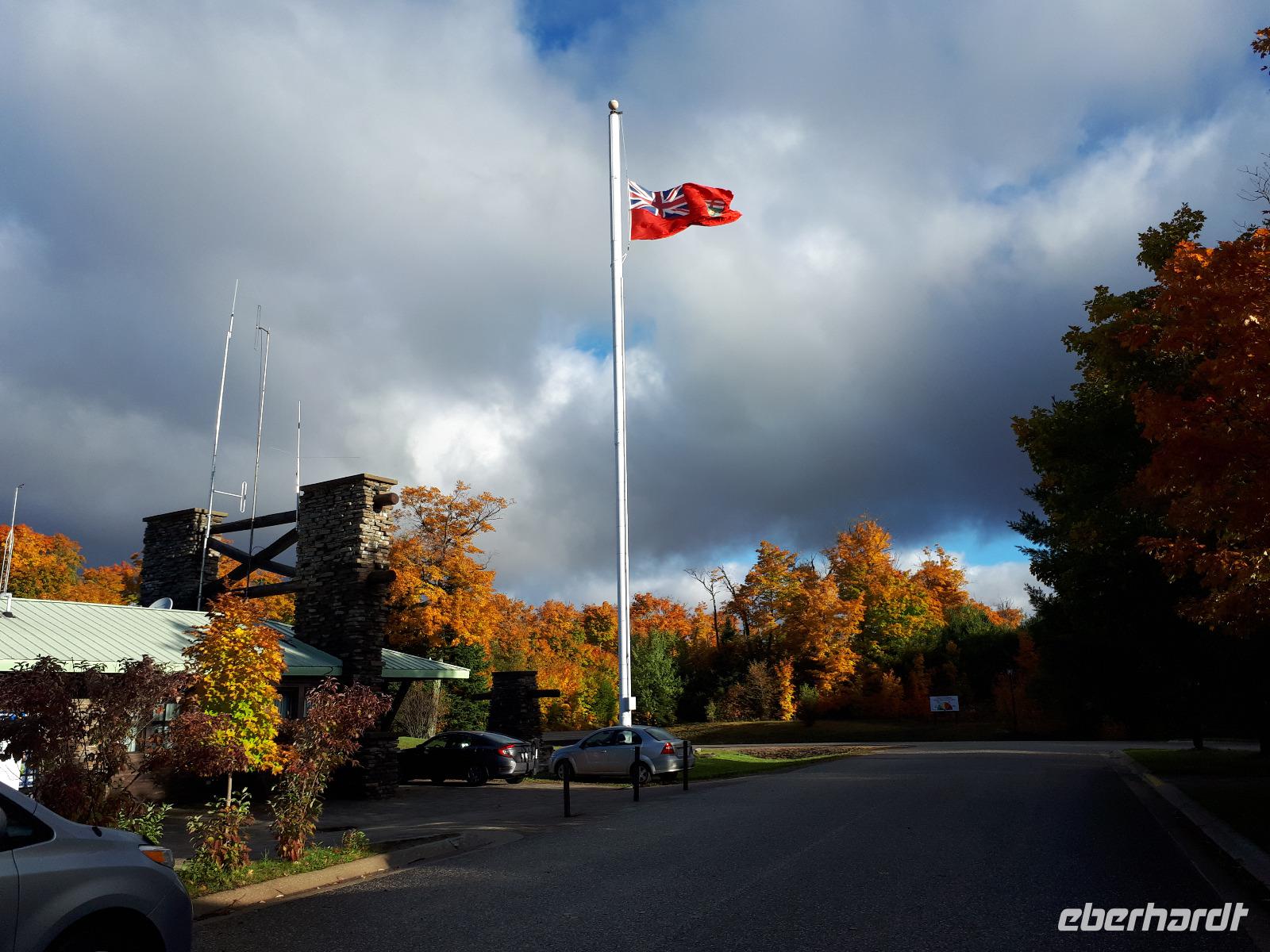 Der Tag überraschte uns mit blauem Himmel und ein paar leichten Wölkchen. Zum ersten Mal sahen wir auf Grund des sonnigen Wetters die unglaublichen Farben des Indian Summer in seiner voller Pracht. Wir fotografierten wie die Wilden, schließlich sollten die Lieben zu Hause auch dieses Wunderwerk der Natur sehen können. Bevor wir den Naturpark verließen, hielten wir noch am Besucherzentrum des Algonquin Parks. Hier konnten wir die heimische Tierwelt nicht nur sehen sondern auch hören und bei einem kurzen Film einen Eindruck über die wunderschönen Landschaften zu den unterschiedlichen Jahreszeiten bekommen.