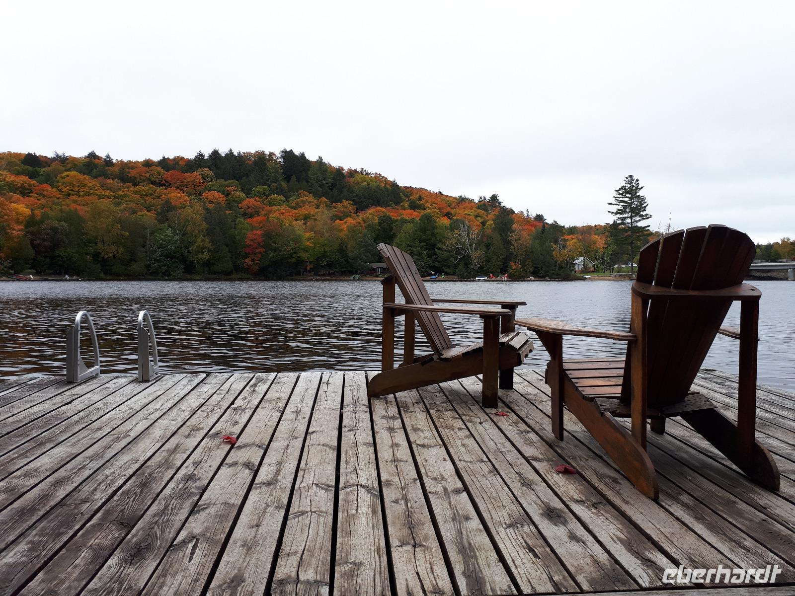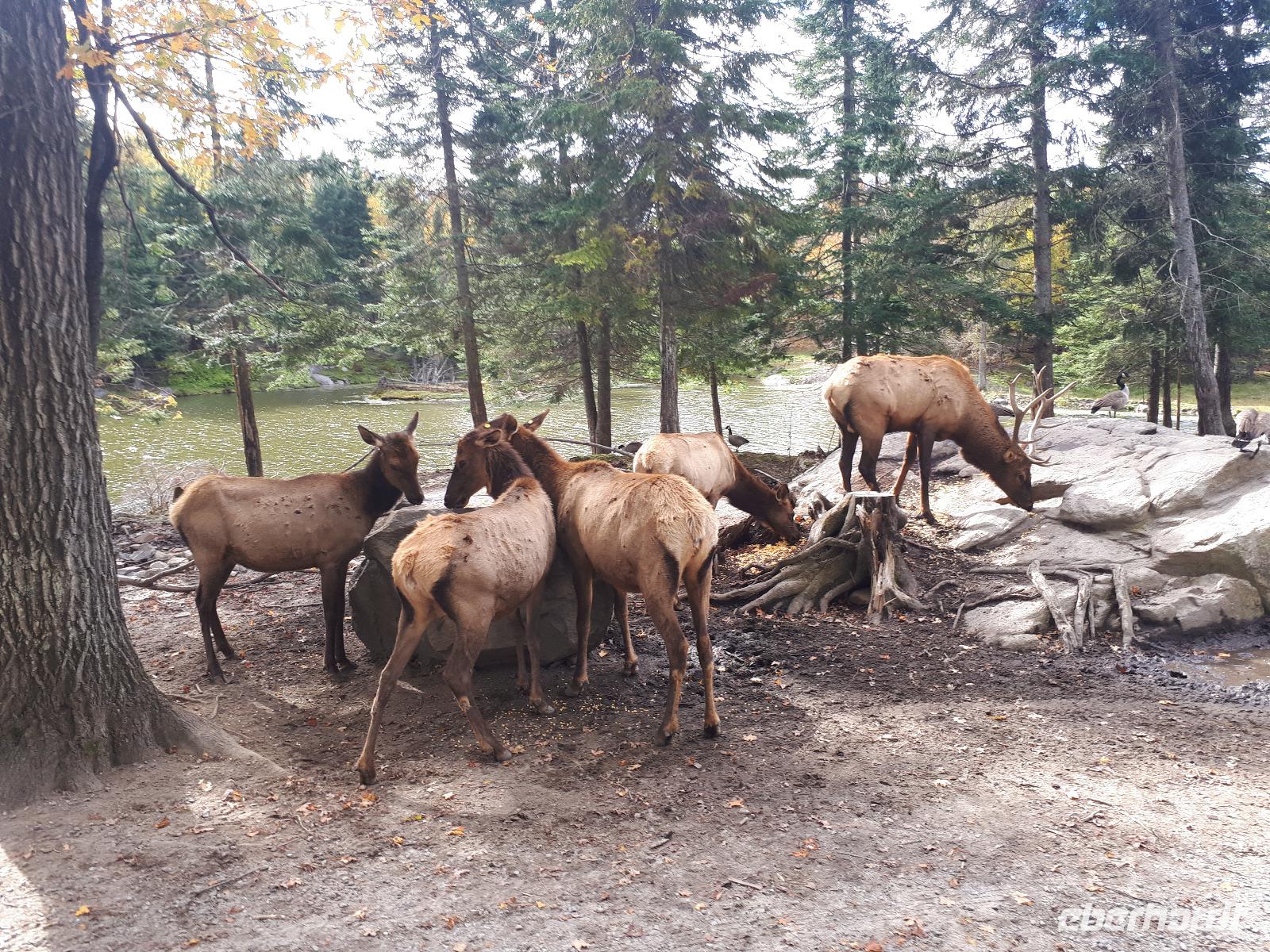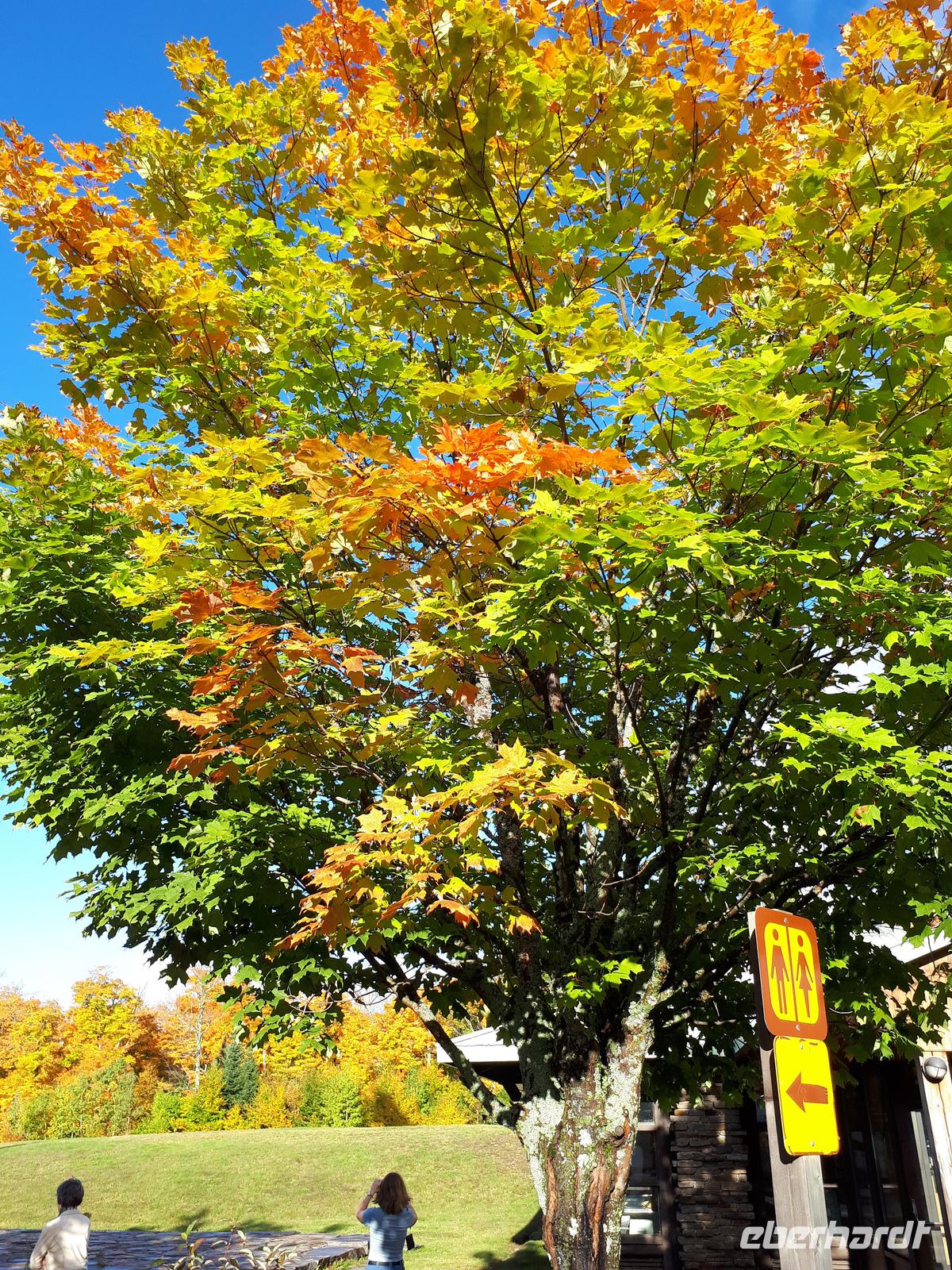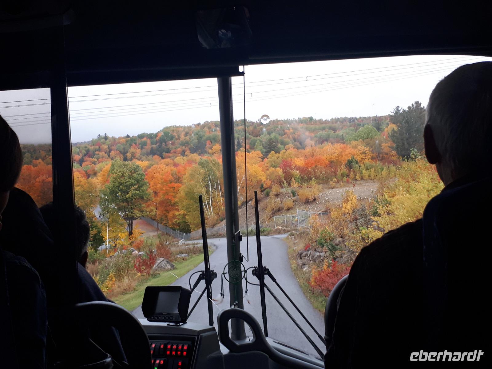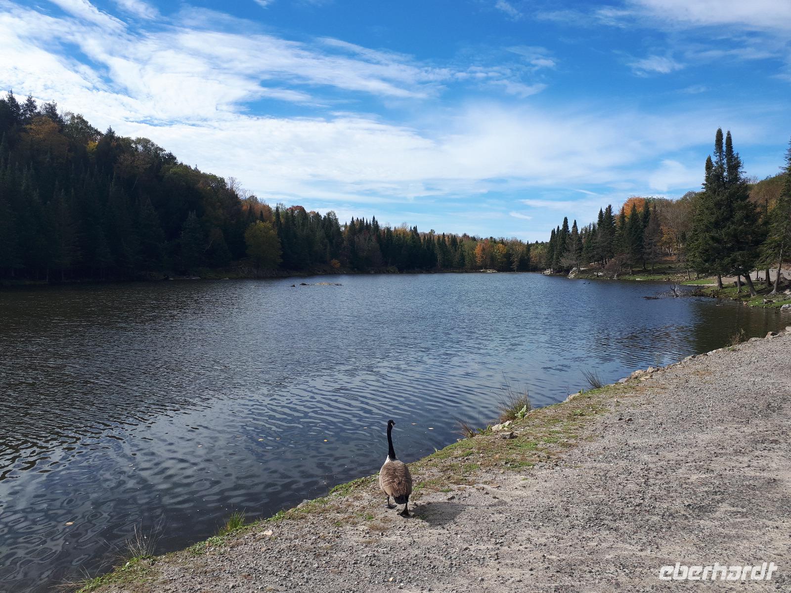 Der Tag überraschte uns mit blauem Himmel und ein paar leichten Wölkchen. Zum ersten Mal sahen wir auf Grund des sonnigen Wetters die unglaublichen Farben des Indian Summer in seiner voller Pracht. Wir fotografierten wie die Wilden, schließlich sollten die Lieben zu Hause auch dieses Wunderwerk der Natur sehen können. Bevor wir den Naturpark verließen, hielten wir noch am Besucherzentrum des Algonquin Parks. Hier konnten wir die heimische Tierwelt nicht nur sehen sondern auch hören und bei einem kurzen Film einen Eindruck über die wunderschönen Landschaften zu den unterschiedlichen Jahreszeiten bekommen.