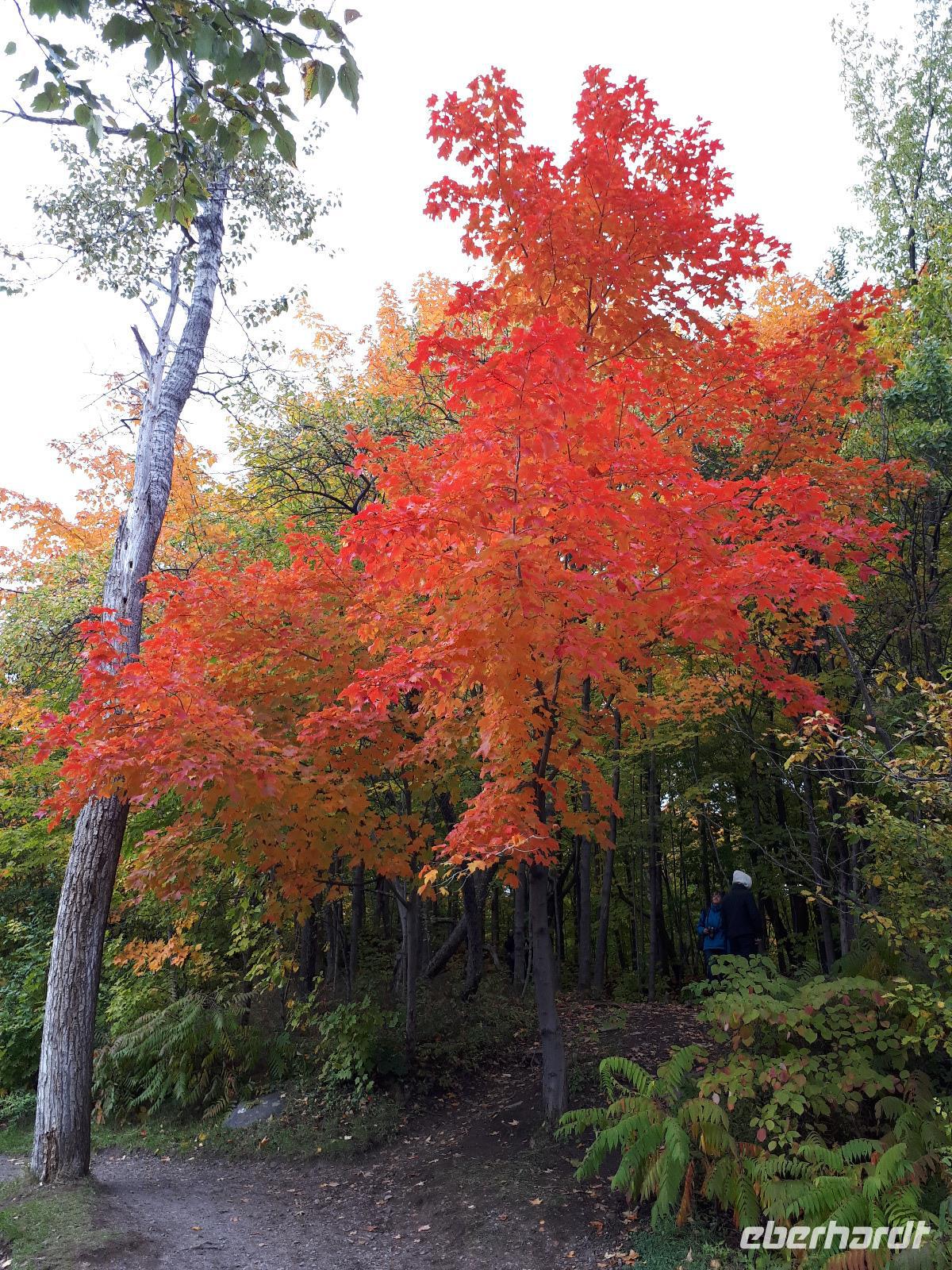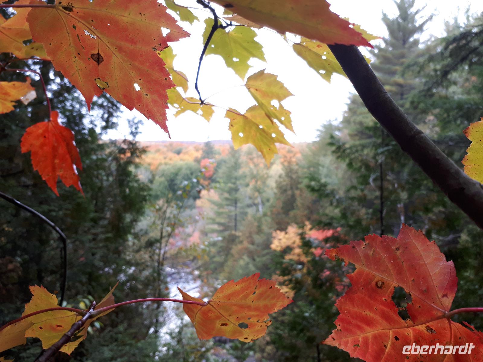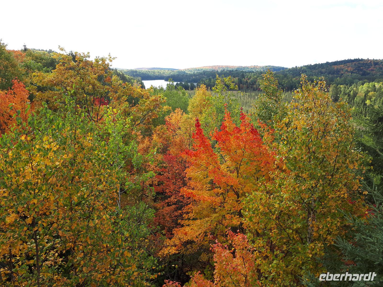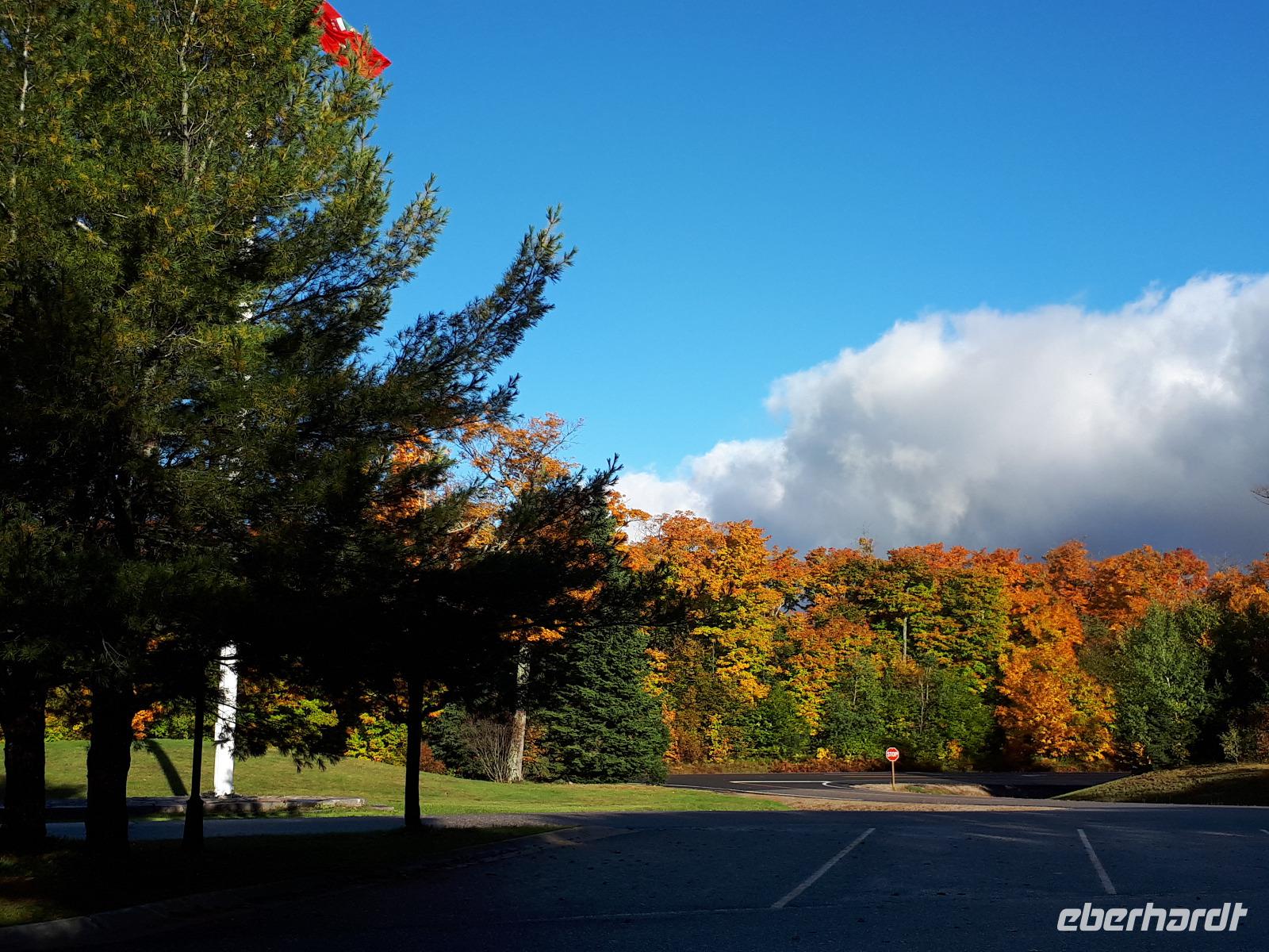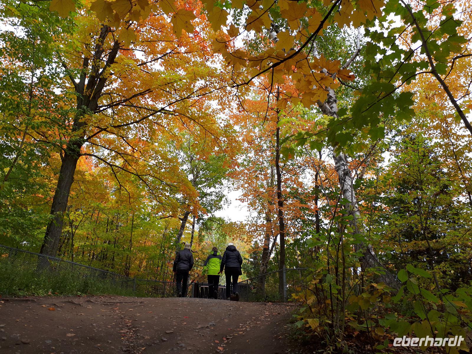 Der Tag überraschte uns mit blauem Himmel und ein paar leichten Wölkchen. Zum ersten Mal sahen wir auf Grund des sonnigen Wetters die unglaublichen Farben des Indian Summer in seiner voller Pracht. Wir fotografierten wie die Wilden, schließlich sollten die Lieben zu Hause auch dieses Wunderwerk der Natur sehen können. Bevor wir den Naturpark verließen, hielten wir noch am Besucherzentrum des Algonquin Parks. Hier konnten wir die heimische Tierwelt nicht nur sehen sondern auch hören und bei einem kurzen Film einen Eindruck über die wunderschönen Landschaften zu den unterschiedlichen Jahreszeiten bekommen.