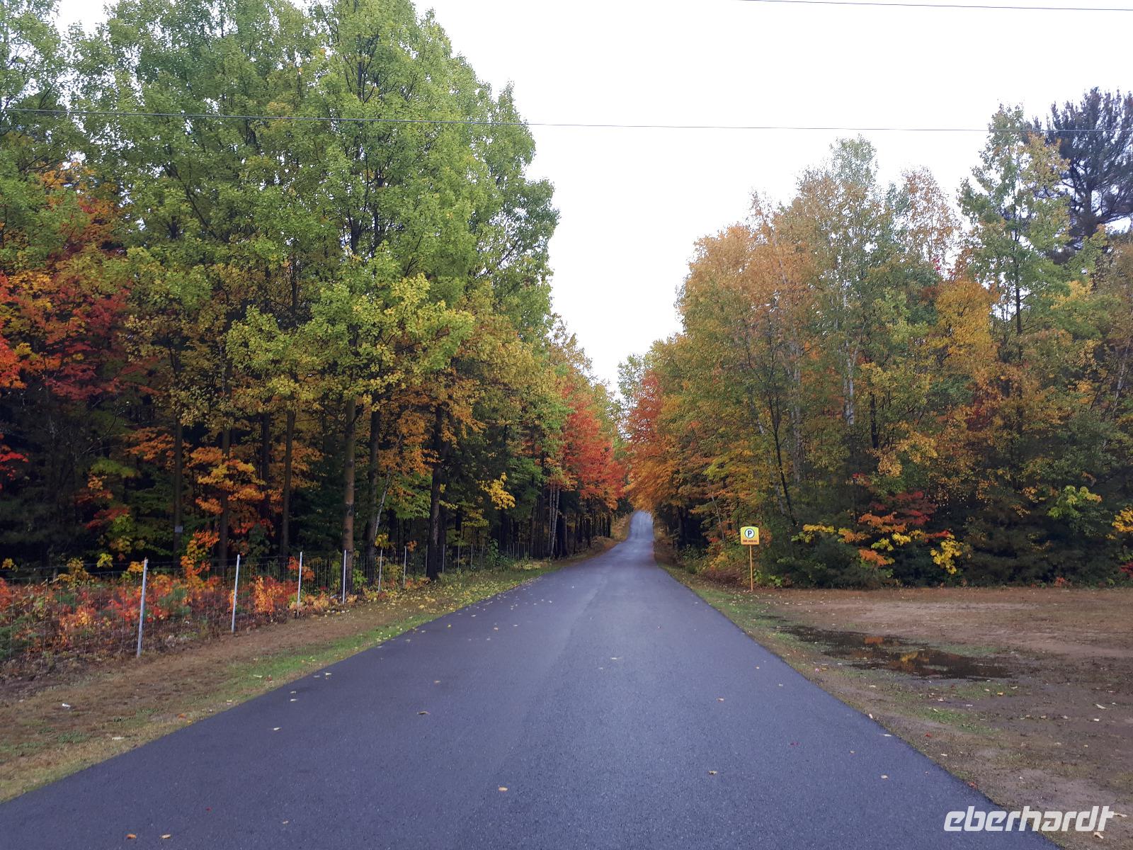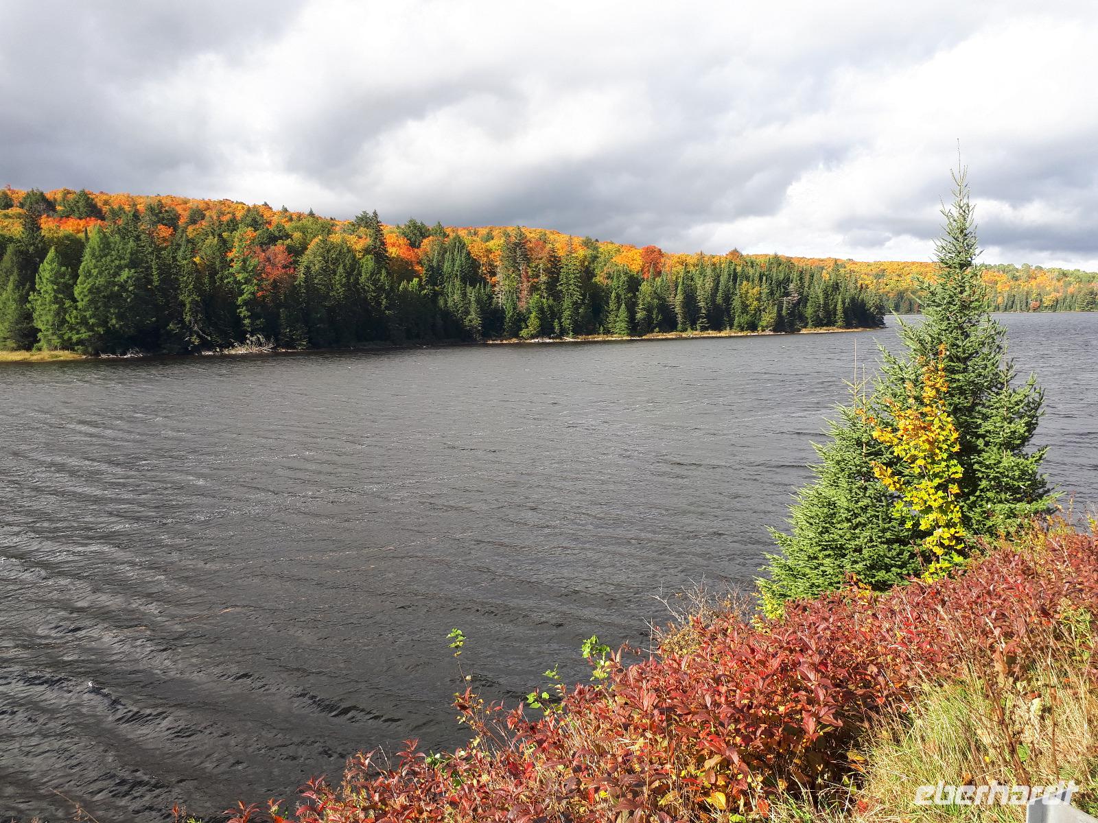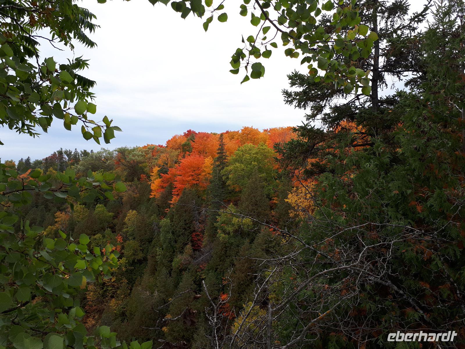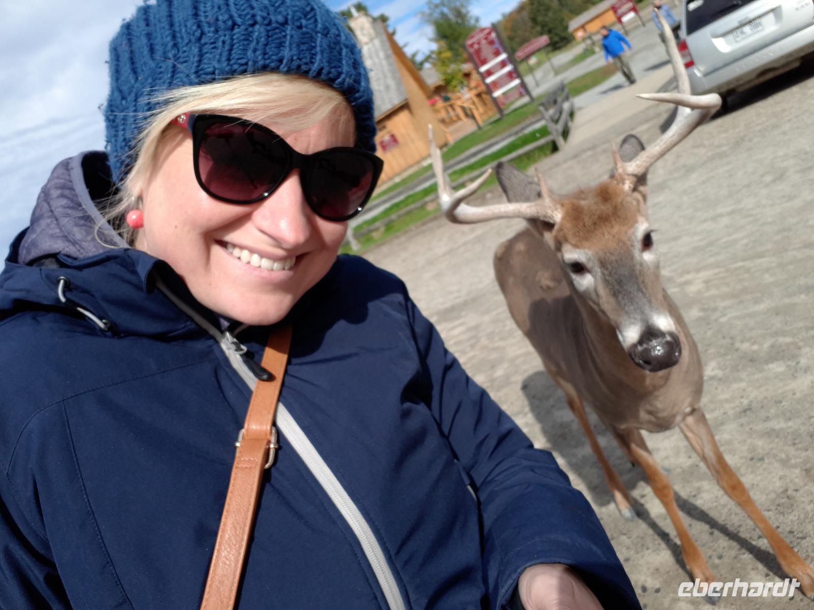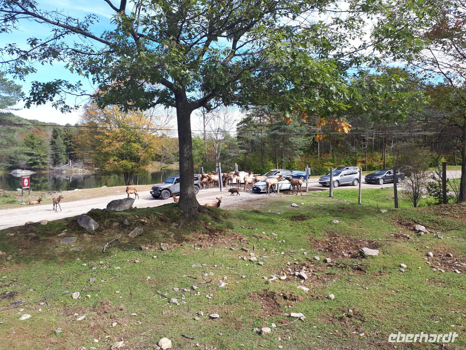 Der Tag überraschte uns mit blauem Himmel und ein paar leichten Wölkchen. Zum ersten Mal sahen wir auf Grund des sonnigen Wetters die unglaublichen Farben des Indian Summer in seiner voller Pracht. Wir fotografierten wie die Wilden, schließlich sollten die Lieben zu Hause auch dieses Wunderwerk der Natur sehen können. Bevor wir den Naturpark verließen, hielten wir noch am Besucherzentrum des Algonquin Parks. Hier konnten wir die heimische Tierwelt nicht nur sehen sondern auch hören und bei einem kurzen Film einen Eindruck über die wunderschönen Landschaften zu den unterschiedlichen Jahreszeiten bekommen.