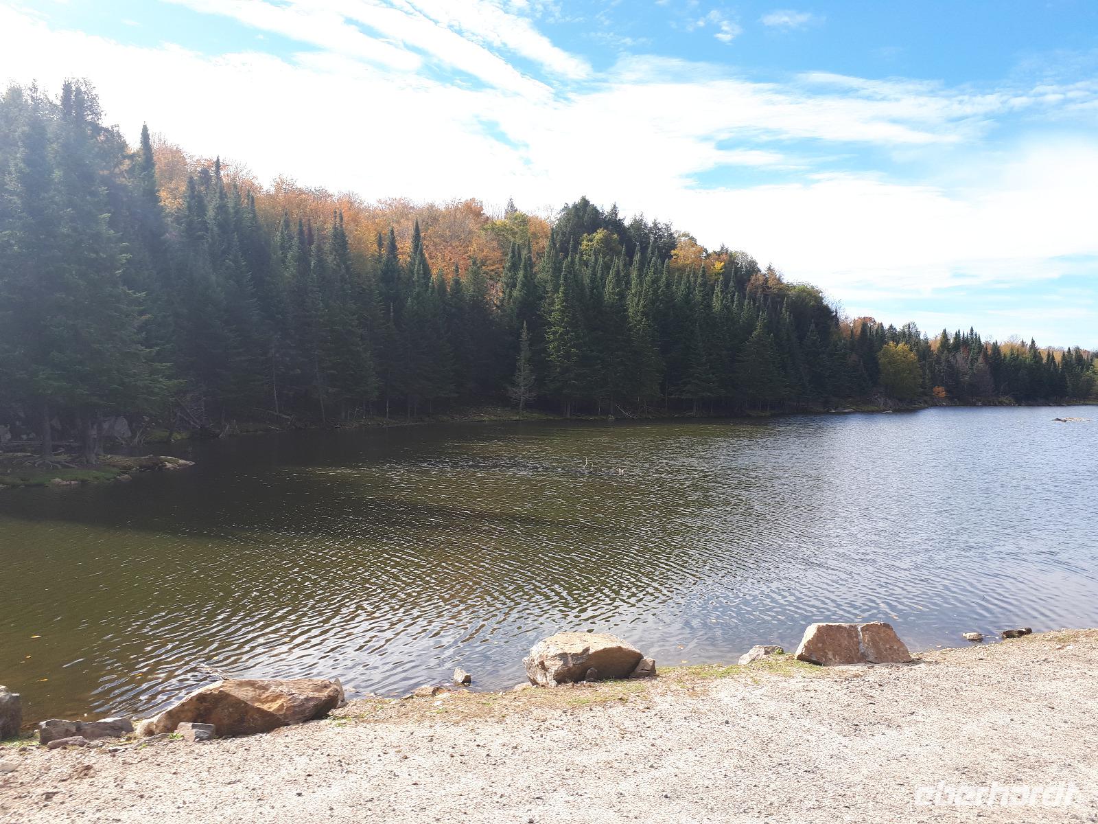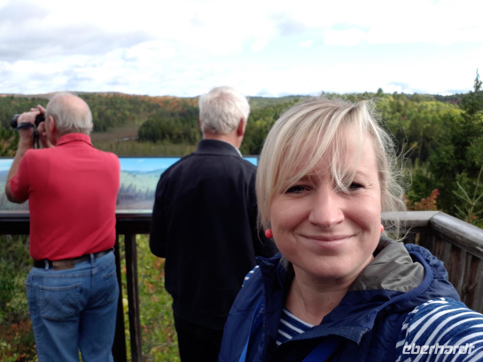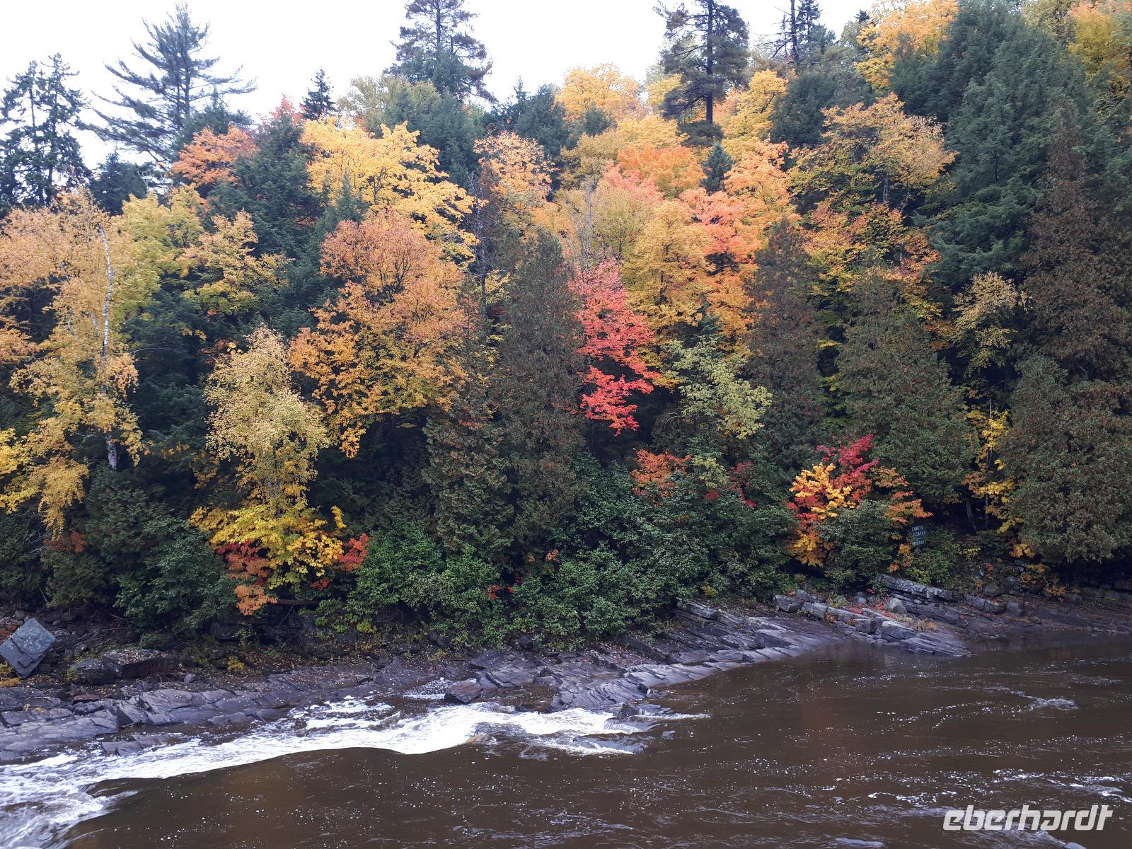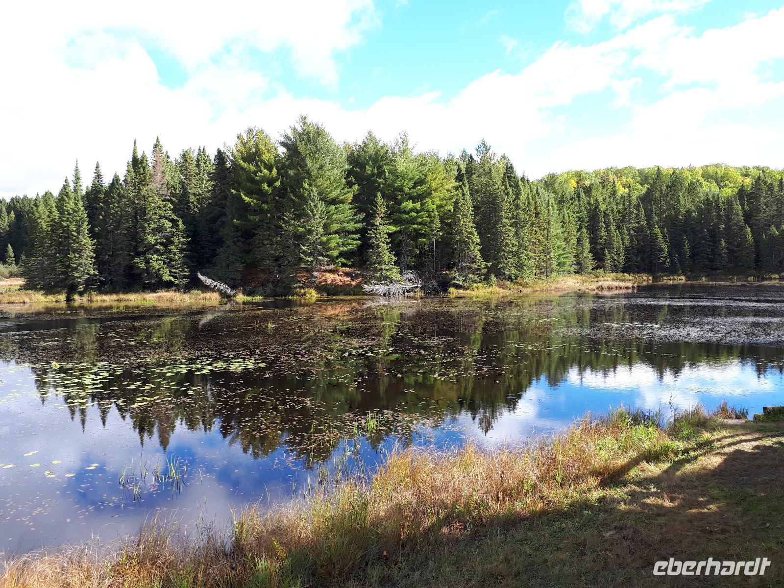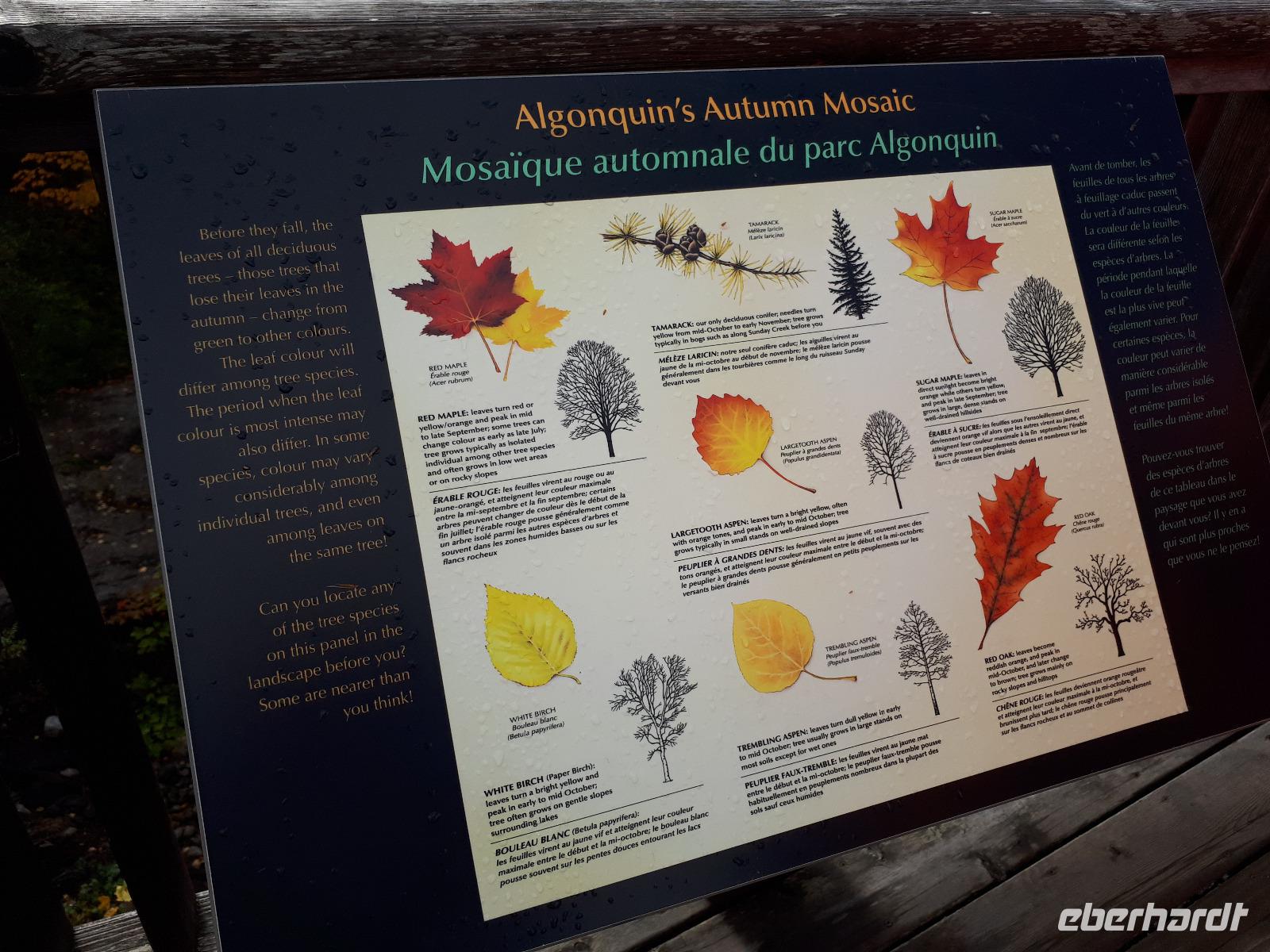 Der Tag überraschte uns mit blauem Himmel und ein paar leichten Wölkchen. Zum ersten Mal sahen wir auf Grund des sonnigen Wetters die unglaublichen Farben des Indian Summer in seiner voller Pracht. Wir fotografierten wie die Wilden, schließlich sollten die Lieben zu Hause auch dieses Wunderwerk der Natur sehen können. Bevor wir den Naturpark verließen, hielten wir noch am Besucherzentrum des Algonquin Parks. Hier konnten wir die heimische Tierwelt nicht nur sehen sondern auch hören und bei einem kurzen Film einen Eindruck über die wunderschönen Landschaften zu den unterschiedlichen Jahreszeiten bekommen.