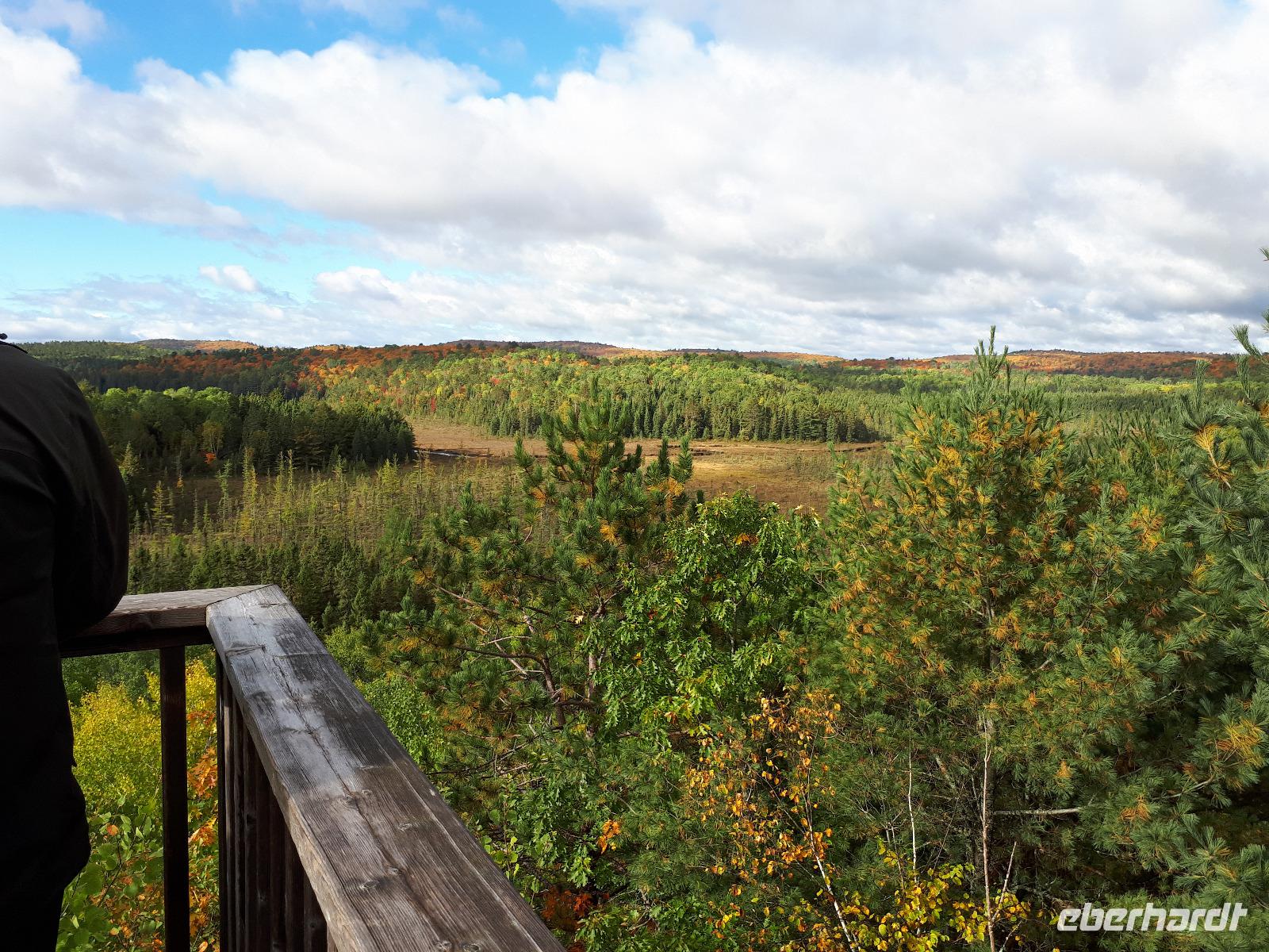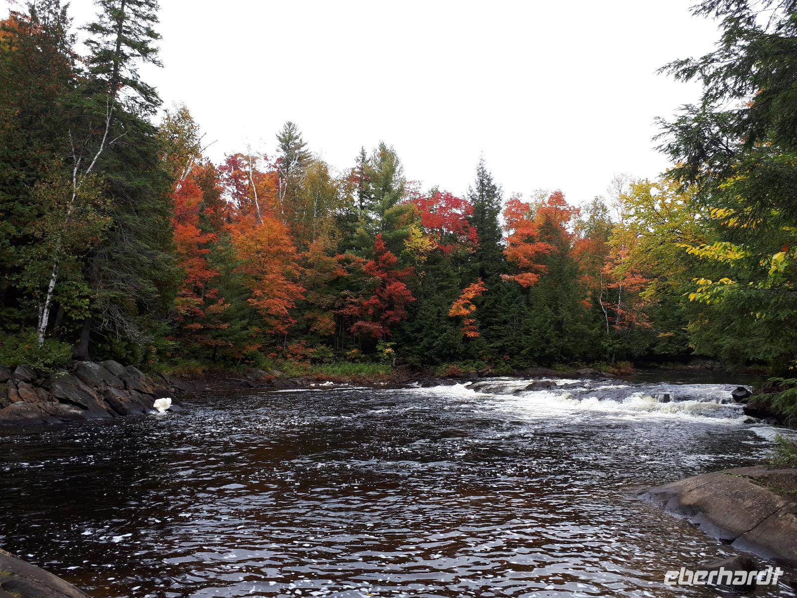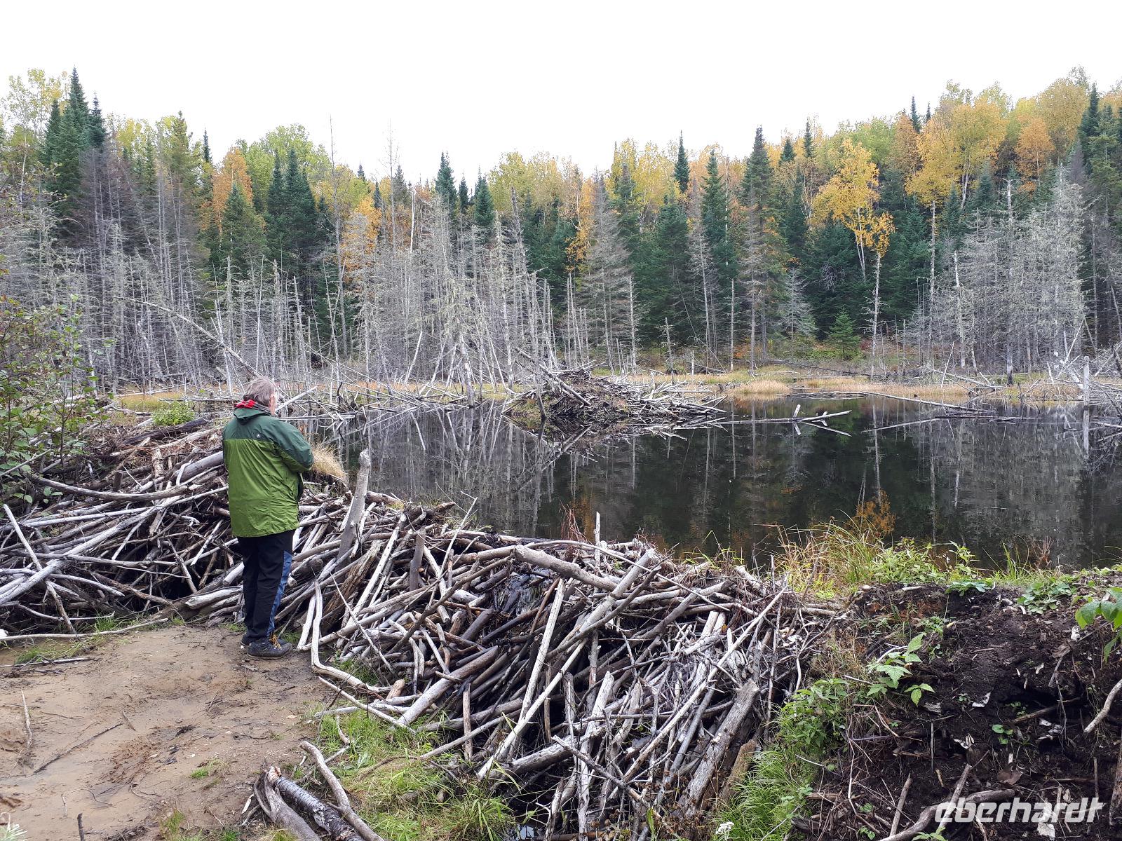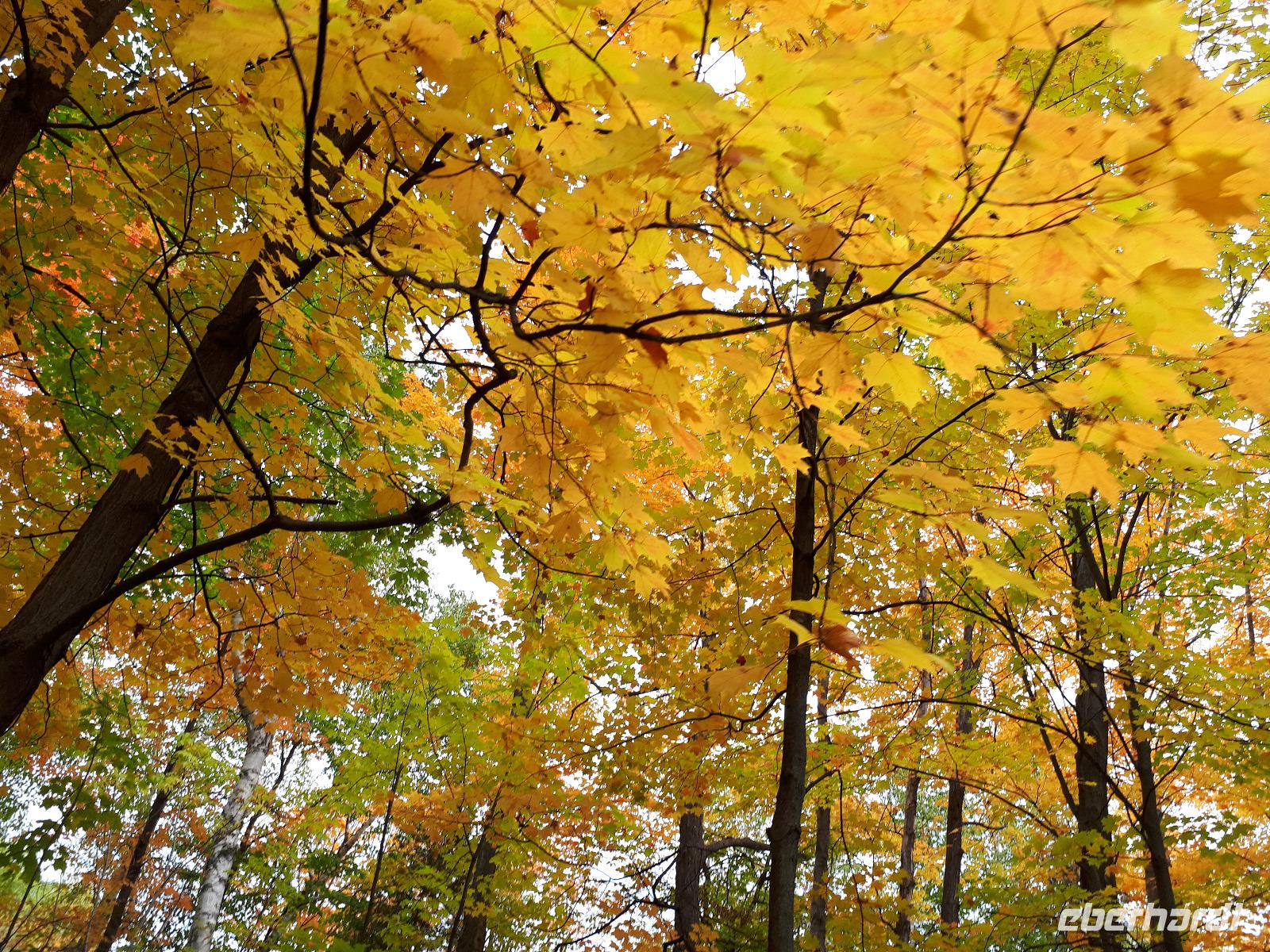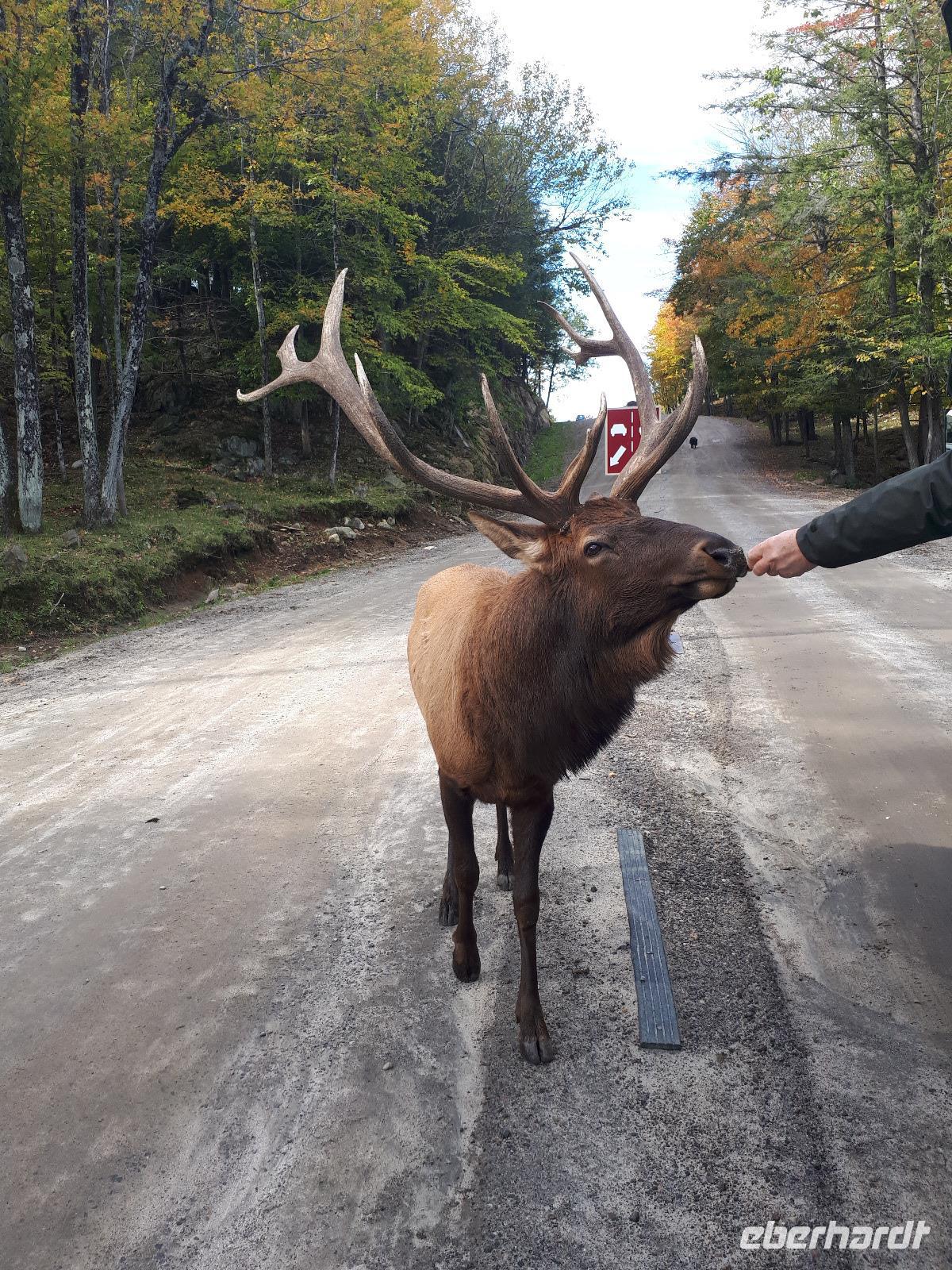 Der Tag überraschte uns mit blauem Himmel und ein paar leichten Wölkchen. Zum ersten Mal sahen wir auf Grund des sonnigen Wetters die unglaublichen Farben des Indian Summer in seiner voller Pracht. Wir fotografierten wie die Wilden, schließlich sollten die Lieben zu Hause auch dieses Wunderwerk der Natur sehen können. Bevor wir den Naturpark verließen, hielten wir noch am Besucherzentrum des Algonquin Parks. Hier konnten wir die heimische Tierwelt nicht nur sehen sondern auch hören und bei einem kurzen Film einen Eindruck über die wunderschönen Landschaften zu den unterschiedlichen Jahreszeiten bekommen.