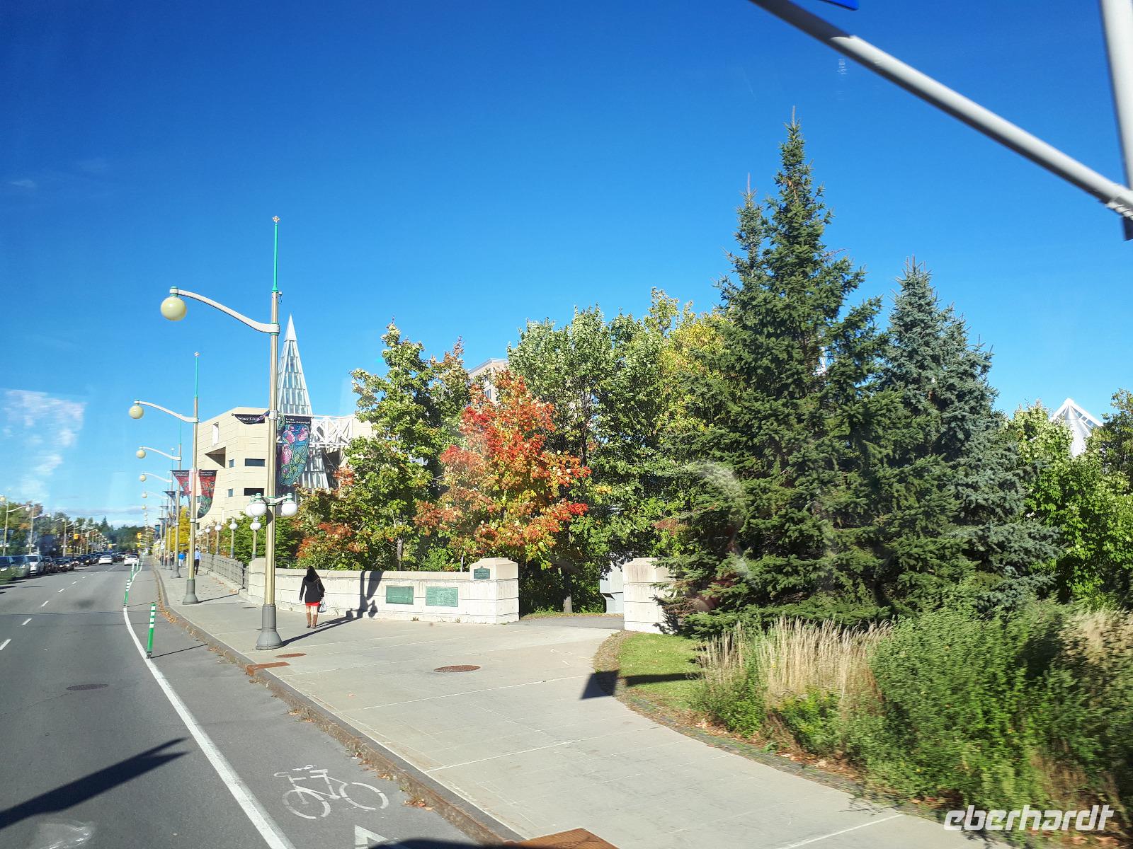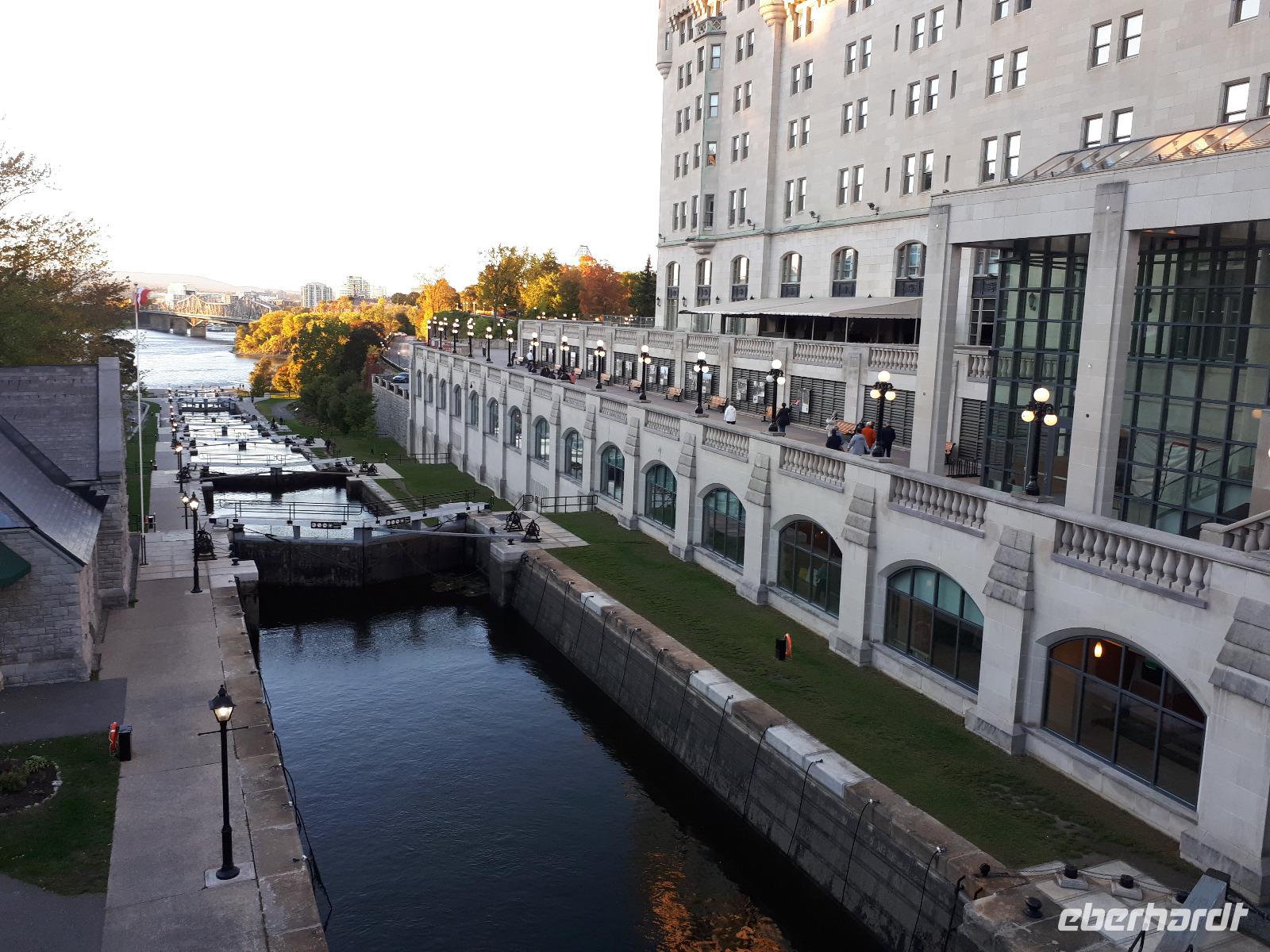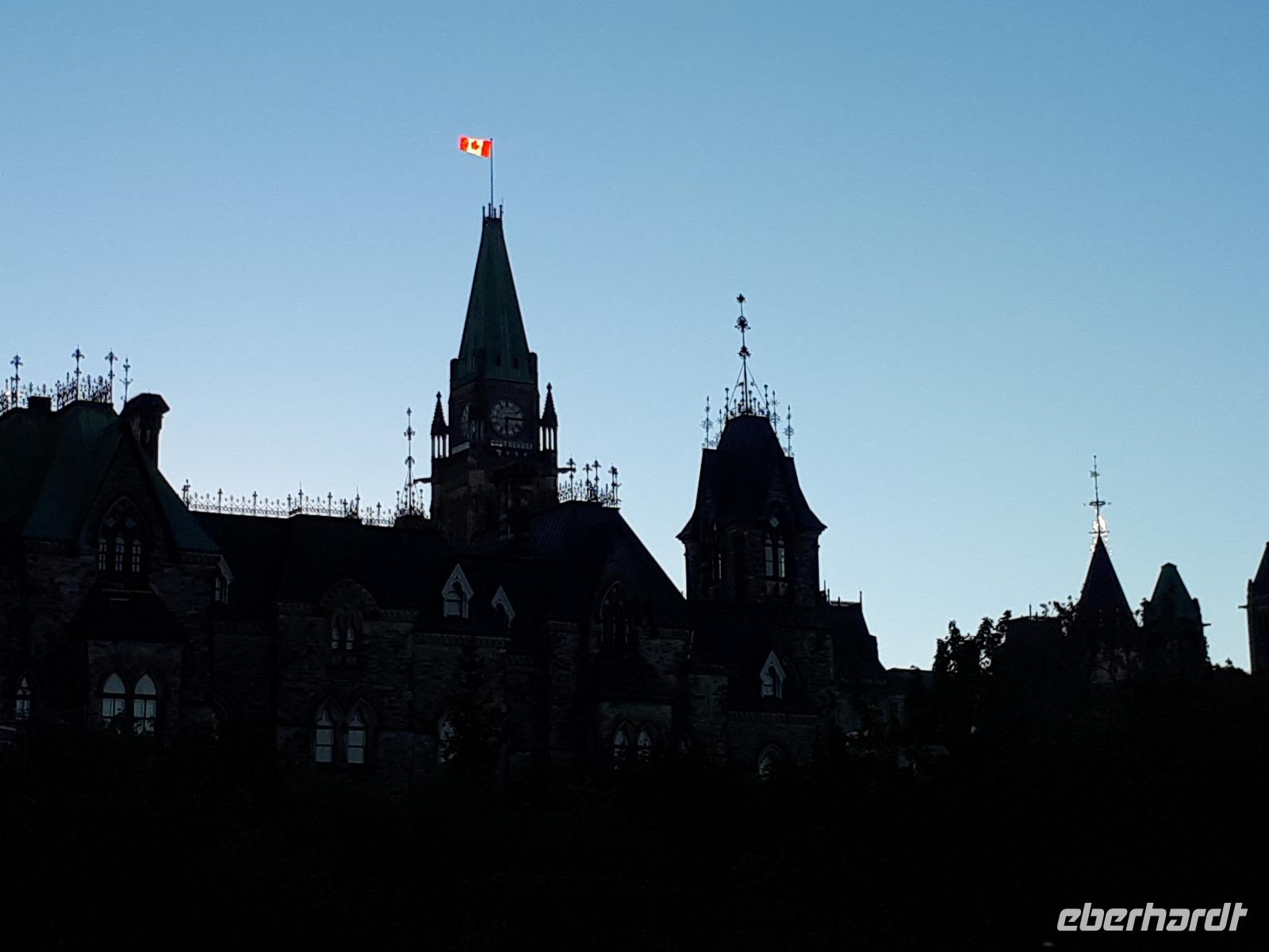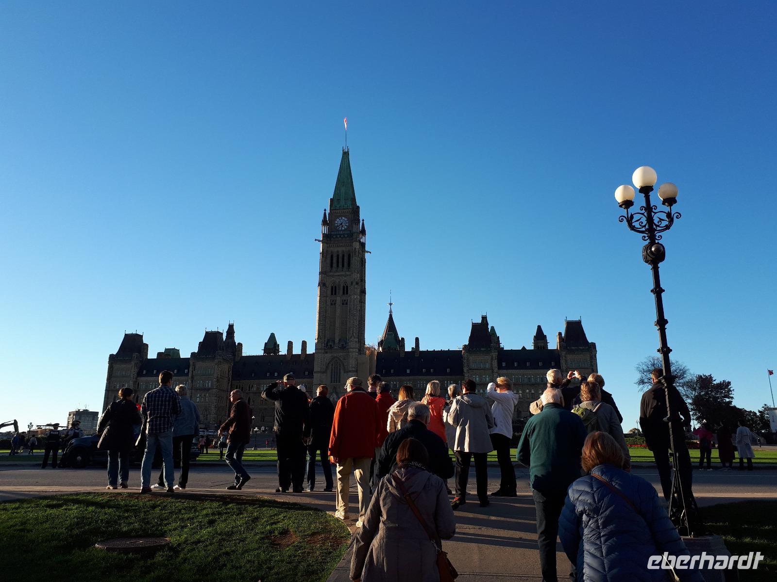 Im Anschluss fuhren wir zu dem unweit entfernten Logging Trail. Während wir auf dem Weg der Holzfäller schlenderten, erzählte uns Christine, wie in früherer Zeit gelebt und vor allem das Holz bearbeitet wurde. Die Bäume wurden damals während des kalten Winters gefällt und im Frühjahr mit der Schneeschmelze auf dem Wasserweg nach Ottawa bzw. Montréal gebracht. Ottawa war auch unser nächstes Ziel, welches wir nach einer langen Fahrt erreichten. Wir erreichten die kanadische Hauptstadt in der Rush Hour, sodass wir unsere Stadtrundfahrt im Viertel der Botschaften beendeten und zum Hotel fuhren. Nach einer kleinen Auszeit unternahmen wir einen Spaziergang in der Innenstadt um das Parlamentsgebäude und durch den Major´s Hill Park, sahen prächtige Gebäude im viktorianischen Stil wie das Hotel Château Laurier und überquerten eine der acht Schleusen des Rideau-Kanals. Der Kanal verbindet den Fluss mit dem Lake Ontario und im Winter ist er die größte natürlichste gefrorene Eislaufbahn der Welt. Unser Bummel führte uns weiter vorbei an der Nationalgalerie und der Kathedralbasilika Notre Dame in das lebhafte Viertel ByWard Market, welches zu den ältesten Vierteln Ottawas gehört und nach Oberstleutnant John By genannt wurde. Hier aßen wir im Fish Market zu Abend und wer wollte, konnte anschließend noch das Viertel auf eigene Faust erkunden.