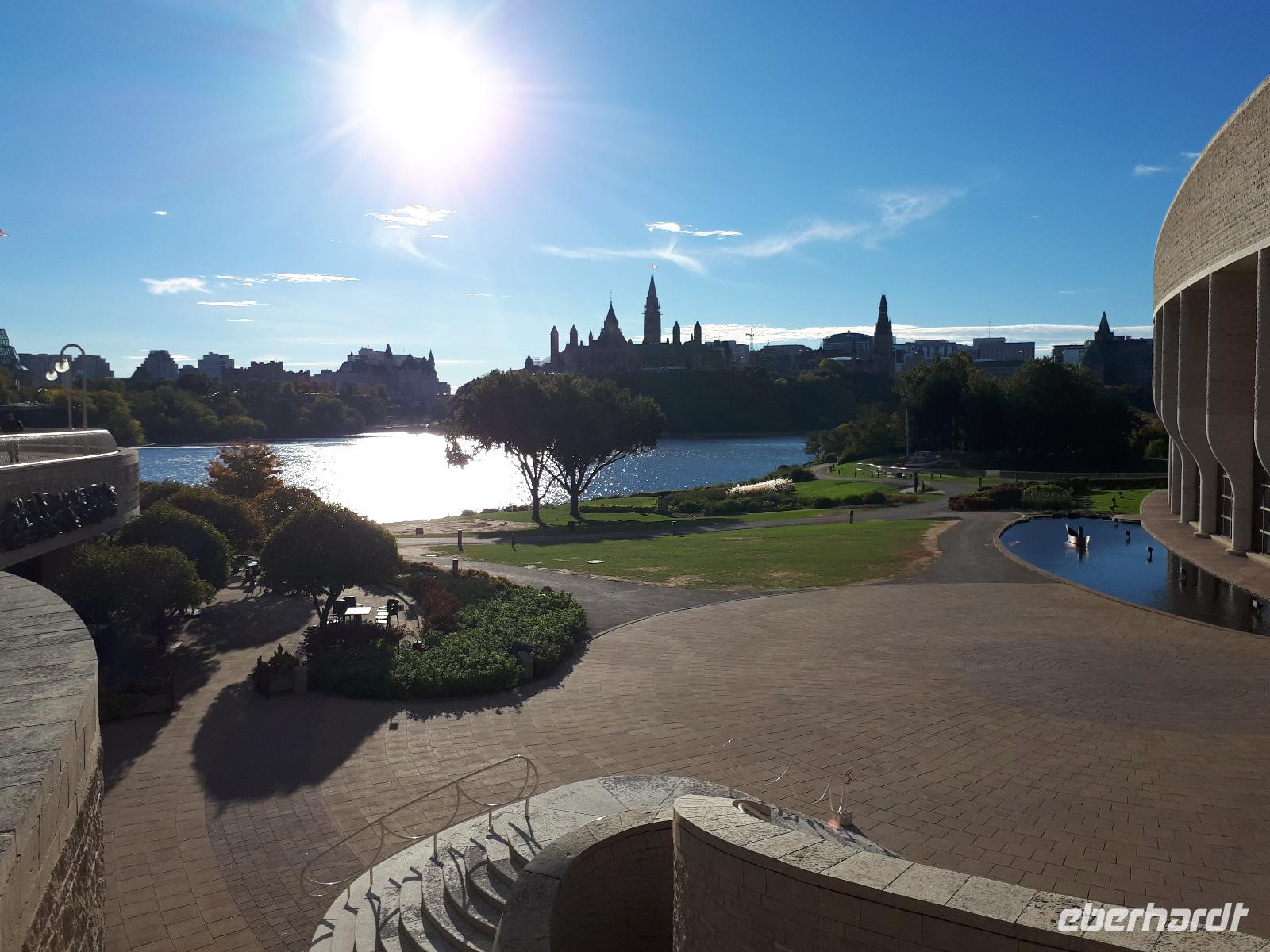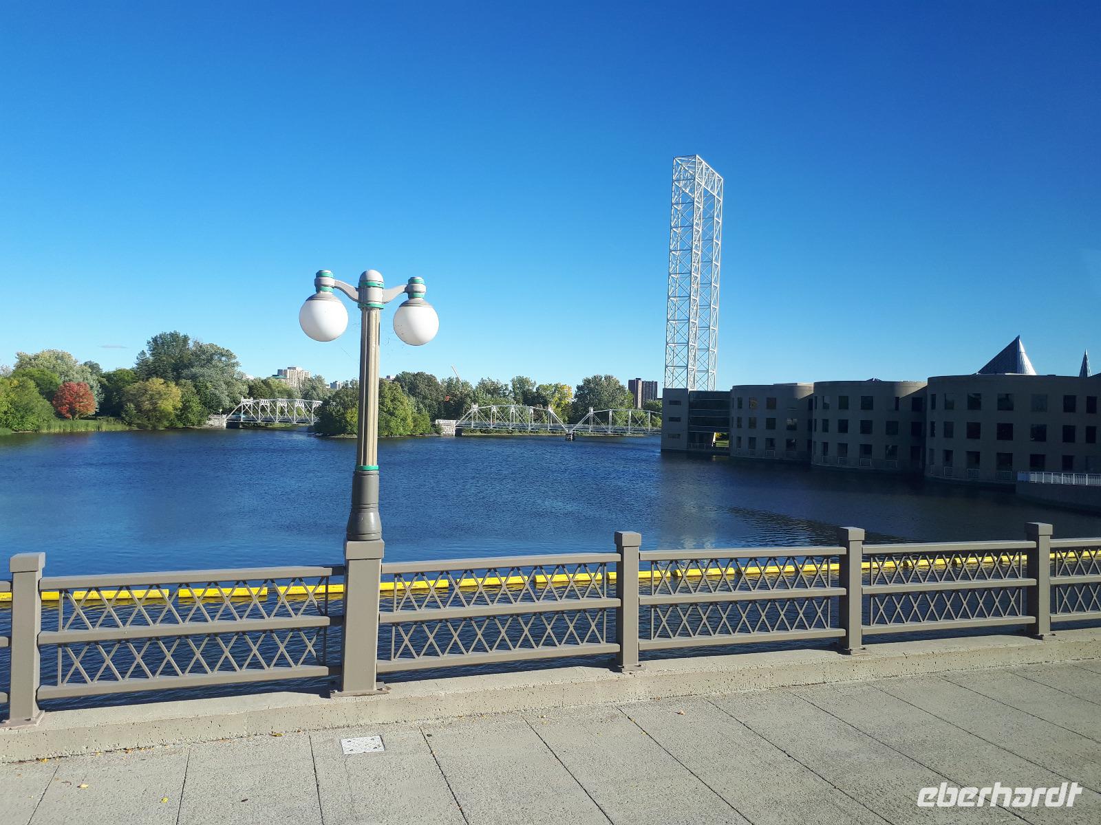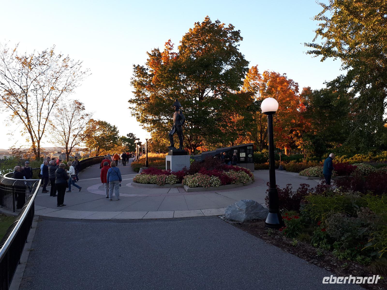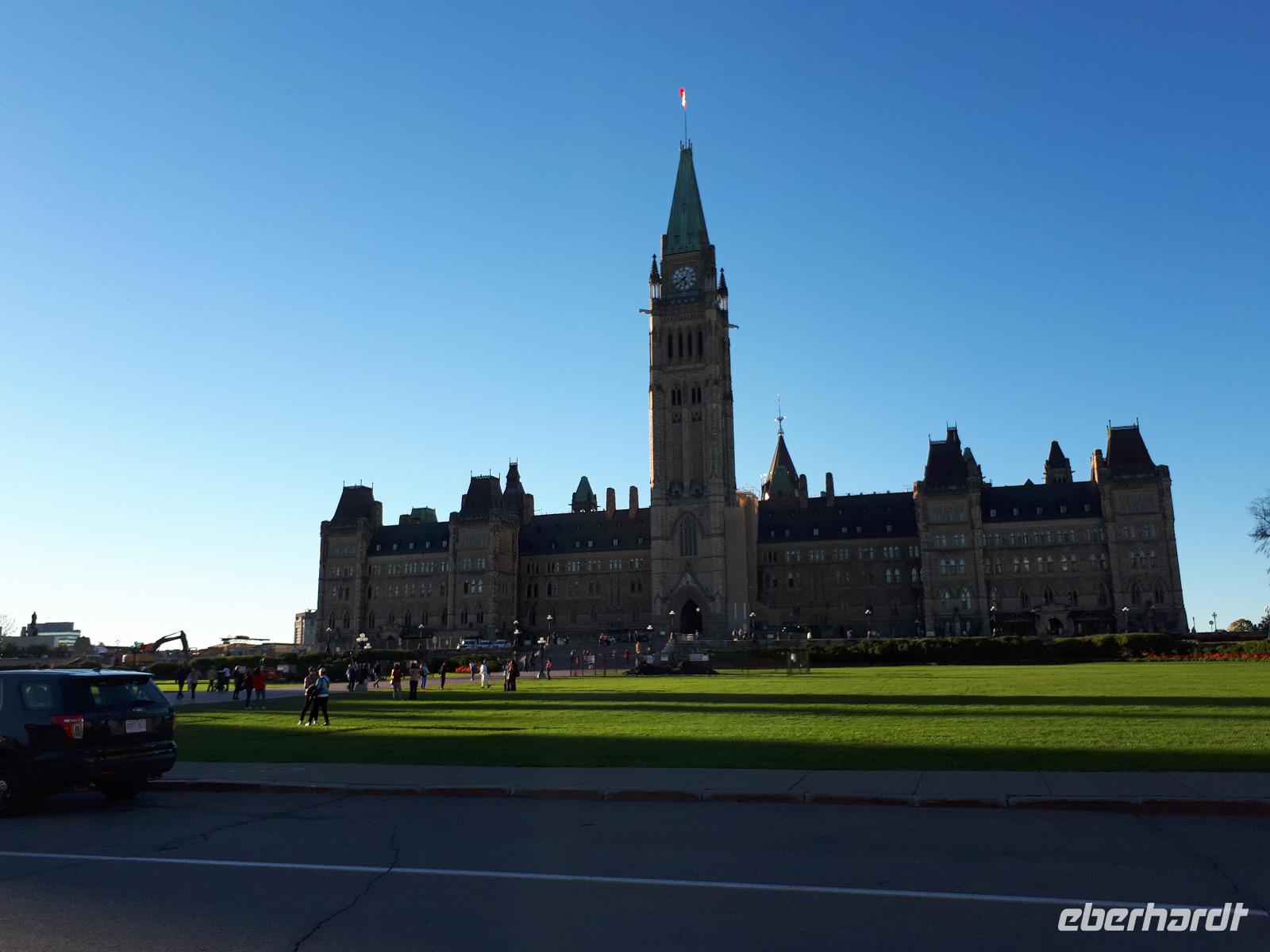 Im Anschluss fuhren wir zu dem unweit entfernten Logging Trail. Während wir auf dem Weg der Holzfäller schlenderten, erzählte uns Christine, wie in früherer Zeit gelebt und vor allem das Holz bearbeitet wurde. Die Bäume wurden damals während des kalten Winters gefällt und im Frühjahr mit der Schneeschmelze auf dem Wasserweg nach Ottawa bzw. Montréal gebracht. Ottawa war auch unser nächstes Ziel, welches wir nach einer langen Fahrt erreichten. Wir erreichten die kanadische Hauptstadt in der Rush Hour, sodass wir unsere Stadtrundfahrt im Viertel der Botschaften beendeten und zum Hotel fuhren. Nach einer kleinen Auszeit unternahmen wir einen Spaziergang in der Innenstadt um das Parlamentsgebäude und durch den Major´s Hill Park, sahen prächtige Gebäude im viktorianischen Stil wie das Hotel Château Laurier und überquerten eine der acht Schleusen des Rideau-Kanals. Der Kanal verbindet den Fluss mit dem Lake Ontario und im Winter ist er die größte natürlichste gefrorene Eislaufbahn der Welt. Unser Bummel führte uns weiter vorbei an der Nationalgalerie und der Kathedralbasilika Notre Dame in das lebhafte Viertel ByWard Market, welches zu den ältesten Vierteln Ottawas gehört und nach Oberstleutnant John By genannt wurde. Hier aßen wir im Fish Market zu Abend und wer wollte, konnte anschließend noch das Viertel auf eigene Faust erkunden.