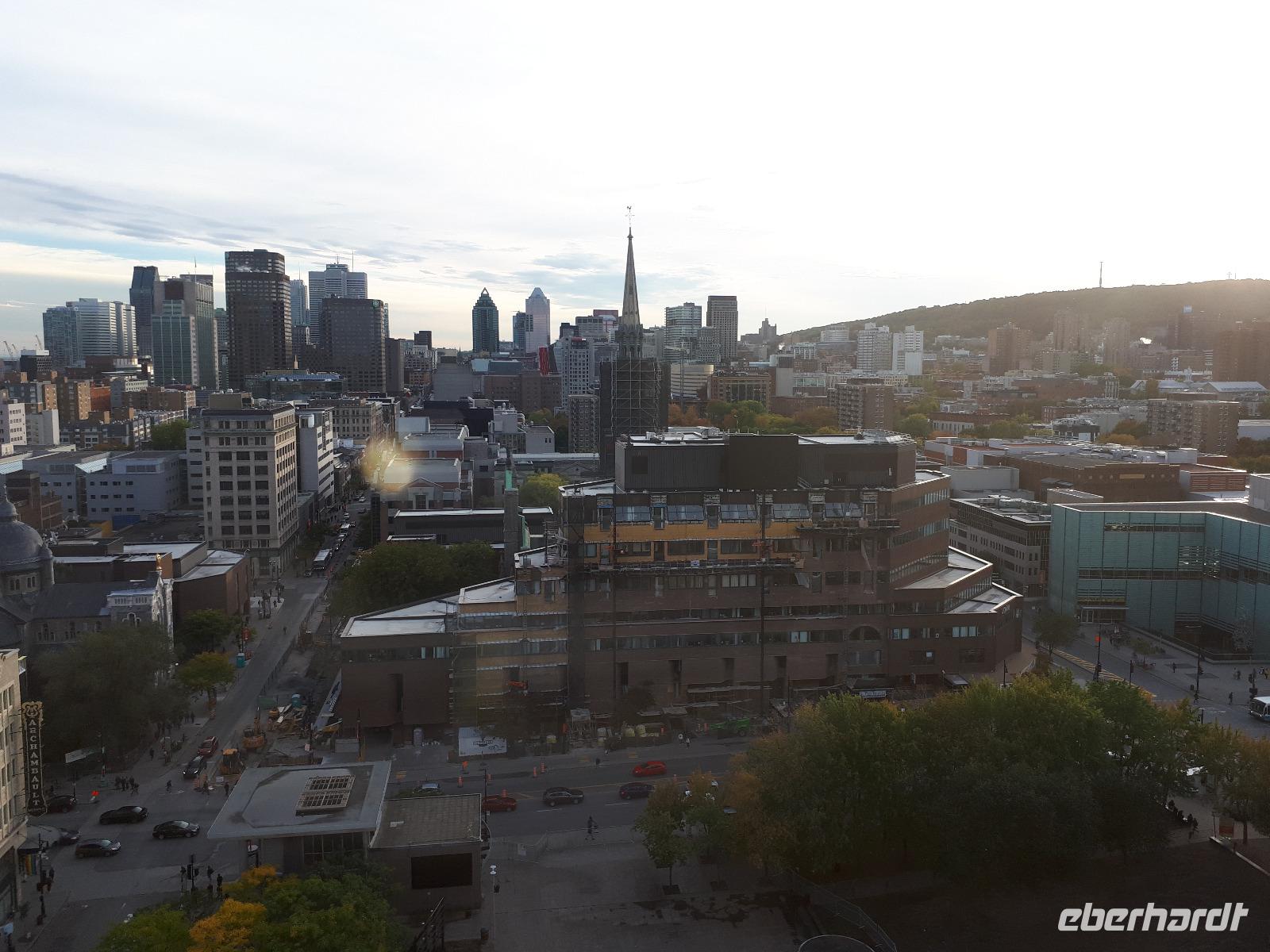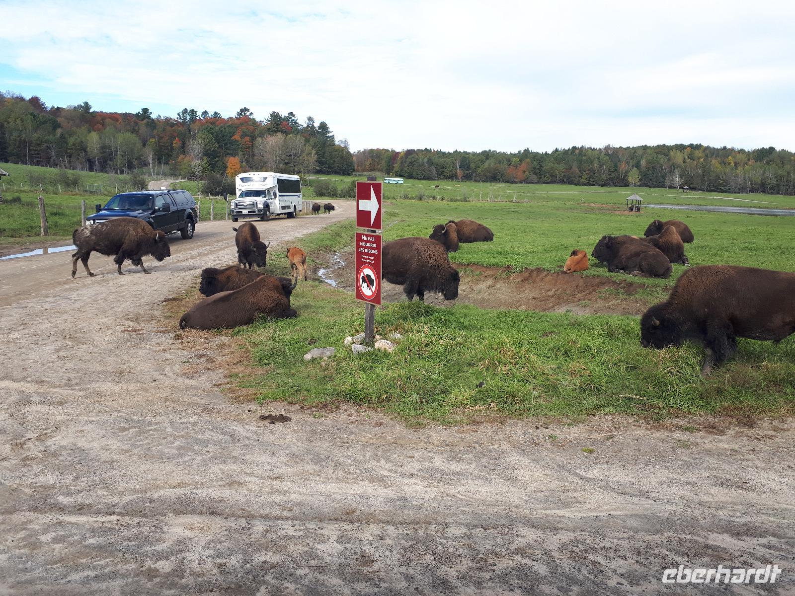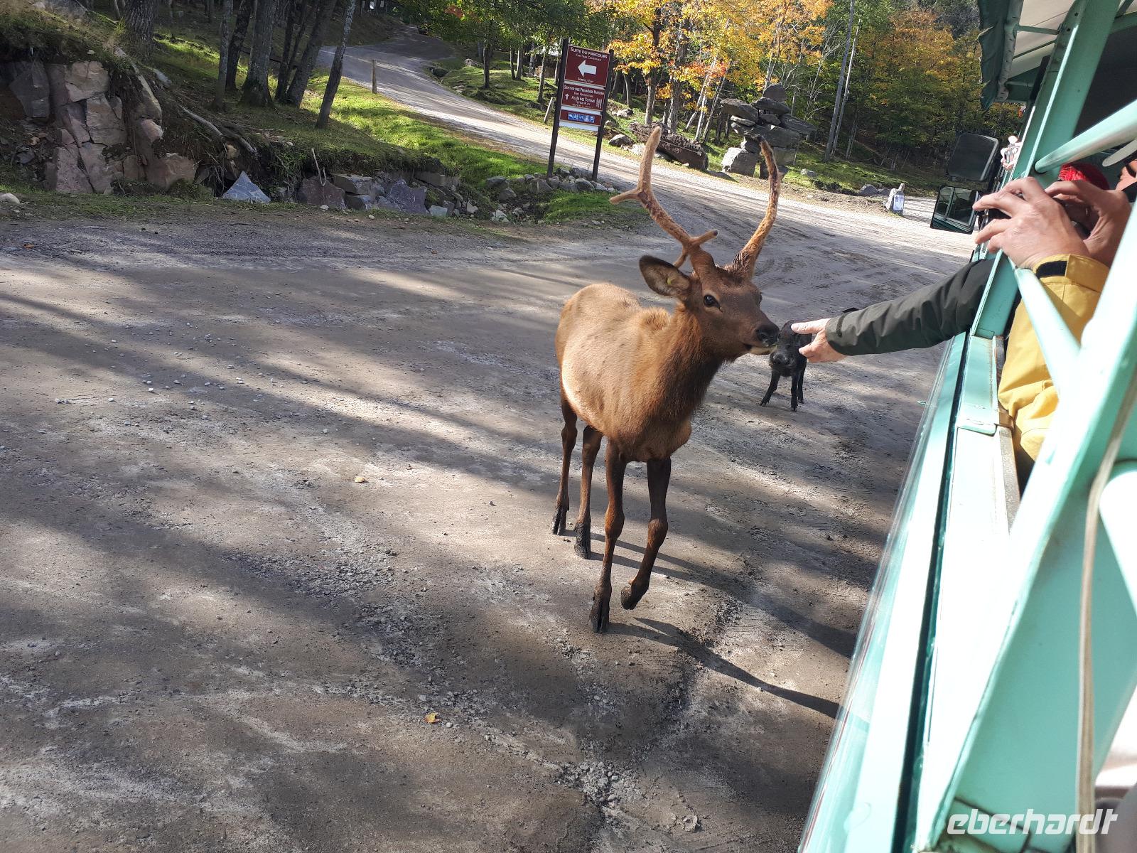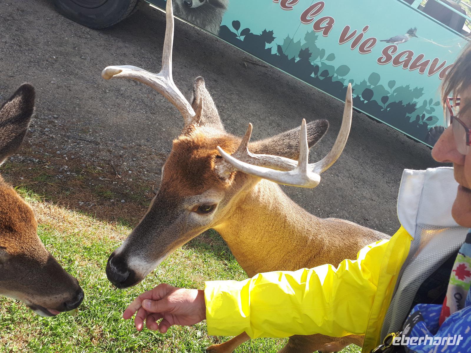 Beim Frühstück hatten wir dafür etwas zu erzählen. Kommt so etwas doch nicht alle Tage vor. Gut gelaunt stiegen wir in unseren Bus und setzten mit Christine und José die vom Vortag abgebrochene Stadtrundfahrt fort. Auf der anderen Seite des Ottawa River in Gatineau (und damit in der Provinz Quebec) hielten wir am außergewöhnlichen Canadian Museum of History, welches die Geschichte der First Nations und der europäischen Besiedelung Kanadas sehr anschaulich darstellt. Im Inneren bewunderten wir die Totempfähle von weitem, welche uns aber trotzdem mit ihrer Größe beeindruckten. Entlang des Rideau-Kanals verließen wir Ottawa und setzten unsere Reise in den Norden fort. Nach ca. einer Stunde erreichten wir den Omega-Tierpark bei Montebello. In diesem privaten Wildpark leben fast alle wichtigen Säugetierarten, die in Kanada heimisch sind. Wir kauften einige Beutel mit Karotten und wechselten unser Gefährt. Der Parkbus hatte offenen Fenster, was uns bessere Bilder und einen tiefen Augenkontakt mit den Tieren erlaubte. Auf unserer Tour sahen wir zahlreiche majestätische Hirsche, Rehe, Wildschweine, einen Elch, Wölfe, Eisfüchse, hungrige Koyoten, Moschusochsen und mächtige Bisons. Am Ende warteten sogar Schwarzbären auf uns (bzw. die vom Fahrer verteilten Leckerbissen). Nachdem wir nun die Tiere gefüttert hatten, wollten wir uns auch um unser eigenen knurrenden Magen kümmern. Ein tolles Mittagsbuffet wartete im mondänen Hotel Fairmont Le Chateau Montebello auf uns. Das im kanadischen Blockhüttenstil errichtete Gebäude mit seinem turmhohen Kamin beeindruckte uns schon ein wenig. Nach dem guten Essen kam uns die folgende zweistündige Fahrt nach Montreal nur entgegen. Sicher fuhr uns José in die Metropole zum Hotel in der Innenstadt. Wir alle hatten Zimmer mit einem tollen Ausblick auf die größte Stadt der Region Quebec. Zum individuellen Abendessen schlenderten wir gemeinsam mit Christine in die Altstadt und erkundeten anschließend die beleuchteten Straßen.