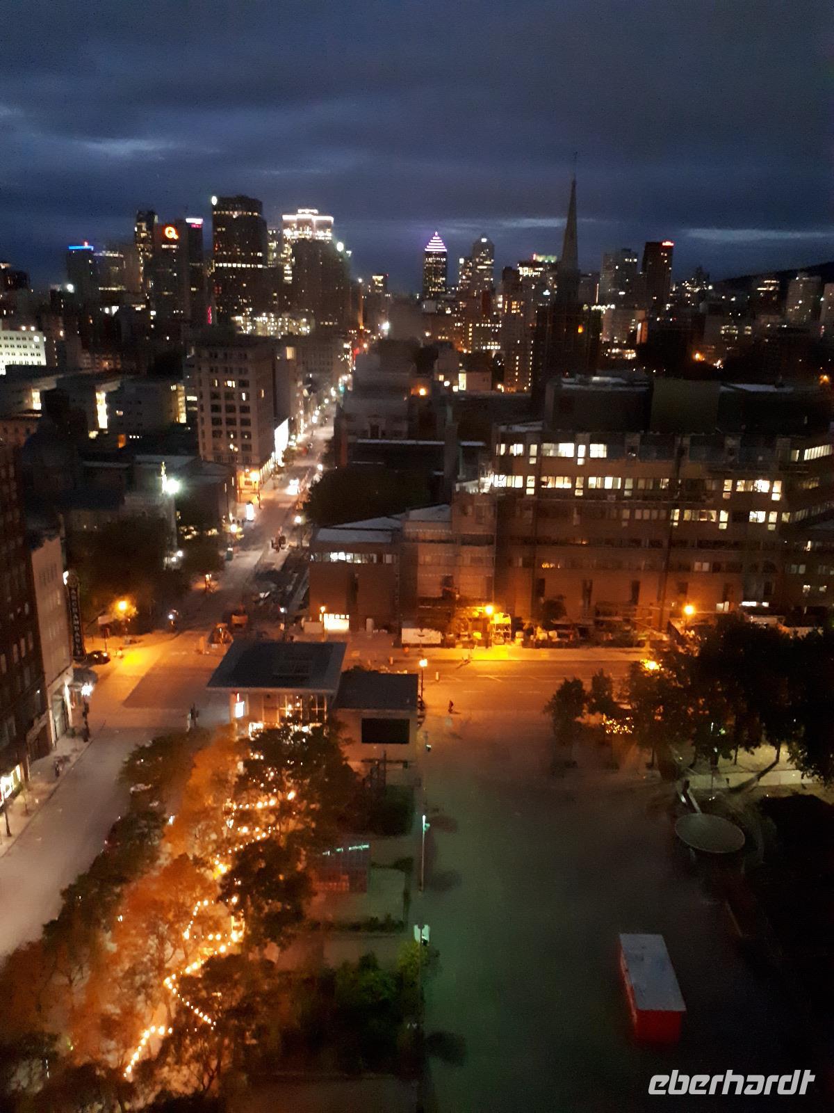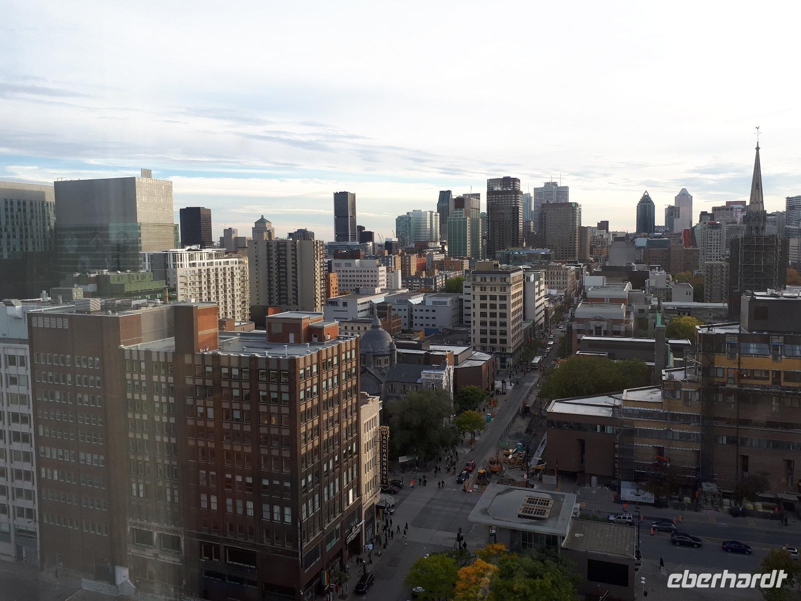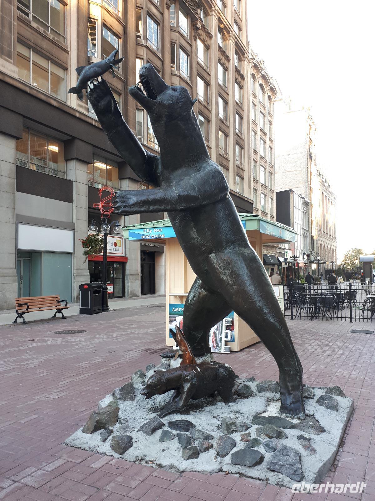 Beim Frühstück hatten wir dafür etwas zu erzählen. Kommt so etwas doch nicht alle Tage vor. Gut gelaunt stiegen wir in unseren Bus und setzten mit Christine und José die vom Vortag abgebrochene Stadtrundfahrt fort. Auf der anderen Seite des Ottawa River in Gatineau (und damit in der Provinz Quebec) hielten wir am außergewöhnlichen Canadian Museum of History, welches die Geschichte der First Nations und der europäischen Besiedelung Kanadas sehr anschaulich darstellt. Im Inneren bewunderten wir die Totempfähle von weitem, welche uns aber trotzdem mit ihrer Größe beeindruckten. Entlang des Rideau-Kanals verließen wir Ottawa und setzten unsere Reise in den Norden fort. Nach ca. einer Stunde erreichten wir den Omega-Tierpark bei Montebello. In diesem privaten Wildpark leben fast alle wichtigen Säugetierarten, die in Kanada heimisch sind. Wir kauften einige Beutel mit Karotten und wechselten unser Gefährt. Der Parkbus hatte offenen Fenster, was uns bessere Bilder und einen tiefen Augenkontakt mit den Tieren erlaubte. Auf unserer Tour sahen wir zahlreiche majestätische Hirsche, Rehe, Wildschweine, einen Elch, Wölfe, Eisfüchse, hungrige Koyoten, Moschusochsen und mächtige Bisons. Am Ende warteten sogar Schwarzbären auf uns (bzw. die vom Fahrer verteilten Leckerbissen). Nachdem wir nun die Tiere gefüttert hatten, wollten wir uns auch um unser eigenen knurrenden Magen kümmern. Ein tolles Mittagsbuffet wartete im mondänen Hotel Fairmont Le Chateau Montebello auf uns. Das im kanadischen Blockhüttenstil errichtete Gebäude mit seinem turmhohen Kamin beeindruckte uns schon ein wenig. Nach dem guten Essen kam uns die folgende zweistündige Fahrt nach Montreal nur entgegen. Sicher fuhr uns José in die Metropole zum Hotel in der Innenstadt. Wir alle hatten Zimmer mit einem tollen Ausblick auf die größte Stadt der Region Quebec. Zum individuellen Abendessen schlenderten wir gemeinsam mit Christine in die Altstadt und erkundeten anschließend die beleuchteten Straßen.