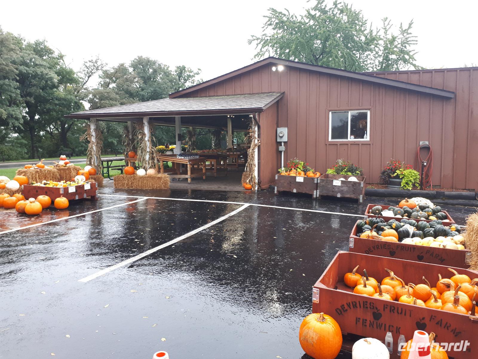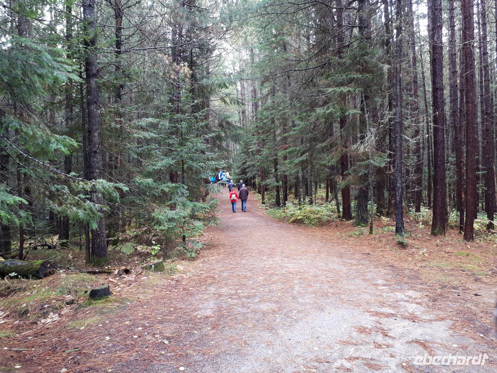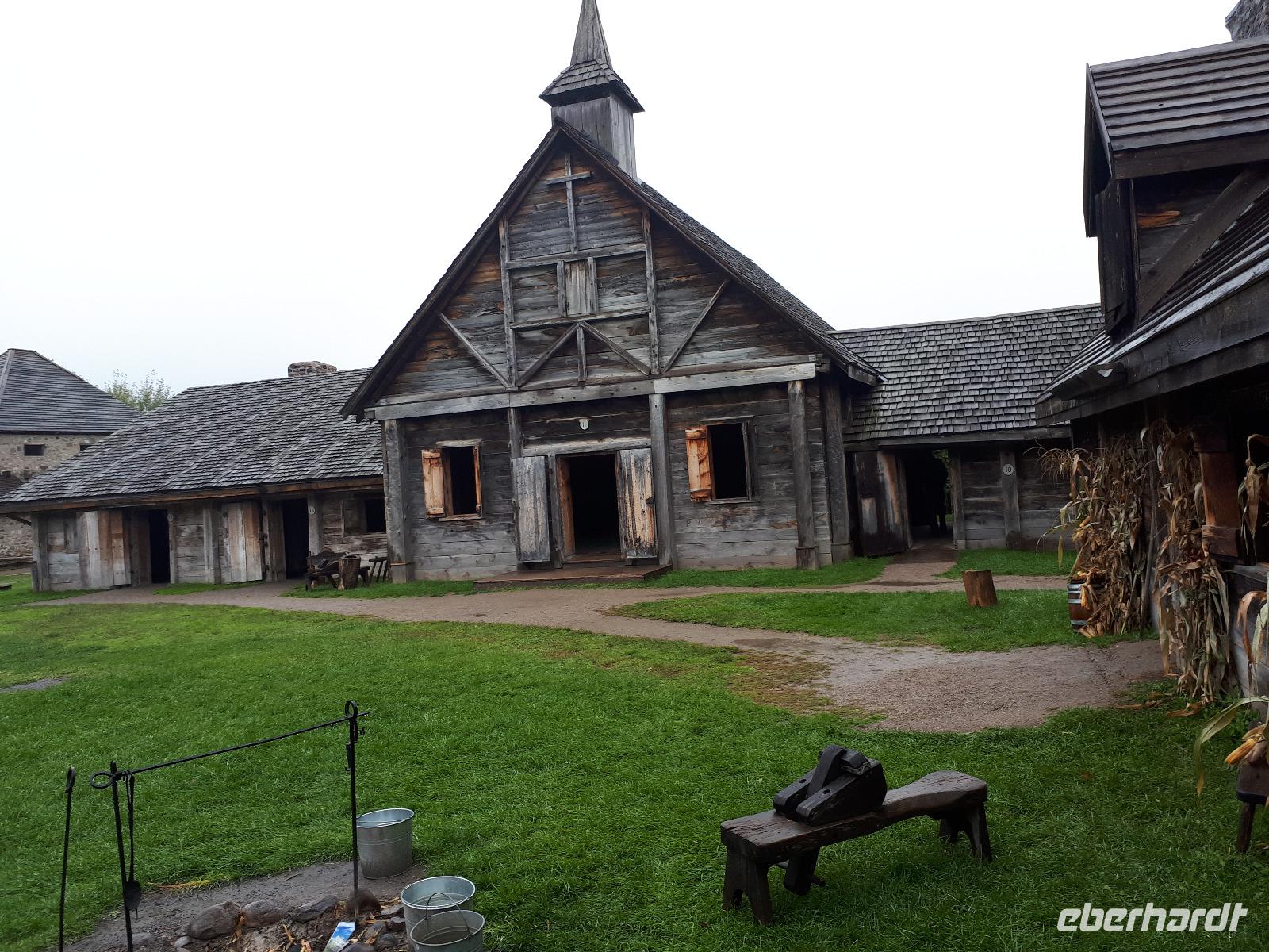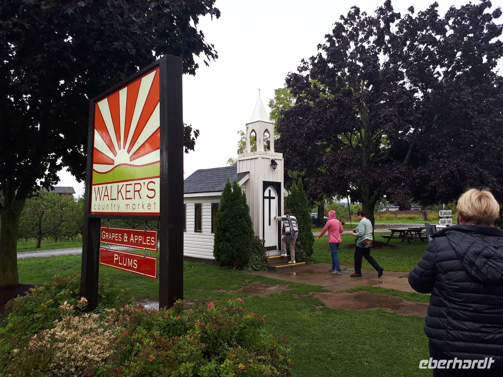 Leider erwartete uns am heutigen Tag verregnetes Wetter. Gut, dass wir schon am Vortag die Bootstour zu den Fällen unternommen hatten. Wir starteten vorbei an den Stromschnellen, dem berühmten Wasserkraftwerk und der größten weltweiten Blumenuhr Richtung Niagara on the Lakes. Unterwegs stoppten wir an der wohl kleinsten Kapelle der Welt, der Living Water Wayside Kapelle und durchfuhren schließlich das kleine süße Städtchen. Diese Region ist ebenfalls für seinen Eiswein bekannt. Neben den Provinzen Quebec, Nova Scotia und British Columbia verfügt nur Ontario über die nötigen Wetterbedingungen, unter denen die Trauben direkt am Weinstock einfrieren können. Dieses exklusive Getränk wollten wir nun auch probieren und so hielten wir spontan an einer Kelterei und ließen uns die angebotenen Köstlichkeiten schmecken. Nach einem weiteren Stopp in einem Shop für alle nur denkbaren Erdnuss-Variationen setzten wir unsere Fahrt in den Norden nach Sainte-Marie among the Hurons fort. Diese historische Festung war im 17. Jahrhundert das Hauptquartier der französischen Jesuiten-Mission und war die erste europäische Gemeinschaft Ontarios. Wir spazierten durch das ehemalige Missions-Dorf und konnten uns anschaulich vorstellen, wie die Franzosen mit den Wendat-Indianern zusammenlebten. Am Abend erreichten wir unser Hotel in Huntsville direkt am Lake Peninsula.