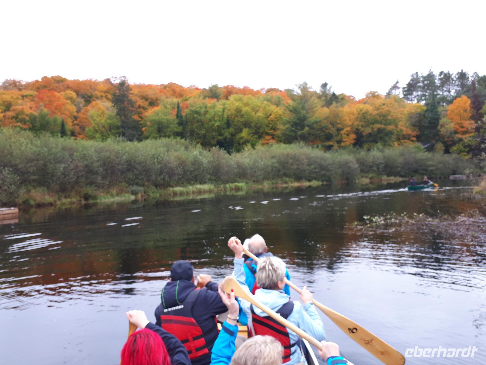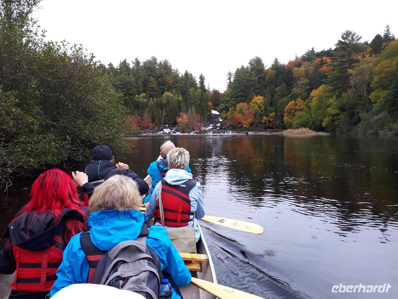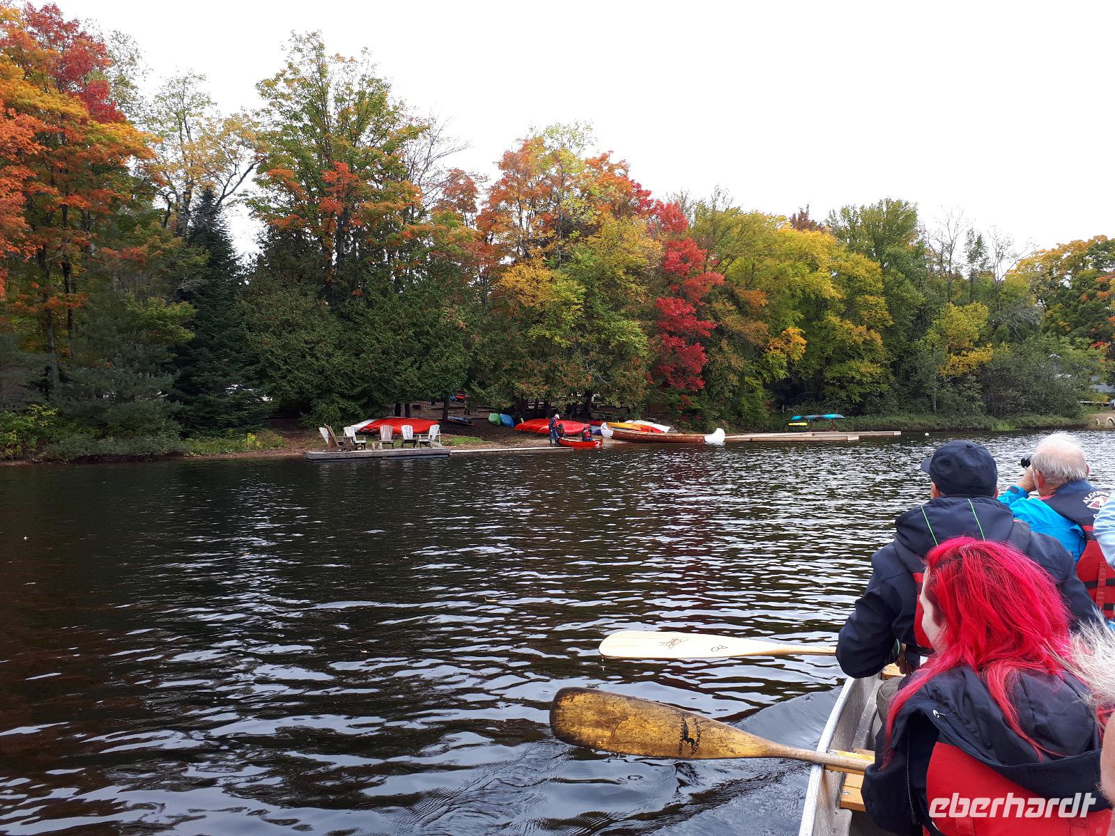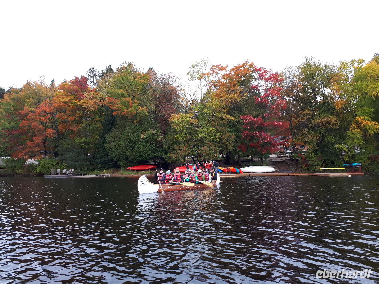 Ausgestattet mit drei Guides und originalgetreuen Nachbauten der Voyageur-Kanus fuhren wir wie die ehemaligen kanadischen Pelzhändler hinaus auf den Oxtongue-See. Wunderschöne Holzvillen mit Stegen im Wasser, kleine Inseln, Biberbauten und die sich mehr und mehr färbende Natur zogen an uns vorbei. Wir waren verzaubert. Nach ungefähr 4 Kilometern erreichten wir einen kleinen Wasserfall, stiegen abenteuerlustig aus und wanderten bis zum oberen Ende des Wasserfalls. Das tosende Wasser rauschte an uns vorbei und jeder versuchte, das für ihn perfekte Foto oder Selfie zu schießen. In unseren Kanus fuhren wir die Route durch die tolle Landschaft zum Ausgangsort zurück. Wir bedankten uns bei unseren Guides und entschieden unser Picknick direkt am See auszupacken. Das lodernde Lagerfeuer und die überraschende musikalische Begleitung durch unseren Busfahrer José ließen uns die freie Natur mit dem tollen Blick auf den See genießen. Der Wettergott meinte es gut mit uns ... bis jetzt. Es fing wieder an zu tröpfeln. Nach einem Stopp am Liquor Store und General Store im kleinen Örtchen Dorset, das am Zusammenfluss zweier Seen liegt, fuhren wir durch die Herbstlandschaft zurück nach Huntsville, wo jeder den Nachmittag nach eigenen Wünschen gestalten konnte.