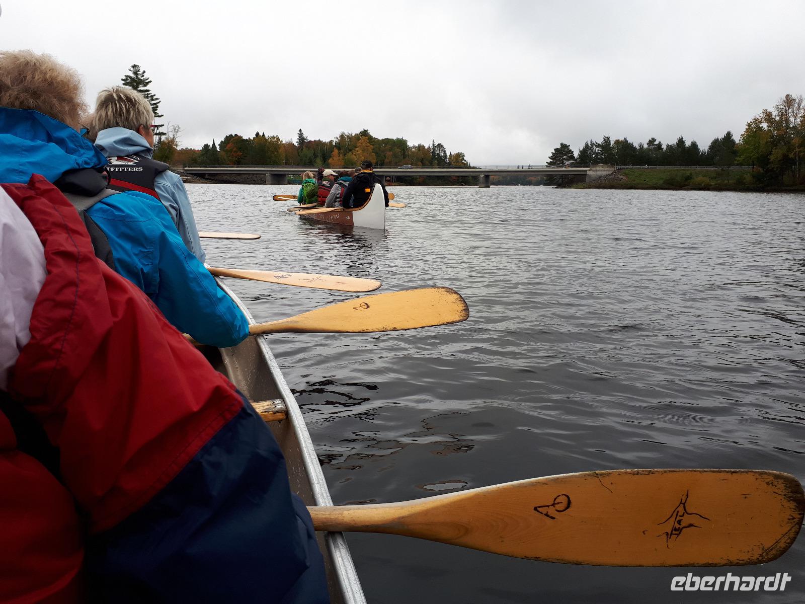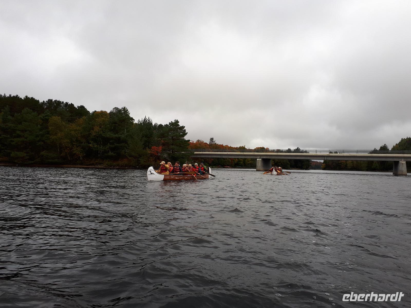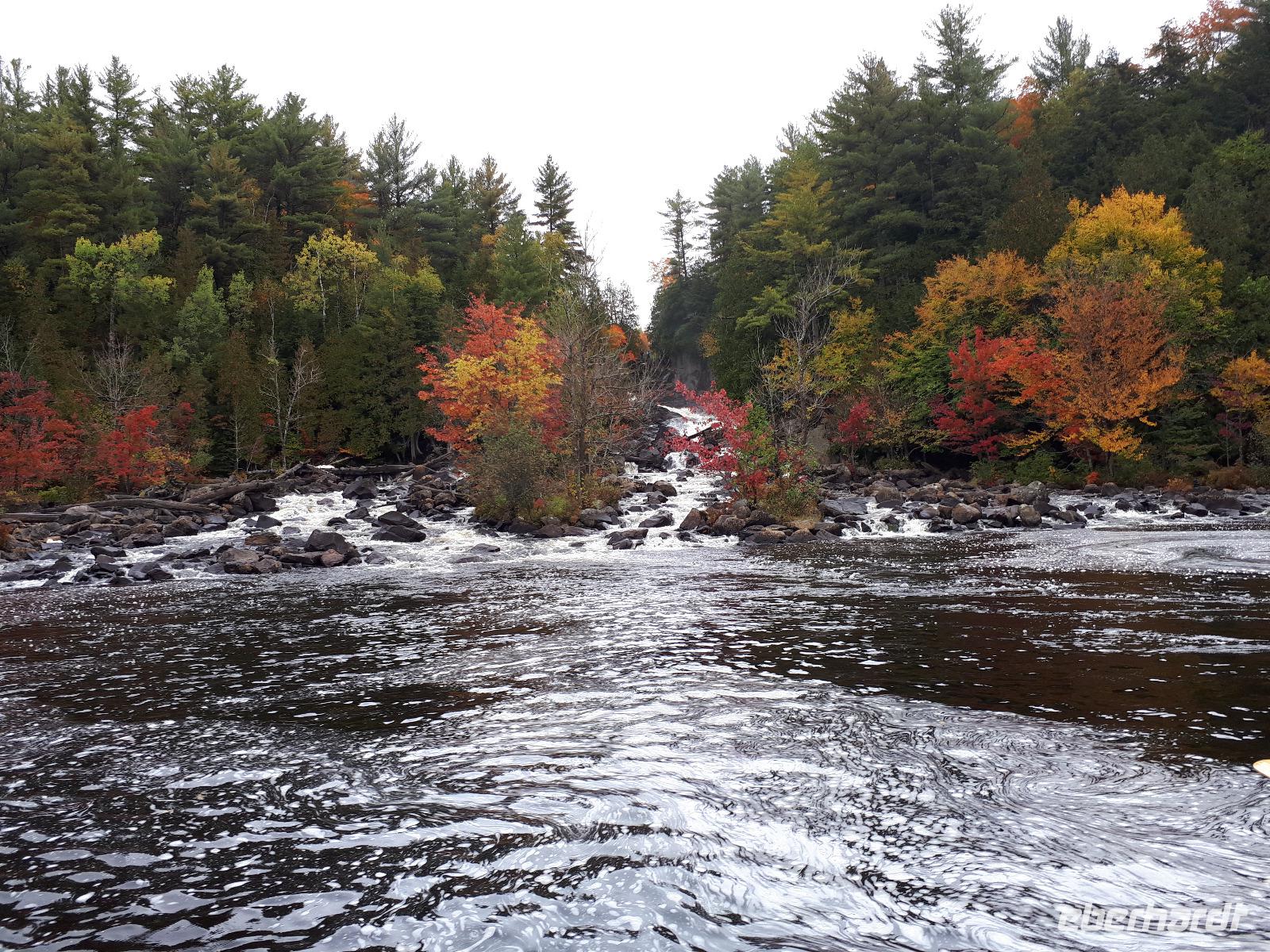 Ausgestattet mit drei Guides und originalgetreuen Nachbauten der Voyageur-Kanus fuhren wir wie die ehemaligen kanadischen Pelzhändler hinaus auf den Oxtongue-See. Wunderschöne Holzvillen mit Stegen im Wasser, kleine Inseln, Biberbauten und die sich mehr und mehr färbende Natur zogen an uns vorbei. Wir waren verzaubert. Nach ungefähr 4 Kilometern erreichten wir einen kleinen Wasserfall, stiegen abenteuerlustig aus und wanderten bis zum oberen Ende des Wasserfalls. Das tosende Wasser rauschte an uns vorbei und jeder versuchte, das für ihn perfekte Foto oder Selfie zu schießen. In unseren Kanus fuhren wir die Route durch die tolle Landschaft zum Ausgangsort zurück. Wir bedankten uns bei unseren Guides und entschieden unser Picknick direkt am See auszupacken. Das lodernde Lagerfeuer und die überraschende musikalische Begleitung durch unseren Busfahrer José ließen uns die freie Natur mit dem tollen Blick auf den See genießen. Der Wettergott meinte es gut mit uns ... bis jetzt. Es fing wieder an zu tröpfeln. Nach einem Stopp am Liquor Store und General Store im kleinen Örtchen Dorset, das am Zusammenfluss zweier Seen liegt, fuhren wir durch die Herbstlandschaft zurück nach Huntsville, wo jeder den Nachmittag nach eigenen Wünschen gestalten konnte.