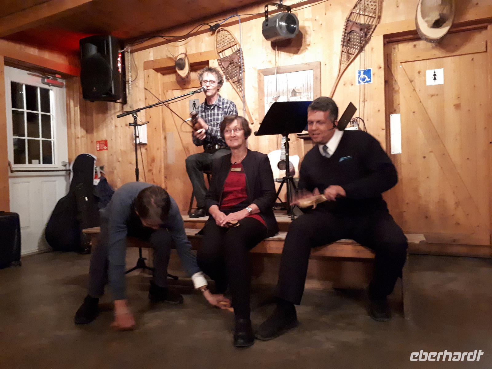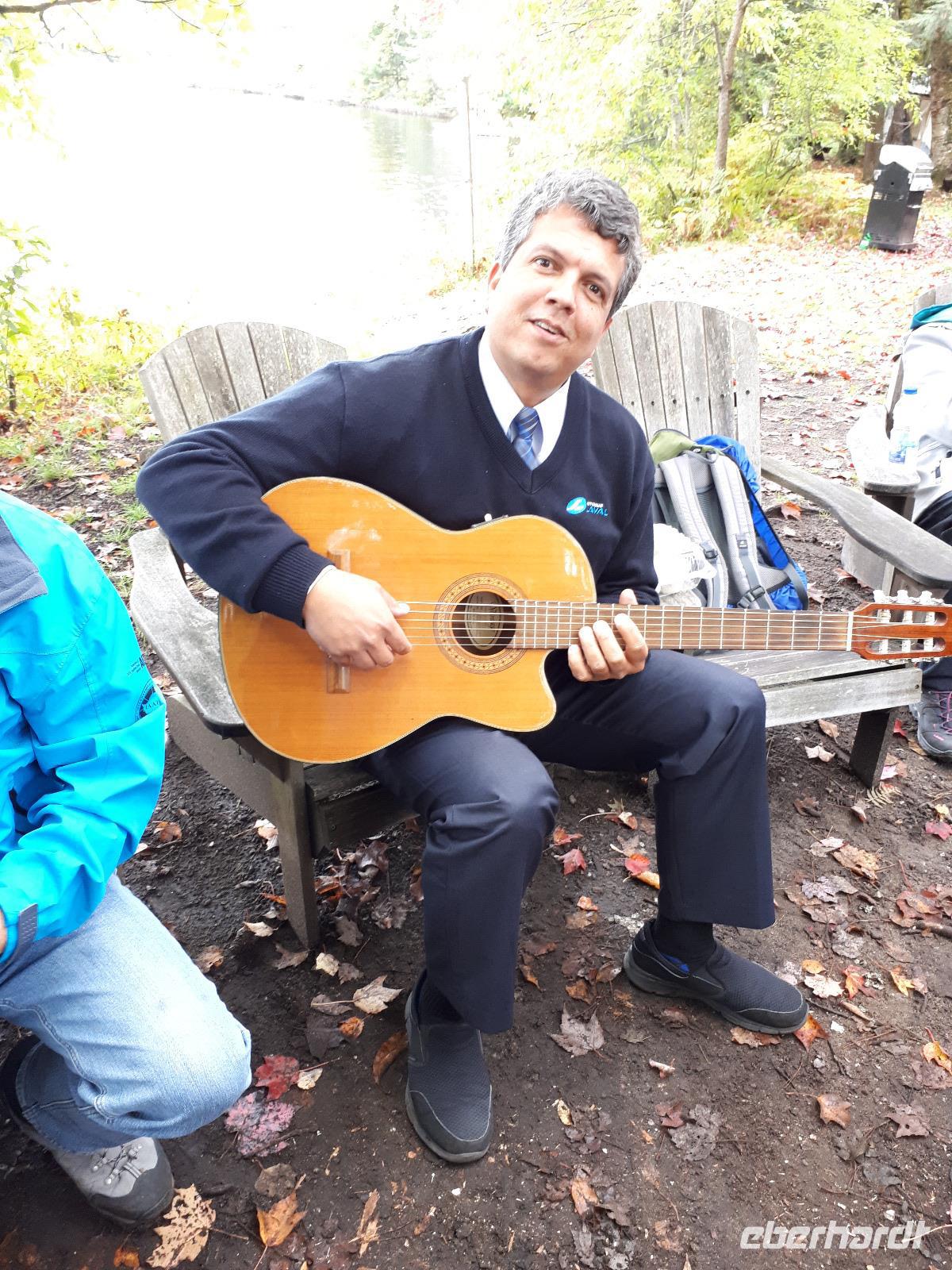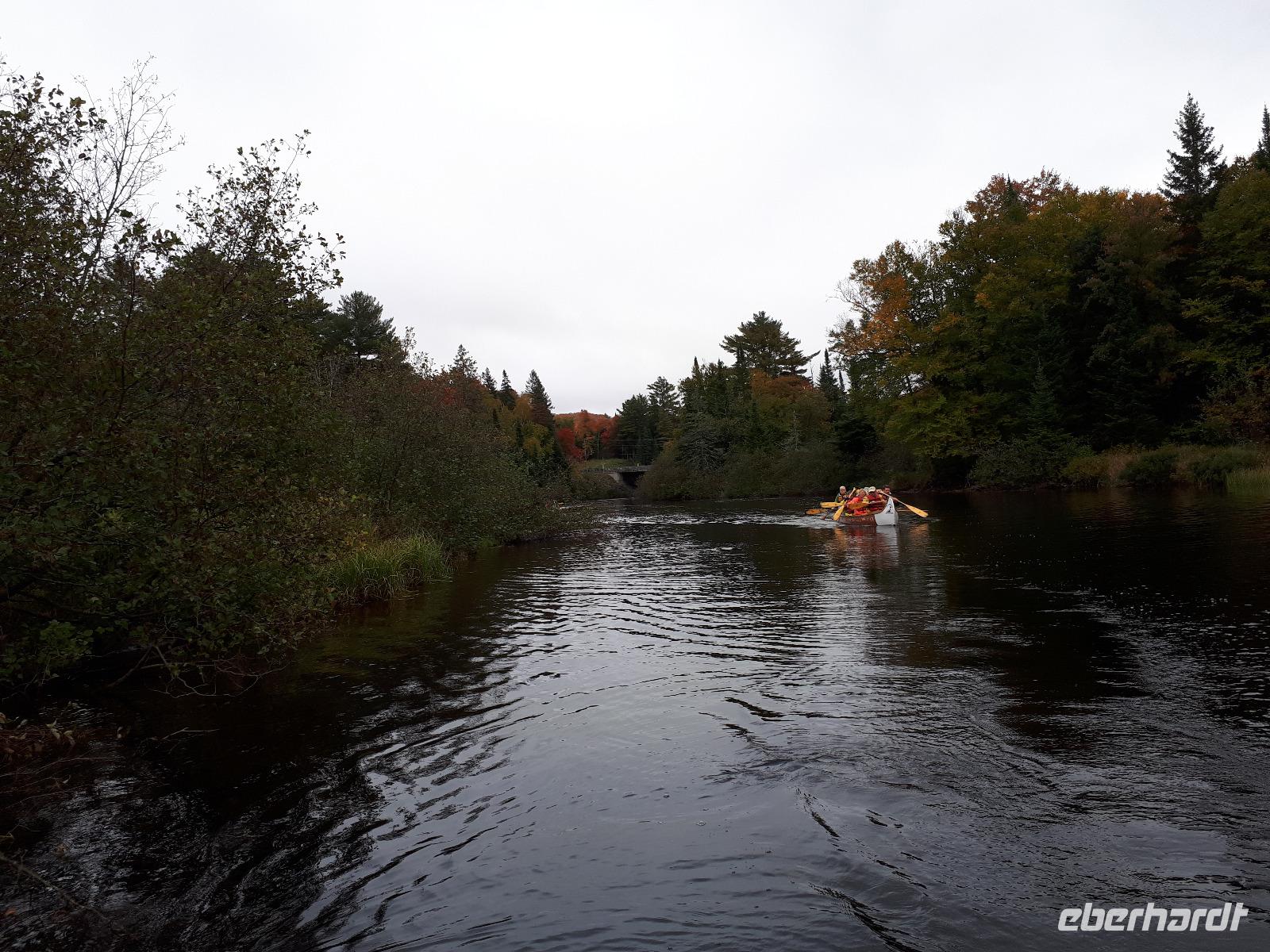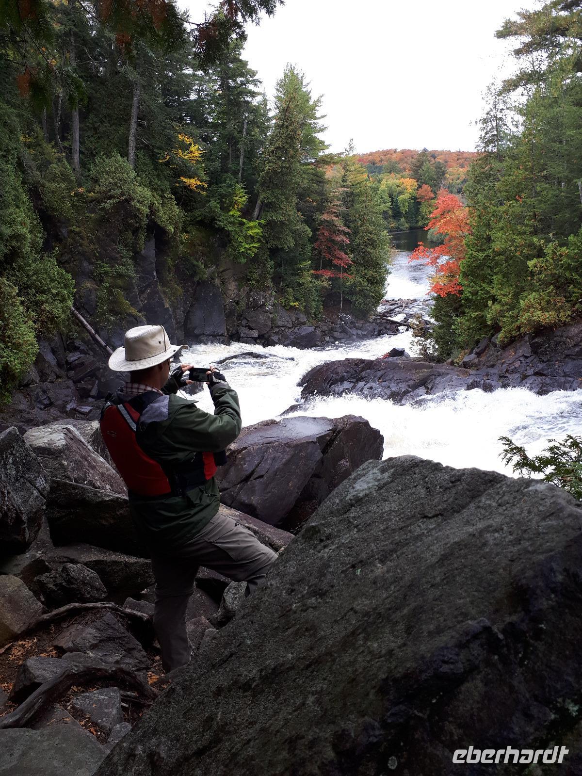 Ausgestattet mit drei Guides und originalgetreuen Nachbauten der Voyageur-Kanus fuhren wir wie die ehemaligen kanadischen Pelzhändler hinaus auf den Oxtongue-See. Wunderschöne Holzvillen mit Stegen im Wasser, kleine Inseln, Biberbauten und die sich mehr und mehr färbende Natur zogen an uns vorbei. Wir waren verzaubert. Nach ungefähr 4 Kilometern erreichten wir einen kleinen Wasserfall, stiegen abenteuerlustig aus und wanderten bis zum oberen Ende des Wasserfalls. Das tosende Wasser rauschte an uns vorbei und jeder versuchte, das für ihn perfekte Foto oder Selfie zu schießen. In unseren Kanus fuhren wir die Route durch die tolle Landschaft zum Ausgangsort zurück. Wir bedankten uns bei unseren Guides und entschieden unser Picknick direkt am See auszupacken. Das lodernde Lagerfeuer und die überraschende musikalische Begleitung durch unseren Busfahrer José ließen uns die freie Natur mit dem tollen Blick auf den See genießen. Der Wettergott meinte es gut mit uns ... bis jetzt. Es fing wieder an zu tröpfeln. Nach einem Stopp am Liquor Store und General Store im kleinen Örtchen Dorset, das am Zusammenfluss zweier Seen liegt, fuhren wir durch die Herbstlandschaft zurück nach Huntsville, wo jeder den Nachmittag nach eigenen Wünschen gestalten konnte.