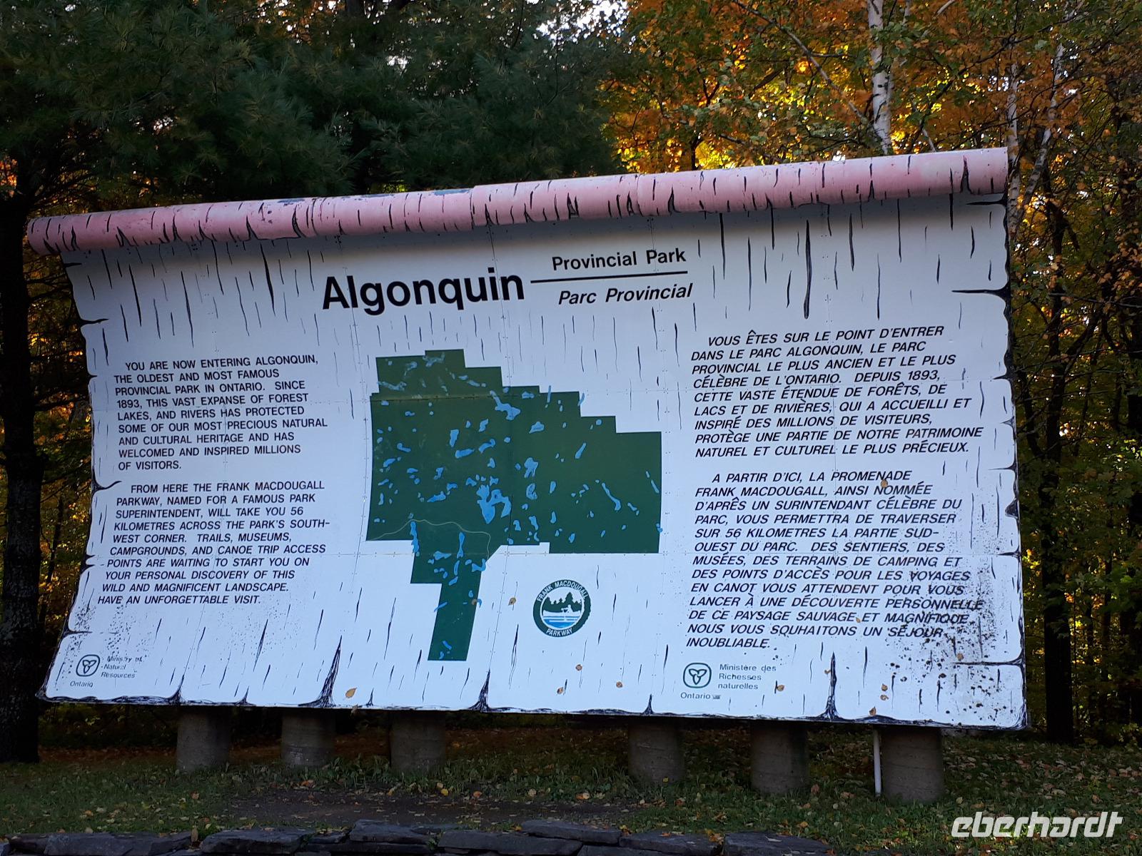 Nach einem guten Frühstück starteten wir mit Datum, Wetter und Spruch des Tages in den Algonquin Provincial Park. Uns erwartete heute eine aktivere Besichtigungs-Form denn wir wollten auf einem der über 2.500 Seen des Parks eine kleine Kanutour erleben. Anders, als vermutet, ist der Algonquin Park kein Nationalpark, aber der größte mit 7.700 Quadratkilometern und zugleich älteste Naturpark Ontarios.
