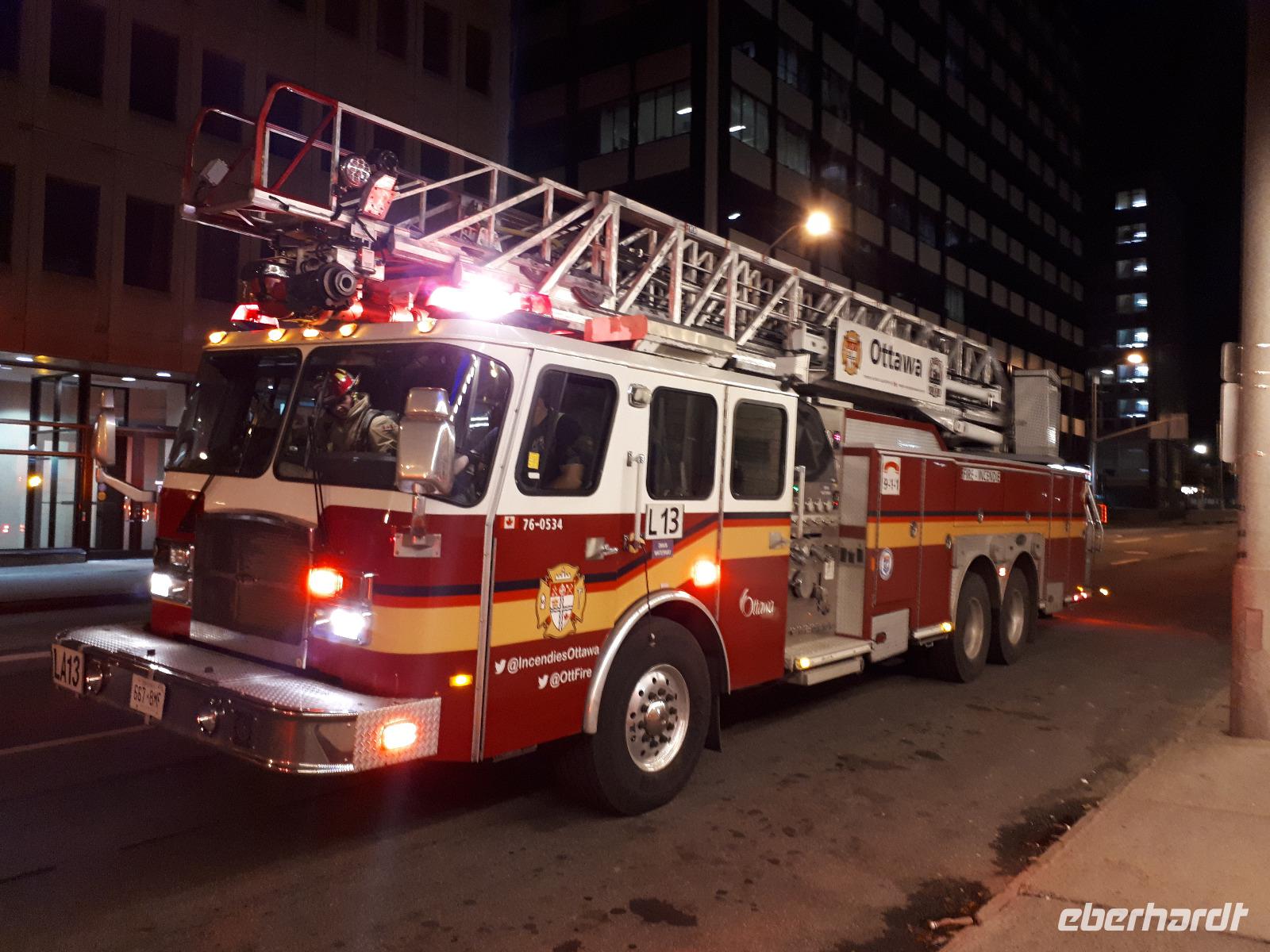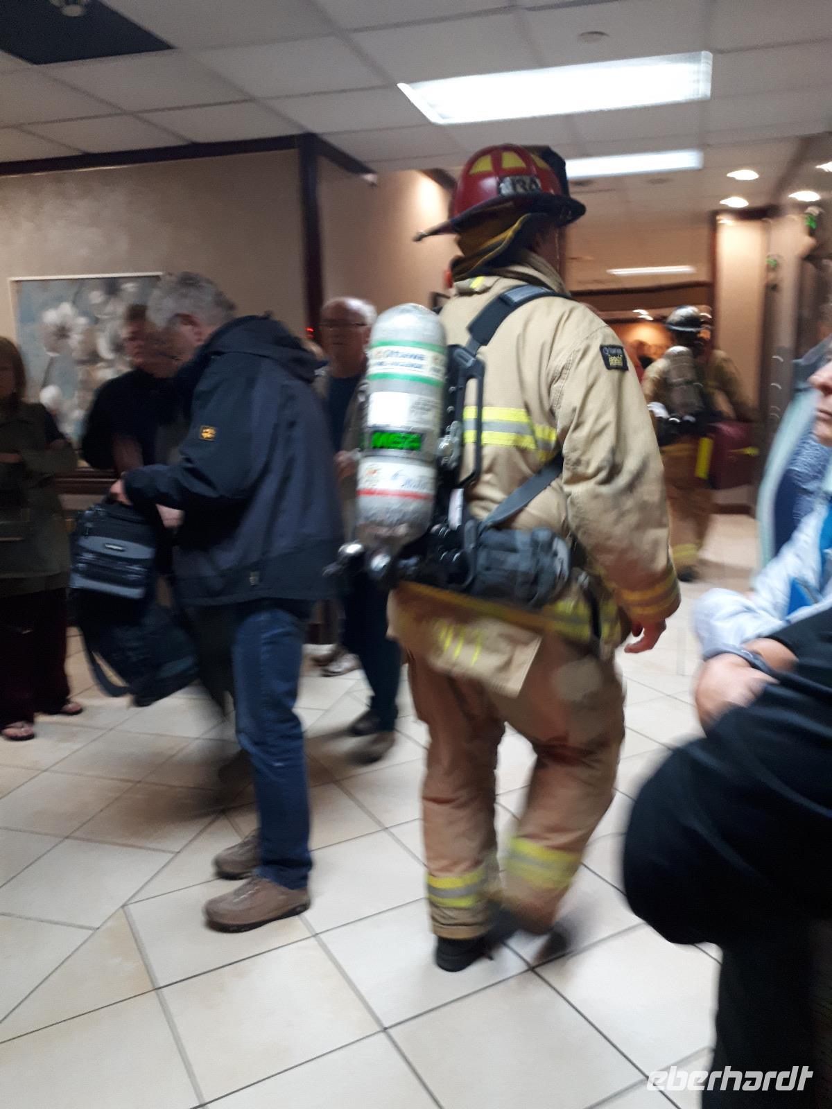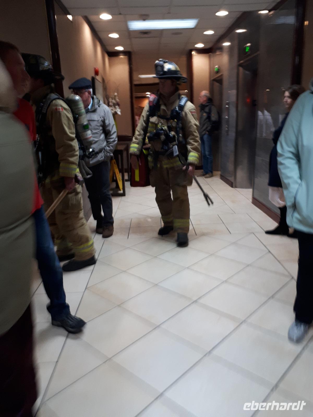 2.30 Uhr nachts wurden wir im Hotel durch den Feueralarm unsanft geweckt. Verschlafen und nur mit dem Nötigsten bekleidet trafen wir uns etwas aufgeregt in der Hotellobby, die kanadische Feuerwehr war bereits vor Ort und untersuchte das Hotel nach der Alarmursache. Schnell stellte sich heraus, dass es falscher Alarm war, so konnten die Hotelgäste wieder in ihre Betten verschwinden.