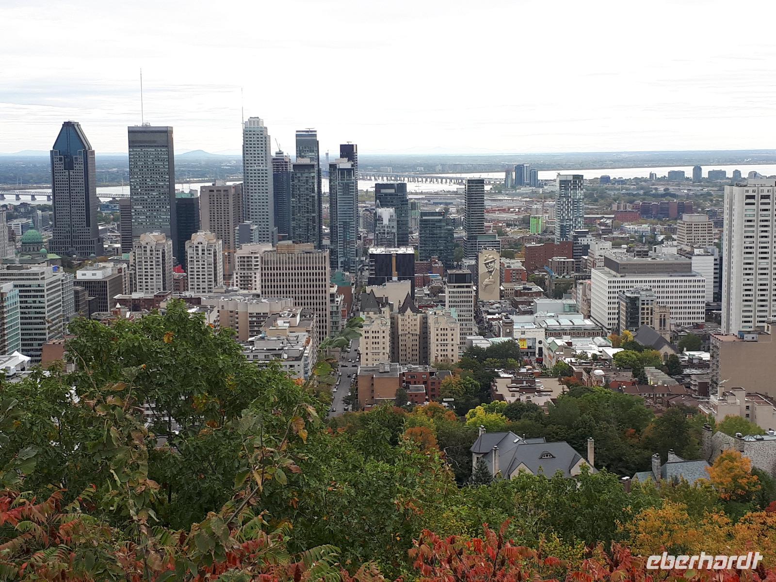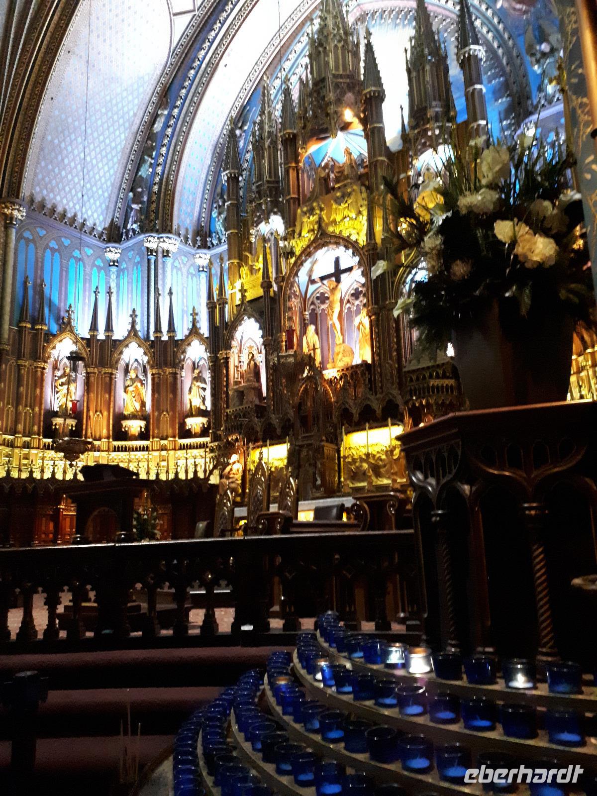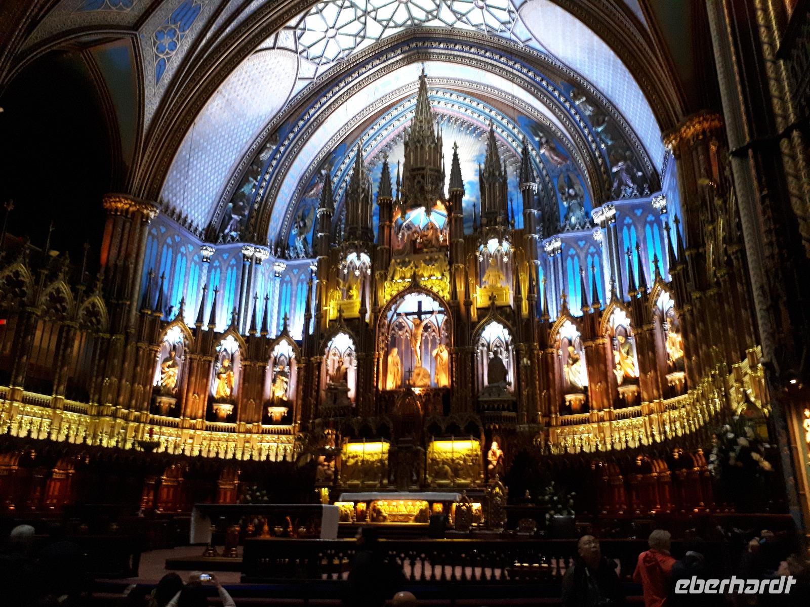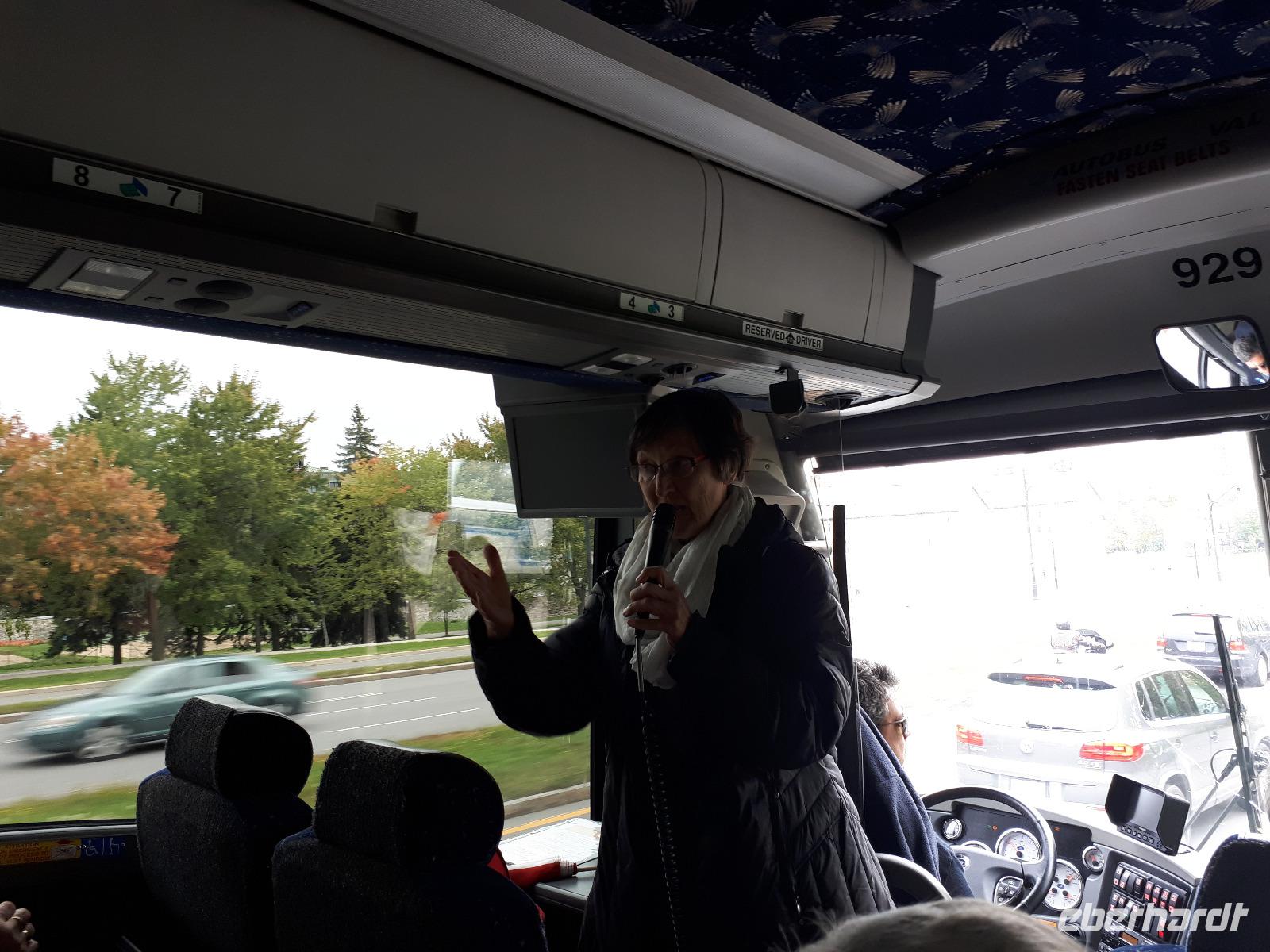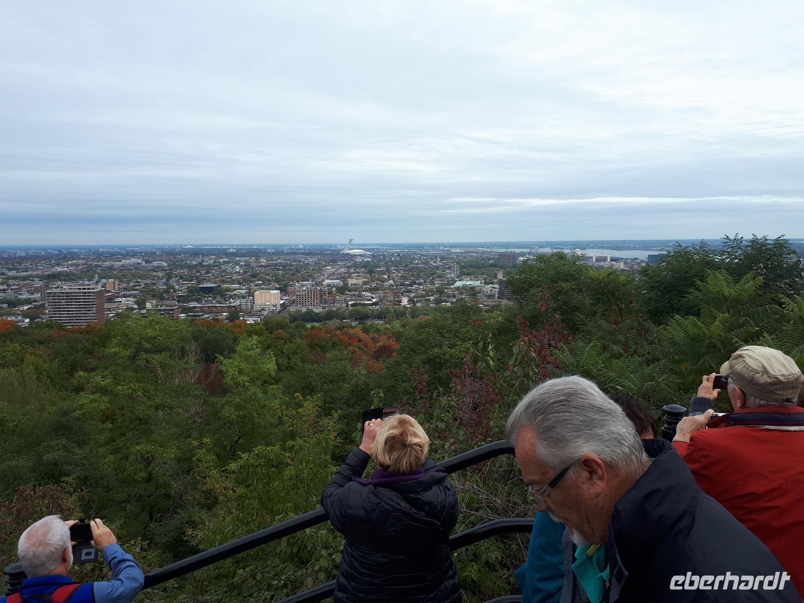 Am Morgen trafen wir auf unsere Stadtführerin Celine, welche seit 30 Jahren in Montreal lebt und uns heute ihre Stadt zeigen wollte. Unser erstes Ziel der Millionenstadt war der Parc Jean-Drapeau, welcher sich aus den Inseln Île Sainte-Hélène und Île Notre-Dame zusammensetzt und in der Mitte des Sankt-Lorenz-Stroms befindet. Nach der Weltausstellung von 1967 ist von den damals vorübergehend errichteten Bauwerken die berühmte Biosphäre erhalten geblieben, der einstige Länderpavillon der Vereinigten Staaten, welcher zu einem Museum umfunktioniert wurde. Nun kamen alle Sportfans auf ihre Kosten, denn wir fuhren ein Stück der berühmten Formel-1-Strecke „Circuit Gilles-Villeneuve" entlang. Gedanklich legten wir uns alle in die Kurven, als José mit gemächlichem Tempo die Kurven durch den Park fuhr. Wir verließen die Inseln wieder und hielten in der Altstadt um die besondere Basilika „Notre-Dame de Montréal" zu besichtigen. Neben der farbenprächtigen Beleuchtung beeindruckte uns der imposante Innenraum durch den ungewöhnlichen Aufbau, da die Kirche weder Seitengänge noch ein Querschiff hatte. Im Anschluss fuhren wir auf den 233 Meter hohen Hausberg Monte Royal hinauf und konnten einen guten Ausblick auf die gesamte Stadt erhalten. Nun war unsere halbtägige Stadtrundfahrt mit Celine leider schon beendet. Wir verabschiedeten uns und wünschten ihr alles Gute. Wieder in der Innenstadt angekommen hatten wir genügend freie Zeit, auf der Rue St.-Catherine die unterirdische Stadt mit ihren weit verzweigten Fußgängertunneln und unterirdischen Ladenpassagen zu erkunden. Den Abschluss in Montreal bildete der Besuch des Olympiaparks, welcher zu den Olympischen Sommerspielen von 1976 errichtet wurde und dessen Mittelpunkt das architektonisch besondere Olympiastadion bildet. Die besondere Form des Stadions verhalf ihm zu dem Beinamen "The Big O".